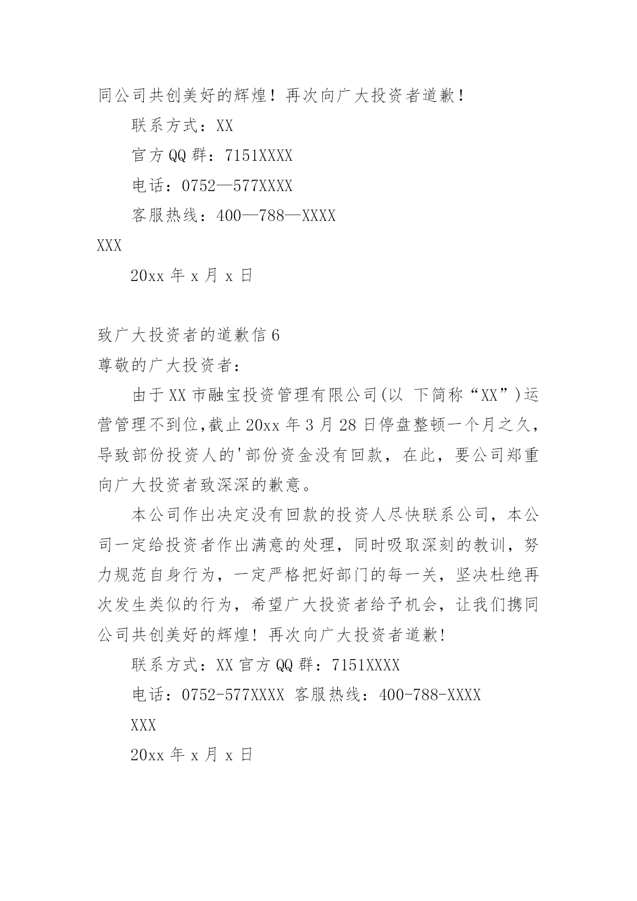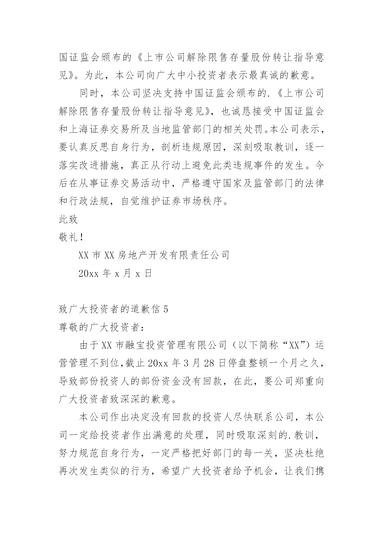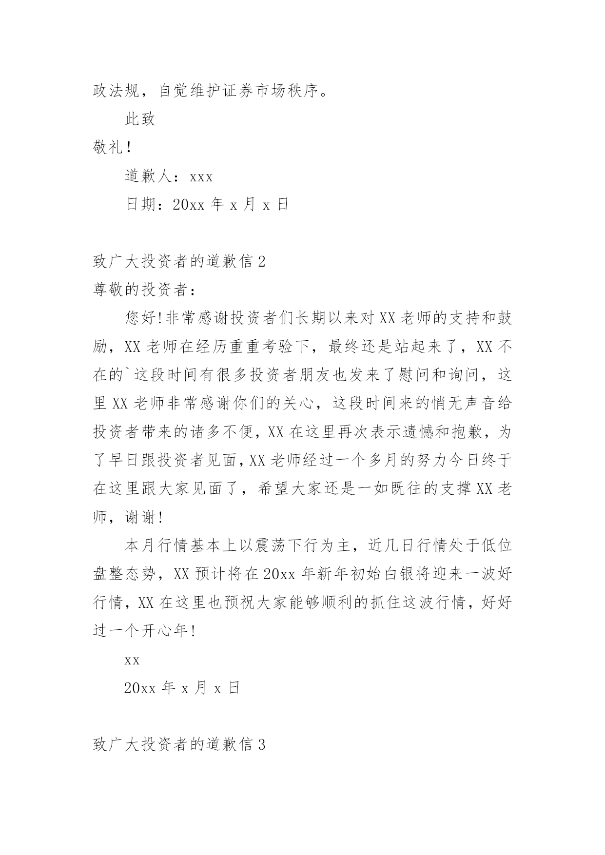 致广大投资者的道歉信致广大投资者的道歉信8篇现如今,我们不免要用到道歉信,在写道歉信的时候要注意态度诚恳、语气温和。那么,怎么去写道歉信呢?以下是小编精心整理的致广大投资者的道歉信,欢迎大家借鉴与参考,希望对大家有所帮助。致广大投资者的道歉信1尊敬的广大投资者:XX市XX房地产开发有限责任公司(以下简称本公司)因所持有XXXX股份有限公司(以下简称XX股份)有限售条件流通股份于20xx年12月27日解除限售后,由于20xx年4月29日交易过于频繁,工作人员操作不当,致使本公司通过上海证券交易所交易系统减持了本公司所持XX股份7,513,600股,占XX股份总股本的`1.456%。违反了中国证监会颁布的上市公司解除限售存量股份转让指导意见。为此,本公司向广大中小投资者表示最真诚的歉意。同时,本公司坚决支持中国证监会颁布的上市公司解除限售存量股份转让指导意见,也诚恳接受中国证监会和上海证券交易所及当地监管部门的相关处罚。本公司表示,要认真反思自身行为,剖析违规原因,深刻吸取教训,逐一落实改进措施,真正从行动上避免此类违规事件的发生。今后在从事证券交易活动中,严格遵守国家及监管部门的法律和行政法规,自觉维护证券市场秩序。此致敬礼!道歉人:xxx日期:20xx年x月x日致广大投资者的道歉信2尊敬的投资者:您好!非常感谢投资者们长期以来对XX老师的支持和鼓励,XX老师在经历重重考验下,最终还是站起来了,XX不在的`这段时间有很多投资者朋友也发来了慰问和询问,这里XX老师非常感谢你们的关心,这段时间来的悄无声音给投资者带来的诸多不便,XX在这里再次表示遗憾和抱歉,为了早日跟投资者见面,XX老师经过一个多月的努力今日终于在这里跟大家见面了,希望大家还是一如既往的支撑XX老师,谢谢!本月行情基本上以震荡下行为主,近几日行情处于低位盘整态势,XX预计将在20xx年新年初始白银将迎来一波好行情,XX在这里也预祝大家能够顺利的抓住这波行情,好好过一个开心年!xx20xx年x月x日致广大投资者的道歉信3尊敬的投资者:您好!非常感谢投资者们长期以来对XX老师的支持和鼓励,XX老师在经历重重考验下,最终还是站起来了,XX不在的这段时间有很多投资者朋友也发来了慰问和询问,这里XX老师非常感谢你们的关心,这段时间来的悄无声音给投资者带来的`诸多不便,XX在这里再次表示遗憾和抱歉,为了早日跟投资者见面,XX老师经过一个多月的努力今日终于在这里跟大家见面了,希望大家还是一如既往的支撑XX老师,谢谢!本月行情基本上以震荡下行为主,近几日行情处于低位盘整态势,XX预计将在20xx年新年初始白银将迎来一波好行情,XX在这里也预祝大家能够顺利的抓住这波行情,好好过一个开心年!道歉人:xxx日期:20xx年x月x日致广大投资者的道歉信4尊敬的广大投资者:XX市XX房地产开发有限责任公司(以下简称“本公司”)因所持有XXXX股份有限公司(以下简称“XX股份”)有限售条件流通股份于20xx年12月27日解除限售后,由于20xx年4月29日交易过于频繁,工作人员操作不当,致使本公司通过上海证券交易所交易系统减持了本公司所持XX股份7,513,600股,占XX股份总股本的1.456%.违反了中国证监会颁布的《上市公司解除限售存量股份转让指导意见》。为此,本公司向广大中小投资者表示最真诚的歉意。同时,本公司坚决支持中国证监会颁布的.《上市公司解除限售存量股份转让指导意见》,也诚恳接受中国证监会和上海证券交易所及当地监管部门的相关处罚。本公司表示,要认真反思自身行为,剖析违规原因,深刻吸取教训,逐一落实改进措施,真正从行动上避免此类违规事件的发生。今后在从事证券交易活动中,严格遵守国家及监管部门的法律和行政法规,自觉维护证券市场秩序。此致敬礼!XX市XX房地产开发有限责任公司20xx年x月x日致广大投资者的道歉信5尊敬的广大投资者:由于XX市融宝投资管理有限公司(以下简称“XX”)运营管理不到位,截止20xx年3月28日停盘整顿一个月之久,导致部份投资人的部份资金没有回款,在此,要公司郑重向广大投资者致深深的歉意。本公司作出决定没有回款的投资人尽快联系公司,本公司一定给投资者作出满意的处理,同时吸取深刻的.教训,努力规范自身行为,一定严格把好部门的每一关,坚决杜绝再次发生类似的行为,希望广大投资者给予机会,让我们携同公司共创美好的辉煌!再次向广大投资者道歉!联系方式:XX官方QQ群:7151XXXX电话:0752—577XXXX客服热线:400—788—XXXXXXX20xx年x月x日致广大投资者的道歉信6尊敬的广大投资者:由于XX市融宝投资管理有限公司(以下简称“XX”)运营管理不到位,截止20xx年3月28日停盘整顿一个月之久,导致部份投资人的'部份资金没有回款,在此,要公司