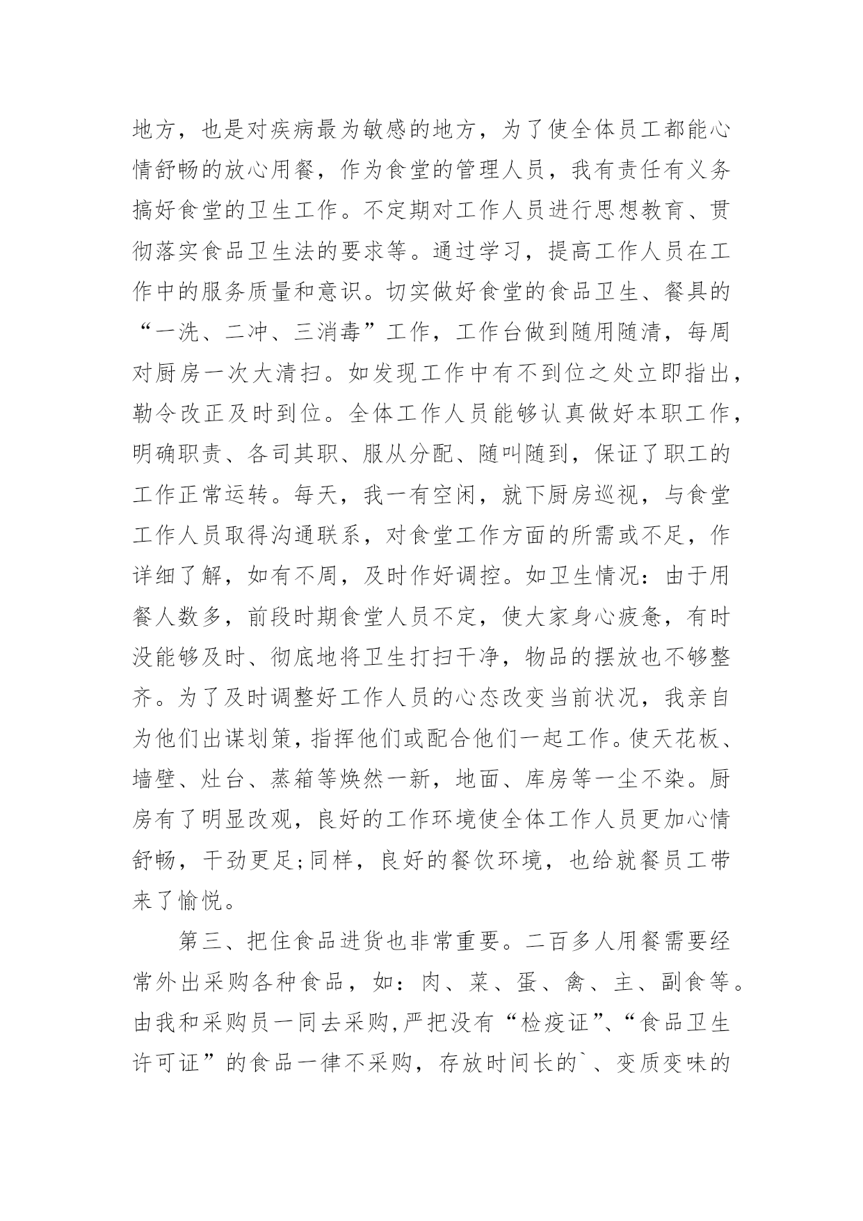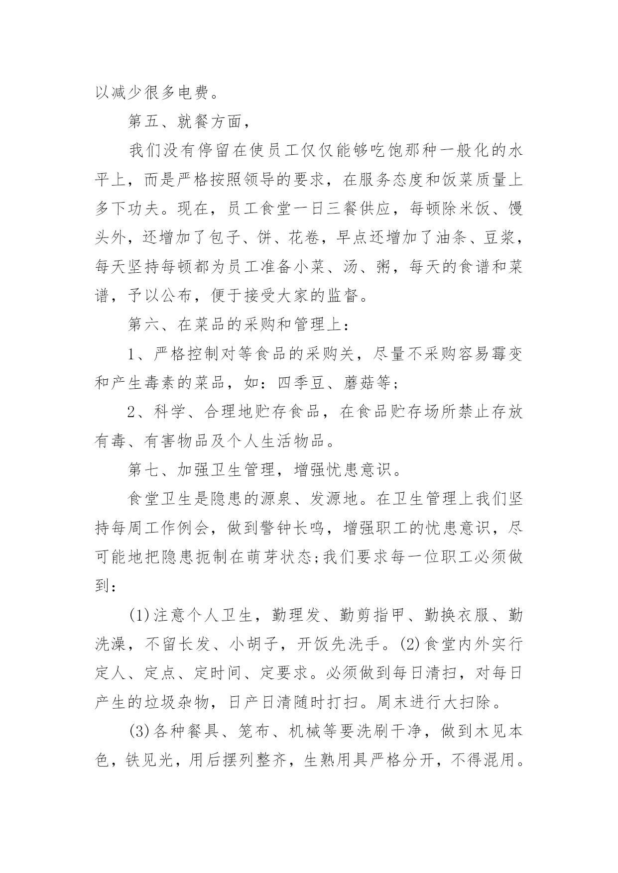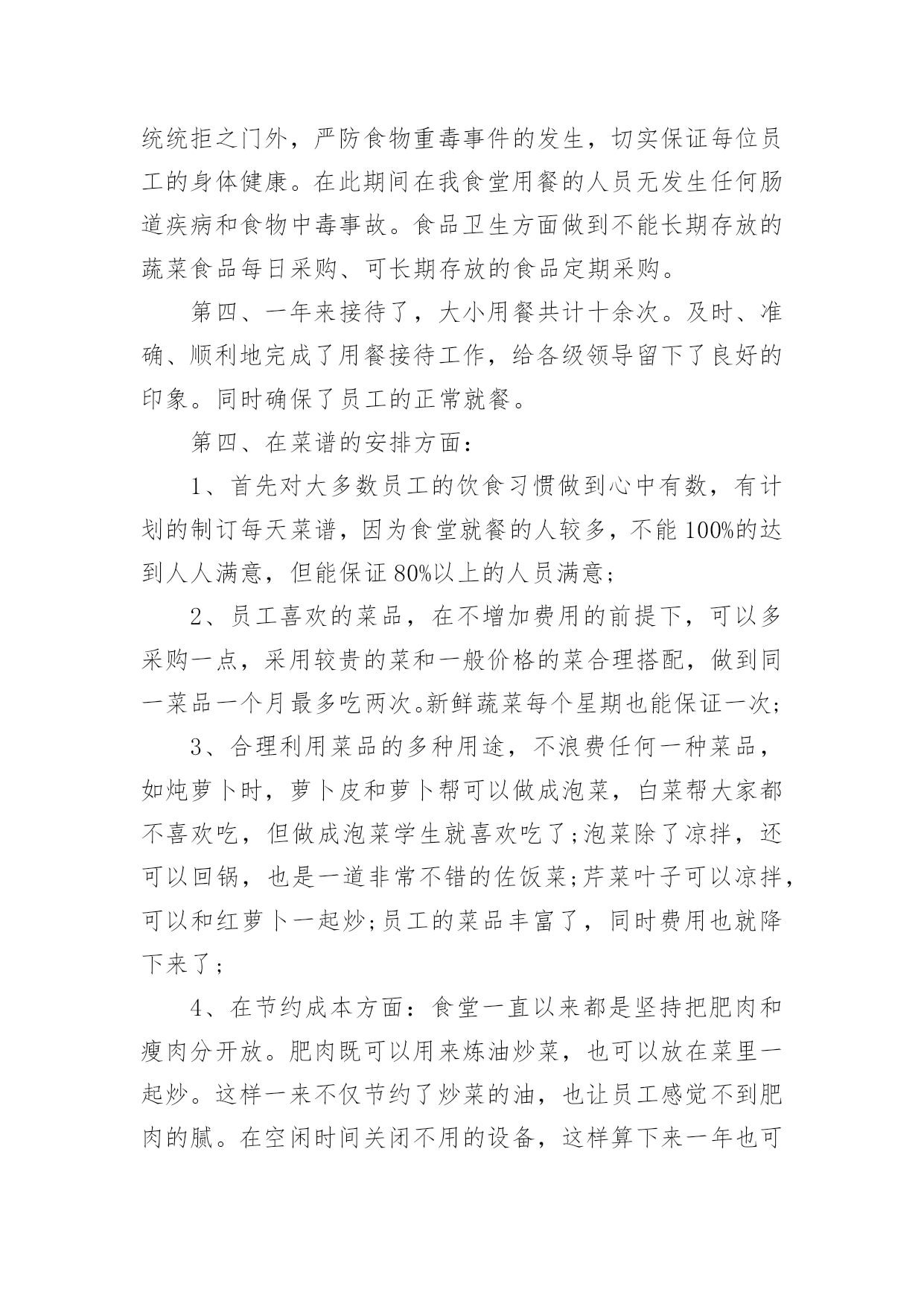 食堂工作总结总结是事后对某一阶段的学习、工作或其完成情况加以回顾和分析的一种书面材料,它可以促使我们思考,因此我们要做好归纳,写好总结。那么总结应该包括什么内容呢?下面是小编整理的食堂工作总结,欢迎大家借鉴与参考,希望对大家有所帮助。食堂工作总结篇1时间过得真快,茫茫碌碌中已近年末,转眼间我接管食堂的时间过了半年了。回顾过去的每一天,我作为后勤主管,深感到责任的重大,工作压力之沉重。因为我所从事的工作,很有可能会影响到全体员工的身心健康。所以,为了扬长避短,今后能把工作干得更好,现就最近一段时间的工作情况总结如下:第一、作为食堂自然是离不开饮食,食堂是每个人生活中不可缺少的一部分,假如我们离开了吃的东西是不可能生存下去,所以作为中心的食堂这也是很重要的。作为后勤主管更应多为饮食着想,为保证每位员工的身心健康而考虑。第二、作为一个集体食堂,食品卫生安全是关系到每一位员工身体健康的大事。首先,我们要求每位食堂工作人员上岗前,都要进行上岗前的体检,对体检不合格者不於上岗。食堂是员工用餐的地方,也是对疾病最为敏感的地方,为了使全体员工都能心情舒畅的放心用餐,作为食堂的管理人员,我有责任有义务搞好食堂的卫生工作。不定期对工作人员进行思想教育、贯彻落实食品卫生法的要求等。通过学习,提高工作人员在工作中的服务质量和意识。切实做好食堂的食品卫生、餐具的“一洗、二冲、三消毒”工作,工作台做到随用随清,每周对厨房一次大清扫。如发现工作中有不到位之处立即指出,勒令改正及时到位。全体工作人员能够认真做好本职工作,明确职责、各司其职、服从分配、随叫随到,保证了职工的工作正常运转。每天,我一有空闲,就下厨房巡视,与食堂工作人员取得沟通联系,对食堂工作方面的所需或不足,作详细了解,如有不周,及时作好调控。如卫生情况:由于用餐人数多,前段时期食堂人员不定,使大家身心疲惫,有时没能够及时、彻底地将卫生打扫干净,物品的摆放也不够整齐。为了及时调整好工作人员的心态改变当前状况,我亲自为他们出谋划策,指挥他们或配合他们一起工作。使天花板、墙壁、灶台、蒸箱等焕然一新,地面、库房等一尘不染。厨房有了明显改观,良好的工作环境使全体工作人员更加心情舒畅,干劲更足;同样,良好的餐饮环境,也给就餐员工带来了愉悦。第三、把住食品进货也非常重要。二百多人用餐需要经常外出采购各种食品,如:肉、菜、蛋、禽、主、副食等。由我和采购员一同去采购,严把没有“检疫证”、“食品卫生许可证”的食品一律不采购,存放时间长的`、变质变味的统统拒之门外,严防食物重毒事件的发生,切实保证每位员工的身体健康。在此期间在我食堂用餐的人员无发生任何肠道疾病和食物中毒事故。食品卫生方面做到不能长期存放的蔬菜食品每日采购、可长期存放的食品定期采购。第四、一年来接待了,大小用餐共计十余次。及时、准确、顺利地完成了用餐接待工作,给各级领导留下了良好的印象。同时确保了员工的正常就餐。第四、在菜谱的安排方面:1、首先对大多数员工的饮食习惯做到心中有数,有计划的制订每天菜谱,因为食堂就餐的人较多,不能100%的达到人人满意,但能保证80%以上的人员满意;2、员工喜欢的菜品,在不增加费用的前提下,可以多采购一点,采用较贵的菜和一般价格的菜合理搭配,做到同一菜品一个月最多吃两次。新鲜蔬菜每个星期也能保证一次;3、合理利用菜品的多种用途,不浪费任何一种菜品,如炖萝卜时,萝卜皮和萝卜帮可以做成泡菜,白菜帮大家都不喜欢吃,但做成泡菜学生就喜欢吃了;泡菜除了凉拌,还可以回锅,也是一道非常不错的佐饭菜;芹菜叶子可以凉拌,可以和红萝卜一起炒;员工的菜品丰富了,同时费用也就降下来了;4、在节约成本方面:食堂一直以来都是坚持把肥肉和瘦肉分开放。肥肉既可以用来炼油炒菜,也可以放在菜里一起炒。这样一来不仅节约了炒菜的油,也让员工感觉不到肥肉的腻。在空闲时间关闭不用的设备,这样算下来一年也可以减少很多电费。第五、就餐方面,我们没有停留在使员工仅仅能够吃饱那种一般化的水平上,而是严格按照领导的要求,在服务态度和饭菜质量上多下功夫。现在,员工食堂一日三餐供应,每顿除米饭、馒头外,还增加了包子、饼、花卷,早点还增加了油条、豆浆,每天坚持每顿都为员工准备小菜、汤、粥,每天的食谱和菜谱,予以公布,便于接受大家的监督。第六、在菜品的采购和管理上:1、严格控制对等食品的采购关,尽量不采购容易霉变和产生毒素的菜品,如:四季豆、蘑菇等;2、科学、合理地贮存食品,在食品贮存场所禁止存放有毒、有害物品及个人生活物品。第七、加强卫生管理,增强忧患意识。食堂卫生是隐患的源泉、发源地。在卫生管理上我们坚持每周工作例会,做到警钟长鸣,增强职工的忧患意识,尽可能地把隐患扼制在萌芽状态;我们要求每一位职工必须做到:(1)注意个人卫生,勤理发、勤剪指甲、勤换衣服、勤洗澡,不留长发、
