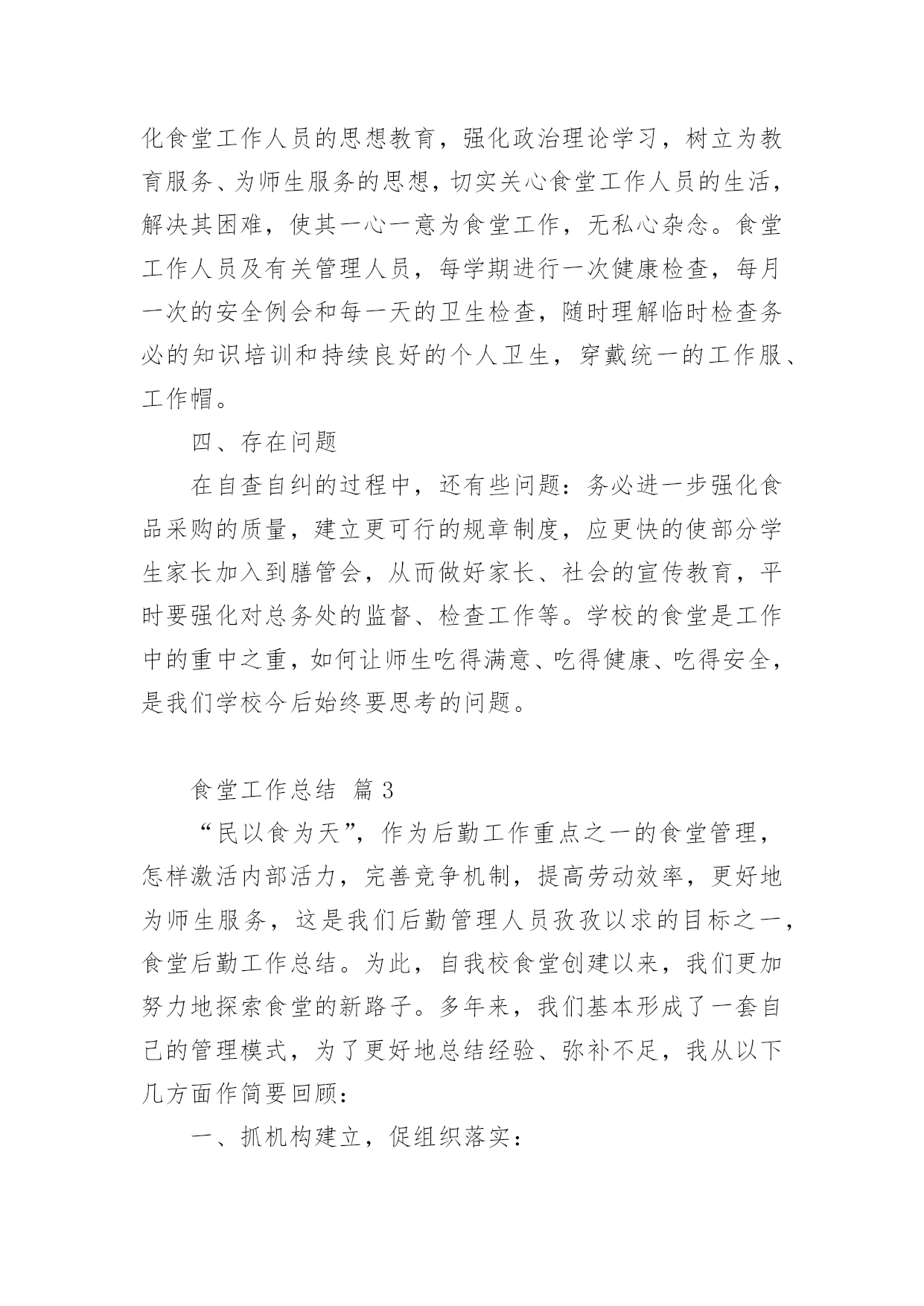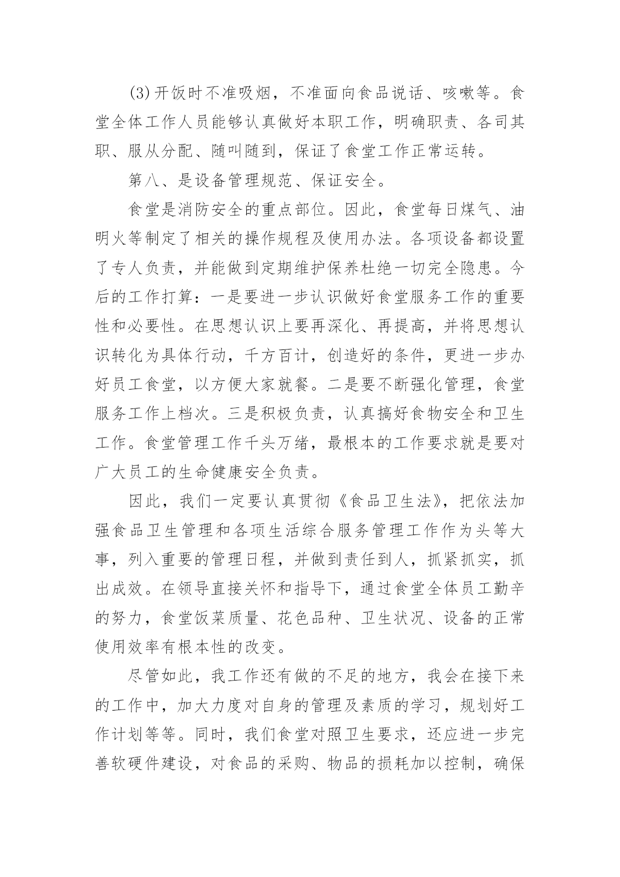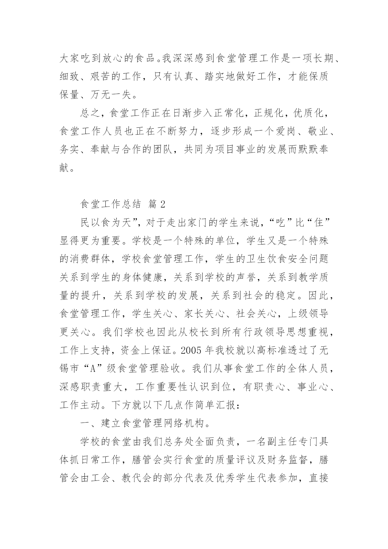 食堂工作总结总结是事后对某一阶段的学习、工作或其完成情况加以回顾和分析的一种书面材料,它可以促使我们思考,因此我们要做好归纳,写好总结。那么总结应该包括什么内容呢?下面是小编整理的食堂工作总结,欢迎大家借鉴与参考,希望对大家有所帮助。食堂工作总结篇1时间过得真快,茫茫碌碌中已近年末,转眼间我接管食堂的时间过了半年了。回顾过去的每一天,我作为后勤主管,深感到责任的重大,工作压力之沉重。因为我所从事的工作,很有可能会影响到全体员工的身心健康。所以,为了扬长避短,今后能把工作干得更好,现就最近一段时间的工作情况总结如下:第一、作为食堂自然是离不开饮食,食堂是每个人生活中不可缺少的一部分,假如我们离开了吃的东西是不可能生存下去,所以作为中心的食堂这也是很重要的。作为后勤主管更应多为饮食着想,为保证每位员工的身心健康而考虑。第二、作为一个集体食堂,食品卫生安全是关系到每一位员工身体健康的大事。首先,我们要求每位食堂工作人员上岗前,都要进行上岗前的体检,对体检不合格者不於上岗。食堂是员工用餐的地方,也是对疾病最为敏感的地方,为了使全体员工都能心情舒畅的放心用餐,作为食堂的管理人员,我有责任有义务搞好食堂的卫生工作。不定期对工作人员进行思想教育、贯彻落实食品卫生法的要求等。通过学习,提高工作人员在工作中的服务质量和意识。切实做好食堂的食品卫生、餐具的“一洗、二冲、三消毒”工作,工作台做到随用随清,每周对厨房一次大清扫。如发现工作中有不到位之处立即指出,勒令改正及时到位。全体工作人员能够认真做好本职工作,明确职责、各司其职、服从分配、随叫随到,保证了职工的工作正常运转。每天,我一有空闲,就下厨房巡视,与食堂工作人员取得沟通联系,对食堂工作方面的所需或不足,作详细了解,如有不周,及时作好调控。如卫生情况:由于用餐人数多,前段时期食堂人员不定,使大家身心疲惫,有时没能够及时、彻底地将卫生打扫干净,物品的摆放也不够整齐。为了及时调整好工作人员的心态改变当前状况,我亲自为他们出谋划策,指挥他们或配合他们一起工作。使天花板、墙壁、灶台、蒸箱等焕然一新,地面、库房等一尘不染。厨房有了明显改观,良好的工作环境使全体工作人员更加心情舒畅,干劲更足;同样,良好的餐饮环境,也给就餐员工带来了愉悦。第三、把住食品进货也非常重要。二百多人用餐需要经常外出采购各种食品,如:肉、菜、蛋、禽、主、副食等。由我和采购员一同去采购,严把没有“检疫证”、“食品卫生许可证”的食品一律不采购,存放时间长的`、变质变味的统统拒之门外,严防食物重毒事件的发生,切实保证每位员工的身体健康。在此期间在我食堂用餐的人员无发生任何肠道疾病和食物中毒事故。食品卫生方面做到不能长期存放的蔬菜食品每日采购、可长期存放的食品定期采购。第四、一年来接待了,大小用餐共计十余次。及时、准确、顺利地完成了用餐接待工作,给各级领导留下了良好的印象。同时确保了员工的正常就餐。第四、在菜谱的安排方面:1、首先对大多数员工的饮食习惯做到心中有数,有计划的制订每天菜谱,因为食堂就餐的人较多,不能100%的达到人人满意,但能保证80%以上的人员满意;2、员工喜欢的菜品,在不增加费用的前提下,可以多采购一点,采用较贵的菜和一般价格的菜合理搭配,做到同一菜品一个月最多吃两次。新鲜蔬菜每个星期也能保证一次;3、合理利用菜品的多种用途,不浪费任何一种菜品,如炖萝卜时,萝卜皮和萝卜帮可以做成泡菜,白菜帮大家都不喜欢吃,但做成泡菜学生就喜欢吃了;泡菜除了凉拌,还可以回锅,也是一道非常不错的佐饭菜;芹菜叶子可以凉拌,可以和红萝卜一起炒;员工的菜品丰富了,同时费用也就降下来了;4、在节约成本方面:食堂一直以来都是坚持把肥肉和瘦肉分开放。肥肉既可以用来炼油炒菜,也可以放在菜里一起炒。这样一来不仅节约了炒菜的油,也让员工感觉不到肥肉的腻。在空闲时间关闭不用的设备,这样算下来一年也可以减少很多电费。第五、就餐方面,我们没有停留在使员工仅仅能够吃饱那种一般化的水平上,而是严格按照领导的要求,在服务态度和饭菜质量上多下功夫。现在,员工食堂一日三餐供应,每顿除米饭、馒头外,还增加了包子、饼、花卷,早点还增加了油条、豆浆,每天坚持每顿都为员工准备小菜、汤、粥,每天的食谱和菜谱,予以公布,便于接受大家的监督。第六、在菜品的采购和管理上:1、严格控制对等食品的采购关,尽量不采购容易霉变和产生毒素的菜品,如:四季豆、蘑菇等;2、科学、合理地贮存食品,在食品贮存场所禁止存放有毒、有害物品及个人生活物品。第七、加强卫生管理,增强忧患意识。食堂卫生是隐患的源泉、发源地。在卫生管理上我们坚持每周工作例会,做到警钟长鸣,增强职工的忧患意识,尽可能地把隐患扼制在萌芽状态;我们要求每一位职工必须做到:(1)注意个人卫生,勤理发、勤剪指甲、勤换衣服、勤洗澡,不留长发、