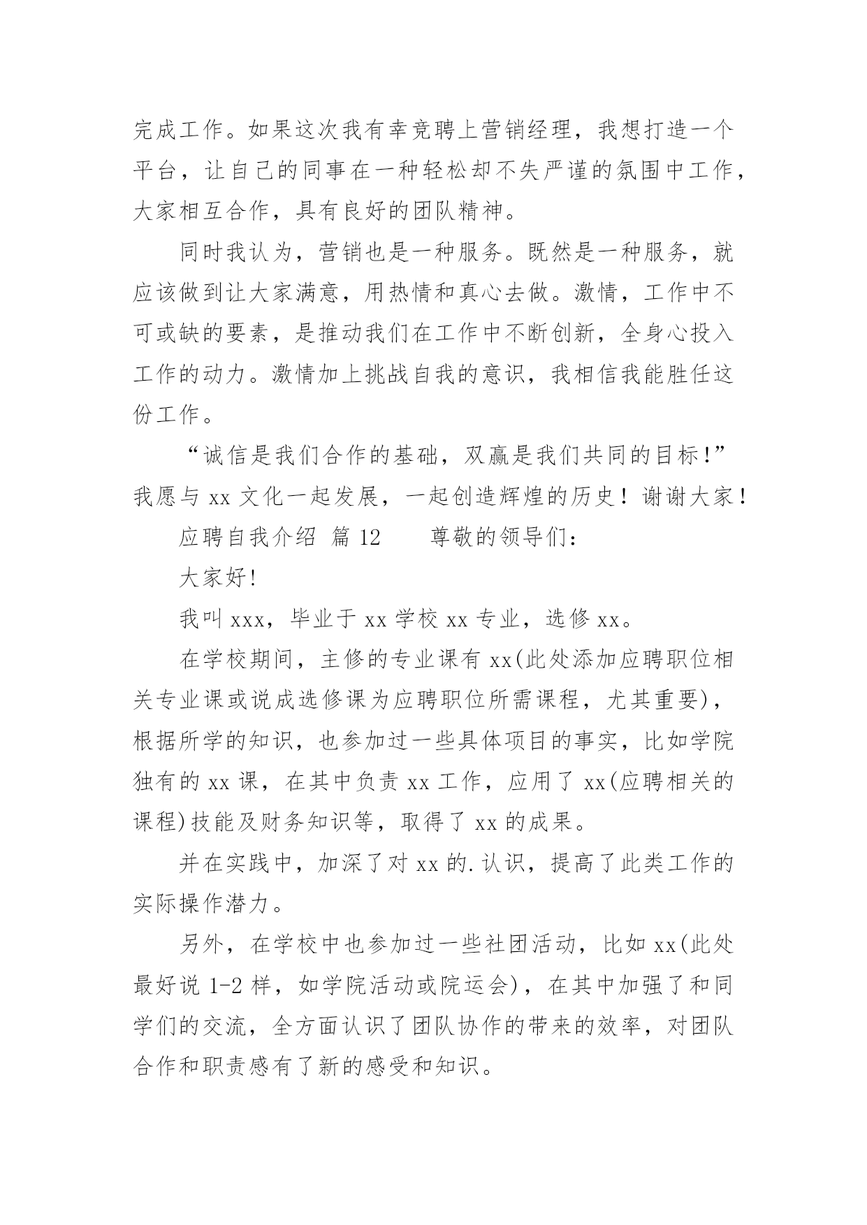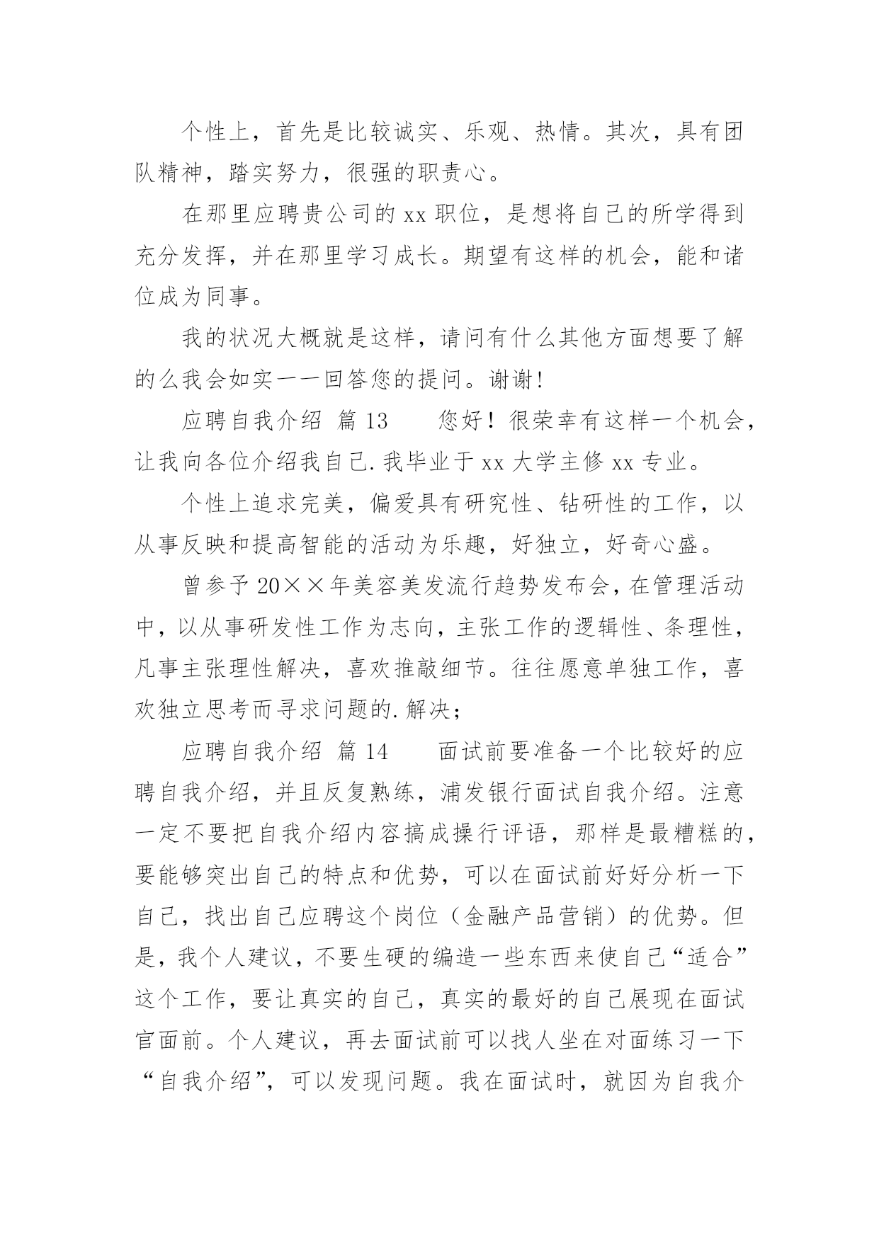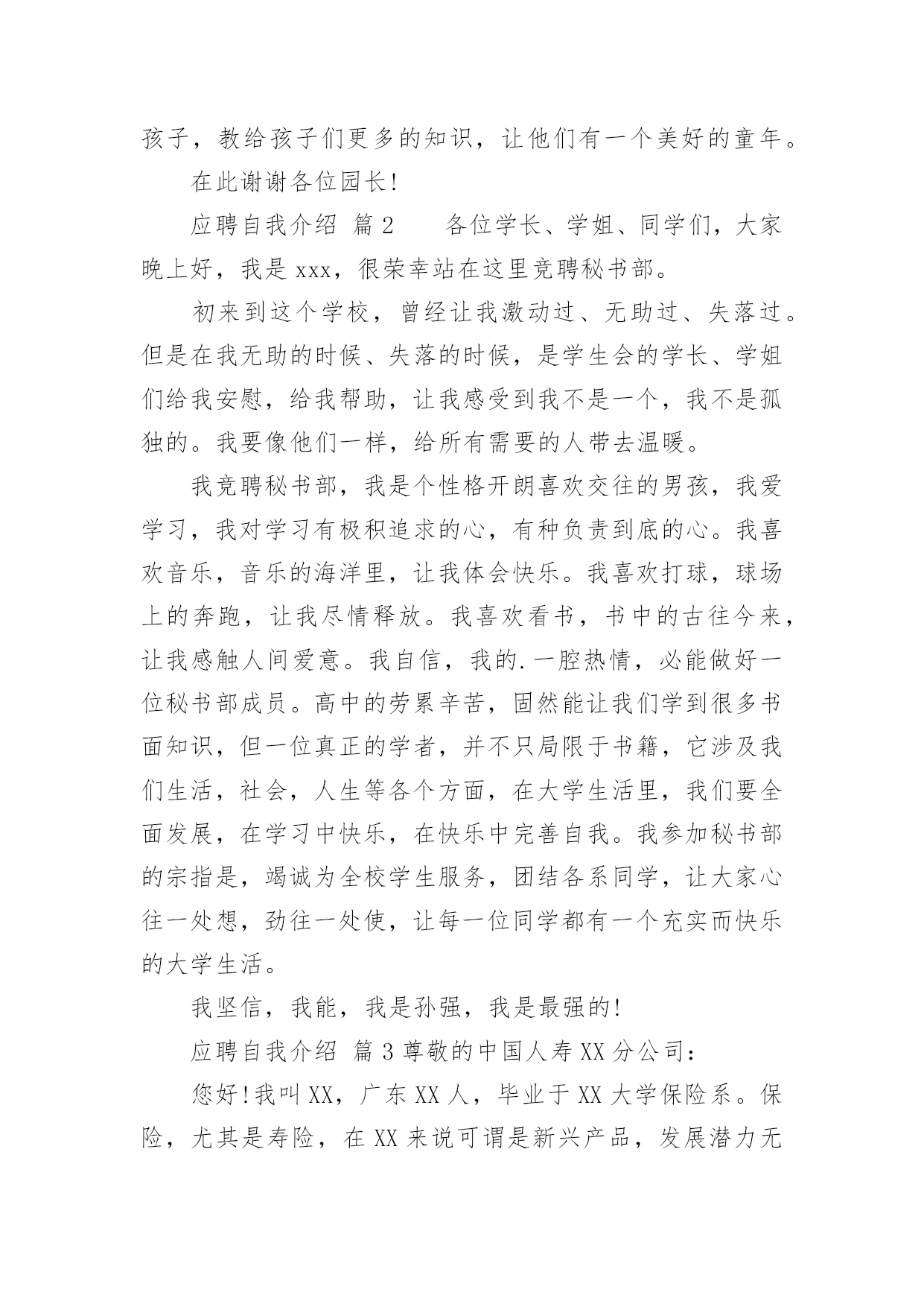 应聘自我介绍【热】应聘自我介绍14篇当我们在一个陌生场合中,可能需要我们进行自我介绍,自我介绍是一种认识自我的手段。但是自我介绍有什么要求呢?以下是小编精心整理的应聘自我介绍,希望能够帮助到大家。应聘自我介绍篇1尊敬的各位园长及各位老师你好!我是**校的刘×。在学校学习的时候有过几次实习经验,在实习中我本着一颗童心、爱心,始终如一真诚地对待每一个家长和孩子,在我的实习教育工作中受到了家长和孩子的一致好评。我的性格开朗、热情大方。之前有过教学经验,但是也有好多不足的地方,希望到您园能学到更多、更好的的教学经验,可以更好的完善自己。在教幼儿知识时我看到幼儿露出那天真的笑脸和提出幼稚的问题时,我都会很有耐心的一一回答。因为我喜欢孩子,所以我有足够的耐心。幼儿的好奇心,让我变成了百科全书。幼儿的许多为什么,让我心中充满了追去求案的欲望。因为我喜欢幼儿的欢声笑语,所以我选择了这门职业。我知道学前教育这条道不好走,但是我希望自己可以做好幼师这个职业。我想既然我喜欢了,选择了,就要坚持、努力的`做到最好。如果园长肯给我一次机会,我会更加努力,不负所望,把我的潜能发挥出来。我一定会好好的对待孩子,教给孩子们更多的知识,让他们有一个美好的童年。在此谢谢各位园长!应聘自我介绍篇2各位学长、学姐、同学们,大家晚上好,我是xxx,很荣幸站在这里竞聘秘书部。初来到这个学校,曾经让我激动过、无助过、失落过。但是在我无助的时候、失落的时候,是学生会的学长、学姐们给我安慰,给我帮助,让我感受到我不是一个,我不是孤独的。我要像他们一样,给所有需要的人带去温暖。我竞聘秘书部,我是个性格开朗喜欢交往的男孩,我爱学习,我对学习有极积追求的心,有种负责到底的心。我喜欢音乐,音乐的海洋里,让我体会快乐。我喜欢打球,球场上的奔跑,让我尽情释放。我喜欢看书,书中的古往今来,让我感触人间爱意。我自信,我的.一腔热情,必能做好一位秘书部成员。高中的劳累辛苦,固然能让我们学到很多书面知识,但一位真正的学者,并不只局限于书籍,它涉及我们生活,社会,人生等各个方面,在大学生活里,我们要全面发展,在学习中快乐,在快乐中完善自我。我参加秘书部的宗指是,竭诚为全校学生服务,团结各系同学,让大家心往一处想,劲往一处使,让每一位同学都有一个充实而快乐的大学生活。我坚信,我能,我是孙强,我是最强的!应聘自我介绍篇3尊敬的中国人寿XX分公司:您好!我叫XX,广东XX人,毕业于XX大学保险系。保险,尤其是寿险,在XX来说可谓是新兴产品,发展潜力无限。很高兴也很庆幸能加入国寿XX分公司。十分感激公司给我这个机会。大学四年的系统学习,让我感受到保险之美,认识到保险之需,以及了解到现今保险在我国的发展趋势以及前景,我有志于投身保险事业,想为中国保险事业出一份力。课余时我有浏览中国保险网等网站,浏览最新的资讯,了解保险市场动态。现今中国保险界存在的最大的问题是学界跟业界不能有机的结合。学界最新的科研成果不能应用到业界,指导业界开展业务;业界操作中遇到的问题不能有效的反馈给学界,帮助学界修正研究成果。国寿作为老牌国企,以及现今国内最大的商业保险集团,拥有大量专家型学者和技术型人才,是中国保险界的'中坚力量,有机会加入中国人寿这个大家庭是我的荣幸。大学四年,我积极参加各项实践活动。在各项活动中,培养了自身的组织管理能力和团队协作精神,能迅速融入团队,有较强的适应能力及快速学习能力,并建立了高度的责任心。实践活动的参与,除了让我的能力得到锻炼之外,也让我明白了许多为人处世的道理。人不能只做自己想做的事,而必须做自己该做的事,在人生的道路上,不断努力,不断奋斗,始终信守“岂能皆尽人意,但求无愧于心”。面对未来,我满怀信心;面对挑战,我绝不退缩。加入贵公司后,我会和公司员工一起努力,踏踏实实的工作,竭尽全力为公司的发展做出自己应有的贡献。我不一定是最优秀的,但我一定会是最努力和最有潜力的!应聘自我介绍篇4各位前辈:下午好!今天能在这里参加面试,有机会向各位请教我感到非常的荣幸。我叫马天骏,来自以“张国臂掖,以通西域”而得名的张掖,今年(年龄自己加)。我是一个兴趣爱好很广泛的人,热爱音乐表演,在发展自己爱好的同时我也没有懈怠自己的学习。因为个性亲和的缘故,高中三年我一直担任学习委员,在班里于同学相处十分融洽,能上达学生意向,也能下达老师的指示,是同学们的好班委,也是老师的好助手。空乘这个职业一直是我梦寐以求的,我想让自己吃苦耐劳的'精神发挥到工作中,也想让自己亲和的性格能感染每一个旅途疲惫的人,给别人带去温暖和快乐!应聘自我介绍篇5尊敬的各位领导、老师:大家好我叫××,年年初毕业于吉林传播学院播音与主持艺术专业,应聘自我介绍演讲。我的特长是新闻播音、主持、演讲。我应聘的'岗位是主持人或编导。在过去的一年里,上半年,