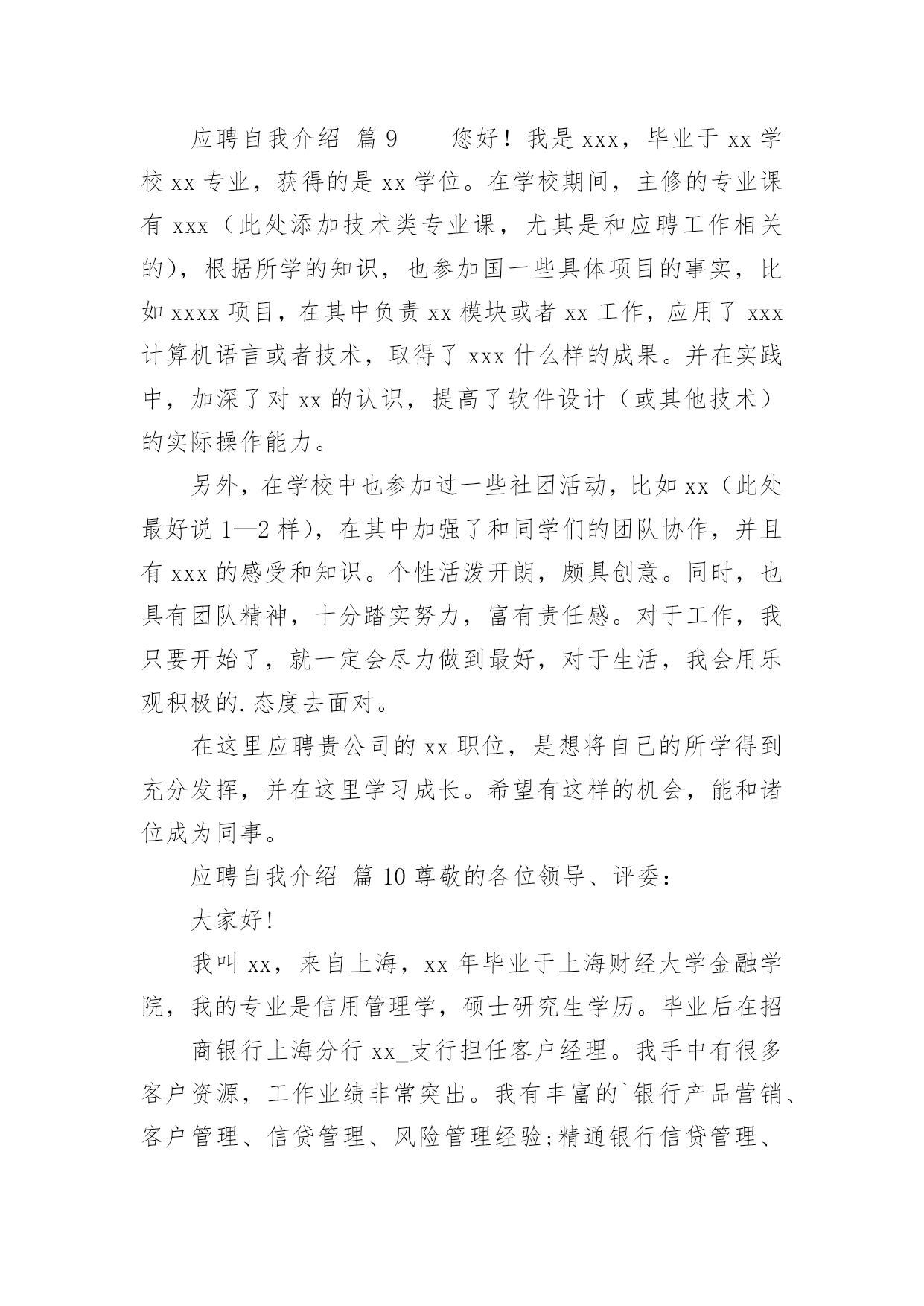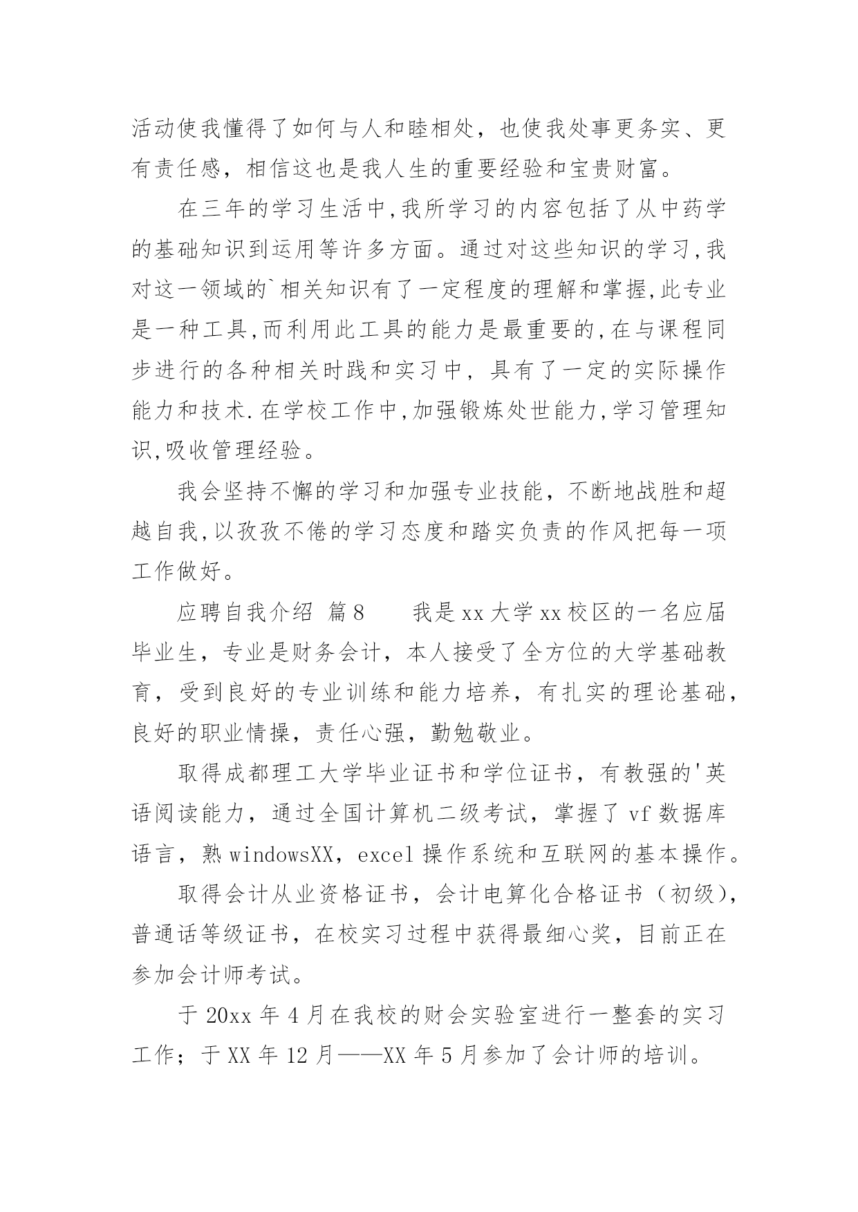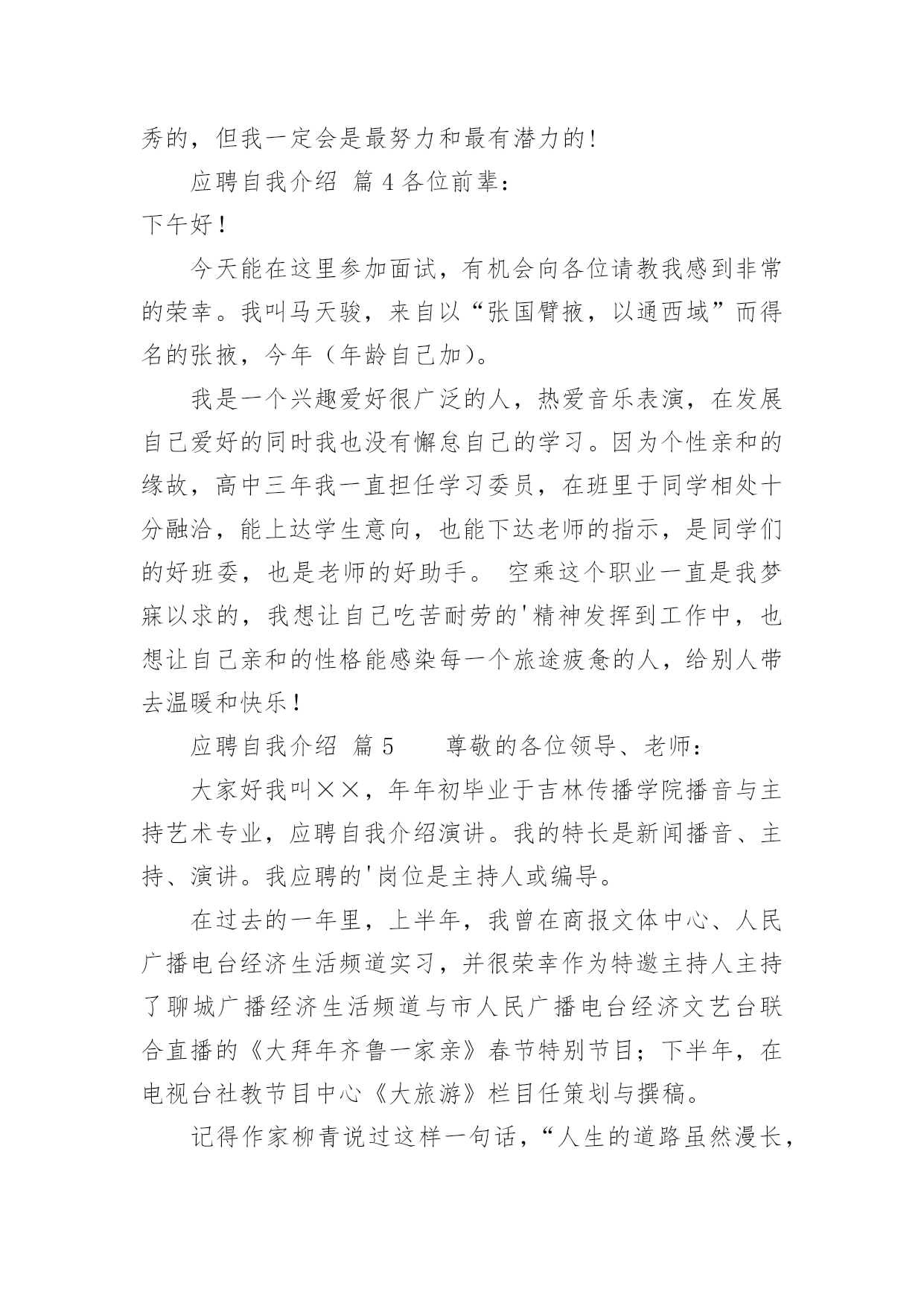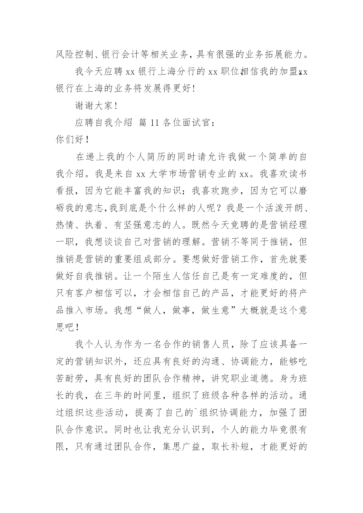 应聘自我介绍【热】应聘自我介绍14篇当我们在一个陌生场合中,可能需要我们进行自我介绍,自我介绍是一种认识自我的手段。但是自我介绍有什么要求呢?以下是小编精心整理的应聘自我介绍,希望能够帮助到大家。应聘自我介绍篇1尊敬的各位园长及各位老师你好!我是**校的刘×。在学校学习的时候有过几次实习经验,在实习中我本着一颗童心、爱心,始终如一真诚地对待每一个家长和孩子,在我的实习教育工作中受到了家长和孩子的一致好评。我的性格开朗、热情大方。之前有过教学经验,但是也有好多不足的地方,希望到您园能学到更多、更好的的教学经验,可以更好的完善自己。在教幼儿知识时我看到幼儿露出那天真的笑脸和提出幼稚的问题时,我都会很有耐心的一一回答。因为我喜欢孩子,所以我有足够的耐心。幼儿的好奇心,让我变成了百科全书。幼儿的许多为什么,让我心中充满了追去求案的欲望。因为我喜欢幼儿的欢声笑语,所以我选择了这门职业。我知道学前教育这条道不好走,但是我希望自己可以做好幼师这个职业。我想既然我喜欢了,选择了,就要坚持、努力的`做到最好。如果园长肯给我一次机会,我会更加努力,不负所望,把我的潜能发挥出来。我一定会好好的对待孩子,教给孩子们更多的知识,让他们有一个美好的童年。在此谢谢各位园长!应聘自我介绍篇2各位学长、学姐、同学们,大家晚上好,我是xxx,很荣幸站在这里竞聘秘书部。初来到这个学校,曾经让我激动过、无助过、失落过。但是在我无助的时候、失落的时候,是学生会的学长、学姐们给我安慰,给我帮助,让我感受到我不是一个,我不是孤独的。我要像他们一样,给所有需要的人带去温暖。我竞聘秘书部,我是个性格开朗喜欢交往的男孩,我爱学习,我对学习有极积追求的心,有种负责到底的心。我喜欢音乐,音乐的海洋里,让我体会快乐。我喜欢打球,球场上的奔跑,让我尽情释放。我喜欢看书,书中的古往今来,让我感触人间爱意。我自信,我的.一腔热情,必能做好一位秘书部成员。高中的劳累辛苦,固然能让我们学到很多书面知识,但一位真正的学者,并不只局限于书籍,它涉及我们生活,社会,人生等各个方面,在大学生活里,我们要全面发展,在学习中快乐,在快乐中完善自我。我参加秘书部的宗指是,竭诚为全校学生服务,团结各系同学,让大家心往一处想,劲往一处使,让每一位同学都有一个充实而快乐的大学生活。我坚信,我能,我是孙强,我是最强的!应聘自我介绍篇3尊敬的中国人寿XX分公司:您好!我叫XX,广东XX人,毕业于XX大学保险系。保险,尤其是寿险,在XX来说可谓是新兴产品,发展潜力无限。很高兴也很庆幸能加入国寿XX分公司。十分感激公司给我这个机会。大学四年的系统学习,让我感受到保险之美,认识到保险之需,以及了解到现今保险在我国的发展趋势以及前景,我有志于投身保险事业,想为中国保险事业出一份力。课余时我有浏览中国保险网等网站,浏览最新的资讯,了解保险市场动态。现今中国保险界存在的最大的问题是学界跟业界不能有机的结合。学界最新的科研成果不能应用到业界,指导业界开展业务;业界操作中遇到的问题不能有效的反馈给学界,帮助学界修正研究成果。国寿作为老牌国企,以及现今国内最大的商业保险集团,拥有大量专家型学者和技术型人才,是中国保险界的'中坚力量,有机会加入中国人寿这个大家庭是我的荣幸。大学四年,我积极参加各项实践活动。在各项活动中,培养了自身的组织管理能力和团队协作精神,能迅速融入团队,有较强的适应能力及快速学习能力,并建立了高度的责任心。实践活动的参与,除了让我的能力得到锻炼之外,也让我明白了许多为人处世的道理。人不能只做自己想做的事,而必须做自己该做的事,在人生的道路上,不断努力,不断奋斗,始终信守“岂能皆尽人意,但求无愧于心”。面对未来,我满怀信心;面对挑战,我绝不退缩。加入贵公司后,我会和公司员工一起努力,踏踏实实的工作,竭尽全力为公司的发展做出自己应有的贡献。我不一定是最优秀的,但我一定会是最努力和最有潜力的!应聘自我介绍篇4各位前辈:下午好!今天能在这里参加面试,有机会向各位请教我感到非常的荣幸。我叫马天骏,来自以“张国臂掖,以通西域”而得名的张掖,今年(年龄自己加)。我是一个兴趣爱好很广泛的人,热爱音乐表演,在发展自己爱好的同时我也没有懈怠自己的学习。因为个性亲和的缘故,高中三年我一直担任学习委员,在班里于同学相处十分融洽,能上达学生意向,也能下达老师的指示,是同学们的好班委,也是老师的好助手。空乘这个职业一直是我梦寐以求的,我想让自己吃苦耐劳的'精神发挥到工作中,也想让自己亲和的性格能感染每一个旅途疲惫的人,给别人带去温暖和快乐!应聘自我介绍篇5尊敬的各位领导、老师:大家好我叫××,年年初毕业于吉林传播学院播音与主持艺术专业,应聘自我介绍演讲。我的特长是新闻播音、主持、演讲。我应聘的'岗位是主持人或编导。在过去的一年里,上半年,