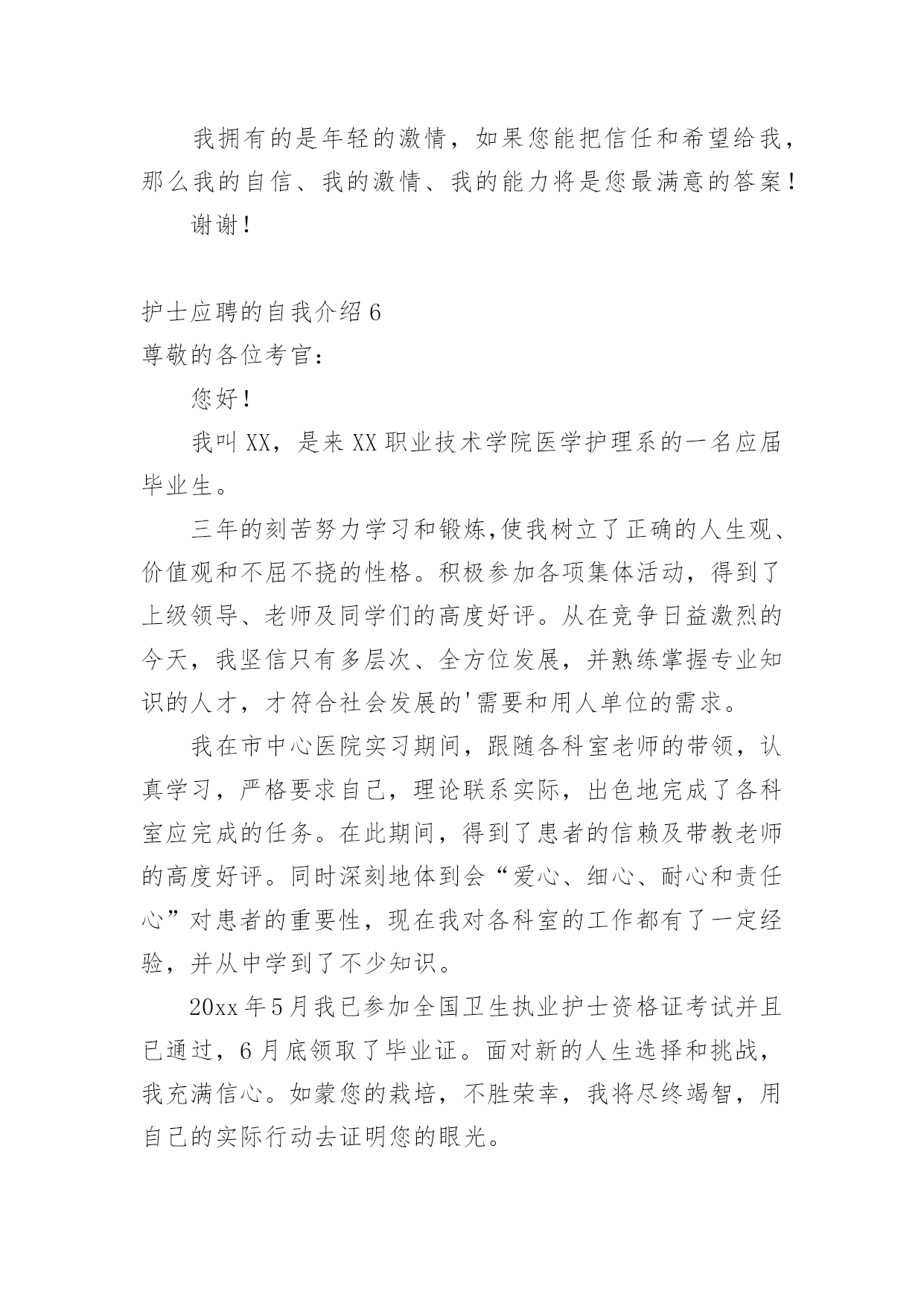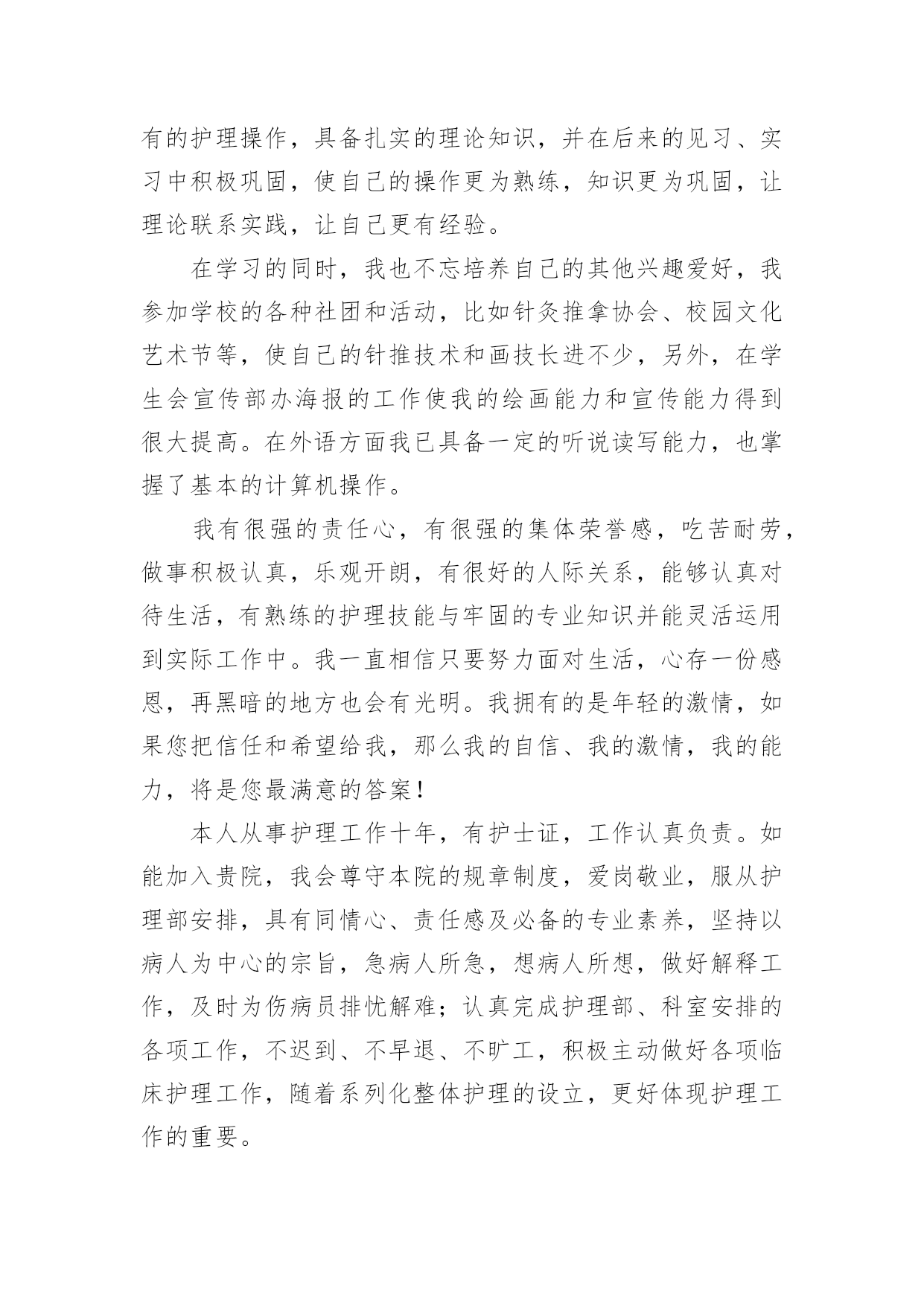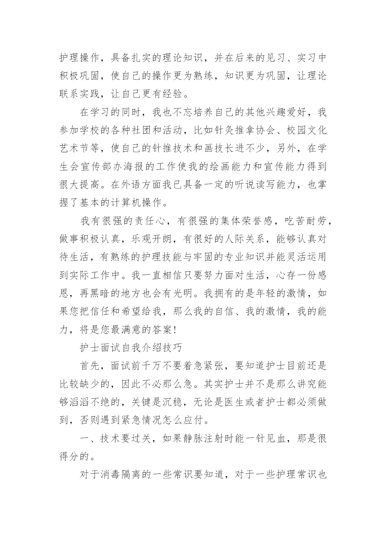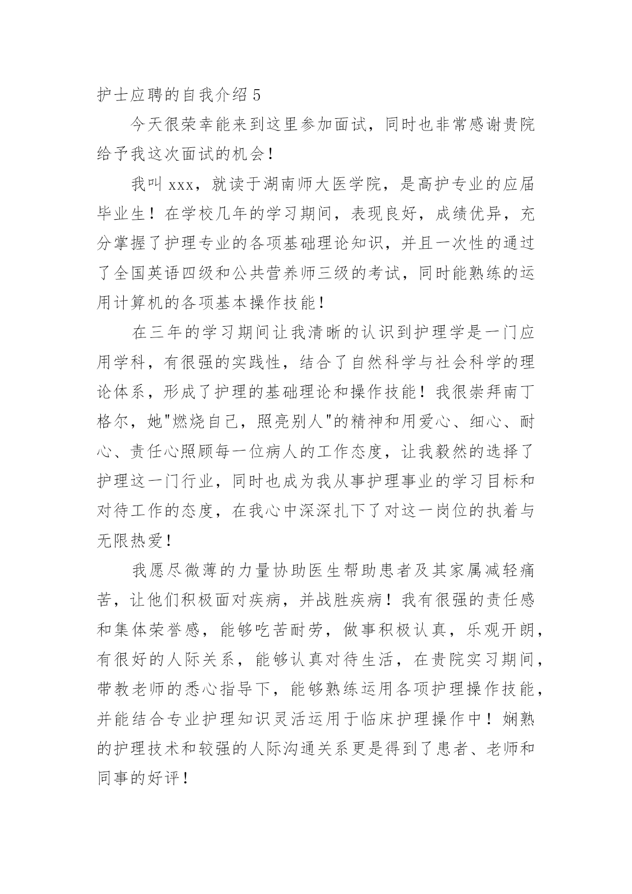 护士应聘的自我介绍当到达一个新的环境后,常常需要我们进行自我介绍,自我介绍是一种认识自我的手段。写起自我介绍来就毫无头绪?下面是小编收集整理的护士应聘的自我介绍,供大家参考借鉴,希望可以帮助到有需要的朋友。护士应聘的自我介绍1我叫xxx,今年xx岁,毕业于xxxx学校,护理专业,今天能站在这里向大家介绍自己真是感到万分荣幸!在生活中我是个活泼开朗、热情大方、乐观上进、独立自主、自信要强的人,我会把我积极的一面在工作中继续发扬,认真负责的对待工作,积极沟通、协调,注重团队精神,我在医院实践工作一年多,目前已经熟练掌握各项护理操作。虽然我毕业的时间还不算长,工作经验仍有欠缺,但是在未来的工作中,我将以充沛的精力、刻苦钻研的精神来努力工作,勤于学习不断提高自身的工作能力与综合素质,与医院共同进步。谢谢大家!我是一位外表文静,内心却不失坚强的女孩子。朋友们都说我适合做护士,我也这么认为,我喜欢这个行业,所以我义无返顾地选择了她。我只是护士虽然不是医生,但她比医生更贴近病人,需要更为丰富的知识和技术,这样才是真正的“白衣天使”。在学校学习的三年中,我已基本掌握所有的护理操作,具备扎实的理论知识,并在后来的见习、实习中积极巩固,使自己的操作更为熟练,知识更为巩固,让理论联系实践,让自己更有经验。在学习的同时,我也不忘培养自己的其他兴趣爱好,我参加学校的各种社团和活动,比如针灸推拿协会、校园文化艺术节等,使自己的针推技术和画技长进不少,另外,在学生会宣传部办海报的工作使我的绘画能力和宣传能力得到很大提高。在外语方面我已具备一定的听说读写能力,也掌握了基本的计算机操作。我有很强的责任心,有很强的集体荣誉感,吃苦耐劳,做事积极认真,乐观开朗,有很好的人际关系,能够认真对待生活,有熟练的护理技能与牢固的专业知识并能灵活运用到实际工作中。我一直相信只要努力面对生活,心存一份感恩,再黑暗的地方也会有光明。我拥有的是年轻的激情,如果您把信任和希望给我,那么我的自信、我的激情,我的能力,将是您最满意的答案!本人从事护理工作十年,有护士证,工作认真负责。如能加入贵院,我会尊守本院的规章制度,爱岗敬业,服从护理部安排,具有同情心、责任感及必备的专业素养,坚持以病人为中心的宗旨,急病人所急,想病人所想,做好解释工作,及时为伤病员排忧解难;认真完成护理部、科室安排的各项工作,不迟到、不早退、不旷工,积极主动做好各项临床护理工作,随着系列化整体护理的设立,更好体现护理工作的重要。在繁锁的工作中,配合同事,积极参加危重病人、突发事故的伤病员抢救,加强对病员的系统护理,减少并发症的发生。因此在工作中,我会不断地完善自己,全心全意为病人服务;自尊、自学、自重、自强,发扬细心准确,勤快周到,亲切体贴的优良护风,做好基础护理、心理护理和责任制护理。勤学苦练、刻苦钻研,运用新的医学模式,更新护理知识,发展护理科学,开展新技术,提高护理业务水平,坚持医护工作,认真准确执行医嘱,经常巡视病人,细致观察病情,按时准确交接班。护士应聘的自我介绍2尊敬的各位面试官:您好!我一直梦想着自己能够有一天穿上护士服,成为一名护士,我觉得自己能够站在这里,已经离梦想很近了,我希望自己能有这个机会成为你贵医院的医院,我一定努力工作的。我叫xx,是通辽职业学院高护专业的毕业生。为了心中的理想,探索生活的真谛,凭者对知识的渴望,人生的追求,我孜孜不倦,不骄不馁,终于迎来了新的起点。光阴似箭,在3年的院校生活中,我对护理事业怀有很高的热情,坚持以学为主,取得良好的成绩,且在其他各方面表现良好,被评为“优秀团员”、获的区级三好学生的荣誉,有计算机二级证。通过在校的理论学习和实践学习,我掌握了有一定的操作能力,且有很强的责任心,集体荣誉感。面对新的环境,新的起点,新的挑战,我将进一步充实和提高自己,如果有幸成为贵医院的一员,我必将以满腔的热情投入到工作中,用我的汗水、知识、热情报答贵医院的知遇之恩。最后,我衷心希望贵医院能给我一个展开才华的舞台,我坚信,你的信任与我的实力将为我们带来共同的成功!护士应聘的自我介绍3护理行业是一个极需要耐心,爱心,细心的行业,对于一直服务于临床一线的护士团队总是在最关键时体现。xxx,女,38岁,甘肃人,中共党员,本科学历,主管护师。本人于xxxx年毕业于甘肃省天水卫校护理专业,同年7月分配至兰州大学第一医院工作至今。曾在心血管、小儿科、普外科和肿瘤科轮转工作过。20xx年10月在全院进行的护士长竞聘上岗竞选中,以良好的优势竞聘为小儿科护士长。17年来,本人一直辛勤工作在临床护理第一线,深知广大患者的疾苦和需求,深切体会到护理工作的繁琐及责任重大,也感受到了垂危的生命从死亡线被抢救过来的喜悦。本人年富力强、技术精湛、服务态度热情周到,率先倡导人性化护理的服务理念,特别在心