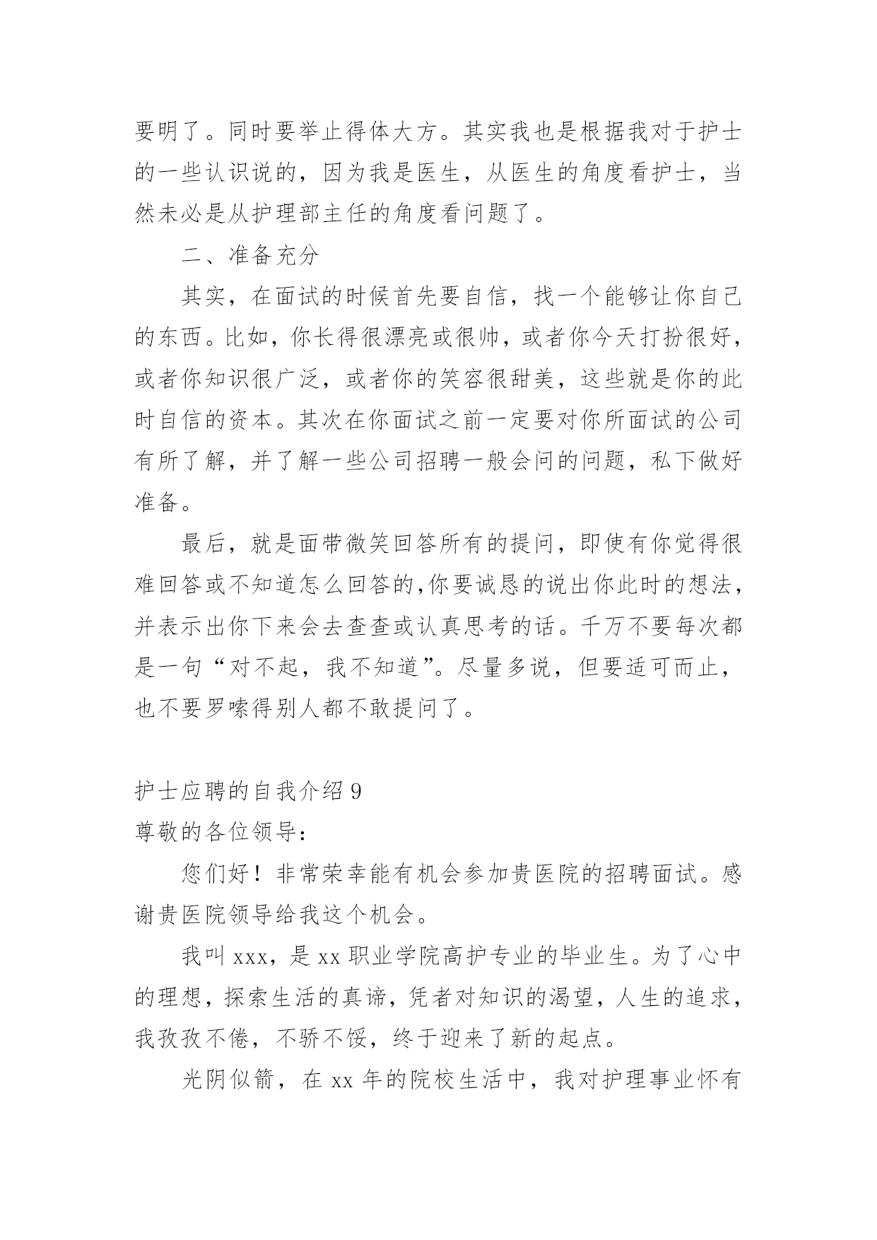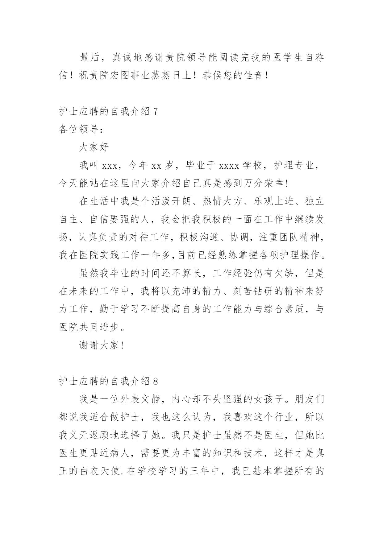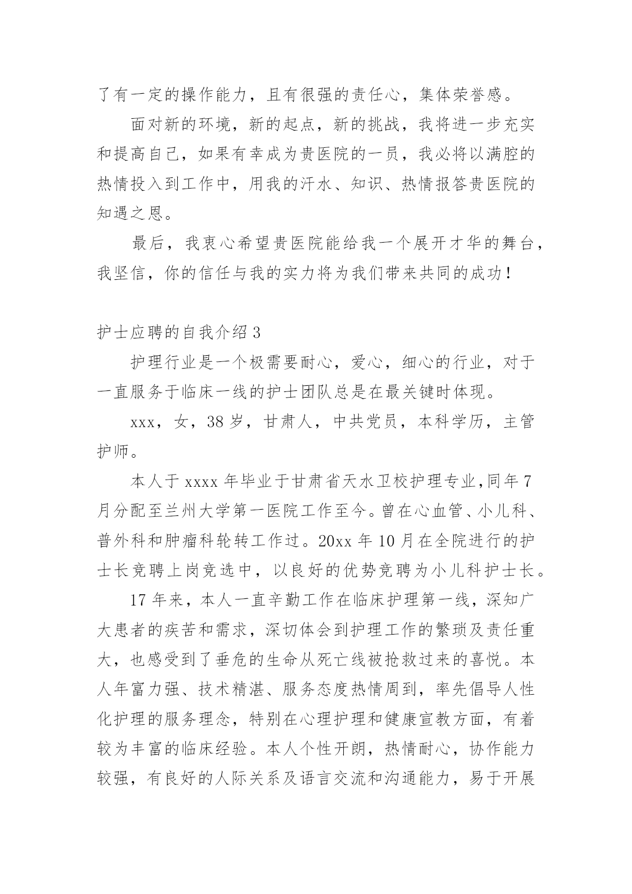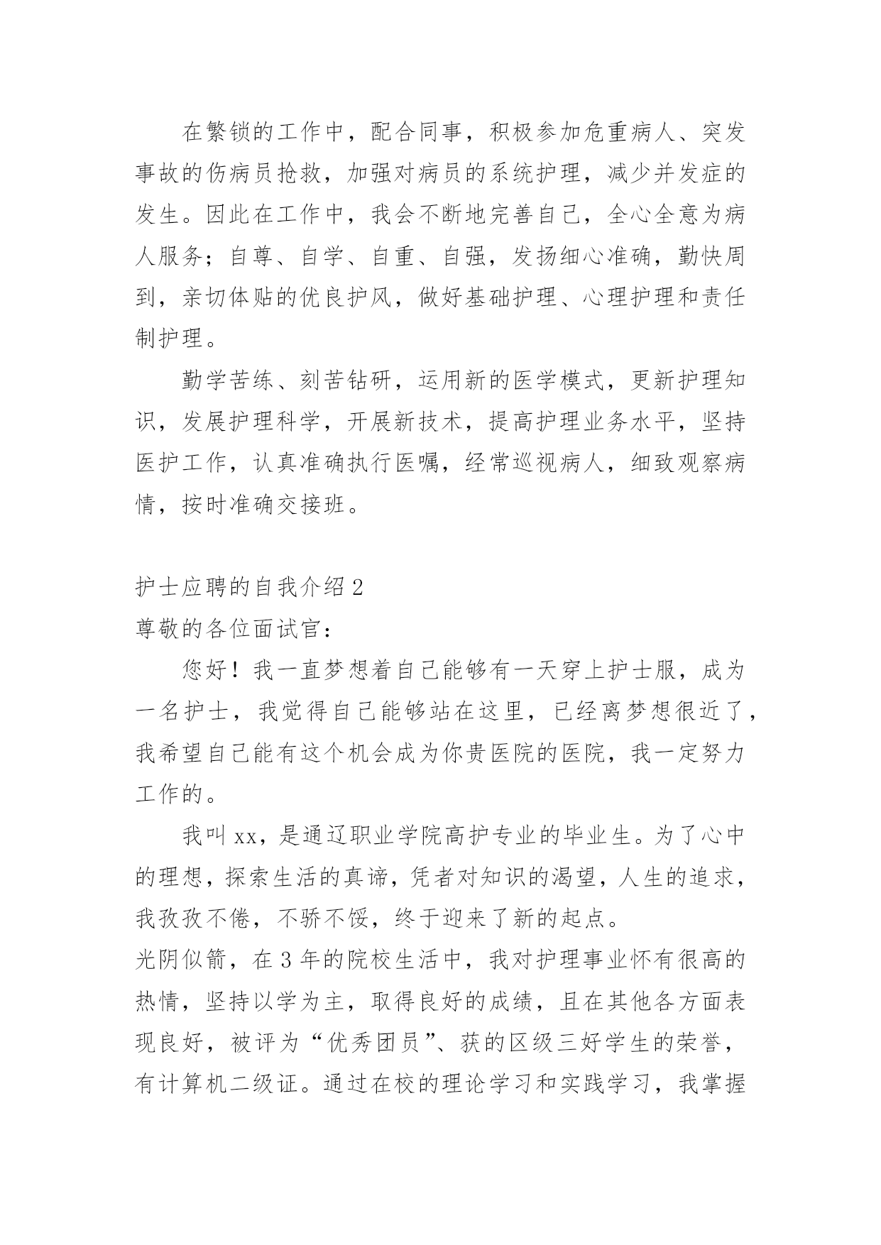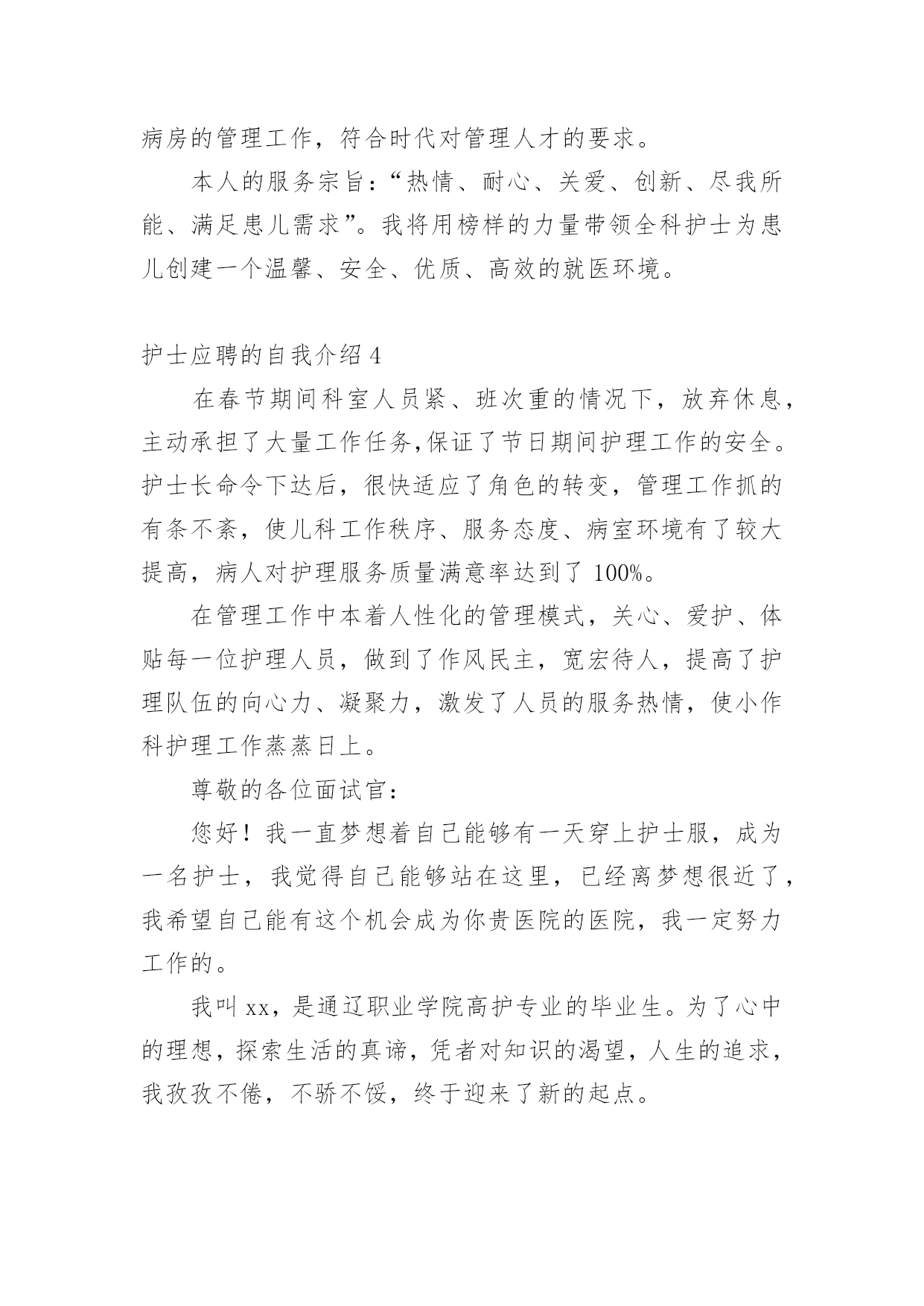 护士应聘的自我介绍当到达一个新的环境后,常常需要我们进行自我介绍,自我介绍是一种认识自我的手段。写起自我介绍来就毫无头绪?下面是小编收集整理的护士应聘的自我介绍,供大家参考借鉴,希望可以帮助到有需要的朋友。护士应聘的自我介绍1我叫xxx,今年xx岁,毕业于xxxx学校,护理专业,今天能站在这里向大家介绍自己真是感到万分荣幸!在生活中我是个活泼开朗、热情大方、乐观上进、独立自主、自信要强的人,我会把我积极的一面在工作中继续发扬,认真负责的对待工作,积极沟通、协调,注重团队精神,我在医院实践工作一年多,目前已经熟练掌握各项护理操作。虽然我毕业的时间还不算长,工作经验仍有欠缺,但是在未来的工作中,我将以充沛的精力、刻苦钻研的精神来努力工作,勤于学习不断提高自身的工作能力与综合素质,与医院共同进步。谢谢大家!我是一位外表文静,内心却不失坚强的女孩子。朋友们都说我适合做护士,我也这么认为,我喜欢这个行业,所以我义无返顾地选择了她。我只是护士虽然不是医生,但她比医生更贴近病人,需要更为丰富的知识和技术,这样才是真正的“白衣天使”。在学校学习的三年中,我已基本掌握所有的护理操作,具备扎实的理论知识,并在后来的见习、实习中积极巩固,使自己的操作更为熟练,知识更为巩固,让理论联系实践,让自己更有经验。在学习的同时,我也不忘培养自己的其他兴趣爱好,我参加学校的各种社团和活动,比如针灸推拿协会、校园文化艺术节等,使自己的针推技术和画技长进不少,另外,在学生会宣传部办海报的工作使我的绘画能力和宣传能力得到很大提高。在外语方面我已具备一定的听说读写能力,也掌握了基本的计算机操作。我有很强的责任心,有很强的集体荣誉感,吃苦耐劳,做事积极认真,乐观开朗,有很好的人际关系,能够认真对待生活,有熟练的护理技能与牢固的专业知识并能灵活运用到实际工作中。我一直相信只要努力面对生活,心存一份感恩,再黑暗的地方也会有光明。我拥有的是年轻的激情,如果您把信任和希望给我,那么我的自信、我的激情,我的能力,将是您最满意的答案!本人从事护理工作十年,有护士证,工作认真负责。如能加入贵院,我会尊守本院的规章制度,爱岗敬业,服从护理部安排,具有同情心、责任感及必备的专业素养,坚持以病人为中心的宗旨,急病人所急,想病人所想,做好解释工作,及时为伤病员排忧解难;认真完成护理部、科室安排的各项工作,不迟到、不早退、不旷工,积极主动做好各项临床护理工作,随着系列化整体护理的设立,更好体现护理工作的重要。在繁锁的工作中,配合同事,积极参加危重病人、突发事故的伤病员抢救,加强对病员的系统护理,减少并发症的发生。因此在工作中,我会不断地完善自己,全心全意为病人服务;自尊、自学、自重、自强,发扬细心准确,勤快周到,亲切体贴的优良护风,做好基础护理、心理护理和责任制护理。勤学苦练、刻苦钻研,运用新的医学模式,更新护理知识,发展护理科学,开展新技术,提高护理业务水平,坚持医护工作,认真准确执行医嘱,经常巡视病人,细致观察病情,按时准确交接班。护士应聘的自我介绍2尊敬的各位面试官:您好!我一直梦想着自己能够有一天穿上护士服,成为一名护士,我觉得自己能够站在这里,已经离梦想很近了,我希望自己能有这个机会成为你贵医院的医院,我一定努力工作的。我叫xx,是通辽职业学院高护专业的毕业生。为了心中的理想,探索生活的真谛,凭者对知识的渴望,人生的追求,我孜孜不倦,不骄不馁,终于迎来了新的起点。光阴似箭,在3年的院校生活中,我对护理事业怀有很高的热情,坚持以学为主,取得良好的成绩,且在其他各方面表现良好,被评为“优秀团员”、获的区级三好学生的荣誉,有计算机二级证。通过在校的理论学习和实践学习,我掌握了有一定的操作能力,且有很强的责任心,集体荣誉感。面对新的环境,新的起点,新的挑战,我将进一步充实和提高自己,如果有幸成为贵医院的一员,我必将以满腔的热情投入到工作中,用我的汗水、知识、热情报答贵医院的知遇之恩。最后,我衷心希望贵医院能给我一个展开才华的舞台,我坚信,你的信任与我的实力将为我们带来共同的成功!护士应聘的自我介绍3护理行业是一个极需要耐心,爱心,细心的行业,对于一直服务于临床一线的护士团队总是在最关键时体现。xxx,女,38岁,甘肃人,中共党员,本科学历,主管护师。本人于xxxx年毕业于甘肃省天水卫校护理专业,同年7月分配至兰州大学第一医院工作至今。曾在心血管、小儿科、普外科和肿瘤科轮转工作过。20xx年10月在全院进行的护士长竞聘上岗竞选中,以良好的优势竞聘为小儿科护士长。17年来,本人一直辛勤工作在临床护理第一线,深知广大患者的疾苦和需求,深切体会到护理工作的繁琐及责任重大,也感受到了垂危的生命从死亡线被抢救过来的喜悦。本人年富力强、技术精湛、服务态度热情周到,率先倡导人性化护理的服务理念,特别在心