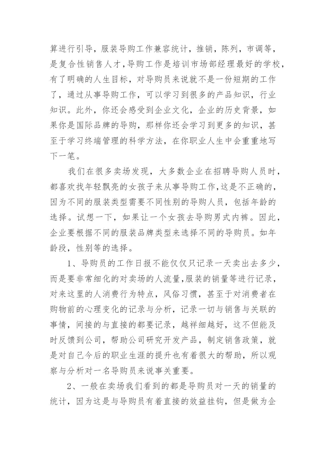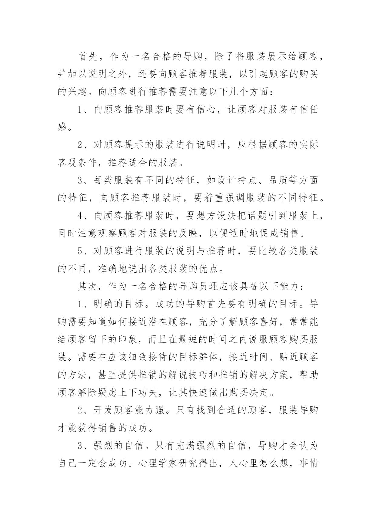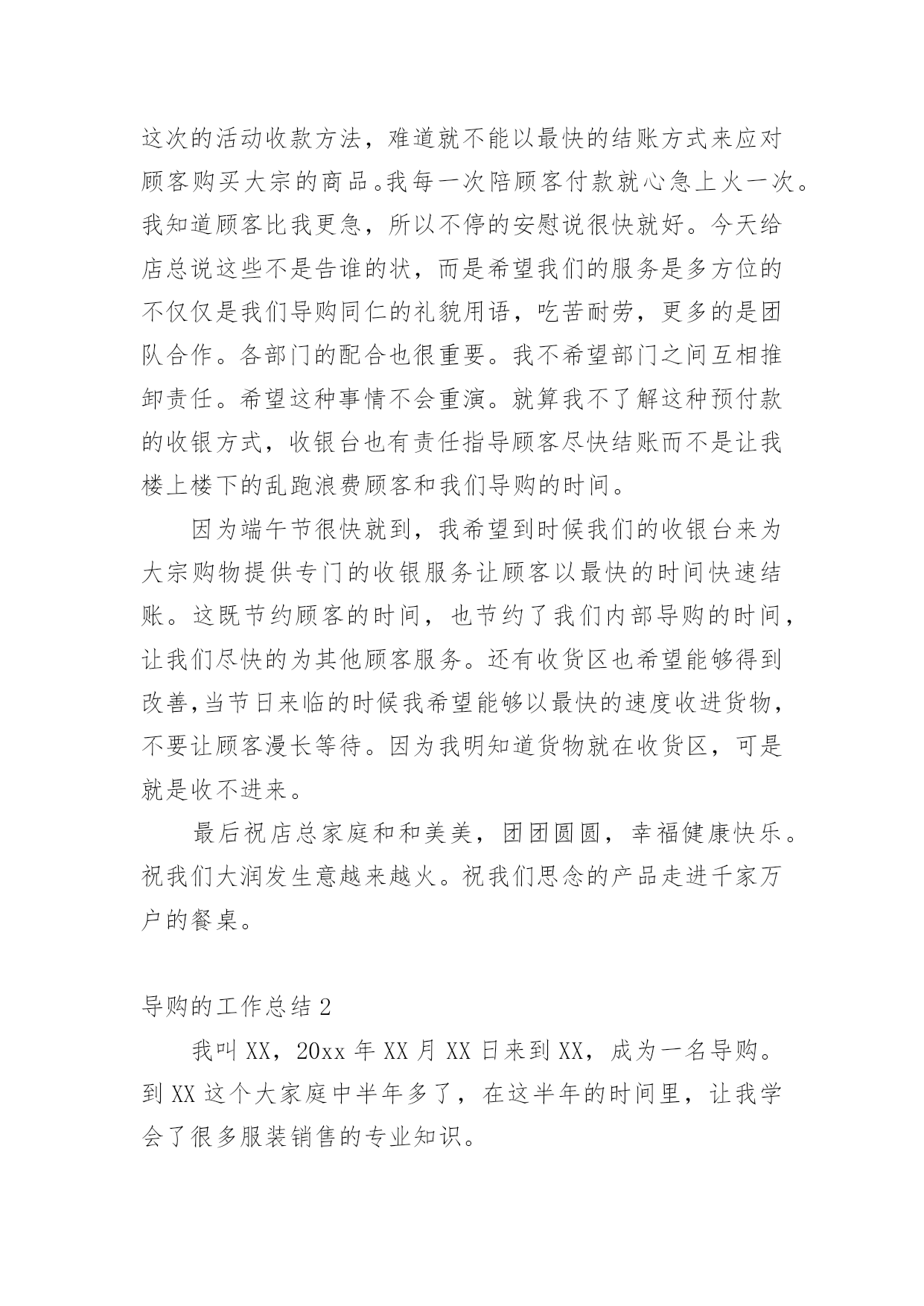 导购的工作总结总结是对某一阶段的工作、学习或思想中的经验或情况进行分析研究的书面材料,写总结有利于我们学习和工作能力的提高,因此我们要做好归纳,写好总结。总结怎么写才是正确的呢?下面是小编帮大家整理的导购的工作总结,欢迎大家分享。导购的工作总结120xx年已经落幕,20xx年繁忙的节日终于落幕。作为一名思念公司的导购,商场未开业之前就参加了店内地面清洁~安装货架~设备摆放~货物进场之前的一系列工作,更是参与了开店后的繁忙景象的洗礼。因为对大润发满怀着希望和深深的眷念之情,使我一次次放弃了在遇到困难和挫折后的气馁和失望。在门店不论是商场组织的生日宴会,还是各种公布促销员的信息,我们思念的名字都是排在第一个的,这是我的荣幸,也是我们思念品牌的成功。在卖场的每一天,我都被一些东西感动着。还记得刚进场上班,在一次的工作中,我的手被铁片化破了,商场的部门经理亲自为我包扎,而我们当时的区域经理得知后也不辞辛苦远道赶来亲自把我送到医院治疗。人一生有很多的感动,有些感动是一顺间的,有些是一日的,有些是一生的,而那一天我真的被感动了。这些点滴都深刻的铭刻在我的心里。每当我在工作中感到委屈,辛苦的时候,想起这些,都会感到安慰和鼓舞。更加坚定了我在思念在卖场工作的信心。门店开业至今,三年多的时间里,许多品牌的促销员都换了一茬又一茬,唯独我,三年来一直坚守在这块阵上。我相信,我会把与思念与卖场的这段缘份一直坚持延续下去。而我们思念的旗帜也会一直在卖场这块阵地上飘扬下去。都说商场如战场,在这竞争激烈甚至残酷的战场上,我和我们的各个厂商的促销团队都愿意紧紧的和公司和卖场站在一起,用我们的热情和双手为我们的公司打拼出一片更广阔的天地。已经经历了快4年的风雨,我和同事们一起与大润发共同成长。有欢乐有哭泣。但更多的是收获。作为一名导购在最基层的工作岗位中遇到的许多问题不是三言两语就能够表达清楚的,今天给店总写信,只是表达作为一名最下层导购的心声。我一直感觉,今年的生意要比往年好很多。顾客也就相对的比较多。可是年前冷柜生意却没有了往年的大宗团购。所以盼望着元宵节的团购会多一些。可是,当有了生意的时候,却出现了我想不到的状况。往年顾客都可以预付款提前订货,可是,今年怎么就这么难。在人山人海中我花了一个小时的时间陪顾客挑好了商品,定好了提货时间,然后陪着顾客排了10分钟的队,等到要付款时,可是收银员却拒收预付款。我找到收银服务台问为什么,他们说付不了这个责任,让我找防损。我就跑去防损办公室却没有人,我又急急忙忙跑去楼上办公室找防损科长,科长说你先下去我马上就打电话,我只好下去在陪着客人等,总算防损来人却说你付款就付好了关防损什么事情,我又去找收银服务台,他们依然不肯收款。客人等的很急,我打电话给科长,科长说可以收的,可是收银台就是拒收。这样花了一小时,客人等急了,摔下货物愤怒离去。这样的事情我遇到很多次。每当客人甩手离去的时候我的眼泪因心急气愤夺眶而出。我不可惜货物没有卖出去,我可惜的是我们永远失去了这几个大顾客。他们对我们的服务在最后关头带着失望而去的背影让我心痛。我花了那么长时间,耐心的为顾客服务最后因为几分钟的收银不成而宣告失败。那种心痛和气愤不是言语能够表达的,当更多的顾客有这些要求时我就不敢应答,我怕失去更多的这样大量的团购。万般无奈之下我跑去你的办公室希望得到你的帮助和解决的可是你不在。许经理听了我因为气愤和心情过于激动而语无伦次的陈述后才得以让我们的科长陪同客人一起到收银台才可以收预付款。可是科长也有很多事情要做,不可能一直守在收银台等顾客结账。在此之前好多顾客失望而归。还有我陪着顾客付款时却不说排着长长的队,等待在等待,等要付款的时候麻烦又来了,比方一个顾客买了700包商品,电脑打印就700个一个一个的打,一个收银小票就打了很多分钟。小票长的我饶了好几圈。不要说顾客等的心急我更急。因为更多的顾客等着我去提货送货。为什么连小学一年级都会算的题目收银台电脑就是这种收款法。我们的收银台电脑设置为什么不在活动之前就设置好这次的活动收款方法,难道就不能以最快的结账方式来应对顾客购买大宗的商品。我每一次陪顾客付款就心急上火一次。我知道顾客比我更急,所以不停的安慰说很快就好。今天给店总说这些不是告谁的状,而是希望我们的服务是多方位的不仅仅是我们导购同仁的礼貌用语,吃苦耐劳,更多的是团队合作。各部门的配合也很重要。我不希望部门之间互相推卸责任。希望这种事情不会重演。就算我不了解这种预付款的收银方式,收银台也有责任指导顾客尽快结账而不是让我楼上楼下的乱跑浪费顾客和我们导购的时间。因为端午节很快就到,我希望到时候我们的收银台来为大宗购物提供专门的收银服务让顾客以最快的时间快速结账。这既节约顾客的时间,也节约了我们内部导购的时间,让我们尽快的为其他顾客服务。还有收货区