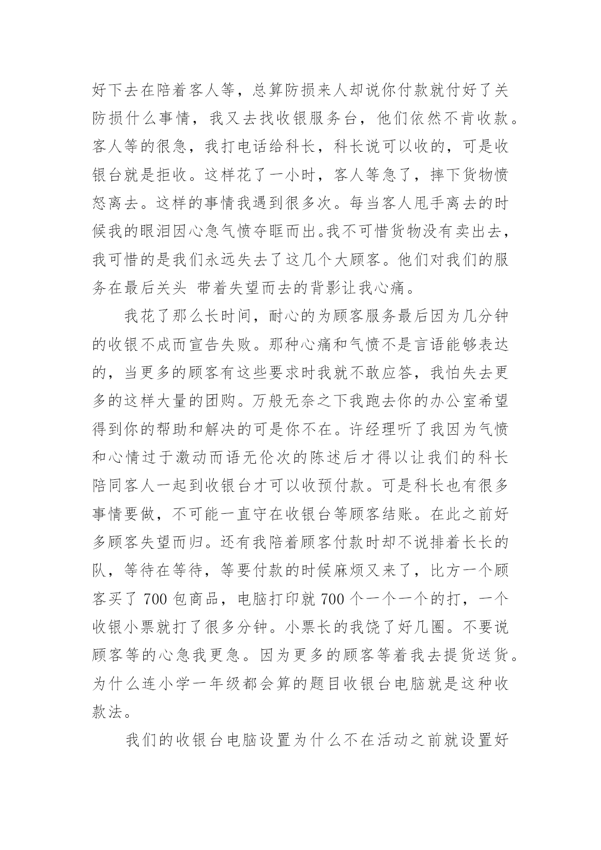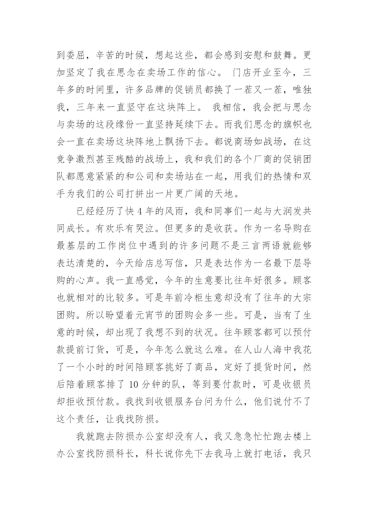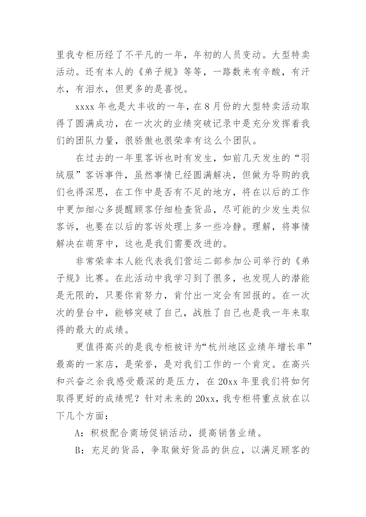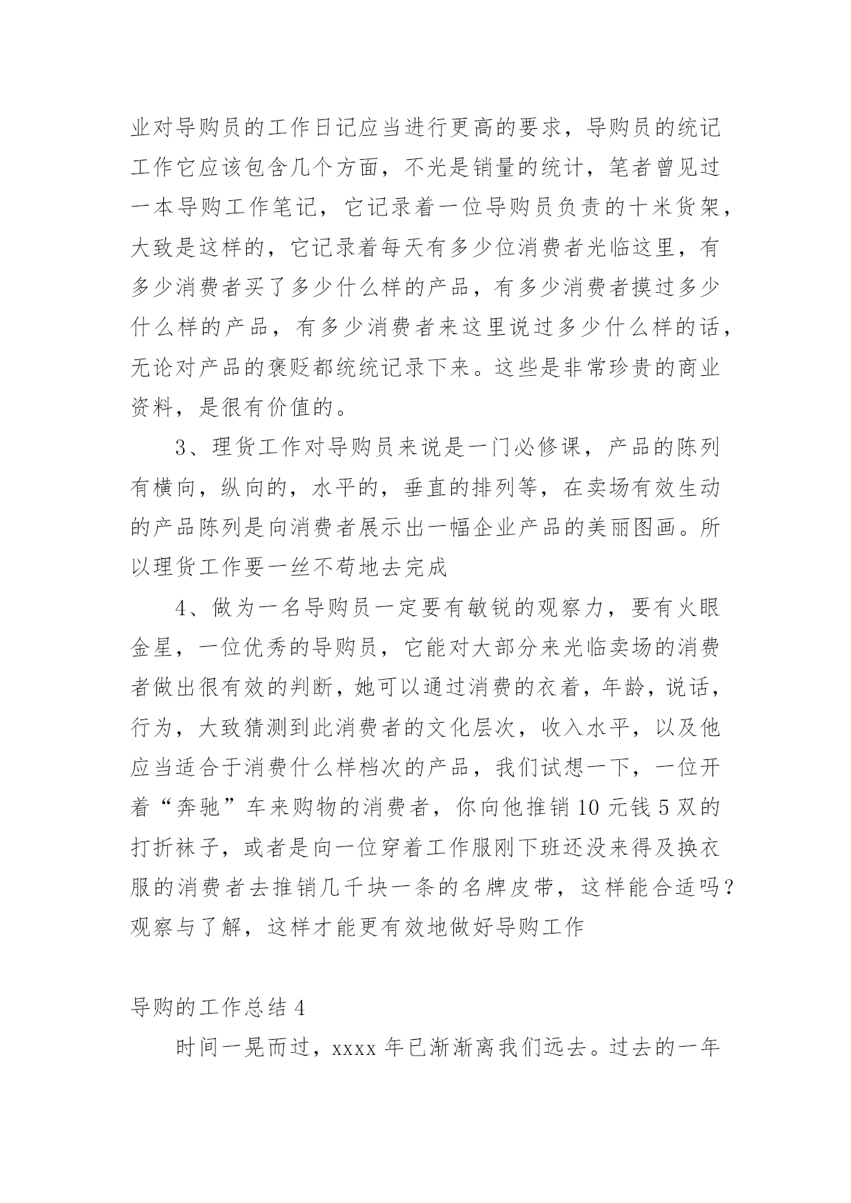 导购的工作总结总结是对某一阶段的工作、学习或思想中的经验或情况进行分析研究的书面材料,写总结有利于我们学习和工作能力的提高,因此我们要做好归纳,写好总结。总结怎么写才是正确的呢?下面是小编帮大家整理的导购的工作总结,欢迎大家分享。导购的工作总结120xx年已经落幕,20xx年繁忙的节日终于落幕。作为一名思念公司的导购,商场未开业之前就参加了店内地面清洁~安装货架~设备摆放~货物进场之前的一系列工作,更是参与了开店后的繁忙景象的洗礼。因为对大润发满怀着希望和深深的眷念之情,使我一次次放弃了在遇到困难和挫折后的气馁和失望。在门店不论是商场组织的生日宴会,还是各种公布促销员的信息,我们思念的名字都是排在第一个的,这是我的荣幸,也是我们思念品牌的成功。在卖场的每一天,我都被一些东西感动着。还记得刚进场上班,在一次的工作中,我的手被铁片化破了,商场的部门经理亲自为我包扎,而我们当时的区域经理得知后也不辞辛苦远道赶来亲自把我送到医院治疗。人一生有很多的感动,有些感动是一顺间的,有些是一日的,有些是一生的,而那一天我真的被感动了。这些点滴都深刻的铭刻在我的心里。每当我在工作中感到委屈,辛苦的时候,想起这些,都会感到安慰和鼓舞。更加坚定了我在思念在卖场工作的信心。门店开业至今,三年多的时间里,许多品牌的促销员都换了一茬又一茬,唯独我,三年来一直坚守在这块阵上。我相信,我会把与思念与卖场的这段缘份一直坚持延续下去。而我们思念的旗帜也会一直在卖场这块阵地上飘扬下去。都说商场如战场,在这竞争激烈甚至残酷的战场上,我和我们的各个厂商的促销团队都愿意紧紧的和公司和卖场站在一起,用我们的热情和双手为我们的公司打拼出一片更广阔的天地。已经经历了快4年的风雨,我和同事们一起与大润发共同成长。有欢乐有哭泣。但更多的是收获。作为一名导购在最基层的工作岗位中遇到的许多问题不是三言两语就能够表达清楚的,今天给店总写信,只是表达作为一名最下层导购的心声。我一直感觉,今年的生意要比往年好很多。顾客也就相对的比较多。可是年前冷柜生意却没有了往年的大宗团购。所以盼望着元宵节的团购会多一些。可是,当有了生意的时候,却出现了我想不到的状况。往年顾客都可以预付款提前订货,可是,今年怎么就这么难。在人山人海中我花了一个小时的时间陪顾客挑好了商品,定好了提货时间,然后陪着顾客排了10分钟的队,等到要付款时,可是收银员却拒收预付款。我找到收银服务台问为什么,他们说付不了这个责任,让我找防损。我就跑去防损办公室却没有人,我又急急忙忙跑去楼上办公室找防损科长,科长说你先下去我马上就打电话,我只好下去在陪着客人等,总算防损来人却说你付款就付好了关防损什么事情,我又去找收银服务台,他们依然不肯收款。客人等的很急,我打电话给科长,科长说可以收的,可是收银台就是拒收。这样花了一小时,客人等急了,摔下货物愤怒离去。这样的事情我遇到很多次。每当客人甩手离去的时候我的眼泪因心急气愤夺眶而出。我不可惜货物没有卖出去,我可惜的是我们永远失去了这几个大顾客。他们对我们的服务在最后关头带着失望而去的背影让我心痛。我花了那么长时间,耐心的为顾客服务最后因为几分钟的收银不成而宣告失败。那种心痛和气愤不是言语能够表达的,当更多的顾客有这些要求时我就不敢应答,我怕失去更多的这样大量的团购。万般无奈之下我跑去你的办公室希望得到你的帮助和解决的可是你不在。许经理听了我因为气愤和心情过于激动而语无伦次的陈述后才得以让我们的科长陪同客人一起到收银台才可以收预付款。可是科长也有很多事情要做,不可能一直守在收银台等顾客结账。在此之前好多顾客失望而归。还有我陪着顾客付款时却不说排着长长的队,等待在等待,等要付款的时候麻烦又来了,比方一个顾客买了700包商品,电脑打印就700个一个一个的打,一个收银小票就打了很多分钟。小票长的我饶了好几圈。不要说顾客等的心急我更急。因为更多的顾客等着我去提货送货。为什么连小学一年级都会算的题目收银台电脑就是这种收款法。我们的收银台电脑设置为什么不在活动之前就设置好这次的活动收款方法,难道就不能以最快的结账方式来应对顾客购买大宗的商品。我每一次陪顾客付款就心急上火一次。我知道顾客比我更急,所以不停的安慰说很快就好。今天给店总说这些不是告谁的状,而是希望我们的服务是多方位的不仅仅是我们导购同仁的礼貌用语,吃苦耐劳,更多的是团队合作。各部门的配合也很重要。我不希望部门之间互相推卸责任。希望这种事情不会重演。就算我不了解这种预付款的收银方式,收银台也有责任指导顾客尽快结账而不是让我楼上楼下的乱跑浪费顾客和我们导购的时间。因为端午节很快就到,我希望到时候我们的收银台来为大宗购物提供专门的收银服务让顾客以最快的时间快速结账。这既节约顾客的时间,也节约了我们内部导购的时间,让我们尽快的为其他顾客服务。还有收货区