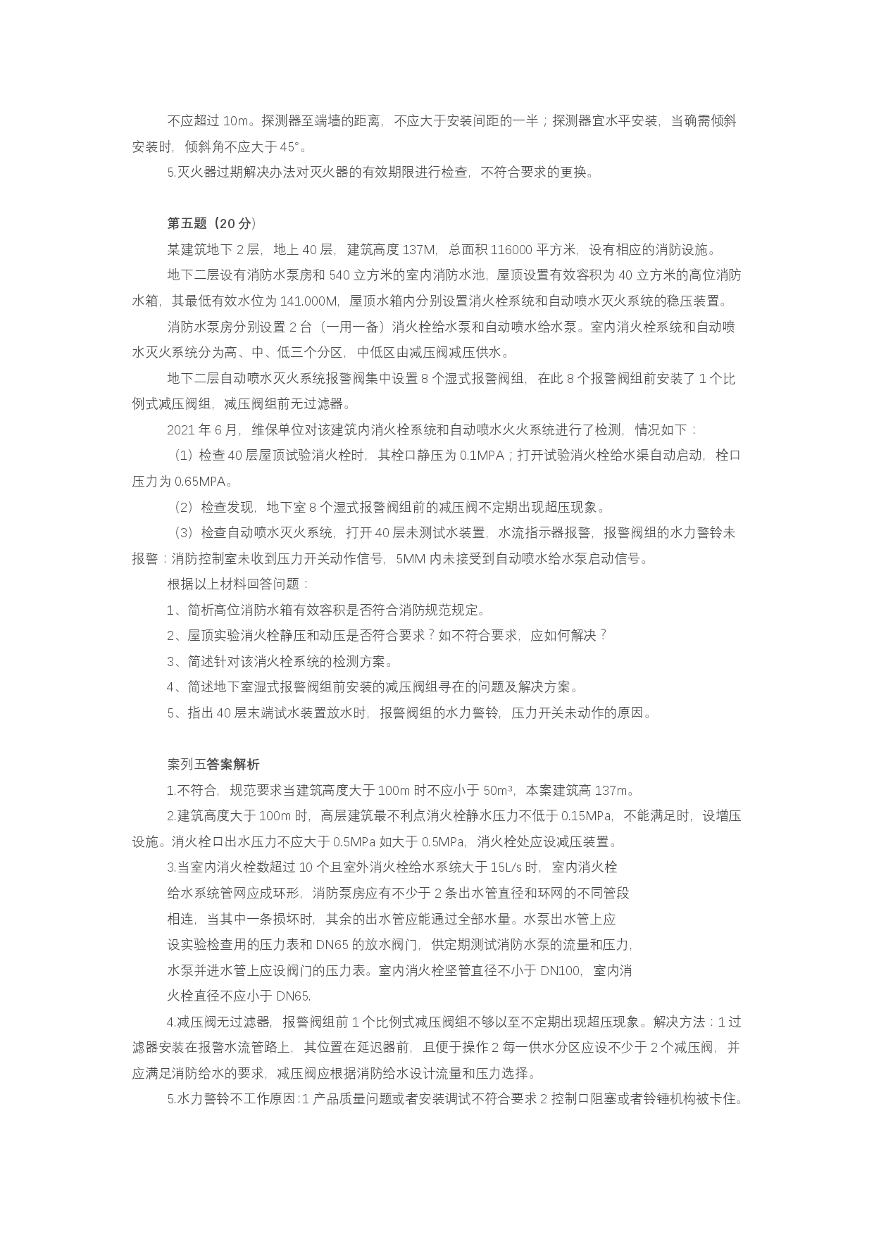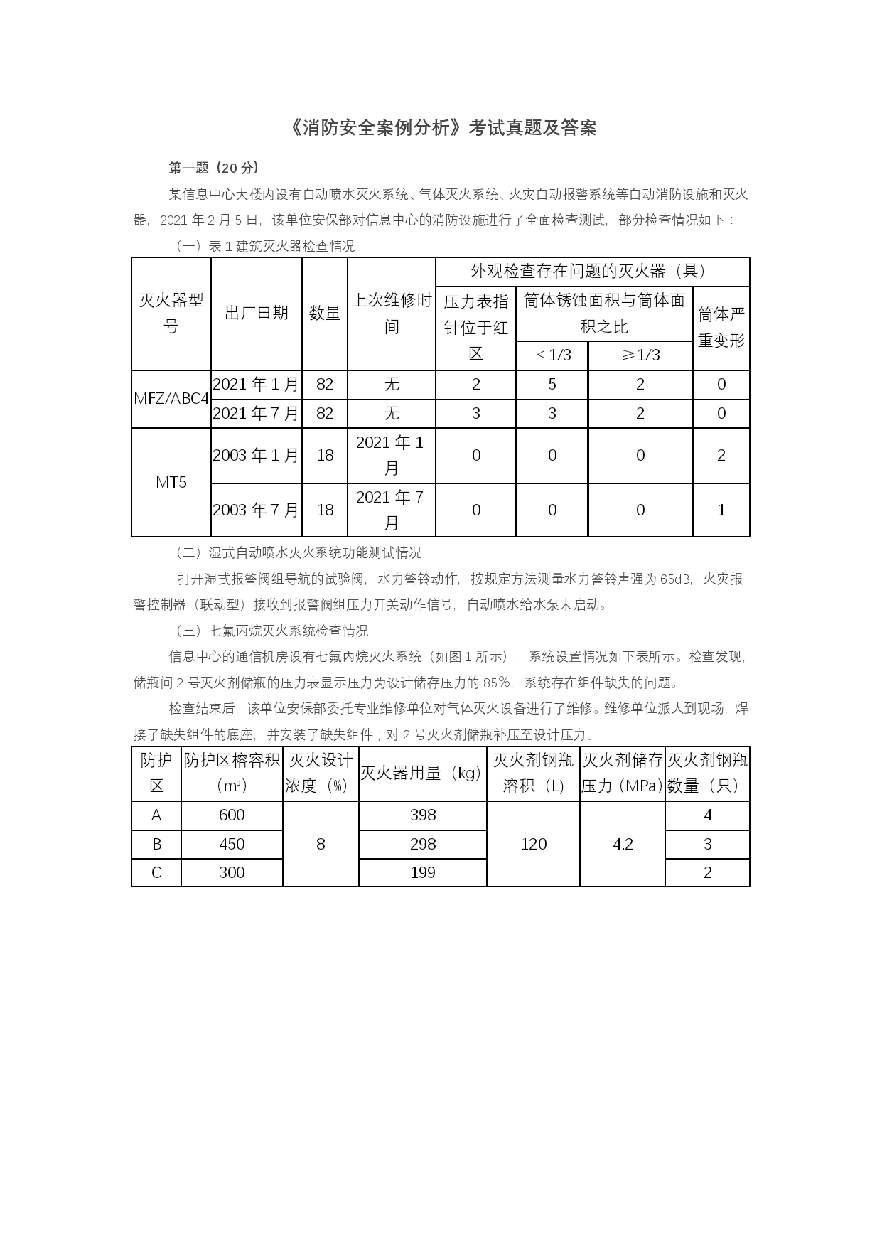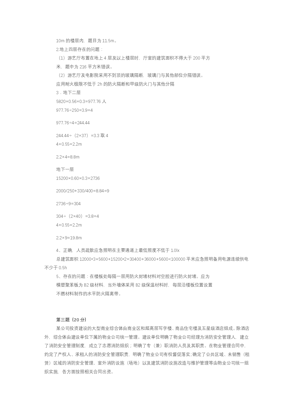 消防安全案例分析真题优质资料(可以直接使用,可编辑优质资料,欢迎下载)《消防安全案例分析》考试真题及答案第一题(20分)某信息中心大楼内设有自动喷水灭火系统、气体灭火系统、火灾自动报警系统等自动消防设施和灭火器,2021年2月5日,该单位安保部对信息中心的消防设施进行了全面检查测试,部分检查情况如下:(一)表1建筑灭火器检查情况灭火器型号出厂日期数量上次维修时间外观检查存在问题的灭火器(具)压力表指针位于红区筒体锈蚀面积与筒体面积之比筒体严重变形<1/3≥1/3MFZ/ABC42021年1月82无25202021年7月82无3320MT52003年1月182021年1月00022003年7月182021年7月0001(二)湿式自动喷水灭火系统功能测试情况打开湿式报警阀组导航的试验阀,水力警铃动作,按规定方法测量水力警铃声强为65dB,火灾报警控制器(联动型)接收到报警阀组压力开关动作信号,自动喷水给水泵未启动。(三)七氟丙烷灭火系统检查情况信息中心的通信机房设有七氟丙烷灭火系统(如图1所示),系统设置情况如下表所示。检查发现,储瓶间2号灭火剂储瓶的压力表显示压力为设计储存压力的85%,系统存在组件缺失的问题。检查结束后,该单位安保部委托专业维修单位对气体灭火设备进行了维修。维修单位派人到现场,焊接了缺失组件的底座,并安装了缺失组件;对2号灭火剂储瓶补压至设计压力。防护区防护区榕容积(m3)灭火设计浓度(%)灭火器用量(kg)灭火剂钢瓶溶积(L)灭火剂储存压力(MPa)灭火剂钢瓶数量(只)A60083981204.24B4502983C3001992图一七氟丙烷灭火系统组成示意图根据以上材料,回答问题:1.根据建筑灭火器检查情况,简述哪些灭火器需要维修、报废。2.根据素材(二)的场景中存在的问题及自动喷水给水泵未启动的原因,并简述温式自动喷水灭火系统联动功能检查测试的方法。3.七氟丙烷灭火系统在储罐间内未安装哪些组件?最大保护区对应的装置为几号驱动气瓶?4.简述维修单位对储瓶间气体灭火设备维修时存在的问题。案例一答案解析1.MFZ/ABC42021年1月的全部需要维修,因此种类灭火器出厂期满5年必须检修。2021年7月2只筒体腐蚀面积与筒体面积之比大于1/3需报废。MF52003年1月全部报废,因此种灭火器报废年段为出厂期满12年。2003年7月1具因筒体严重变形应报废。2存在问题:水力警铃声强题中为65dB,实际应为70dB。自动喷水给水泵未启动是因为:1水力警铃声强未达到规定声强2.水流指示器在水流动作后不报信号检查方法:(1)系统控制装置设置为"自动"控制方式,启动一只喷头或者开启末端试水装置,流量保持在,水流指示器、报警阀、压力开关、水力警铃和消防水泵等及时动作,并有相应组件的动作信号反馈到消防联动控制设备。(2)打开阀门放水,使用流量计、压力表核定流量、压力,目测观察系统动作情况。3未安装的组件为瓶头阀,最大防火区对应的驱动装置为2号驱动气瓶,因为根据表2,最大的防护区A需要灭火剂钢瓶数量为4只,从图1中可知只有2号驱动气瓶连接4只灭火剂钢瓶,因此对应驱动装置为2号驱动气瓶。4(1)组件应厂外焊接厂内安装(2)应到专门补压房间进行补压,并测试(3)查明气罐压力不足原因并维修(4)分级存压。第二题(20分)某购物中心地下2层,地上4层,建筑高度24米,耐火等级二级,地下2层室内地面与室外出入口地坪高差为11.5m。地下每层建筑面积15200平方米,地下2层设置汽车库和变配电房,消防水泵房等设备用房及建筑面积5820平方米的建材商城(经营五金,洁具,瓷砖,桶装油漆,香蕉水等);地下一层为家具,灯饰商场,设有多部自动扶梯与建材商场连通,自动扶梯上下层相连通的开口部位设置防火卷帘,地下商场部分的每个防火分区面积不大于2000平方米,采用耐火极限为1.5h的不然性楼板和防火墙及符合规定的防火卷帘进行分隔,在相邻防火区的防火墙上均设有向疏散方向开启的甲级防火门。地上一层至三层为商场,每层建筑面积12000平方米,主要经营服装、鞋类、箱包和电器等商品,四层建筑面积5600平方米,主要功能为餐厅、游艺厅、儿童游乐厅和电影院。电影院有8个观众厅,每个观众厅建筑面积在186平米-390平米之间;游艺厅有2个厅室,建筑面积分别为216平米、147平米,游艺厅和电影院候场区均采用不到顶的玻璃隔断,玻璃门与其他部分分隔,安全出口符合规范规定。每层疏散照明的地面水平照度为1.01x,备用电源连续供电时间0.6h。购物中心外墙保温系统的保温材料采用模塑聚苯板,保温材料与基层墙体、装饰层之间有的空腔,在楼板处每隔一层用防火封堵材料对空腔进行防火封堵。购物中心按规范设置了
