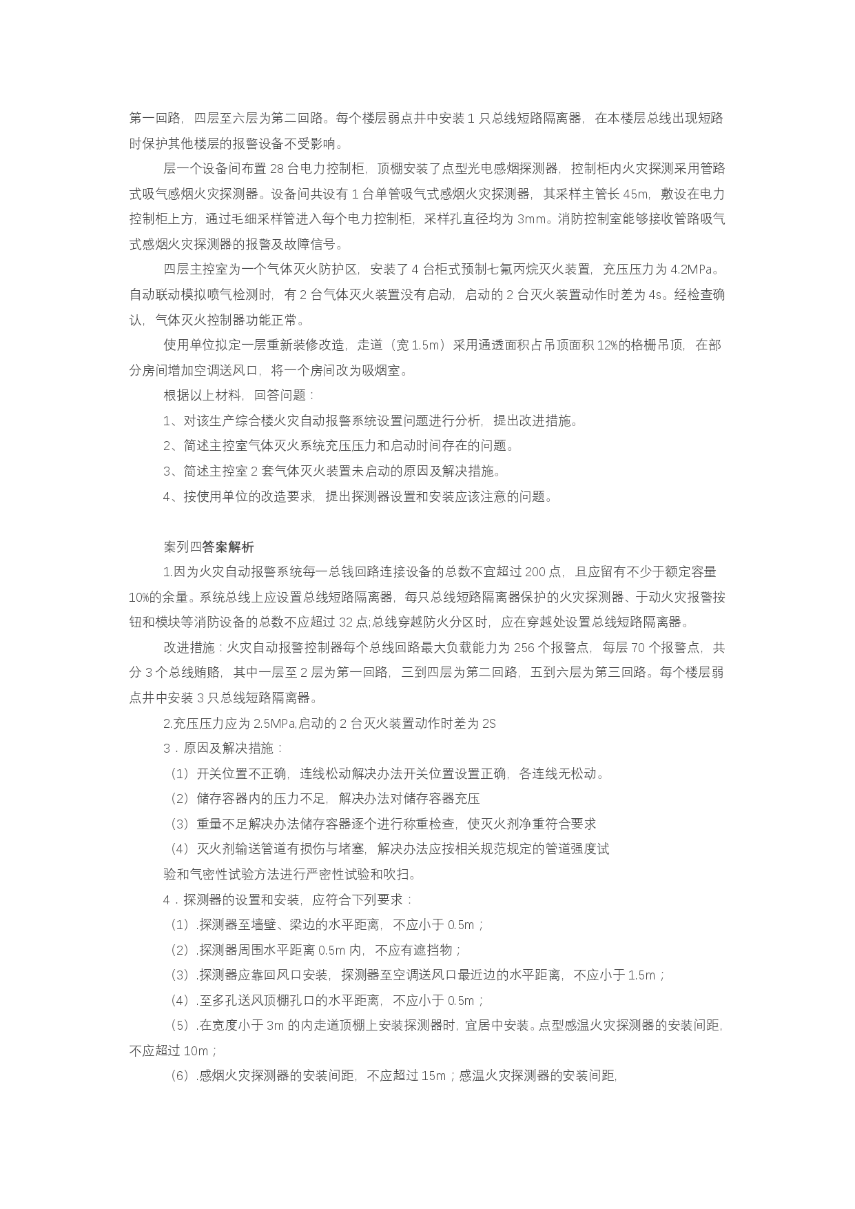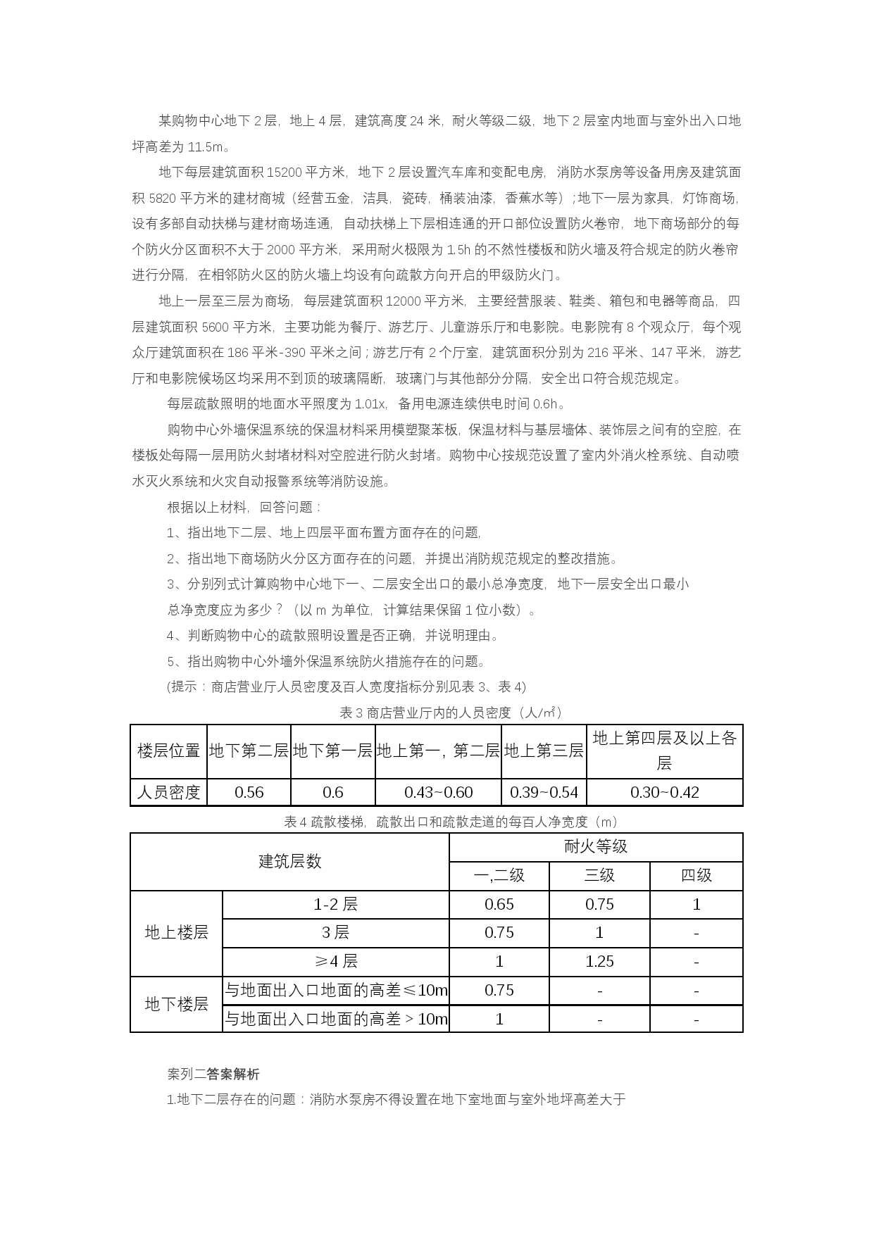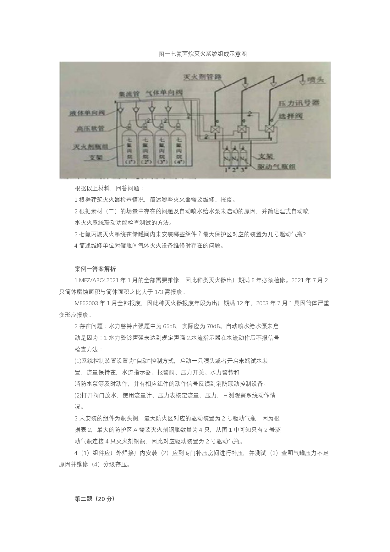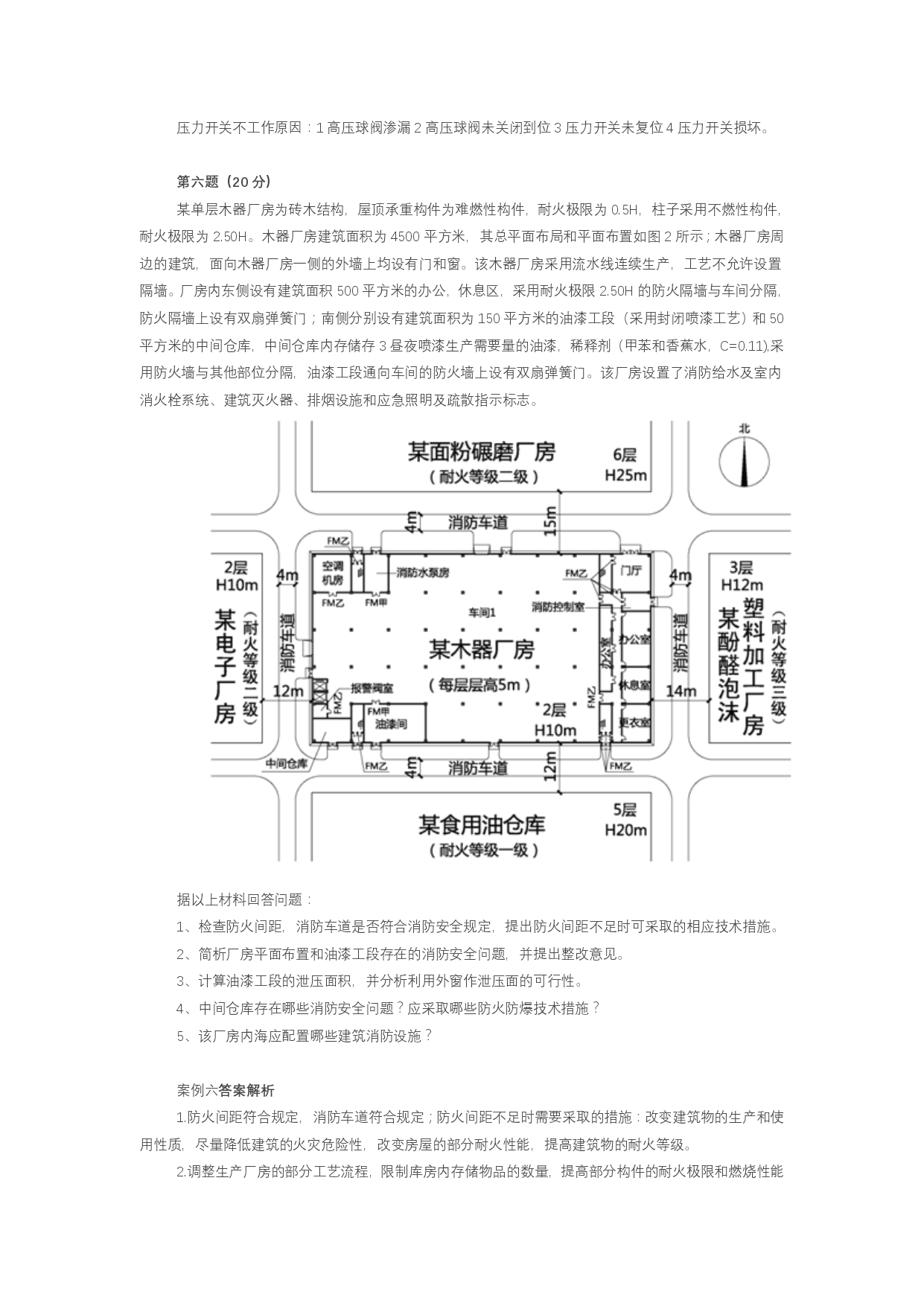 消防安全案例分析真题优质资料(可以直接使用,可编辑优质资料,欢迎下载)《消防安全案例分析》考试真题及答案第一题(20分)某信息中心大楼内设有自动喷水灭火系统、气体灭火系统、火灾自动报警系统等自动消防设施和灭火器,2021年2月5日,该单位安保部对信息中心的消防设施进行了全面检查测试,部分检查情况如下:(一)表1建筑灭火器检查情况灭火器型号出厂日期数量上次维修时间外观检查存在问题的灭火器(具)压力表指针位于红区筒体锈蚀面积与筒体面积之比筒体严重变形<1/3≥1/3MFZ/ABC42021年1月82无25202021年7月82无3320MT52003年1月182021年1月00022003年7月182021年7月0001(二)湿式自动喷水灭火系统功能测试情况打开湿式报警阀组导航的试验阀,水力警铃动作,按规定方法测量水力警铃声强为65dB,火灾报警控制器(联动型)接收到报警阀组压力开关动作信号,自动喷水给水泵未启动。(三)七氟丙烷灭火系统检查情况信息中心的通信机房设有七氟丙烷灭火系统(如图1所示),系统设置情况如下表所示。检查发现,储瓶间2号灭火剂储瓶的压力表显示压力为设计储存压力的85%,系统存在组件缺失的问题。检查结束后,该单位安保部委托专业维修单位对气体灭火设备进行了维修。维修单位派人到现场,焊接了缺失组件的底座,并安装了缺失组件;对2号灭火剂储瓶补压至设计压力。防护区防护区榕容积(m3)灭火设计浓度(%)灭火器用量(kg)灭火剂钢瓶溶积(L)灭火剂储存压力(MPa)灭火剂钢瓶数量(只)A60083981204.24B4502983C3001992图一七氟丙烷灭火系统组成示意图根据以上材料,回答问题:1.根据建筑灭火器检查情况,简述哪些灭火器需要维修、报废。2.根据素材(二)的场景中存在的问题及自动喷水给水泵未启动的原因,并简述温式自动喷水灭火系统联动功能检查测试的方法。3.七氟丙烷灭火系统在储罐间内未安装哪些组件?最大保护区对应的装置为几号驱动气瓶?4.简述维修单位对储瓶间气体灭火设备维修时存在的问题。案例一答案解析1.MFZ/ABC42021年1月的全部需要维修,因此种类灭火器出厂期满5年必须检修。2021年7月2只筒体腐蚀面积与筒体面积之比大于1/3需报废。MF52003年1月全部报废,因此种灭火器报废年段为出厂期满12年。2003年7月1具因筒体严重变形应报废。2存在问题:水力警铃声强题中为65dB,实际应为70dB。自动喷水给水泵未启动是因为:1水力警铃声强未达到规定声强2.水流指示器在水流动作后不报信号检查方法:(1)系统控制装置设置为"自动"控制方式,启动一只喷头或者开启末端试水装置,流量保持在,水流指示器、报警阀、压力开关、水力警铃和消防水泵等及时动作,并有相应组件的动作信号反馈到消防联动控制设备。(2)打开阀门放水,使用流量计、压力表核定流量、压力,目测观察系统动作情况。3未安装的组件为瓶头阀,最大防火区对应的驱动装置为2号驱动气瓶,因为根据表2,最大的防护区A需要灭火剂钢瓶数量为4只,从图1中可知只有2号驱动气瓶连接4只灭火剂钢瓶,因此对应驱动装置为2号驱动气瓶。4(1)组件应厂外焊接厂内安装(2)应到专门补压房间进行补压,并测试(3)查明气罐压力不足原因并维修(4)分级存压。第二题(20分)某购物中心地下2层,地上4层,建筑高度24米,耐火等级二级,地下2层室内地面与室外出入口地坪高差为11.5m。地下每层建筑面积15200平方米,地下2层设置汽车库和变配电房,消防水泵房等设备用房及建筑面积5820平方米的建材商城(经营五金,洁具,瓷砖,桶装油漆,香蕉水等);地下一层为家具,灯饰商场,设有多部自动扶梯与建材商场连通,自动扶梯上下层相连通的开口部位设置防火卷帘,地下商场部分的每个防火分区面积不大于2000平方米,采用耐火极限为1.5h的不然性楼板和防火墙及符合规定的防火卷帘进行分隔,在相邻防火区的防火墙上均设有向疏散方向开启的甲级防火门。地上一层至三层为商场,每层建筑面积12000平方米,主要经营服装、鞋类、箱包和电器等商品,四层建筑面积5600平方米,主要功能为餐厅、游艺厅、儿童游乐厅和电影院。电影院有8个观众厅,每个观众厅建筑面积在186平米-390平米之间;游艺厅有2个厅室,建筑面积分别为216平米、147平米,游艺厅和电影院候场区均采用不到顶的玻璃隔断,玻璃门与其他部分分隔,安全出口符合规范规定。每层疏散照明的地面水平照度为1.01x,备用电源连续供电时间0.6h。购物中心外墙保温系统的保温材料采用模塑聚苯板,保温材料与基层墙体、装饰层之间有的空腔,在楼板处每隔一层用防火封堵材料对空腔进行防火封堵。购物中心按规范设置了