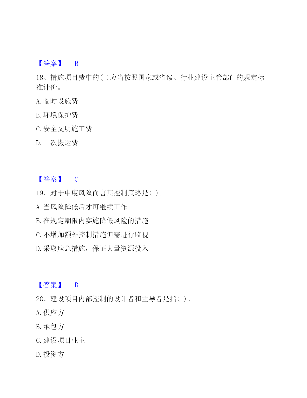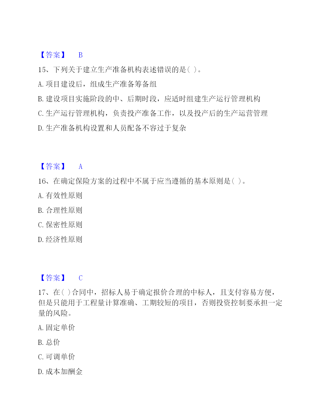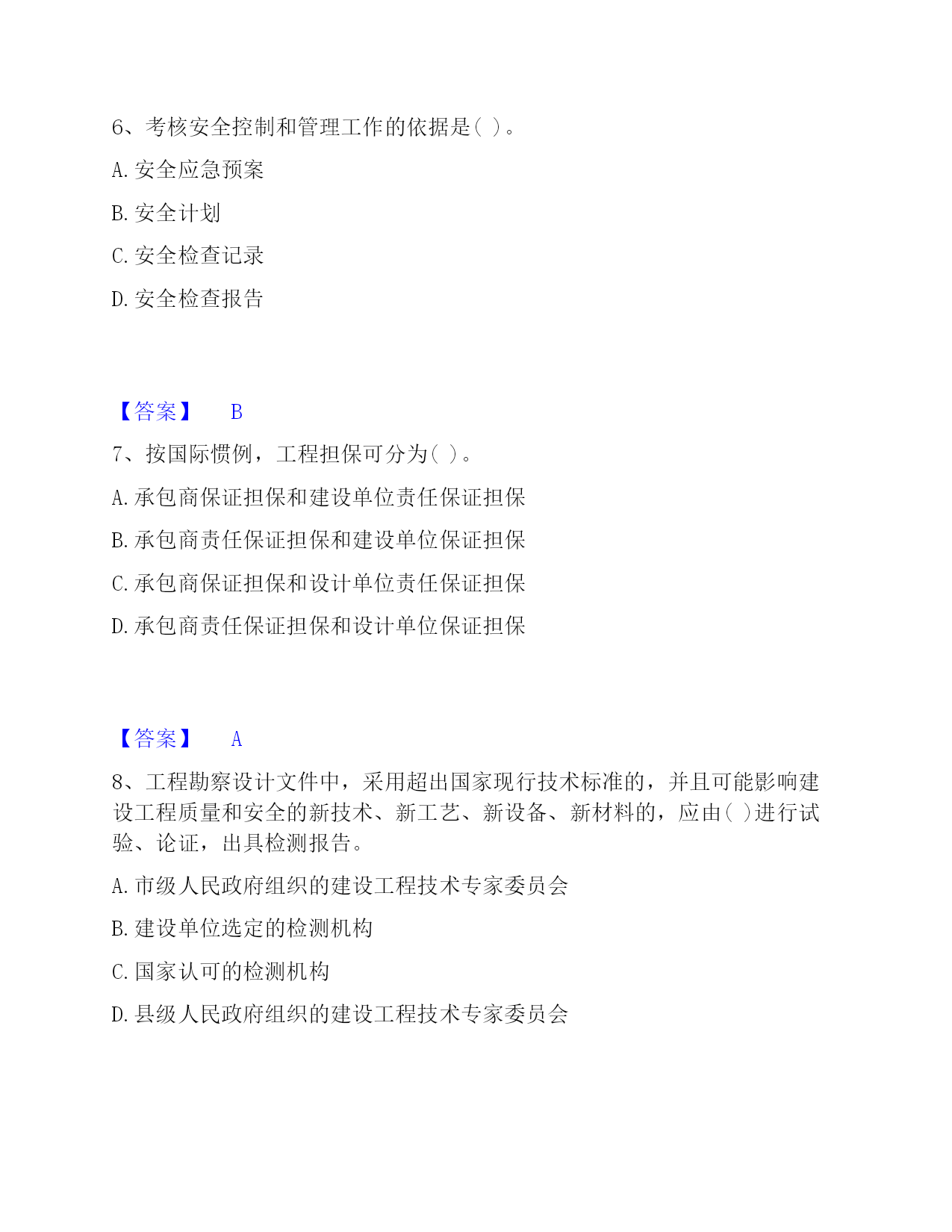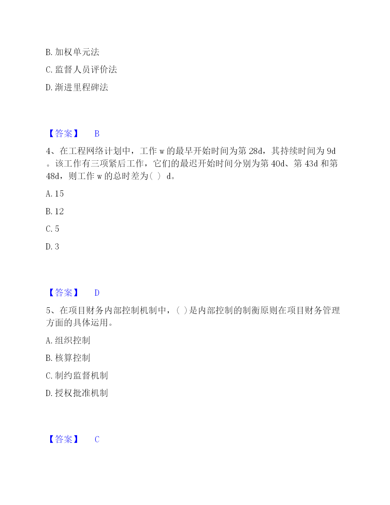 2022-2023年投资项目管理师之投资建设项目实施综合检测试卷A卷含答案单选题(共50题)1、对工程设计中提出采用超出国家现行技术标准的新技术、新工艺、新材料、新设备,()应组织科研试验和鉴定并主持审查其成果,确认设计采用的成果。A.建设项目业主B.施工单位C.设计单位D.监理单位【答案】A2、实行备案制的企业投资建设项目,由()决策。A.安全生产监督管理部门B.企业自主C.建设行政主管部门D.政府备案管理部门【答案】B3、一般有几个重叠的分项工作,每个分项工作有不同的工作计量单位的任务适合用()测量。A.费用比率法B.加权单元法C.监督人员评价法D.渐进里程碑法【答案】B4、在工程网络计划中,工作w的最早开始时间为第28d,其持续时间为9d。该工作有三项紧后工作,它们的最迟开始时间分别为第40d、第43d和第48d,则工作w的总时差为()d。A.15B.12C.5D.3【答案】D5、在项目财务内部控制机制中,()是内部控制的制衡原则在项目财务管理方面的具体运用。A.组织控制B.核算控制C.制约监督机制D.授权批准机制【答案】C6、考核安全控制和管理工作的依据是()。A.安全应急预案B.安全计划C.安全检查记录D.安全检查报告【答案】B7、按国际惯例,工程担保可分为()。A.承包商保证担保和建设单位责任保证担保B.承包商责任保证担保和建设单位保证担保C.承包商保证担保和设计单位责任保证担保D.承包商责任保证担保和设计单位保证担保【答案】A8、工程勘察设计文件中,采用超出国家现行技术标准的,并且可能影响建设工程质量和安全的新技术、新工艺、新设备、新材料的,应由()进行试验、论证,出具检测报告。A.市级人民政府组织的建设工程技术专家委员会B.建设单位选定的检测机构C.国家认可的检测机构D.县级人民政府组织的建设工程技术专家委员会【答案】C9、()是指从项目开工到竣工验收前的阶段性评价,即在实施过程中的某一时点对建设项目实际状况所进行的评价。A.项目中间评价B.项目开工评价C.项目招标评价D.项目投标评价【答案】A10、加强建设项目资本金的筹措和管理是建设项目筹资管理的()。A.基本保障B.首要任务C.前提条件D.核心内容【答案】B11、环境保护的第一责任人是()。A.作业队长B.班组长C.操作工人D.项目经理【答案】D12、改扩建和技术改造建设工程项目,其施工监理费附加调整系数应为()。A.1.0~1.1B.1.1~1.2C.1.1~1.3D.1.2~1.3【答案】B13、下列不属于我国建筑工程预算造价审核方法的是()。A.全面审核法B.重点审核法C.对比审核法D.部分审核法【答案】D14、在需要实施旁站监理的质量控制点进行施工前()h,施工单位应当书面通知项目监理机构。A.12B.24C.36D.48【答案】B15、下列关于建立生产准备机构表述错误的是()。A.项目建设后,组成生产准备筹备组B.建设项目实施阶段的中、后期时段,应适时组建生产运行管理机构C.生产运行管理机构,负责投产准备工作,以及投产后的生产运营管理D.生产准备机构设置和人员配备不容过于复杂【答案】A16、在确定保险方案的过程中不属于应当遵循的基本原则是()。A.有效性原则B.合理性原则C.保密性原则D.经济性原则【答案】C17、在()合同中,招标人易于确定报价合理的中标人,且支付容易方便,但是只能用于工程量计算准确、工期较短的项目,否则投资控制要承担一定量的风险。A.固定单价B.总价C.可调单价D.成本加酬金【答案】B18、措施项目费中的()应当按照国家或省级、行业建设主管部门的规定标准计价。A.临时设施费B.环境保护费C.安全文明施工费D.二次搬运费【答案】C19、对于中度风险而言其控制策略是()。A.当风险降低后才可继续工作B.在规定期限内实施降低风险的措施C.不增加额外控制措施但需进行监视D.采取应急措施,保证大量资源投入【答案】B20、建设项目内部控制的设计者和主导者是指()。A.供应方B.承包方C.建设项目业主D.投资方【答案】C21、试生产考核的目的是()。A.在满负荷运行状况下,考核生产工艺流程、指标参数是否能够保持稳定、连续、长周期运行B.打通生产工艺流程、稳定生产运行状态C.完善自控仪表控制系统D.达到设计生产指标的最终目标【答案】A22、投标保证担保的有效期应超出投标有效期至少()D。A.10B.15