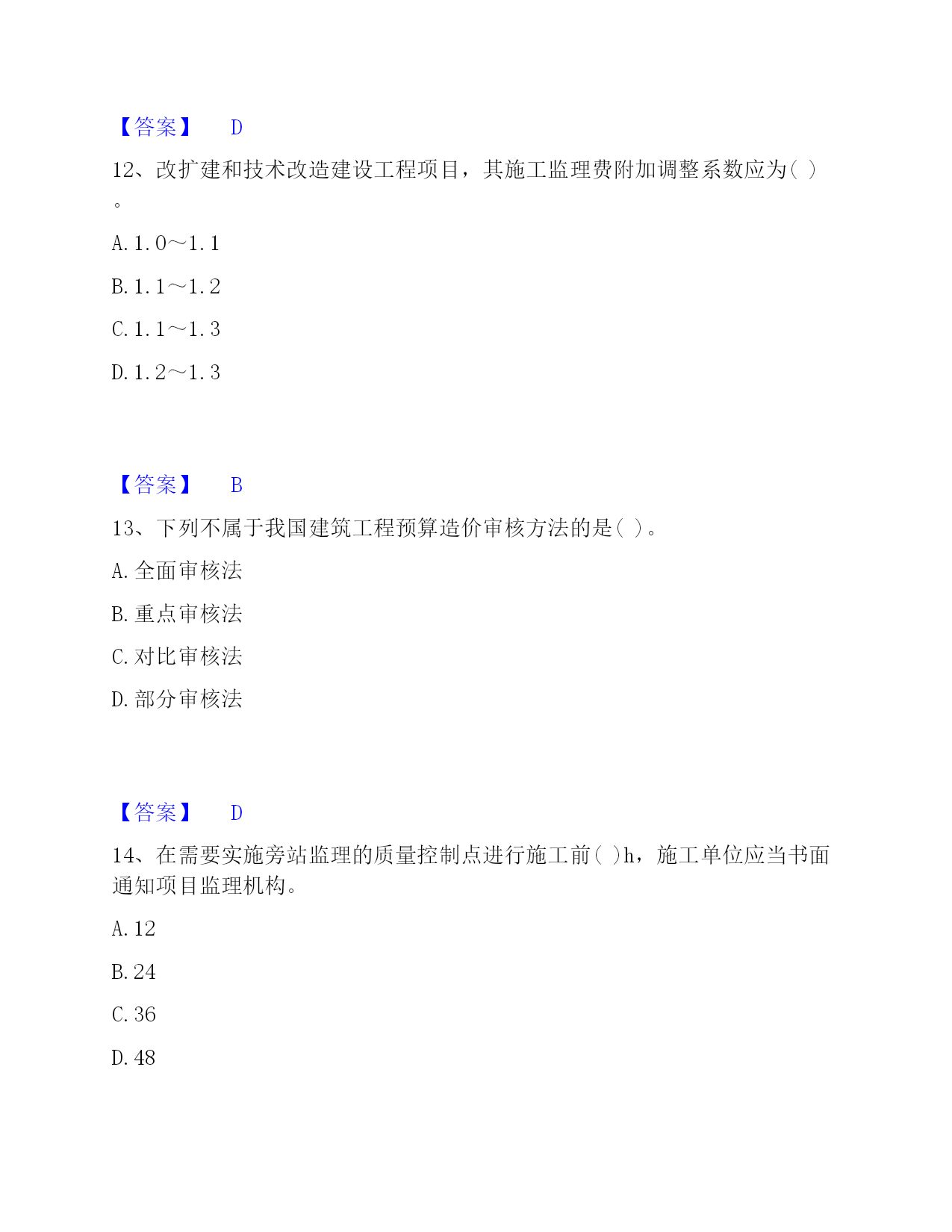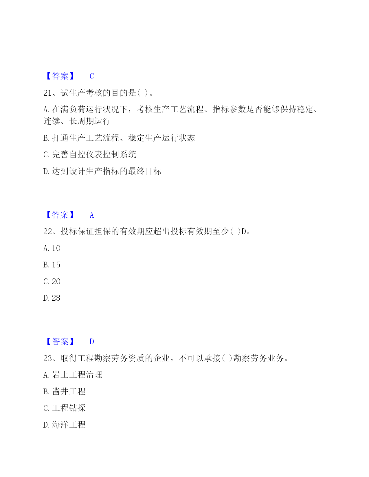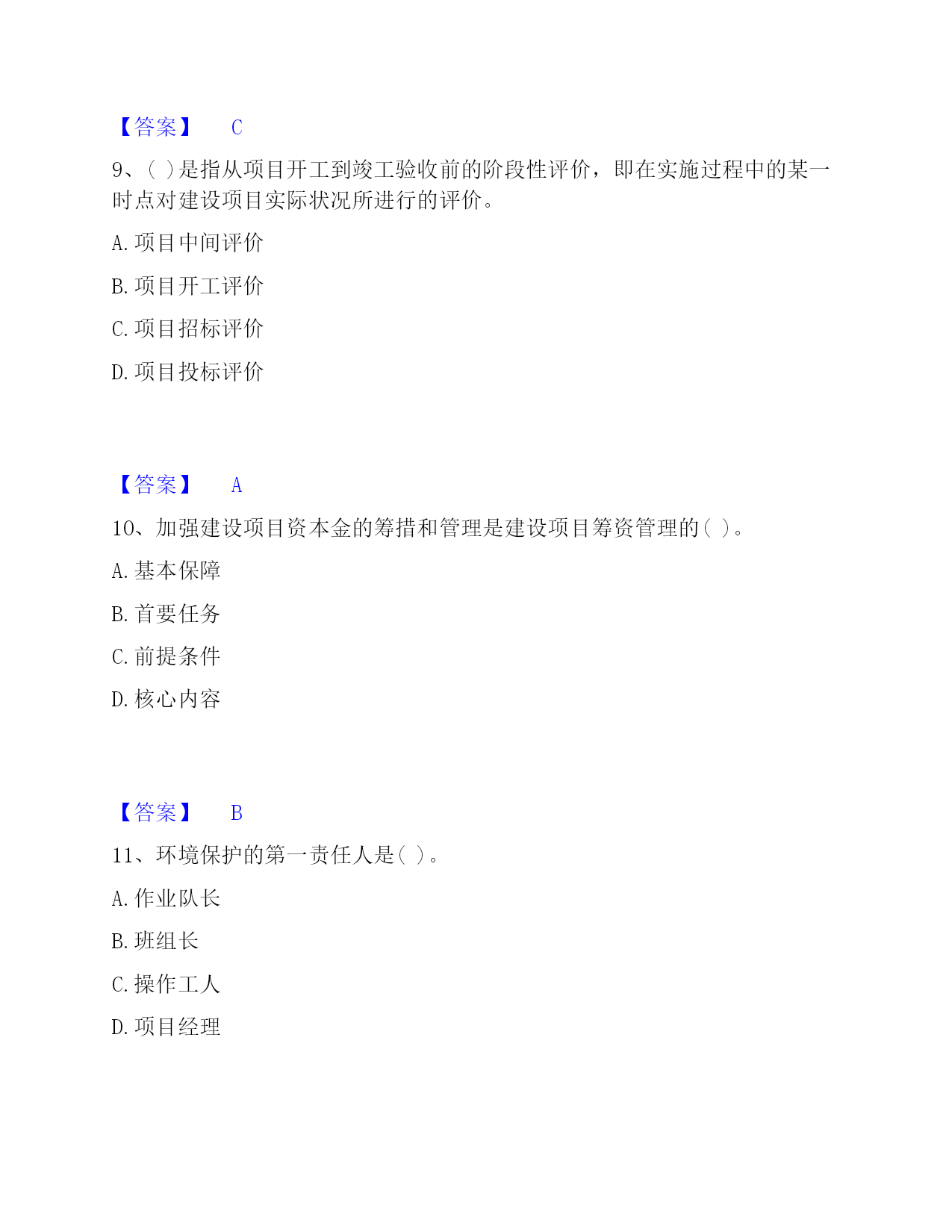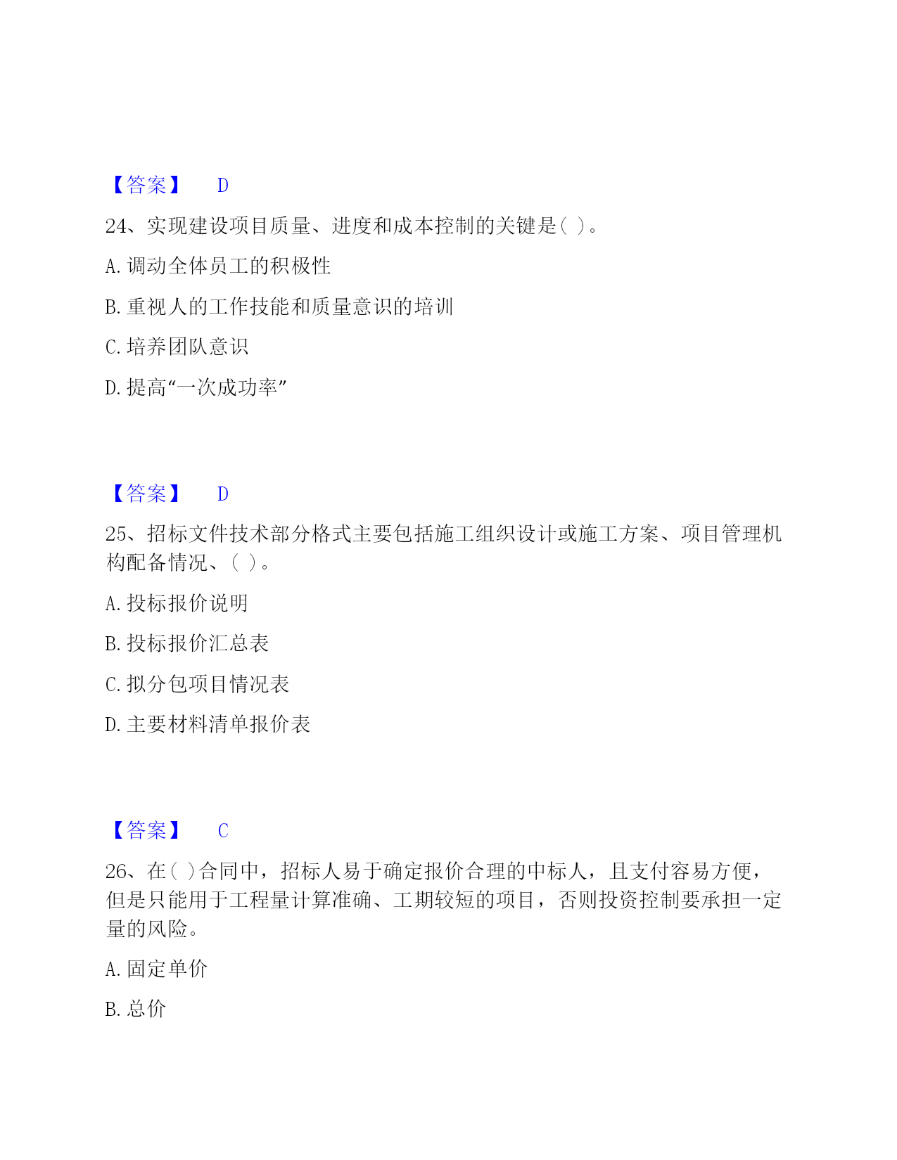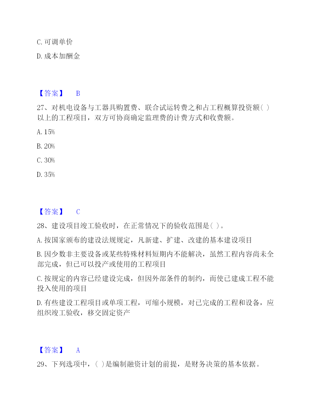 2022-2023年投资项目管理师之投资建设项目实施综合检测试卷A卷含答案单选题(共50题)1、对工程设计中提出采用超出国家现行技术标准的新技术、新工艺、新材料、新设备,()应组织科研试验和鉴定并主持审查其成果,确认设计采用的成果。A.建设项目业主B.施工单位C.设计单位D.监理单位【答案】A2、实行备案制的企业投资建设项目,由()决策。A.安全生产监督管理部门B.企业自主C.建设行政主管部门D.政府备案管理部门【答案】B3、一般有几个重叠的分项工作,每个分项工作有不同的工作计量单位的任务适合用()测量。A.费用比率法B.加权单元法C.监督人员评价法D.渐进里程碑法【答案】B4、在工程网络计划中,工作w的最早开始时间为第28d,其持续时间为9d。该工作有三项紧后工作,它们的最迟开始时间分别为第40d、第43d和第48d,则工作w的总时差为()d。A.15B.12C.5D.3【答案】D5、在项目财务内部控制机制中,()是内部控制的制衡原则在项目财务管理方面的具体运用。A.组织控制B.核算控制C.制约监督机制D.授权批准机制【答案】C6、考核安全控制和管理工作的依据是()。A.安全应急预案B.安全计划C.安全检查记录D.安全检查报告【答案】B7、按国际惯例,工程担保可分为()。A.承包商保证担保和建设单位责任保证担保B.承包商责任保证担保和建设单位保证担保C.承包商保证担保和设计单位责任保证担保D.承包商责任保证担保和设计单位保证担保【答案】A8、工程勘察设计文件中,采用超出国家现行技术标准的,并且可能影响建设工程质量和安全的新技术、新工艺、新设备、新材料的,应由()进行试验、论证,出具检测报告。A.市级人民政府组织的建设工程技术专家委员会B.建设单位选定的检测机构C.国家认可的检测机构D.县级人民政府组织的建设工程技术专家委员会【答案】C9、()是指从项目开工到竣工验收前的阶段性评价,即在实施过程中的某一时点对建设项目实际状况所进行的评价。A.项目中间评价B.项目开工评价C.项目招标评价D.项目投标评价【答案】A10、加强建设项目资本金的筹措和管理是建设项目筹资管理的()。A.基本保障B.首要任务C.前提条件D.核心内容【答案】B11、环境保护的第一责任人是()。A.作业队长B.班组长C.操作工人D.项目经理【答案】D12、改扩建和技术改造建设工程项目,其施工监理费附加调整系数应为()。A.1.0~1.1B.1.1~1.2C.1.1~1.3D.1.2~1.3【答案】B13、下列不属于我国建筑工程预算造价审核方法的是()。A.全面审核法B.重点审核法C.对比审核法D.部分审核法【答案】D14、在需要实施旁站监理的质量控制点进行施工前()h,施工单位应当书面通知项目监理机构。A.12B.24C.36D.48【答案】B15、下列关于建立生产准备机构表述错误的是()。A.项目建设后,组成生产准备筹备组B.建设项目实施阶段的中、后期时段,应适时组建生产运行管理机构C.生产运行管理机构,负责投产准备工作,以及投产后的生产运营管理D.生产准备机构设置和人员配备不容过于复杂【答案】A16、在确定保险方案的过程中不属于应当遵循的基本原则是()。A.有效性原则B.合理性原则C.保密性原则D.经济性原则【答案】C17、在()合同中,招标人易于确定报价合理的中标人,且支付容易方便,但是只能用于工程量计算准确、工期较短的项目,否则投资控制要承担一定量的风险。A.固定单价B.总价C.可调单价D.成本加酬金【答案】B18、措施项目费中的()应当按照国家或省级、行业建设主管部门的规定标准计价。A.临时设施费B.环境保护费C.安全文明施工费D.二次搬运费【答案】C19、对于中度风险而言其控制策略是()。A.当风险降低后才可继续工作B.在规定期限内实施降低风险的措施C.不增加额外控制措施但需进行监视D.采取应急措施,保证大量资源投入【答案】B20、建设项目内部控制的设计者和主导者是指()。A.供应方B.承包方C.建设项目业主D.投资方【答案】C21、试生产考核的目的是()。A.在满负荷运行状况下,考核生产工艺流程、指标参数是否能够保持稳定、连续、长周期运行B.打通生产工艺流程、稳定生产运行状态C.完善自控仪表控制系统D.达到设计生产指标的最终目标【答案】A22、投标保证担保的有效期应超出投标有效期至少()D。A.10B.15
