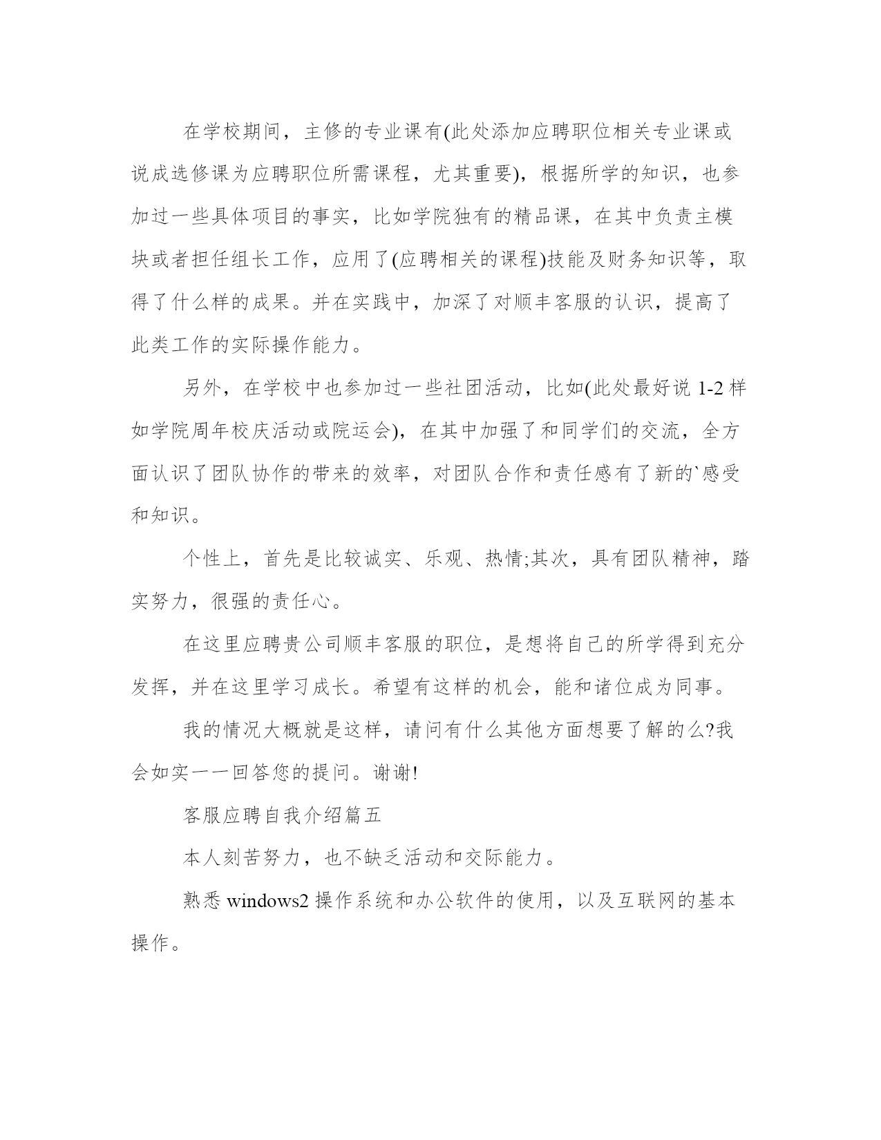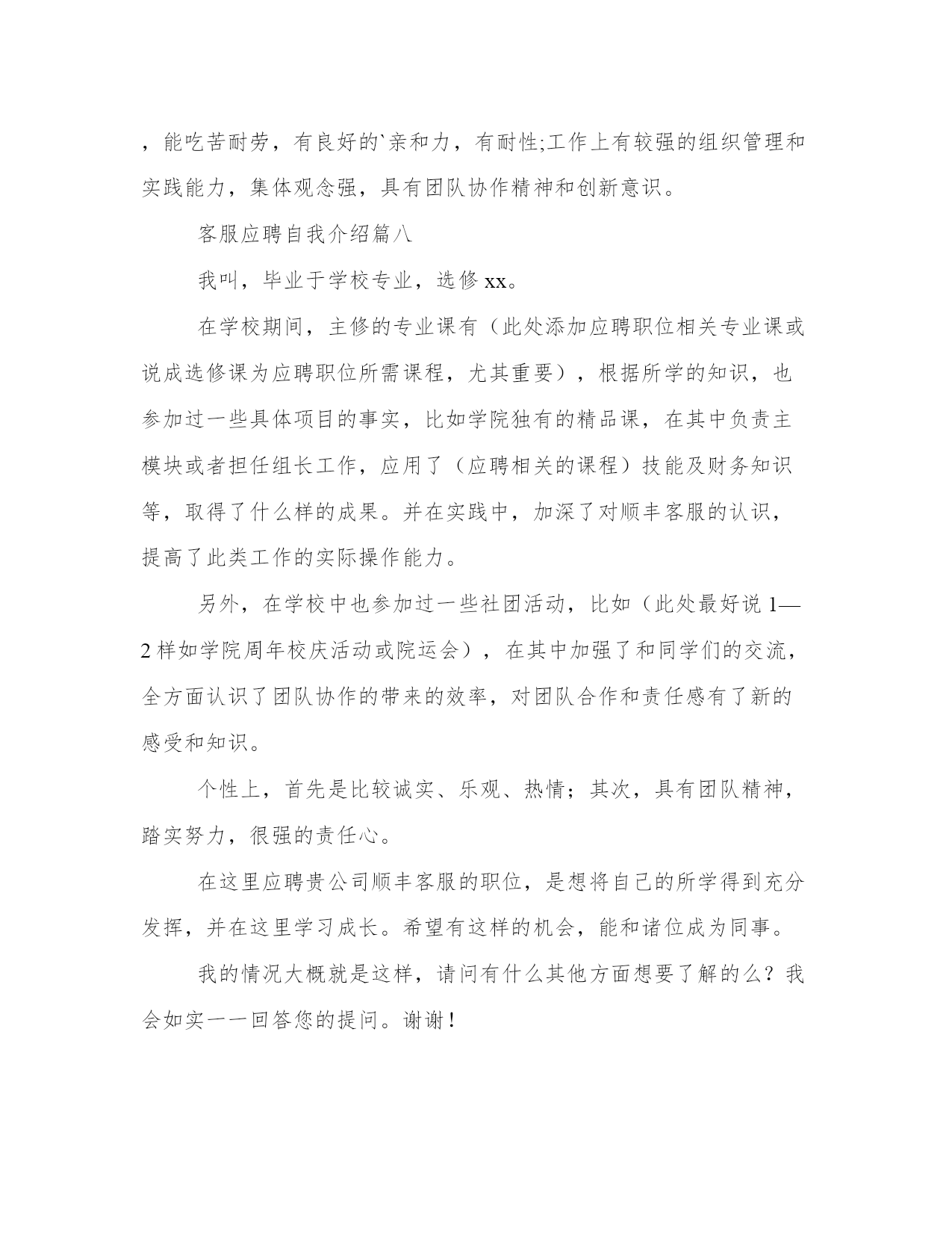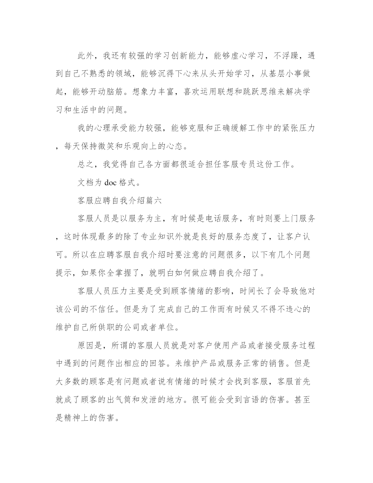 最新客服应聘自我介绍(大全8篇)人的记忆力会随着岁月的流逝而衰退,写作可以弥补记忆的不足,将曾经的人生经历和感悟记录下来,也便于保存一份美好的回忆。范文怎么写才能发挥它最大的作用呢?下面是小编帮大家整理的优质范文,仅供参考,大家一起来看看吧。客服应聘自我介绍篇一您好,我叫xx,市场营销与策划的大专学历、自考北京财贸学院设计专业。在校期间经常参与大型会议会展,并且在第九届中国(北京)国际园林博览会主展馆内担任导览主管一职,会期半年从20xx年5月18日至11月18日。性格上有三大特点:一大特色:善于洞察生活中的细节,对消费者需求尤为敏感!二种态度:实以务事,虚以待人。期望在一个地方长期发展,为公司带来最直接的效益,希望在工作中快乐成长和学习,创造属于自己的一片天。客服应聘自我介绍篇二您好,我来面试客服经理一职,我是个简单的人,简单的生活,简单的工作,平时有空的.时候喜欢游泳,跟朋友在一起,对于生活,我没有任何的不良嗜好,对于工作,勤恳,诚实,踏实稳重,喜欢一步一个脚印的走。热爱客服工作,希望在客服工作中发挥所长,踏踏实实的做好属于自己的一份工作,竭尽全力的在工作中取得好的成绩。客服应聘自我介绍篇三尊敬的领导:大家好!我叫xx,聘客服人员一职,以下就是团体的自我引见。自己最大的特点是亲和力强,容易给人留下良好而深入的第一印象,具有较强的随机应变才能和遇到突发状况处变不惊,坚持清醒头脑和慎重任务态度的才能。独立性强,老实且有责任心。我的座右铭是“吃得苦中苦,方为人上人”。做事仔细细致,有耐烦和毅力的我,可以换位考虑和以大局为重,具有团队的肉体,且顺应环境的才能也很强,具有良好的沟通才能和协调才能,具有良好的效劳认识。此外,我还有较强的学习创新才能,可以谦虚学习,不急躁,遇到本人不熟习的范畴,可以沉得下心来从头开端学习,从基层大事做起,可以开动脑筋。想象力丰厚,喜欢运用联想和腾跃思想来处理学习和生活中的成绩。我的心思接受才能较强,可以克制和正确缓解任务中的紧张压力,每天坚持浅笑和悲观向上的心态。总之,我觉得本人各方面都很合适担任客服这份任务。客服应聘自我介绍篇四我叫xx,毕业于学校专业,选修xxx。在学校期间,主修的专业课有(此处添加应聘职位相关专业课或说成选修课为应聘职位所需课程,尤其重要),根据所学的知识,也参加过一些具体项目的事实,比如学院独有的精品课,在其中负责主模块或者担任组长工作,应用了(应聘相关的课程)技能及财务知识等,取得了什么样的成果。并在实践中,加深了对顺丰客服的认识,提高了此类工作的实际操作能力。另外,在学校中也参加过一些社团活动,比如(此处最好说1-2样如学院周年校庆活动或院运会),在其中加强了和同学们的交流,全方面认识了团队协作的带来的效率,对团队合作和责任感有了新的`感受和知识。个性上,首先是比较诚实、乐观、热情;其次,具有团队精神,踏实努力,很强的责任心。在这里应聘贵公司顺丰客服的职位,是想将自己的所学得到充分发挥,并在这里学习成长。希望有这样的机会,能和诸位成为同事。我的情况大概就是这样,请问有什么其他方面想要了解的么?我会如实一一回答您的提问。谢谢!客服应聘自我介绍篇五本人刻苦努力,也不缺乏活动和交际能力。熟悉windows2操作系统和办公软件的使用,以及互联网的基本操作。20xx年1月在xx有限公司进行了文秘和财会方面的实习。20xx年3月在中国光大银行电子银行部担任客服专员。负责热线客户服务工作(客户建议采纳,投诉处理,以及业务办理等),星级团队成员。期间在卡中心其他部门也工作过(属于公司全能型机动团队成员,主要是给予其他部门提供支持)并持有公司给予的合格证书,其中有资产管理中心m1阶段催收工作。在客户经营中心销售工作,卡中心邮购负责电话订购工作,在信贷部为电核员岗位。希望能在贵单位任职,丰富自己各方面知识。提高能力,实现自己的价值。做一个贵单位不可或缺的人,而不是做贵单位可有可无的人。并恳切的希望能为贵公司贡献出自己的力量。相信您的选择和我的努力会为我们带来双赢的结果!大家好!我叫×××,毕业于××学校××专业,选修***。在学校期间,主修的专业课有×××(此处添加应聘职位相关专业课或说成选修课为应聘职位所需课程,尤其重要),根据所学的知识,也参加过一些具体项目的事实,比如学院独有的精品课×××,在其中负责××主模块或者担任××组长工作,应用了×××(应聘相关的课程)技能及财务知识等,取得了×××什么样的成果。并在实践中,加深了对××的认识,提高了此类工作的实际操作能力。本人最大的特点是亲和力强,容易给人留下良好而深刻的第一印象,具有较强的随机应变能力和遇到突发情况处变不惊,保持清醒头脑和谨慎工作态度的能力,独立性强,诚实且有责任