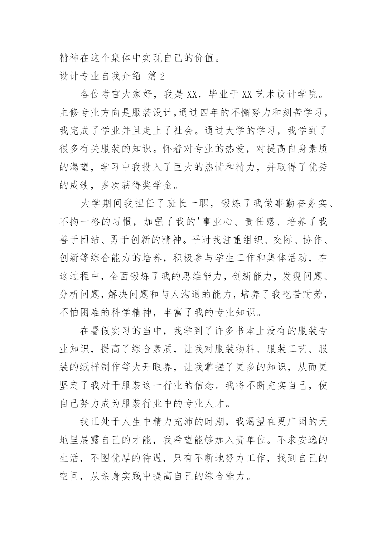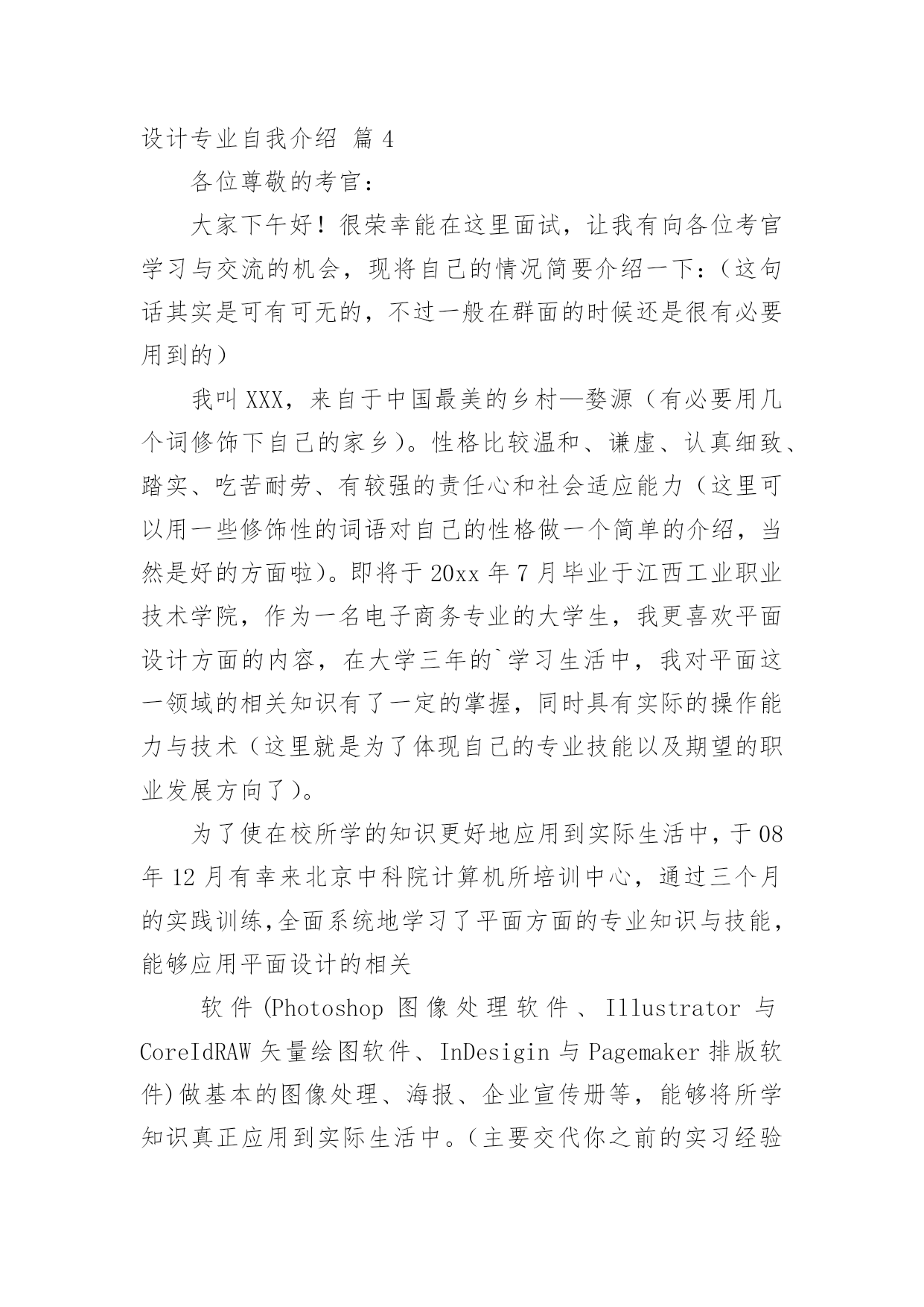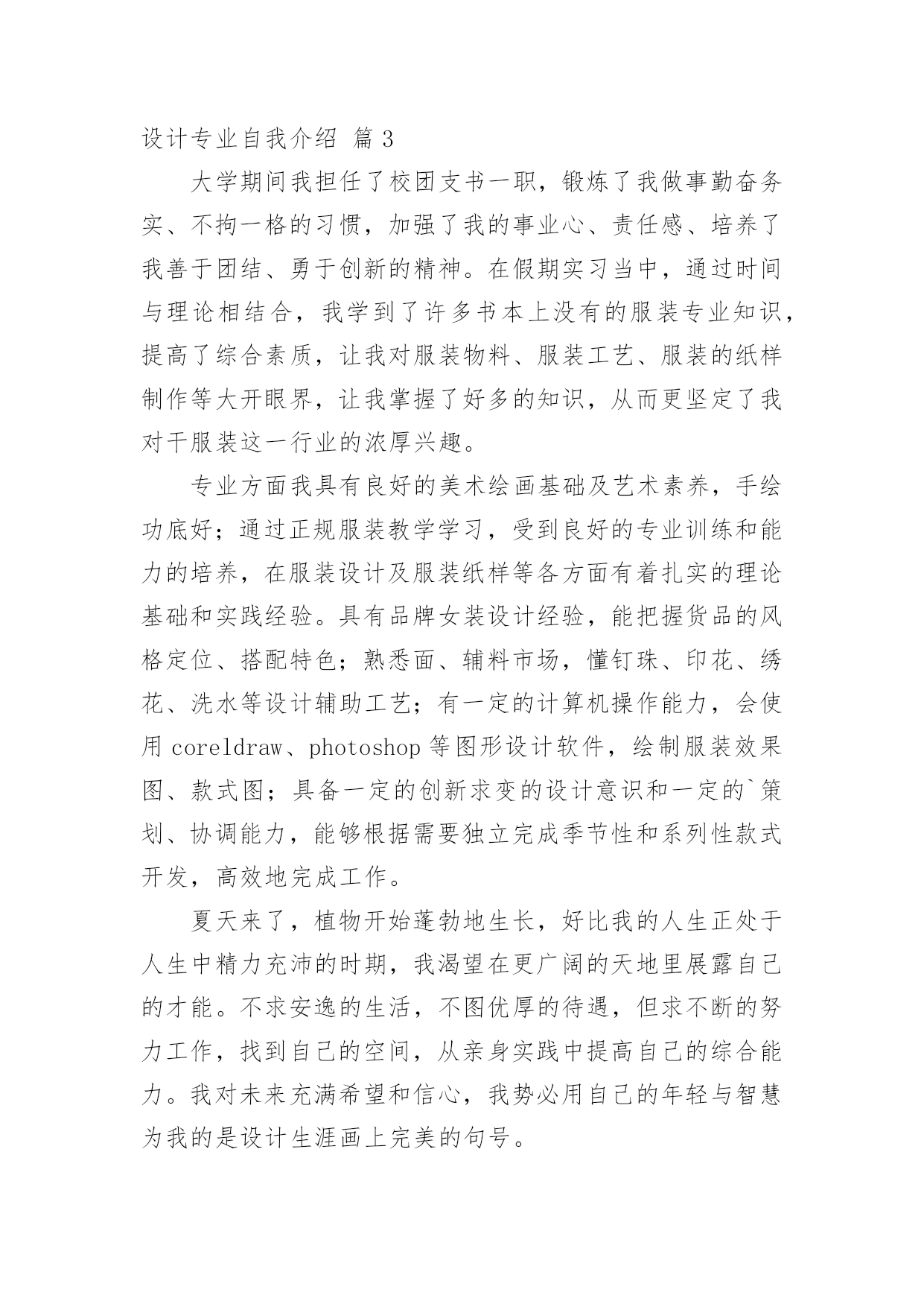 设计专业自我介绍设计专业自我介绍模板锦集四篇当换了一个新环境后,进行自我介绍是必不可少的,自我介绍可以给陌生人留下一个好的印象。写自我介绍时总是没有新意?下面是小编收集整理的设计专业自我介绍7篇,仅供参考,欢迎大家阅读。设计专业自我介绍篇1各位好,我是**,是***大学服装设计与工程专业的毕业生.我性格开朗,善于交流,具有团队协作精神;对新事物新知识有受能力,富于创新精神,乐于接受挑战。在学习上,系统掌握服装设计、服装结构工艺及服装经营管理理论知识和实践能力,谙透服装学科的基本理论和基本知识,受到服装设计方法和成衣结构工艺方面的.基本训练.为了能够使自己步入社会以后,游刃有余,我积极参加学校和班级组织的各种活动,并将同学关系处理融洽。此外在大学期间的学习生活中和一定量的社会经历,使我养成了冷静自信的性格和踏实严谨的工作作风,并赋予我参加社会竞争的勇气。然而,所学知识是有限的,大学培养的仅仅是一种思维方式和学习方法,“纸上谈兵终觉浅,绝知此事要躬行”。因此,我将在今后实践中虚心学习,不断钻研,积累工作经验,提高工作能力。我自信有能力胜任贵公司的工作。若被贵单位录用,我将会在自己的岗位上踏实工作,勤奋学习,并以良好的拼搏精神在这个集体中实现自己的价值。设计专业自我介绍篇2各位考官大家好,我是XX,毕业于XX艺术设计学院。主修专业方向是服装设计,通过四年的不懈努力和刻苦学习,我完成了学业并且走上了社会。通过大学的学习,我学到了很多有关服装的知识。怀着对专业的热爱,对提高自身素质的渴望,学习中我投入了巨大的热情和精力,并取得了优秀的成绩,多次获得奖学金。大学期间我担任了班长一职,锻炼了我做事勤奋务实、不拘一格的习惯,加强了我的'事业心、责任感、培养了我善于团结、勇于创新的精神。平时我注重组织、交际、协作、创新等综合能力的培养,积极参与学生工作和集体活动,在这过程中,全面锻炼了我的思维能力,创新能力,发现问题、分析问题,解决问题和与人沟通的能力,培养了我吃苦耐劳,不怕困难的科学精神,丰富了我的专业知识。在暑假实习的当中,我学到了许多书本上没有的服装专业知识,提高了综合素质,让我对服装物料、服装工艺、服装的纸样制作等大开眼界,让我掌握了更多的知识,从而更坚定了我对干服装这一行业的信念。我将不断充实自己,使自己努力成为服装行业中的专业人才。我正处于人生中精力充沛的时期,我渴望在更广阔的天地里展露自己的才能,我希望能够加入贵单位。不求安逸的生活,不图优厚的待遇,只有不断地努力工作,找到自己的空间,从亲身实践中提高自己的综合能力。设计专业自我介绍篇3大学期间我担任了校团支书一职,锻炼了我做事勤奋务实、不拘一格的习惯,加强了我的事业心、责任感、培养了我善于团结、勇于创新的精神。在假期实习当中,通过时间与理论相结合,我学到了许多书本上没有的服装专业知识,提高了综合素质,让我对服装物料、服装工艺、服装的纸样制作等大开眼界,让我掌握了好多的知识,从而更坚定了我对干服装这一行业的浓厚兴趣。专业方面我具有良好的美术绘画基础及艺术素养,手绘功底好;通过正规服装教学学习,受到良好的专业训练和能力的培养,在服装设计及服装纸样等各方面有着扎实的理论基础和实践经验。具有品牌女装设计经验,能把握货品的风格定位、搭配特色;熟悉面、辅料市场,懂钉珠、印花、绣花、洗水等设计辅助工艺;有一定的计算机操作能力,会使用coreldraw、photoshop等图形设计软件,绘制服装效果图、款式图;具备一定的创新求变的设计意识和一定的`策划、协调能力,能够根据需要独立完成季节性和系列性款式开发,高效地完成工作。夏天来了,植物开始蓬勃地生长,好比我的人生正处于人生中精力充沛的时期,我渴望在更广阔的天地里展露自己的才能。不求安逸的生活,不图优厚的待遇,但求不断的努力工作,找到自己的空间,从亲身实践中提高自己的综合能力。我对未来充满希望和信心,我势必用自己的年轻与智慧为我的是设计生涯画上完美的句号。设计专业自我介绍篇4各位尊敬的考官:大家下午好!很荣幸能在这里面试,让我有向各位考官学习与交流的机会,现将自己的情况简要介绍一下:(这句话其实是可有可无的,不过一般在群面的时候还是很有必要用到的)我叫XXX,来自于中国最美的乡村—婺源(有必要用几个词修饰下自己的家乡)。性格比较温和、谦虚、认真细致、踏实、吃苦耐劳、有较强的责任心和社会适应能力(这里可以用一些修饰性的词语对自己的性格做一个简单的介绍,当然是好的方面啦)。即将于20xx年7月毕业于江西工业职业技术学院,作为一名电子商务专业的大学生,我更喜欢平面设计方面的内容,在大学三年的`学习生活中,我对平面这一领域的相关知识有了一定的掌握,同时具有实际的操作能力与技术(这里就是为了体现自己的专业技能以及期望的职业发展方向了)。为了使在校所学的