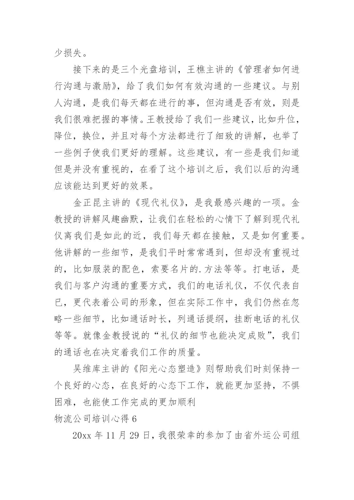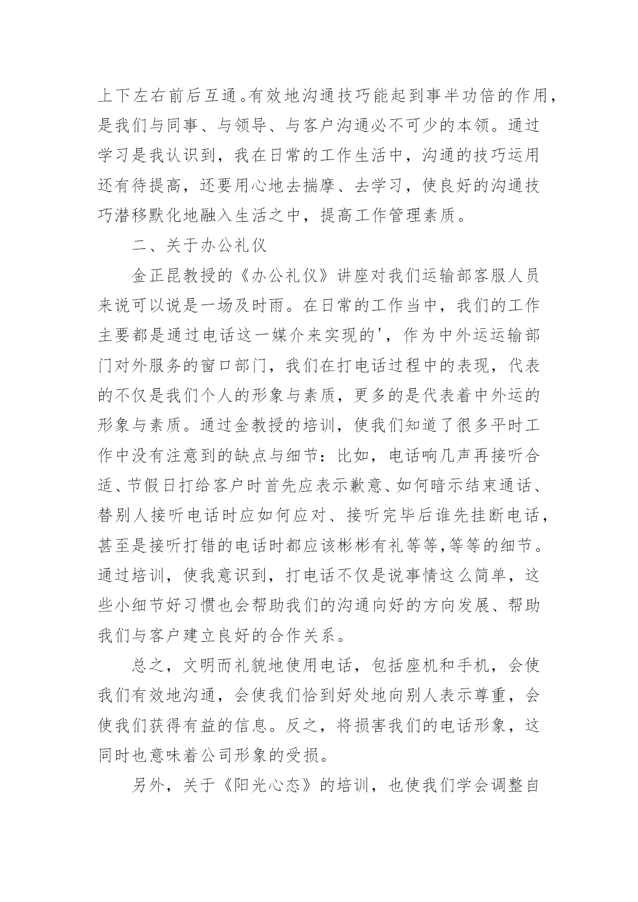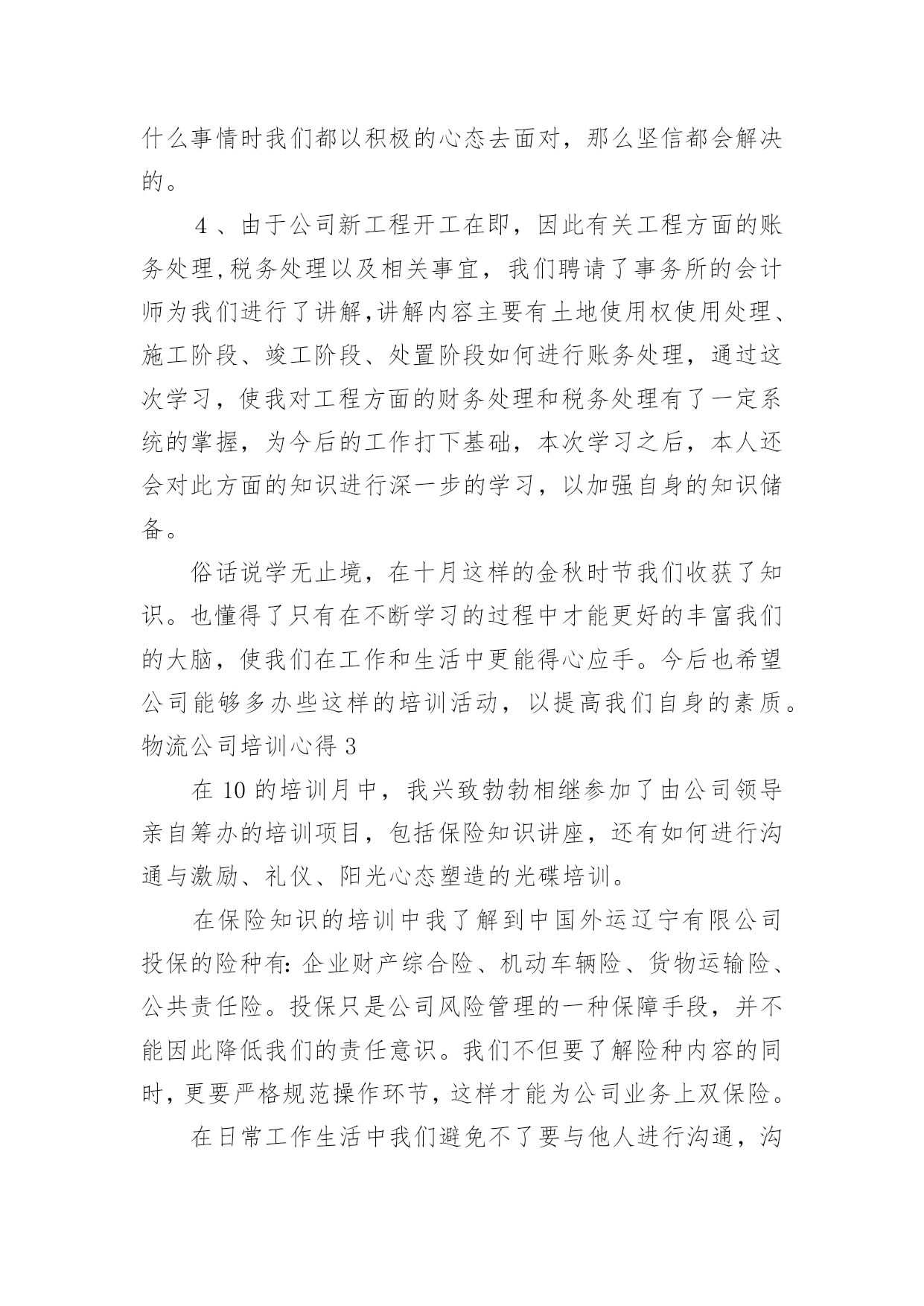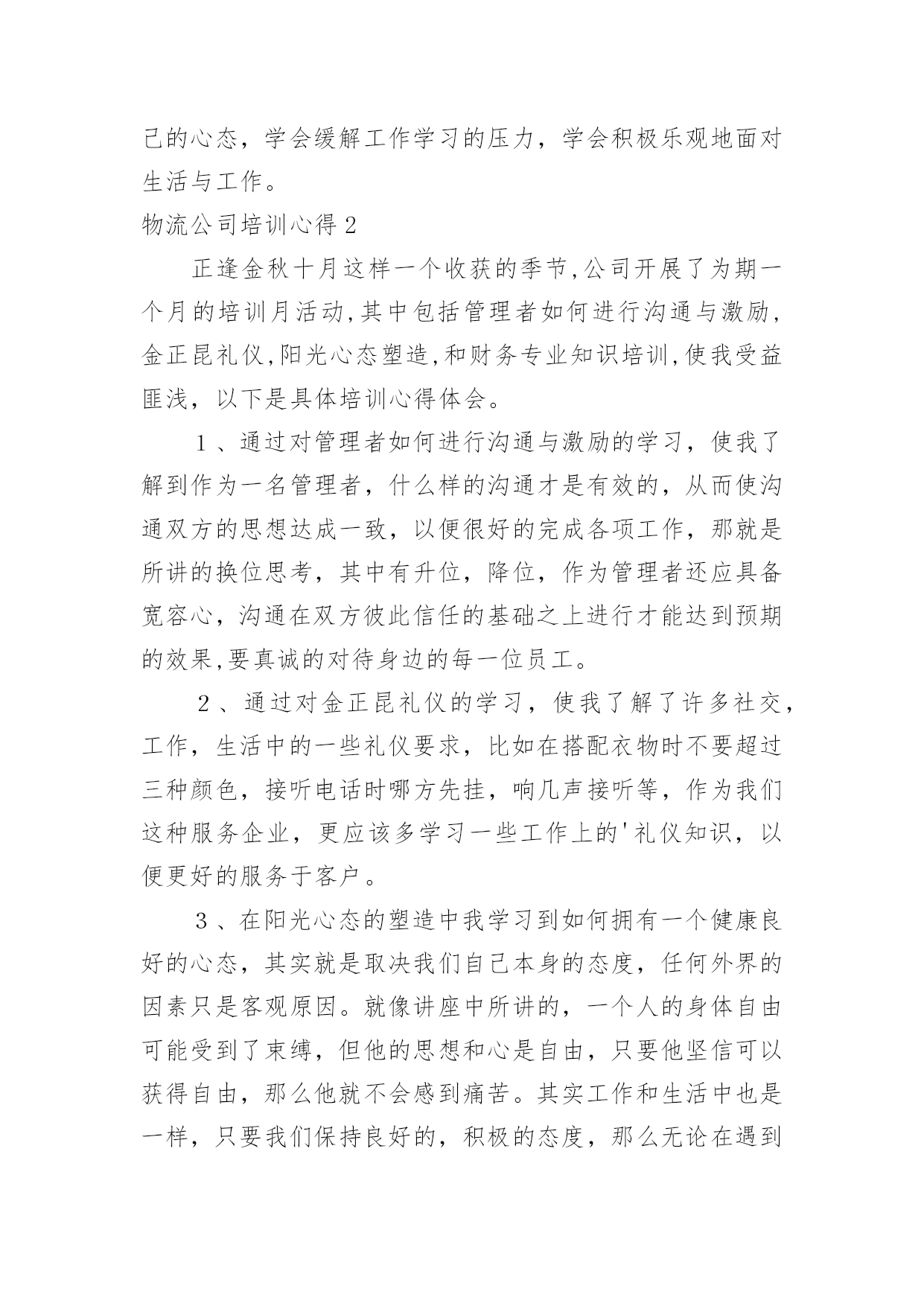 物流公司培训心得物流公司培训心得当我们积累了新的体会时,不如来好好地做个总结,写一篇心得体会,这么做能够提升我们的书面表达能力。那么写心得体会要注意的内容有什么呢?以下是小编整理的物流公司培训心得,希望对大家有所帮助。物流公司培训心得1入职几年以来,参加了各种公司组织的关于业务技能、安全生产、岗位操作等大大小小的培训,这次参加公司“培训月”组织的关于管理、沟通与礼仪等方面的培训,使我受益良多。一、关于管理过程中的沟通与激励王樵教授的《管理者如何进行沟通与激励》讲座中的一句话让我记忆犹新,“优秀的管理者都是沟通、激励高手!”。作为一名公司的中层干部,应该以管理促创新,以创新促效益,从而促使企业稳步健康发展,所以我们不仅要精通业务操作,也要精通管理技巧。但怎样才能将公司的发展理念及管理者的真是意图传递给员工理解并准确执行呢,这就要求我们有娴熟的沟通技巧。通过王樵教授系统地、形象的培训课程,让我知道了沟通过程中的障碍、沟通容易发生的信息不对称性等,并知道了沟通过程中要保持诚信宽容的心态、并培养有效倾听的技能,还要做到因人而异进行沟通、上下左右前后互通。有效地沟通技巧能起到事半功倍的作用,是我们与同事、与领导、与客户沟通必不可少的本领。通过学习是我认识到,我在日常的工作生活中,沟通的技巧运用还有待提高,还要用心地去揣摩、去学习,使良好的沟通技巧潜移默化地融入生活之中,提高工作管理素质。二、关于办公礼仪金正昆教授的《办公礼仪》讲座对我们运输部客服人员来说可以说是一场及时雨。在日常的工作当中,我们的工作主要都是通过电话这一媒介来实现的',作为中外运运输部门对外服务的窗口部门,我们在打电话过程中的表现,代表的不仅是我们个人的形象与素质,更多的是代表着中外运的形象与素质。通过金教授的培训,使我们知道了很多平时工作中没有注意到的缺点与细节:比如,电话响几声再接听合适、节假日打给客户时首先应表示歉意、如何暗示结束通话、替别人接听电话时应如何应对、接听完毕后谁先挂断电话,甚至是接听打错的电话时都应该彬彬有礼等等,等等的细节。通过培训,使我意识到,打电话不仅是说事情这么简单,这些小细节好习惯也会帮助我们的沟通向好的方向发展、帮助我们与客户建立良好的合作关系。总之,文明而礼貌地使用电话,包括座机和手机,会使我们有效地沟通,会使我们恰到好处地向别人表示尊重,会使我们获得有益的信息。反之,将损害我们的电话形象,这同时也意味着公司形象的受损。另外,关于《阳光心态》的培训,也使我们学会调整自己的心态,学会缓解工作学习的压力,学会积极乐观地面对生活与工作。物流公司培训心得2正逢金秋十月这样一个收获的季节,公司开展了为期一个月的培训月活动,其中包括管理者如何进行沟通与激励,金正昆礼仪,阳光心态塑造,和财务专业知识培训,使我受益匪浅,以下是具体培训心得体会。1、通过对管理者如何进行沟通与激励的学习,使我了解到作为一名管理者,什么样的沟通才是有效的,从而使沟通双方的思想达成一致,以便很好的完成各项工作,那就是所讲的换位思考,其中有升位,降位,作为管理者还应具备宽容心,沟通在双方彼此信任的基础之上进行才能达到预期的效果,要真诚的对待身边的每一位员工。2、通过对金正昆礼仪的学习,使我了解了许多社交,工作,生活中的一些礼仪要求,比如在搭配衣物时不要超过三种颜色,接听电话时哪方先挂,响几声接听等,作为我们这种服务企业,更应该多学习一些工作上的'礼仪知识,以便更好的服务于客户。3、在阳光心态的塑造中我学习到如何拥有一个健康良好的心态,其实就是取决我们自己本身的态度,任何外界的因素只是客观原因。就像讲座中所讲的,一个人的身体自由可能受到了束缚,但他的思想和心是自由,只要他坚信可以获得自由,那么他就不会感到痛苦。其实工作和生活中也是一样,只要我们保持良好的,积极的态度,那么无论在遇到什么事情时我们都以积极的心态去面对,那么坚信都会解决的。4、由于公司新工程开工在即,因此有关工程方面的账务处理,税务处理以及相关事宜,我们聘请了事务所的会计师为我们进行了讲解,讲解内容主要有土地使用权使用处理、施工阶段、竣工阶段、处置阶段如何进行账务处理,通过这次学习,使我对工程方面的财务处理和税务处理有了一定系统的掌握,为今后的工作打下基础,本次学习之后,本人还会对此方面的知识进行深一步的学习,以加强自身的知识储备。俗话说学无止境,在十月这样的金秋时节我们收获了知识。也懂得了只有在不断学习的过程中才能更好的丰富我们的大脑,使我们在工作和生活中更能得心应手。今后也希望公司能够多办些这样的培训活动,以提高我们自身的素质。物流公司培训心得3在10的培训月中,我兴致勃勃相继参加了由公司领导亲自筹办的培训项目,包括保险知识讲座,还有如何进行沟通与激励、礼仪、阳光心态塑造的光碟培训。在保险知识的培训中我了解到