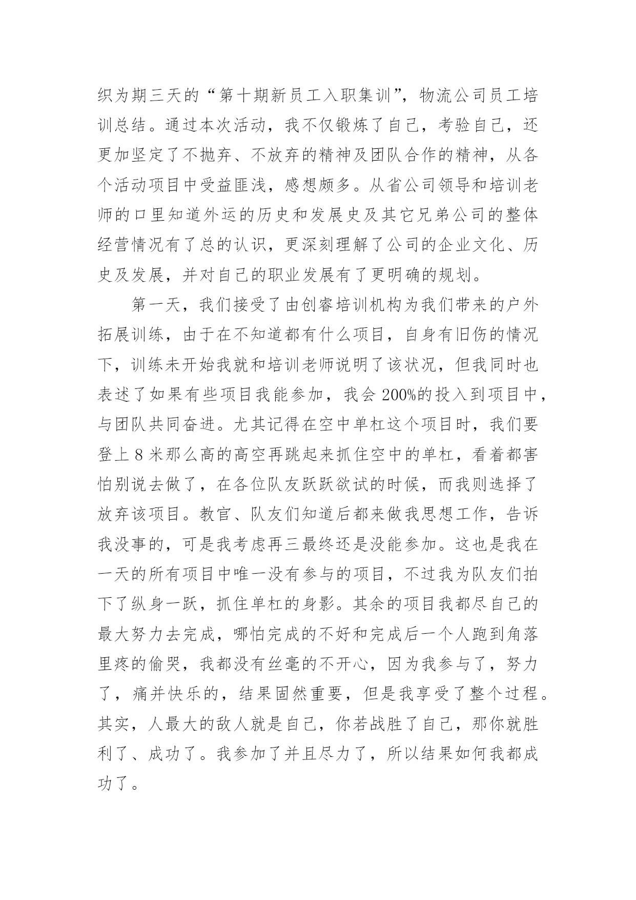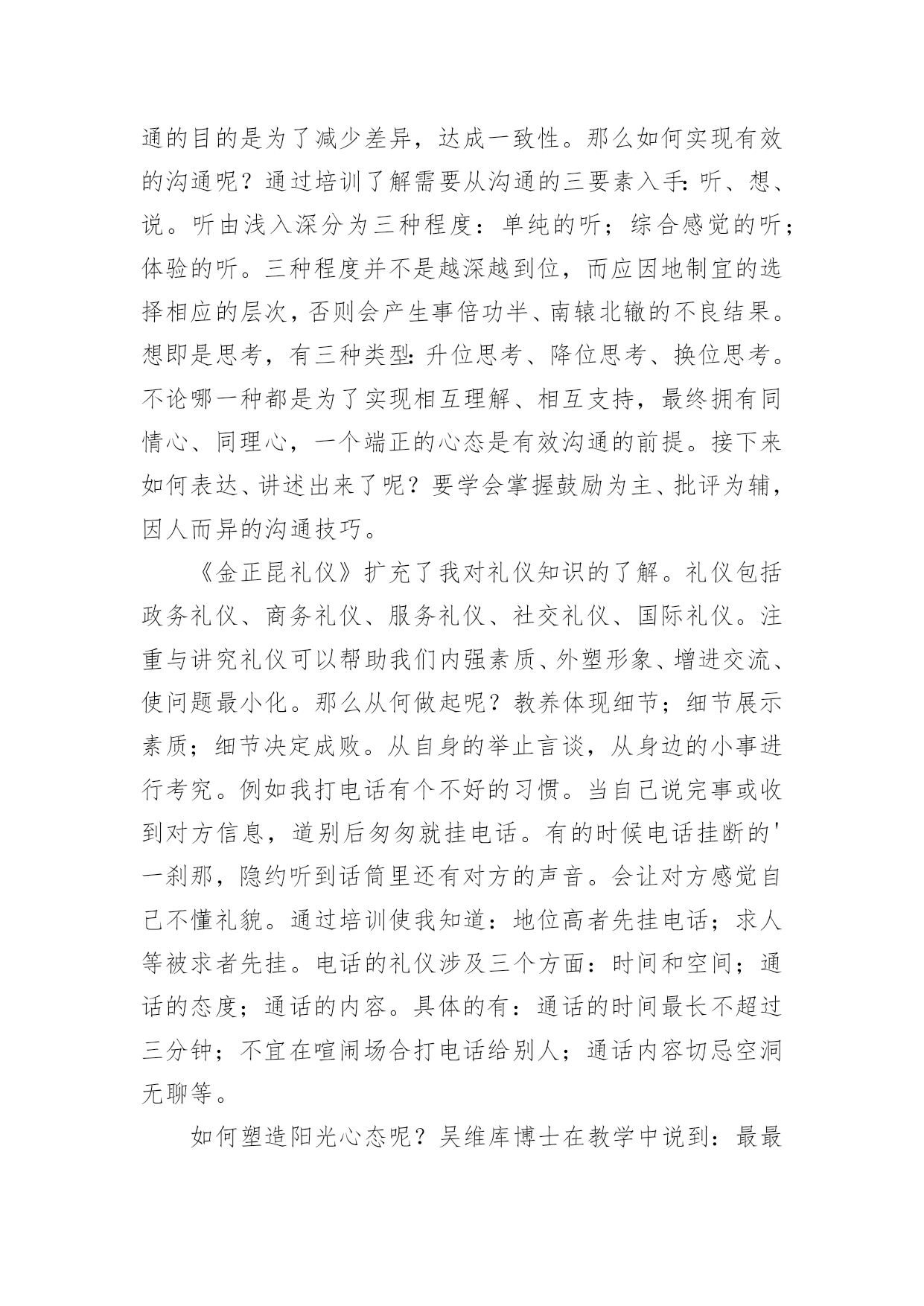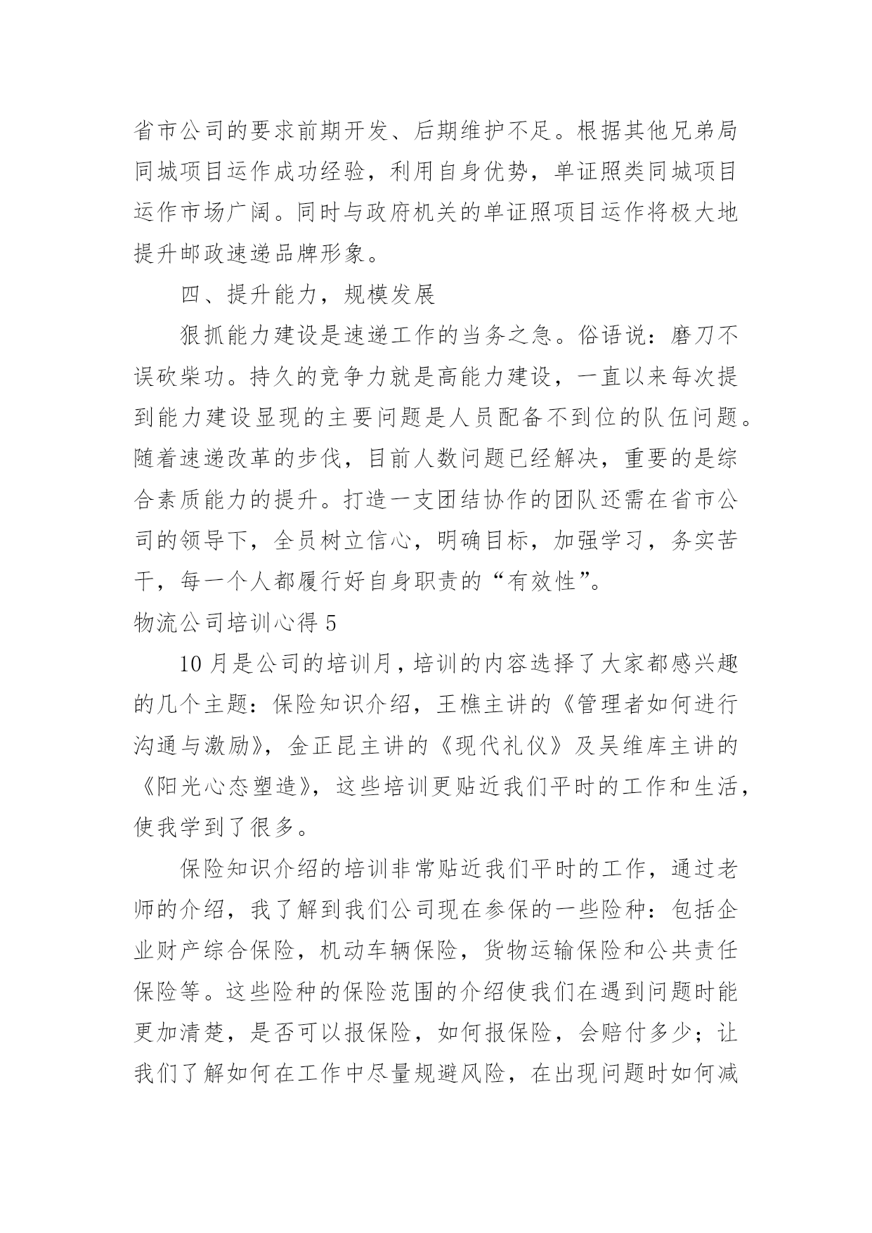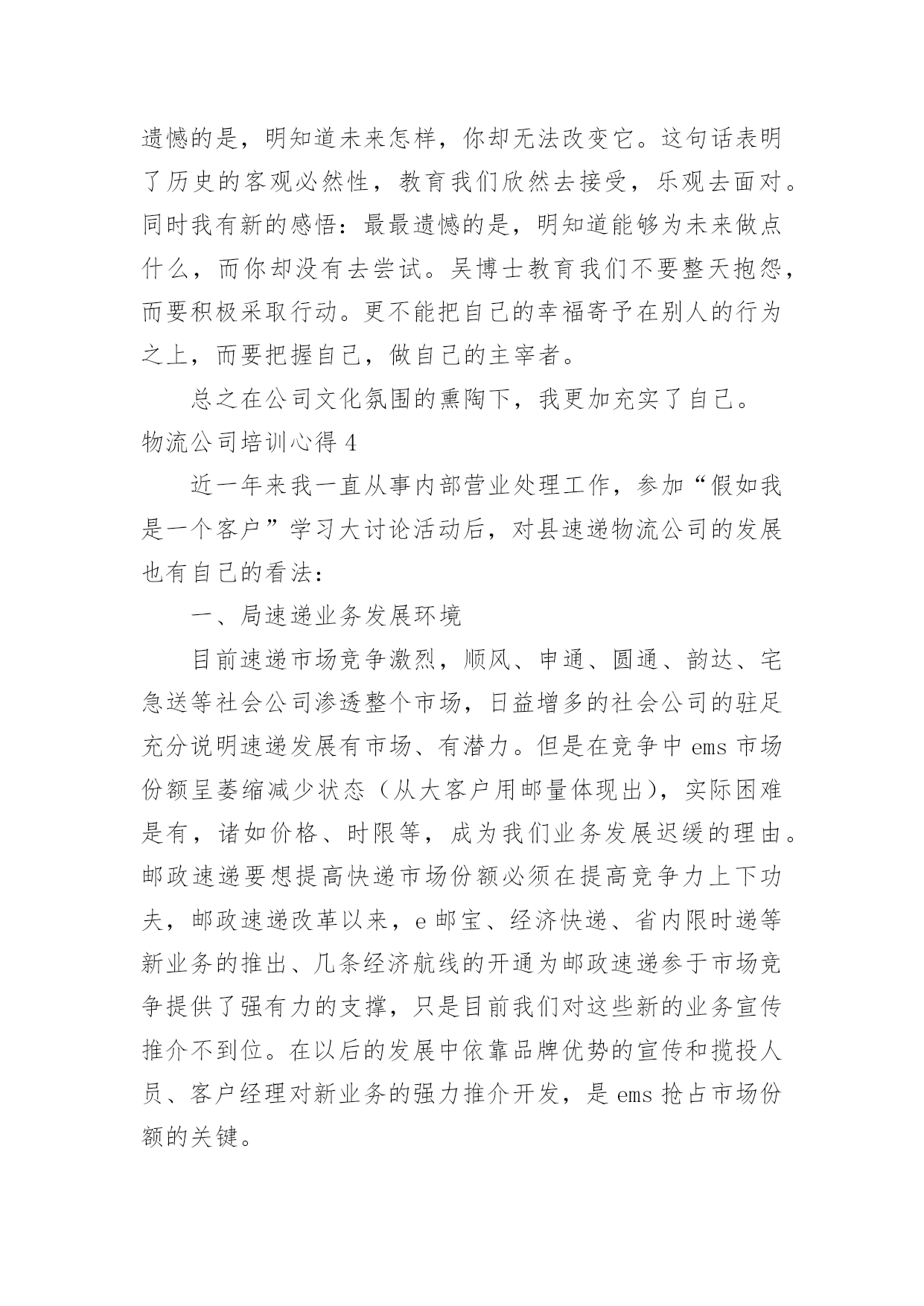 物流公司培训心得物流公司培训心得当我们积累了新的体会时,不如来好好地做个总结,写一篇心得体会,这么做能够提升我们的书面表达能力。那么写心得体会要注意的内容有什么呢?以下是小编整理的物流公司培训心得,希望对大家有所帮助。物流公司培训心得1入职几年以来,参加了各种公司组织的关于业务技能、安全生产、岗位操作等大大小小的培训,这次参加公司“培训月”组织的关于管理、沟通与礼仪等方面的培训,使我受益良多。一、关于管理过程中的沟通与激励王樵教授的《管理者如何进行沟通与激励》讲座中的一句话让我记忆犹新,“优秀的管理者都是沟通、激励高手!”。作为一名公司的中层干部,应该以管理促创新,以创新促效益,从而促使企业稳步健康发展,所以我们不仅要精通业务操作,也要精通管理技巧。但怎样才能将公司的发展理念及管理者的真是意图传递给员工理解并准确执行呢,这就要求我们有娴熟的沟通技巧。通过王樵教授系统地、形象的培训课程,让我知道了沟通过程中的障碍、沟通容易发生的信息不对称性等,并知道了沟通过程中要保持诚信宽容的心态、并培养有效倾听的技能,还要做到因人而异进行沟通、上下左右前后互通。有效地沟通技巧能起到事半功倍的作用,是我们与同事、与领导、与客户沟通必不可少的本领。通过学习是我认识到,我在日常的工作生活中,沟通的技巧运用还有待提高,还要用心地去揣摩、去学习,使良好的沟通技巧潜移默化地融入生活之中,提高工作管理素质。二、关于办公礼仪金正昆教授的《办公礼仪》讲座对我们运输部客服人员来说可以说是一场及时雨。在日常的工作当中,我们的工作主要都是通过电话这一媒介来实现的',作为中外运运输部门对外服务的窗口部门,我们在打电话过程中的表现,代表的不仅是我们个人的形象与素质,更多的是代表着中外运的形象与素质。通过金教授的培训,使我们知道了很多平时工作中没有注意到的缺点与细节:比如,电话响几声再接听合适、节假日打给客户时首先应表示歉意、如何暗示结束通话、替别人接听电话时应如何应对、接听完毕后谁先挂断电话,甚至是接听打错的电话时都应该彬彬有礼等等,等等的细节。通过培训,使我意识到,打电话不仅是说事情这么简单,这些小细节好习惯也会帮助我们的沟通向好的方向发展、帮助我们与客户建立良好的合作关系。总之,文明而礼貌地使用电话,包括座机和手机,会使我们有效地沟通,会使我们恰到好处地向别人表示尊重,会使我们获得有益的信息。反之,将损害我们的电话形象,这同时也意味着公司形象的受损。另外,关于《阳光心态》的培训,也使我们学会调整自己的心态,学会缓解工作学习的压力,学会积极乐观地面对生活与工作。物流公司培训心得2正逢金秋十月这样一个收获的季节,公司开展了为期一个月的培训月活动,其中包括管理者如何进行沟通与激励,金正昆礼仪,阳光心态塑造,和财务专业知识培训,使我受益匪浅,以下是具体培训心得体会。1、通过对管理者如何进行沟通与激励的学习,使我了解到作为一名管理者,什么样的沟通才是有效的,从而使沟通双方的思想达成一致,以便很好的完成各项工作,那就是所讲的换位思考,其中有升位,降位,作为管理者还应具备宽容心,沟通在双方彼此信任的基础之上进行才能达到预期的效果,要真诚的对待身边的每一位员工。2、通过对金正昆礼仪的学习,使我了解了许多社交,工作,生活中的一些礼仪要求,比如在搭配衣物时不要超过三种颜色,接听电话时哪方先挂,响几声接听等,作为我们这种服务企业,更应该多学习一些工作上的'礼仪知识,以便更好的服务于客户。3、在阳光心态的塑造中我学习到如何拥有一个健康良好的心态,其实就是取决我们自己本身的态度,任何外界的因素只是客观原因。就像讲座中所讲的,一个人的身体自由可能受到了束缚,但他的思想和心是自由,只要他坚信可以获得自由,那么他就不会感到痛苦。其实工作和生活中也是一样,只要我们保持良好的,积极的态度,那么无论在遇到什么事情时我们都以积极的心态去面对,那么坚信都会解决的。4、由于公司新工程开工在即,因此有关工程方面的账务处理,税务处理以及相关事宜,我们聘请了事务所的会计师为我们进行了讲解,讲解内容主要有土地使用权使用处理、施工阶段、竣工阶段、处置阶段如何进行账务处理,通过这次学习,使我对工程方面的财务处理和税务处理有了一定系统的掌握,为今后的工作打下基础,本次学习之后,本人还会对此方面的知识进行深一步的学习,以加强自身的知识储备。俗话说学无止境,在十月这样的金秋时节我们收获了知识。也懂得了只有在不断学习的过程中才能更好的丰富我们的大脑,使我们在工作和生活中更能得心应手。今后也希望公司能够多办些这样的培训活动,以提高我们自身的素质。物流公司培训心得3在10的培训月中,我兴致勃勃相继参加了由公司领导亲自筹办的培训项目,包括保险知识讲座,还有如何进行沟通与激励、礼仪、阳光心态塑造的光碟培训。在保险知识的培训中我了解到