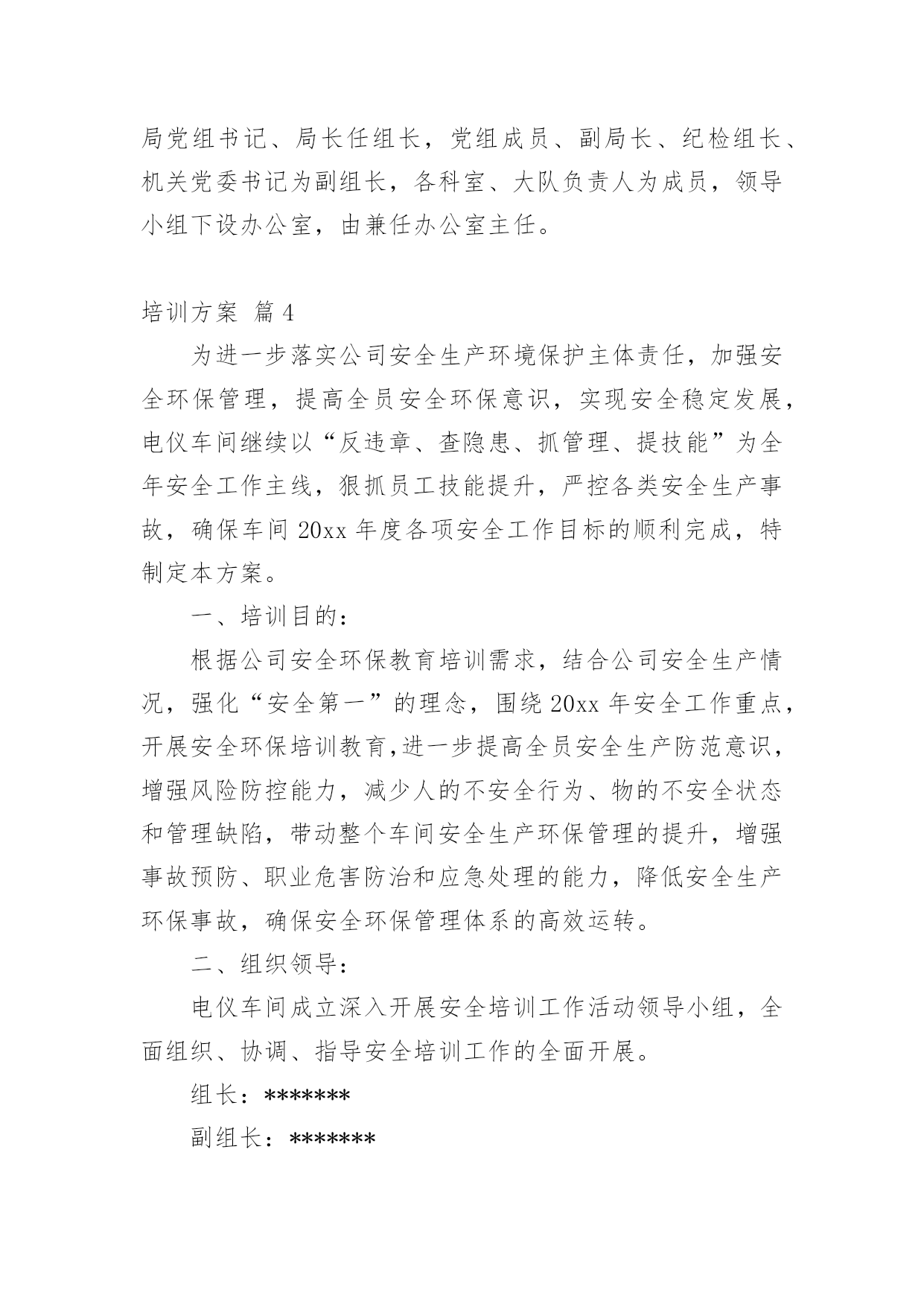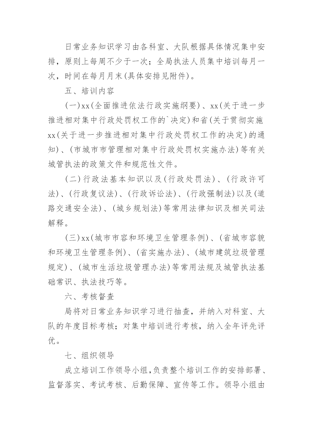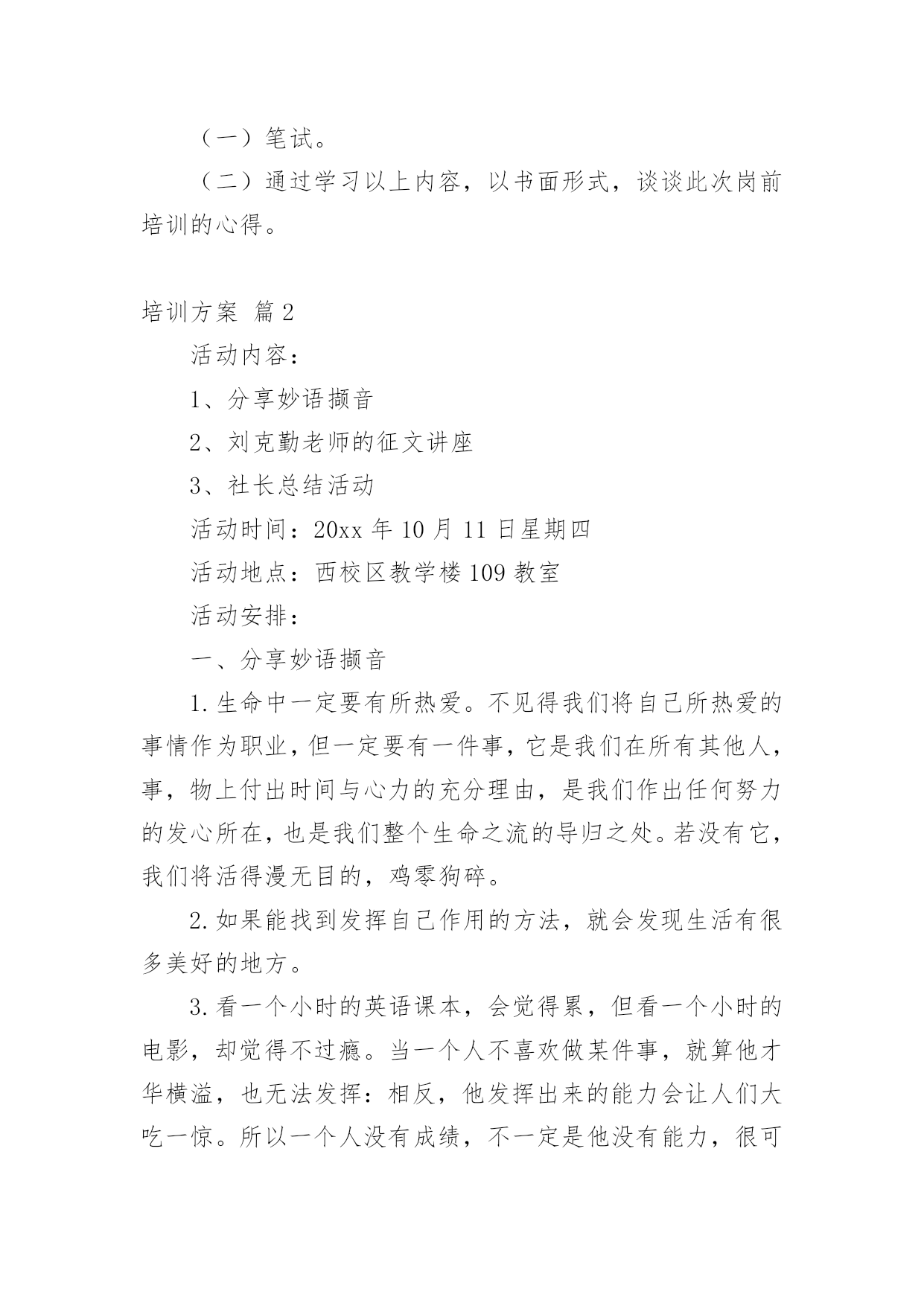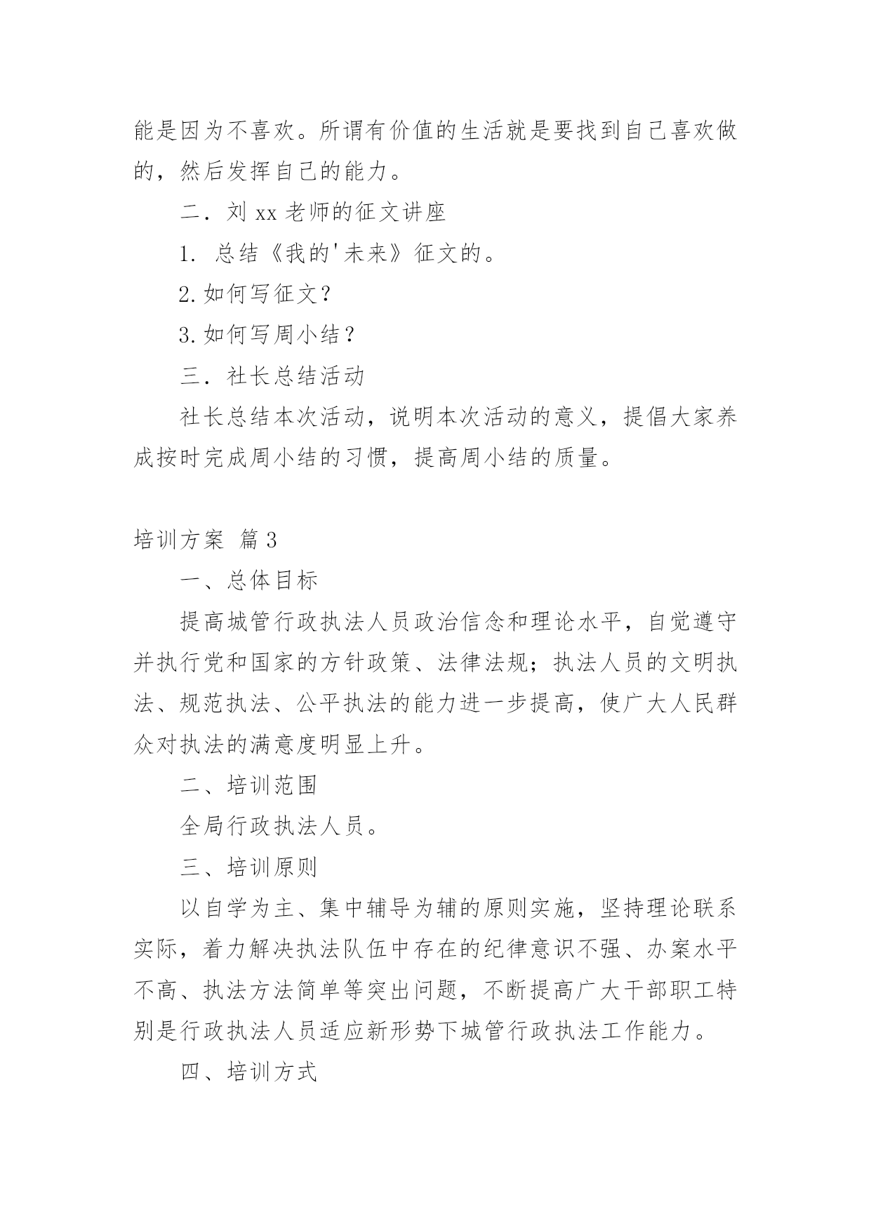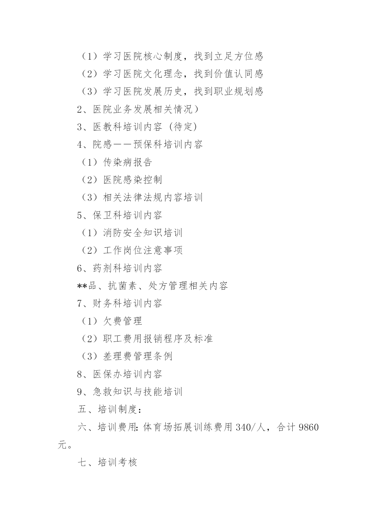 培训方案培训方案10篇【推荐】为了确保事情或工作能无误进行,就常常需要事先准备方案,方案是阐明行动的时间,地点,目的,预期效果,预算及方法等的书面计划。方案应该怎么制定呢?下面是小编为大家整理的培训方案10篇,供大家参考借鉴,希望可以帮助到有需要的朋友。培训方案篇1根据卫生专业技术人员继续教育规定和工作需要,为使20xx新进人员充分了解医院的文化发展建设过程及办院理念,熟悉工作岗位特点和要求,了解医疗行业相关法律法规,增强团队意识以及集体荣誉感和自豪感。特制定此新进工作人员培训方案,具体内容如下:一、培训目的:通过有效的培训,提高员工的自身素质和业务水平,尽快适应我院的.工作环境,有效的发挥自己的才能。二、培训时间:7月22日―7月30日三、培训地点:体育城、医院会议室四、培训内容:(一)阳光城拓展训练(二)院内培训1、正视现实审视自己作好人生职业规划(1)学习医院核心制度,找到立足方位感(2)学习医院文化理念,找到价值认同感(3)学习医院发展历史,找到职业规划感2、医院业务发展相关情况)3、医教科培训内容(待定)4、院感――预保科培训内容(1)传染病报告(2)医院感染控制(3)相关法律法规内容培训5、保卫科培训内容(1)消防安全知识培训(2)工作岗位注意事项6、药剂科培训内容**品、抗菌素、处方管理相关内容7、财务科培训内容(1)欠费管理(2)职工费用报销程序及标准(3)差理费管理条例8、医保办培训内容9、急救知识与技能培训五、培训制度:六、培训费用:体育场拓展训练费用340/人,合计9860元。七、培训考核(一)笔试。(二)通过学习以上内容,以书面形式,谈谈此次岗前培训的心得。培训方案篇2活动内容:1、分享妙语撷音2、刘克勤老师的征文讲座3、社长总结活动活动时间:20xx年10月11日星期四活动地点:西校区教学楼109教室活动安排:一、分享妙语撷音1.生命中一定要有所热爱。不见得我们将自己所热爱的事情作为职业,但一定要有一件事,它是我们在所有其他人,事,物上付出时间与心力的充分理由,是我们作出任何努力的发心所在,也是我们整个生命之流的导归之处。若没有它,我们将活得漫无目的,鸡零狗碎。2.如果能找到发挥自己作用的方法,就会发现生活有很多美好的地方。3.看一个小时的英语课本,会觉得累,但看一个小时的电影,却觉得不过瘾。当一个人不喜欢做某件事,就算他才华横溢,也无法发挥:相反,他发挥出来的能力会让人们大吃一惊。所以一个人没有成绩,不一定是他没有能力,很可能是因为不喜欢。所谓有价值的生活就是要找到自己喜欢做的,然后发挥自己的能力。二.刘xx老师的征文讲座1.总结《我的'未来》征文的。2.如何写征文?3.如何写周小结?三.社长总结活动社长总结本次活动,说明本次活动的意义,提倡大家养成按时完成周小结的习惯,提高周小结的质量。培训方案篇3一、总体目标提高城管行政执法人员政治信念和理论水平,自觉遵守并执行党和国家的方针政策、法律法规;执法人员的文明执法、规范执法、公平执法的能力进一步提高,使广大人民群众对执法的满意度明显上升。二、培训范围全局行政执法人员。三、培训原则以自学为主、集中辅导为辅的原则实施,坚持理论联系实际,着力解决执法队伍中存在的纪律意识不强、办案水平不高、执法方法简单等突出问题,不断提高广大干部职工特别是行政执法人员适应新形势下城管行政执法工作能力。四、培训方式日常业务知识学习由各科室、大队根据具体情况集中安排,原则上每周不少于一次;全局执法人员集中培训每月一次,时间在每月月末(具体安排见附件)。五、培训内容(一)xx(全面推进依法行政实施纲要)、xx(关于进一步推进相对集中行政处罚权工作的`决定)和省(关于贯彻实施xx(关于进一步推进相对集中行政处罚权工作的决定)的通知)、(市城市市管理相对集中行政处罚权实施办法)等有关城管执法的政策文件和规范性文件。(二)行政法基本知识以及(行政处罚法)、(行政许可法)、(行政复议法)、(行政诉讼法)、(行政强制法)以及(道路交通安全法)、(城乡规划法)等常用法律知识及相关司法解释。(三)xx(城市市容和环境卫生管理条例)、(省城市容貌和环境卫生管理条例)、(省实施办法)、(城市建筑垃圾管理规定)、(城市生活垃圾管理办法)等常用法规及城管执法基础常识、执法技巧等。六、考核督查局将对日常业务知识学习进行抽查,并纳入对科室、大队的年度目标考核;对集中培训进行考核,纳入全年评先评优。七、组织领导成立培训工作领导小组,负责整个培训工作的安排部署、监督落实、考试考核、后勤保障、宣传等工作。领导小组由局党组书记、局长任组长,党组成员、副局长、纪检组长、机关党委书记为副组长,各科室、大队负责人为成员,领导小组下设办公室,由兼任办公室主任。培训方案篇4为进一步落实公司安全生产环境保护主体责任,加强