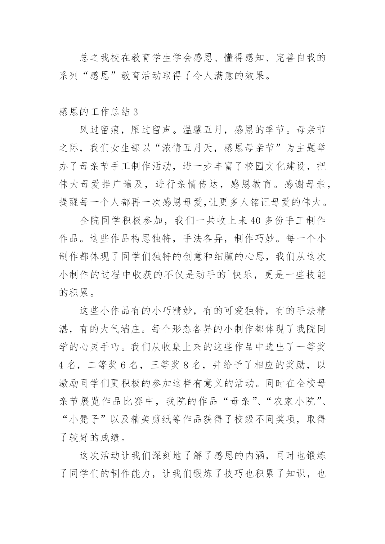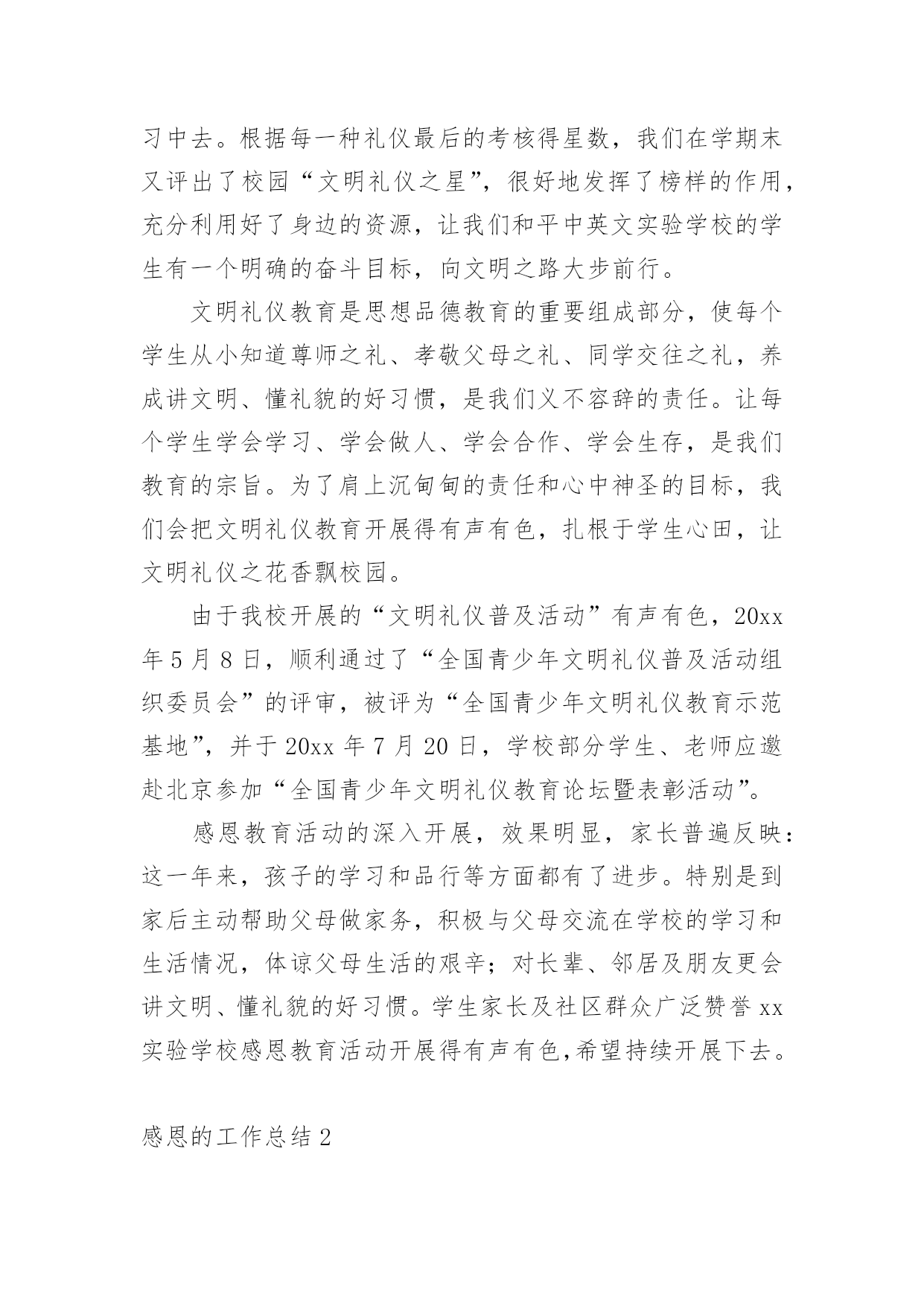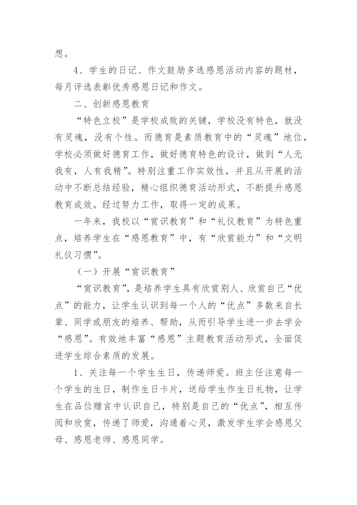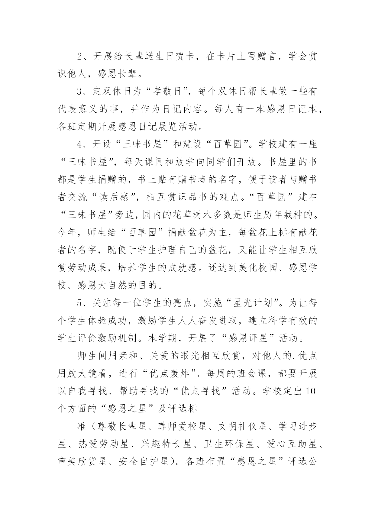 感恩的工作总结总结是事后对某一时期、某一项目或某些工作进行回顾和分析,从而做出带有规律性的结论,它能够使头脑更加清醒,目标更加明确,因此,让我们写一份总结吧。如何把总结做到重点突出呢?以下是小编为大家整理的感恩的工作总结,欢迎大家分享。感恩的工作总结1本学年,我校继续通过各种形式深入而广泛地开展感恩教育活动,收到了良好的效果。一、注重常规教育xx实验学校开展感恩教育三年来,学校面貌有了明显的变化。师生穿戴,文明礼仪、安全卫生、一帮一辅导、课堂常规、集会两操等校风、教风、学风、班风焕然一新。这一学年,我校在努力开展感恩特色教育的同时,我们特别注重常规的、根本的感恩教育工作,强抓不懈。只有切实抓好感恩教育的常规工作,才能保障和促进感恩教育特色活动的开展。1、课前坚持唱好感恩歌曲:《说句心里话》、《父亲》、《白发亲娘》、《烛光里的妈妈》、《感恩的心》、《爱的奉献》、《为了谁》、《我的祖国》,并让校园广播定时播放。2、国旗下讲话和主题班会坚持要求渗透感恩教育思想。3、校园文化建设和班级布置坚持围绕“感恩”文化思想。4、学生的日记、作文鼓励多选感恩活动内容的题材,每月评选表彰优秀感恩日记和作文。二、创新感恩教育“特色立校”是学校成败的关键,学校没有特色,就没有灵魂,没有个性。而德育是素质教育中的“灵魂”地位,学校必须做好德育工作,做好德育特色的设计,做到“人无我有,人有我精”。特别注重工作实效性,并且从开展的活动中不断总结经验,精心组织德育活动形式,不断提升感恩教育成效。经过努力工作,取得一定的成果。一年来,我校以“赏识教育”和“礼仪教育”为特色重点,培养学生在“感恩教育”中,有“欣赏能力”和“文明礼仪习惯”。(一)开展“赏识教育”“赏识教育”,是培养学生具有欣赏别人、欣赏自己“优点”的能力,让学生认识到每一个人的“优点”多数来自长辈、同学或朋友的培养、帮助,从而引导学生进一步去学会“感恩”。有效地丰富“感恩”主题教育活动形式,全面促进学生综合素质的发展。1、关注每一个学生生日,传递师爱。班主任注意每一个学生的生日,制作生日卡片,送给学生作生日礼物,让学生在品位赠言中认识自己,特别是自己的“优点”,相互传阅和欣赏,传递了师爱,沟通着心灵,激发学生学会感恩父母、感恩老师、感恩同学。2、开展给长辈送生日贺卡,在卡片上写赠言,学会赏识他人,感恩长辈。3、定双休日为“孝敬日”,每个双休日帮长辈做一些有代表意义的事,并作为日记内容。每人有一本感恩日记本,各班定期开展感恩日记展览活动。4、开设“三味书屋”和建设“百草园”。学校建有一座“三味书屋”,每天课间和放学向同学们开放。书屋里的书都是学生捐赠的,书上贴有赠书者的名字,便于读者与赠书者交流“读后感”,相互赏识品书的观点。“百草园”建在“三味书屋”旁边,园内的花草树木多数是师生历年栽种的。今年,师生给“百草园”捐献盆花为主,每盆花上标有献花者的名字,既便于学生护理自己的盆花,又能让学生相互欣赏劳动成果,培养学生的成就感。还达到美化校园、感恩学校、感恩大自然的目的。5、关注每一位学生的亮点,实施“星光计划”。为让每个学生体验成功,激励学生人人奋发进取,建立科学有效的学生评价激励机制。本学期,开展了“感恩评星”活动。师生间用亲和、关爱的眼光相互欣赏,对他人的.优点用放大镜看,进行“优点轰炸”。每周的班会课,都要开展以自我寻找、帮助寻找的“优点寻找”活动。学校定出10个方面的“感恩之星”及评选标准(尊敬长辈星、尊师爱校星、文明礼仪星、学习进步星、热爱劳动星、兴趣特长星、卫生环保星、爱心互助星、审美欣赏星、安全自护星)。各班布置“感恩之星”评选公布栏,每周一小评,每月一大评。每月各班推选出十名“感恩之星”上报学校,学校大会表彰,发给喜报单。同时在校园内设计专栏公布和校园网上公布。(二)开展“礼仪教育”中华民族素有“礼仪之邦、文明古国”的美誉,文明礼仪是中华民族的优良传统。根据青少年的年龄特点和身心发展规律,加强思想道德建设,培养青少年养成良好的文明礼仪习惯,是学校教育肩负的历史使命。和平中英文实验学校自创办以来,一直非常重视对学生的行为指导和文明礼仪教育,把文明礼仪教育视作学校德育工作的重要内容。20xx年8月27日,宝安区教育局印发《宝安区教育局创建“全国青少年文明礼仪教育示范区”实施方案》的通知及《方案》以后,我校立即认真贯彻执行,结合学校的实际情况,制定《和平中英文实验学校创建“全国青少年文明礼仪教育示范基地”实施方案》,在全校范围内开展了一系列生动、丰富具有教育意义的活动,让学生们在活动中学会做人的基本原则,彻底告别不文明的言行,提高自身文明礼仪修养,营造学校良好的育人环境和人文环境。1、营造文明礼仪的教育氛围。一个好的氛围能够影响人的行为与行动,我校在开展文明礼仪活动中,注意营造氛围,让学生