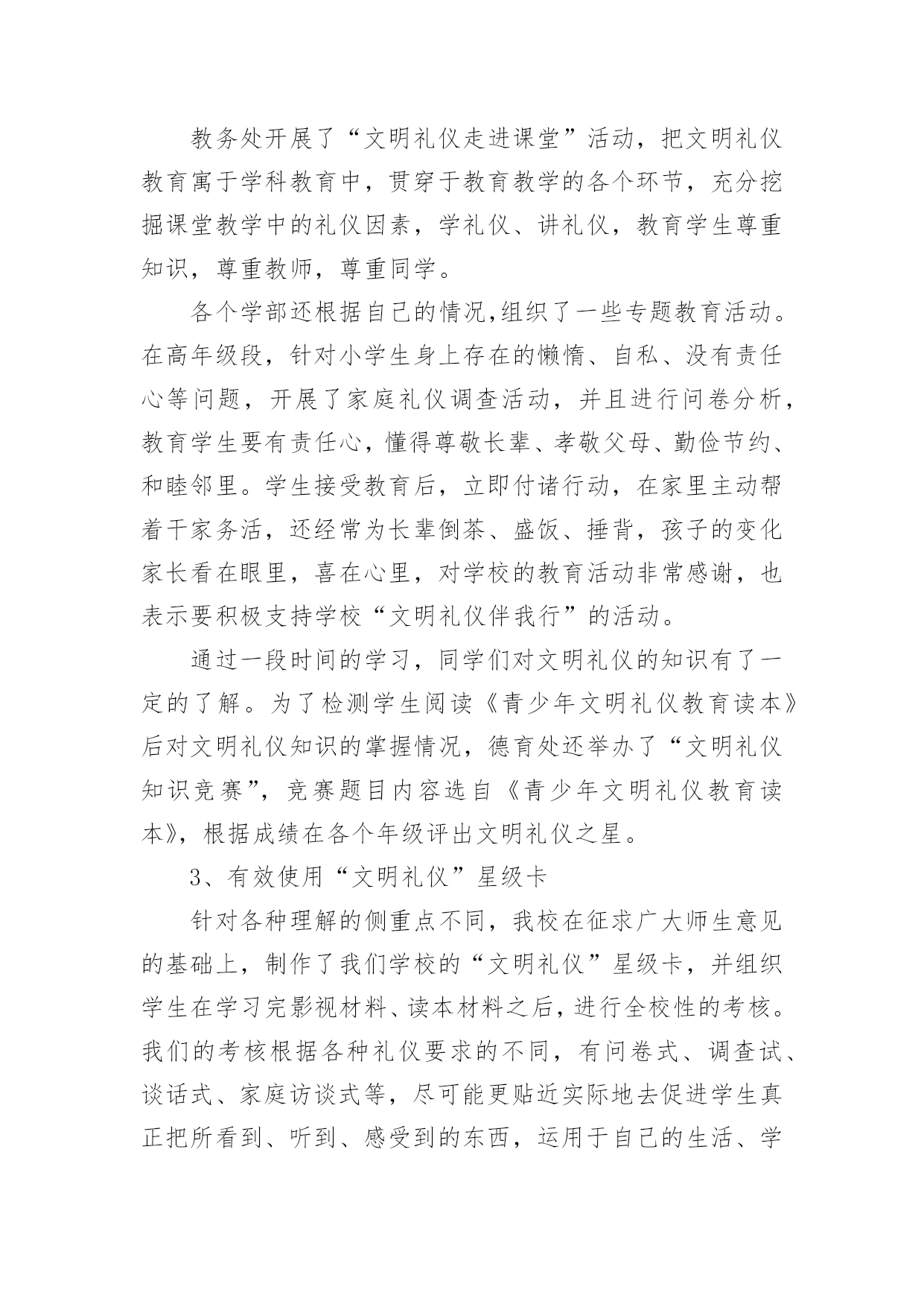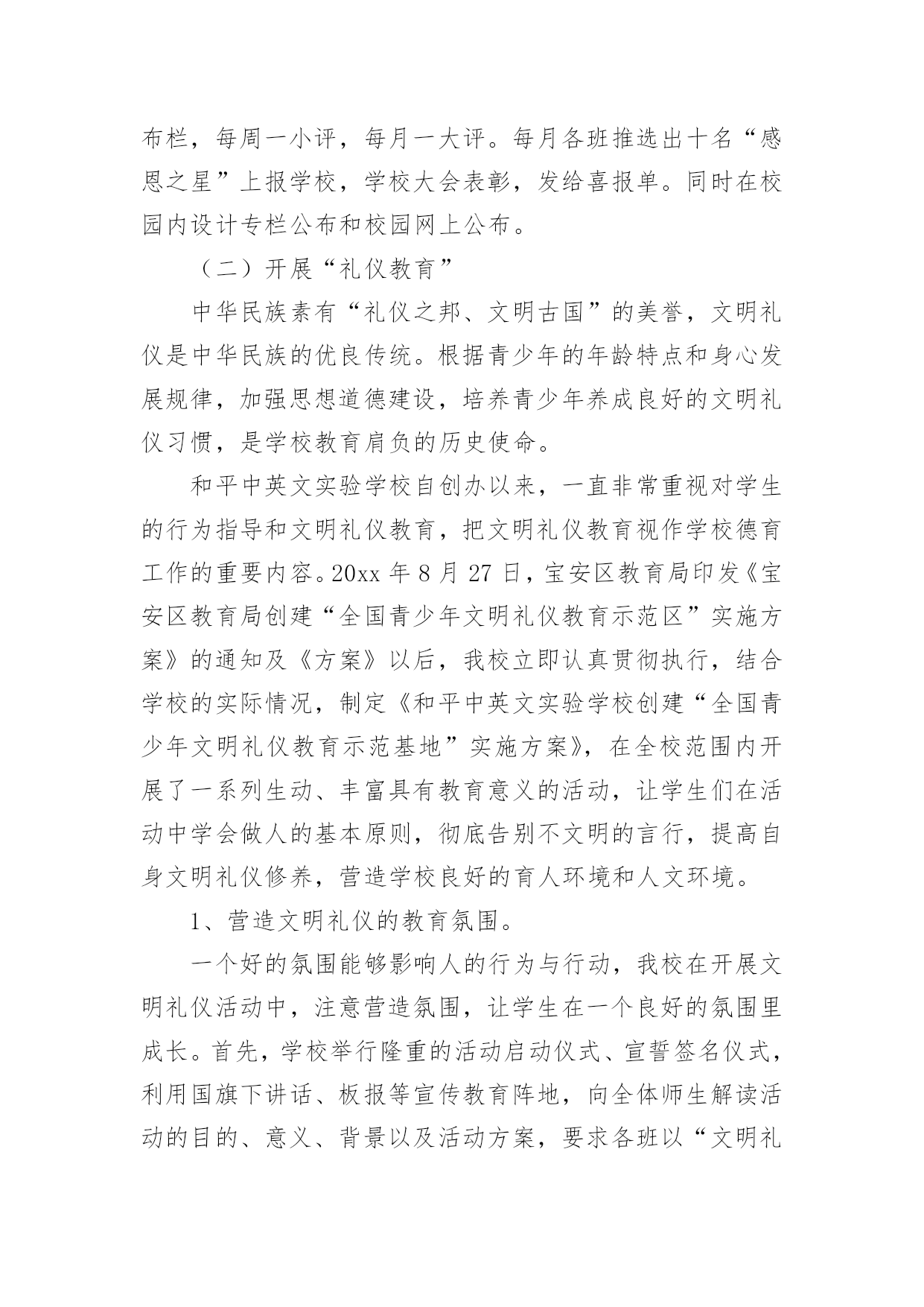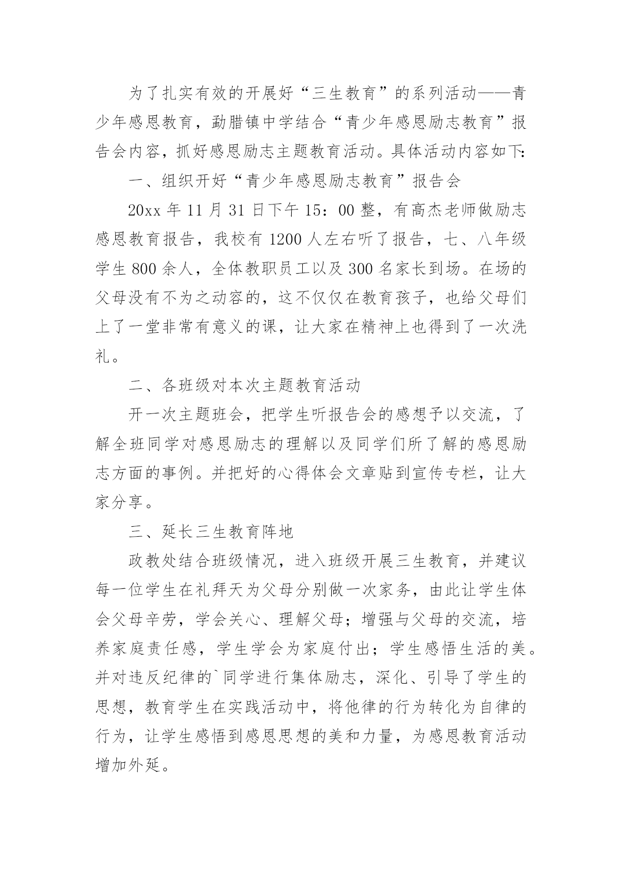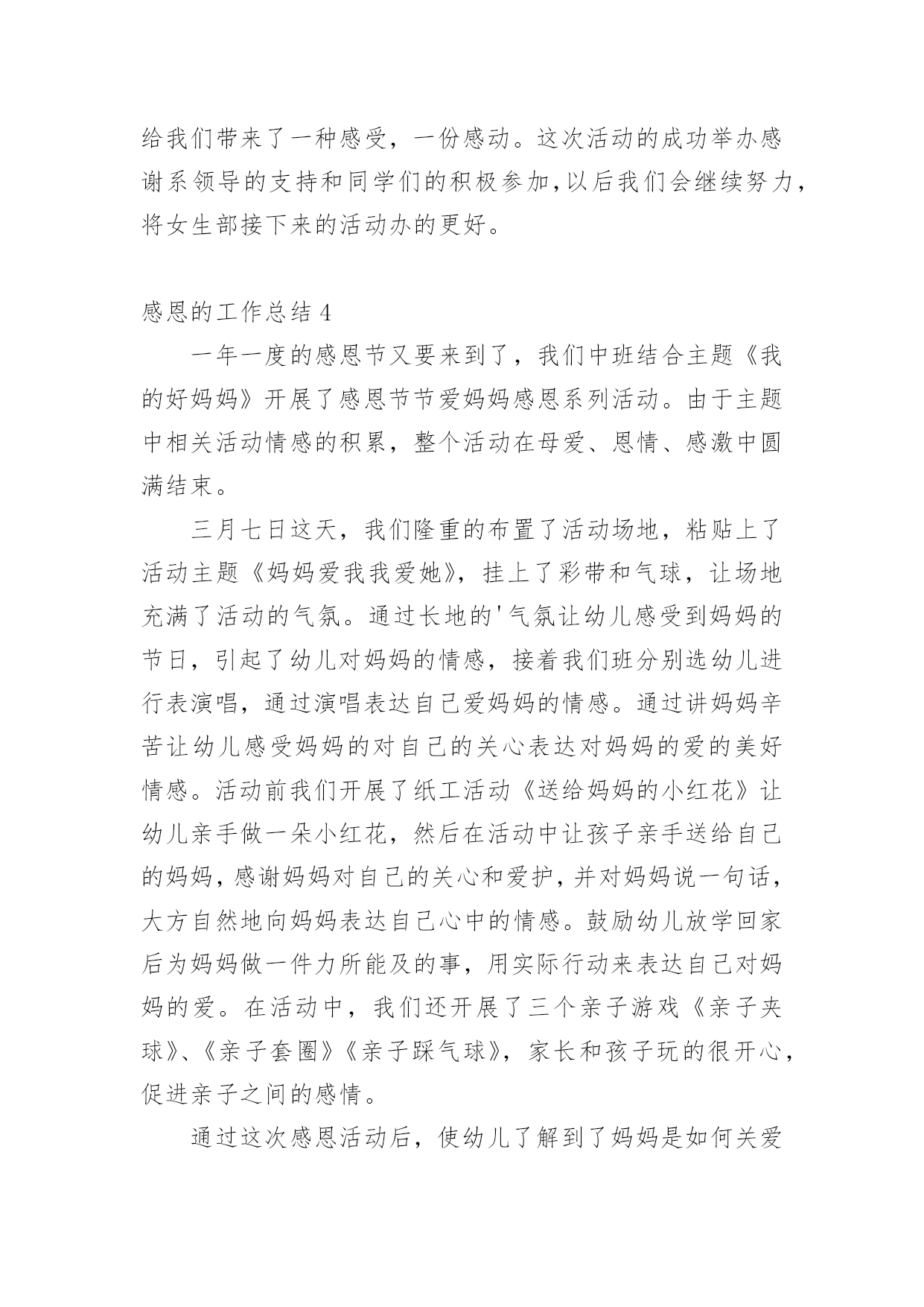 感恩的工作总结总结是事后对某一时期、某一项目或某些工作进行回顾和分析,从而做出带有规律性的结论,它能够使头脑更加清醒,目标更加明确,因此,让我们写一份总结吧。如何把总结做到重点突出呢?以下是小编为大家整理的感恩的工作总结,欢迎大家分享。感恩的工作总结1本学年,我校继续通过各种形式深入而广泛地开展感恩教育活动,收到了良好的效果。一、注重常规教育xx实验学校开展感恩教育三年来,学校面貌有了明显的变化。师生穿戴,文明礼仪、安全卫生、一帮一辅导、课堂常规、集会两操等校风、教风、学风、班风焕然一新。这一学年,我校在努力开展感恩特色教育的同时,我们特别注重常规的、根本的感恩教育工作,强抓不懈。只有切实抓好感恩教育的常规工作,才能保障和促进感恩教育特色活动的开展。1、课前坚持唱好感恩歌曲:《说句心里话》、《父亲》、《白发亲娘》、《烛光里的妈妈》、《感恩的心》、《爱的奉献》、《为了谁》、《我的祖国》,并让校园广播定时播放。2、国旗下讲话和主题班会坚持要求渗透感恩教育思想。3、校园文化建设和班级布置坚持围绕“感恩”文化思想。4、学生的日记、作文鼓励多选感恩活动内容的题材,每月评选表彰优秀感恩日记和作文。二、创新感恩教育“特色立校”是学校成败的关键,学校没有特色,就没有灵魂,没有个性。而德育是素质教育中的“灵魂”地位,学校必须做好德育工作,做好德育特色的设计,做到“人无我有,人有我精”。特别注重工作实效性,并且从开展的活动中不断总结经验,精心组织德育活动形式,不断提升感恩教育成效。经过努力工作,取得一定的成果。一年来,我校以“赏识教育”和“礼仪教育”为特色重点,培养学生在“感恩教育”中,有“欣赏能力”和“文明礼仪习惯”。(一)开展“赏识教育”“赏识教育”,是培养学生具有欣赏别人、欣赏自己“优点”的能力,让学生认识到每一个人的“优点”多数来自长辈、同学或朋友的培养、帮助,从而引导学生进一步去学会“感恩”。有效地丰富“感恩”主题教育活动形式,全面促进学生综合素质的发展。1、关注每一个学生生日,传递师爱。班主任注意每一个学生的生日,制作生日卡片,送给学生作生日礼物,让学生在品位赠言中认识自己,特别是自己的“优点”,相互传阅和欣赏,传递了师爱,沟通着心灵,激发学生学会感恩父母、感恩老师、感恩同学。2、开展给长辈送生日贺卡,在卡片上写赠言,学会赏识他人,感恩长辈。3、定双休日为“孝敬日”,每个双休日帮长辈做一些有代表意义的事,并作为日记内容。每人有一本感恩日记本,各班定期开展感恩日记展览活动。4、开设“三味书屋”和建设“百草园”。学校建有一座“三味书屋”,每天课间和放学向同学们开放。书屋里的书都是学生捐赠的,书上贴有赠书者的名字,便于读者与赠书者交流“读后感”,相互赏识品书的观点。“百草园”建在“三味书屋”旁边,园内的花草树木多数是师生历年栽种的。今年,师生给“百草园”捐献盆花为主,每盆花上标有献花者的名字,既便于学生护理自己的盆花,又能让学生相互欣赏劳动成果,培养学生的成就感。还达到美化校园、感恩学校、感恩大自然的目的。5、关注每一位学生的亮点,实施“星光计划”。为让每个学生体验成功,激励学生人人奋发进取,建立科学有效的学生评价激励机制。本学期,开展了“感恩评星”活动。师生间用亲和、关爱的眼光相互欣赏,对他人的.优点用放大镜看,进行“优点轰炸”。每周的班会课,都要开展以自我寻找、帮助寻找的“优点寻找”活动。学校定出10个方面的“感恩之星”及评选标准(尊敬长辈星、尊师爱校星、文明礼仪星、学习进步星、热爱劳动星、兴趣特长星、卫生环保星、爱心互助星、审美欣赏星、安全自护星)。各班布置“感恩之星”评选公布栏,每周一小评,每月一大评。每月各班推选出十名“感恩之星”上报学校,学校大会表彰,发给喜报单。同时在校园内设计专栏公布和校园网上公布。(二)开展“礼仪教育”中华民族素有“礼仪之邦、文明古国”的美誉,文明礼仪是中华民族的优良传统。根据青少年的年龄特点和身心发展规律,加强思想道德建设,培养青少年养成良好的文明礼仪习惯,是学校教育肩负的历史使命。和平中英文实验学校自创办以来,一直非常重视对学生的行为指导和文明礼仪教育,把文明礼仪教育视作学校德育工作的重要内容。20xx年8月27日,宝安区教育局印发《宝安区教育局创建“全国青少年文明礼仪教育示范区”实施方案》的通知及《方案》以后,我校立即认真贯彻执行,结合学校的实际情况,制定《和平中英文实验学校创建“全国青少年文明礼仪教育示范基地”实施方案》,在全校范围内开展了一系列生动、丰富具有教育意义的活动,让学生们在活动中学会做人的基本原则,彻底告别不文明的言行,提高自身文明礼仪修养,营造学校良好的育人环境和人文环境。1、营造文明礼仪的教育氛围。一个好的氛围能够影响人的行为与行动,我校在开展文明礼仪活动中,注意营造氛围,让学生