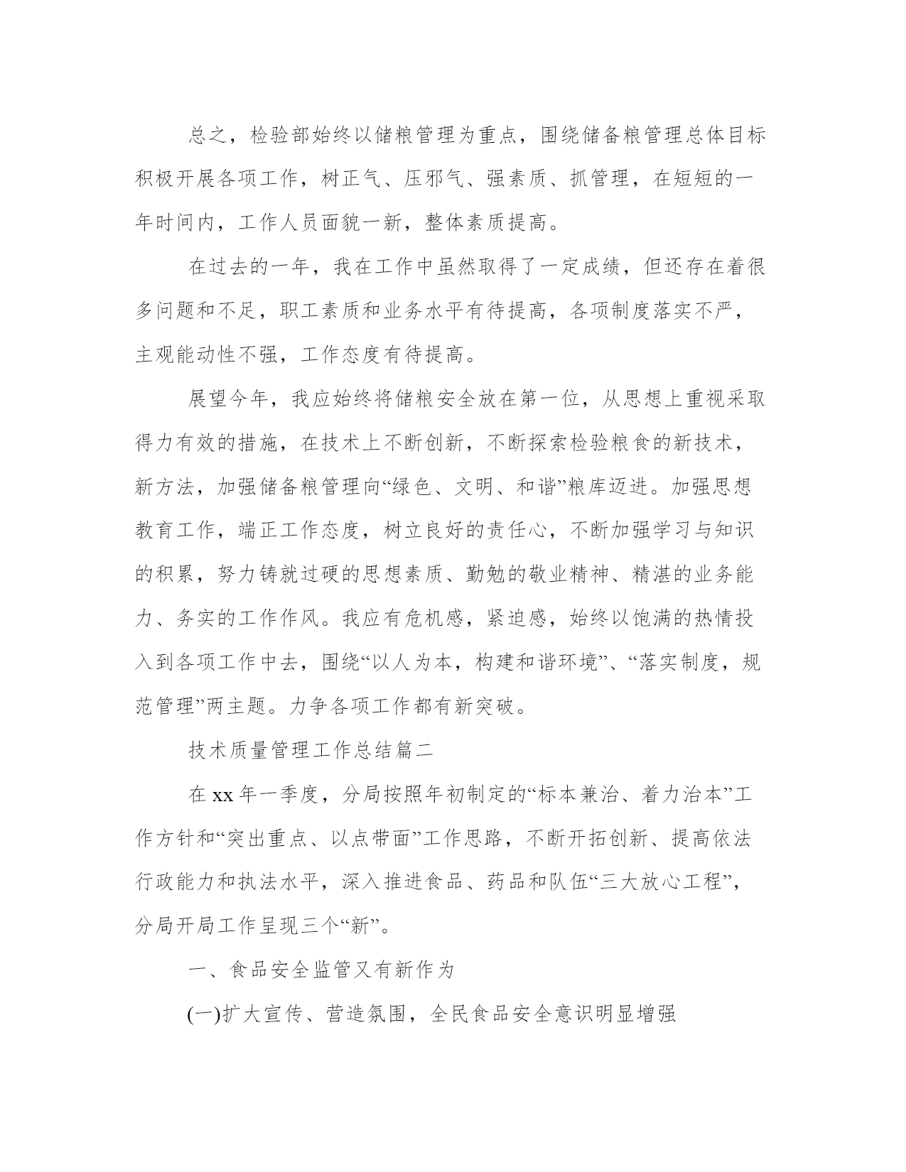 2024年技术质量管理工作总结(大全8篇)总结是对前段社会实践活动进行全面回顾、检查的文种,这决定了总结有很强的客观性特征。那么,我们该怎么写总结呢?以下是小编精心整理的总结范文,供大家参考借鉴,希望可以帮助到有需要的朋友。技术质量管理工作总结篇一光阴荏苒,岁岁年年,转眼间时光已进入20xx年,回首走过的20xx年,仓储科作为粮库的主要部门,在库领导的正确领导下,精诚团结,并肩作战,始终围绕确保储备粮数量真实、质量良好,储存安全,管理规范,保证国家随时调用的工作目标,积极开展工作,圆满完成了库内交给的各项工作。现将主要工作总结如下:为了圆满完成此次入粮任务,检验部做了充分的前期准备工作,制定了完善的预案,针对工作人员新,工作量,缺乏经验等实际情况,对工作人员进行了岗位培训,并进行了多次演练,及时发现并纠正了一些影响粮食质量的问题,做到了5个到位:所需化验、入粮器械准备到位,工作人员迎接硬仗的心理调整到位,每个人的岗位责任落实到位,质量压倒观念树立到位,工作纪律强调到位。在多个日日夜夜,检验部职工表现出极高的素质和极强的责任心,作风顽强,工作积极主动,不怕脏、累,肯于吃苦,胜利的果实包含着一线工作人员辛劳的汗水。我作为一个化验人员严守工作纪律,坚持客观公正,坚持原则,顶住各种压力,咬紧牙关“唱黑脸”,严把检验质量关,吃住在岗,轮换休息。实践证明我们的队伍是经得起考验的。储粮质量安全既是我库的工作重点,又是检验部的工作要务,为了确保粮食安全,我付出了艰辛的代价。按粮油检验技术规范要求加强对重点部位的检测,发现问题,及时分析处理。使储粮处于安全稳定状态。1、积极参加办公室组织的商务礼仪和粮库管理规范学习,使我开阔了视野,提高了认识,明确责任,以库内规范指导工作。2、形成两会制度,创造“比、学、赶、、超”的良好氛围。针对仓储部工作人员新,经验少的实际情况,召开每周一仓储例会和每月检验分析会,充分发挥同志们的主观能动性,逐步培养检验员勤观察、多动脑、善总结的良好习惯,强化了安全生产意识,提高在工作中善于发现问题、分析问题、探讨问题、解决问题的`能力,做到能言会干,既提高了业务水平,又提高了语言表达能力。3、进行业务培训,提高检验部员工业务素质。采取送出去的方式,分别对保管员和化验员进行了培训,并且采用老保管员讲课的方式,对新保管员进行培训,使保管员业务素质再上新高,检验工作再上一个新台阶。4、加强保先教育,增强党性理念。提高职工素质,用先进思想武装自己,并深入应用到工作中去,牢固树立“以库为家、库荣我荣”的思想。总之,检验部始终以储粮管理为重点,围绕储备粮管理总体目标积极开展各项工作,树正气、压邪气、强素质、抓管理,在短短的一年时间内,工作人员面貌一新,整体素质提高。在过去的一年,我在工作中虽然取得了一定成绩,但还存在着很多问题和不足,职工素质和业务水平有待提高,各项制度落实不严,主观能动性不强,工作态度有待提高。展望今年,我应始终将储粮安全放在第一位,从思想上重视采取得力有效的措施,在技术上不断创新,不断探索检验粮食的新技术,新方法,加强储备粮管理向“绿色、文明、和谐”粮库迈进。加强思想教育工作,端正工作态度,树立良好的责任心,不断加强学习与知识的积累,努力铸就过硬的思想素质、勤勉的敬业精神、精湛的业务能力、务实的工作作风。我应有危机感,紧迫感,始终以饱满的热情投入到各项工作中去,围绕“以人为本,构建和谐环境”、“落实制度,规范管理”两主题。力争各项工作都有新突破。技术质量管理工作总结篇二在xx年一季度,分局按照年初制定的“标本兼治、着力治本”工作方针和“突出重点、以点带面”工作思路,不断开拓创新、提高依法行政能力和执法水平,深入推进食品、药品和队伍“三大放心工程”,分局开局工作呈现三个“新”。一、食品安全监管又有新作为(一)扩大宣传、营造氛围,全民食品安全意识明显增强1、社会层面。自行编印食品药品安全报,定期向社会村落发放;在大型超市、车站码头等重点区域,添置报刊架,向群众免费赠阅相关报刊资料;制定“xx年食品药品知识进社区宣传计划”,组建以分局干部、社会宣讲人员为主体的讲师团,以××*为首站,全面启动对社区居民的年度巡讲;结合农村赶早集特点,在××等闹市,设摊举行了以“人人关心食品药品安全,共同营造和-谐消费环境”为主题的科普早市宣传咨询活动;利用春节以及“3.15”等节日,开展主题宣传,集中曝光假劣食品,开展为民咨询,向社会各界广泛宣传食品安全监管工作取得的成果。2、基层网络层面。分局领导带队,先后走访××××等基层政府,及时就食品安全监管工作重要性和严峻监管形势等进行沟通宣传,取得基层政府对分局工作的支持和配合;对新组建的乡镇场层面的食品安全检查员队伍,组织他们开展培训,帮助他们及时转换角