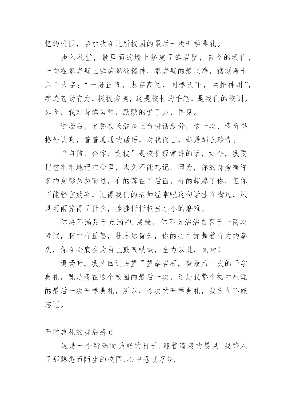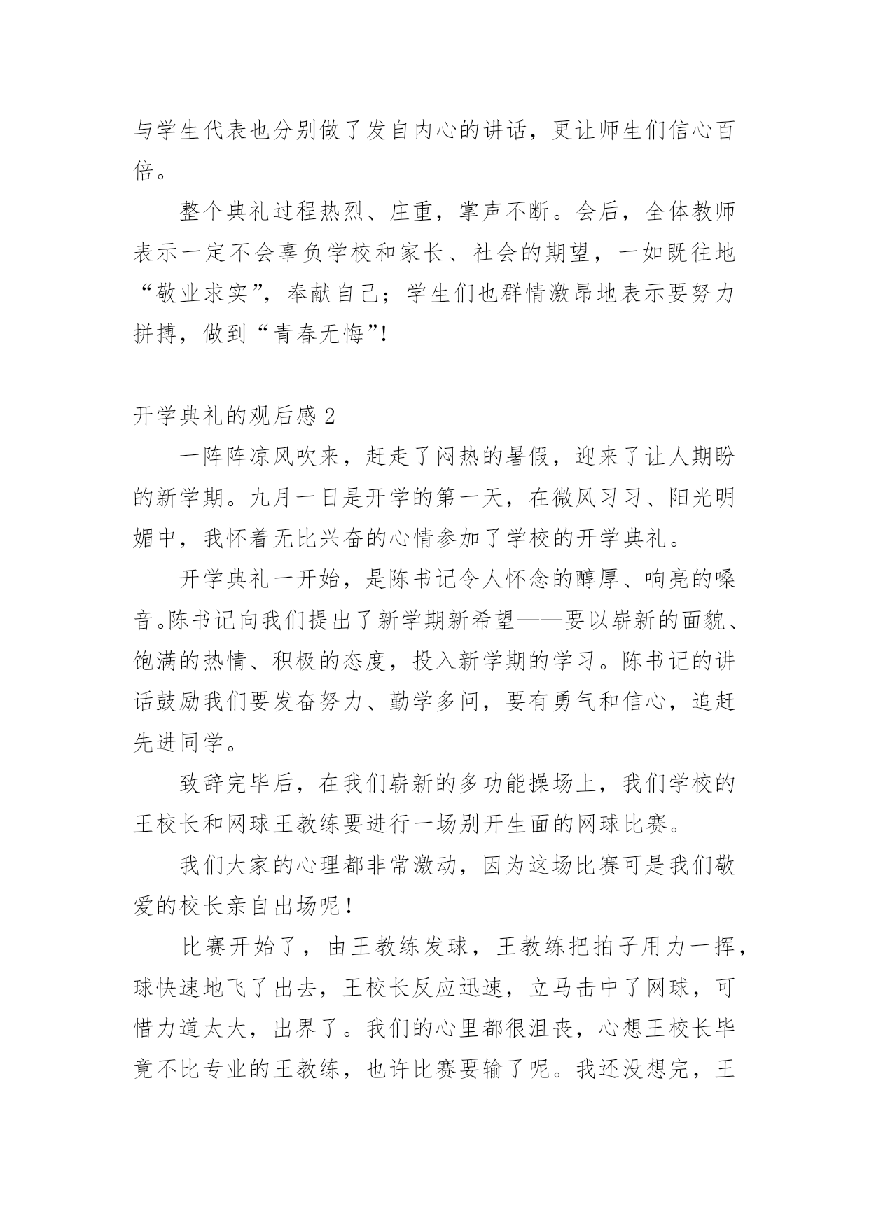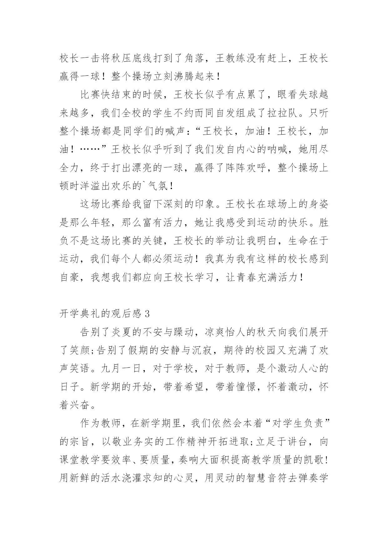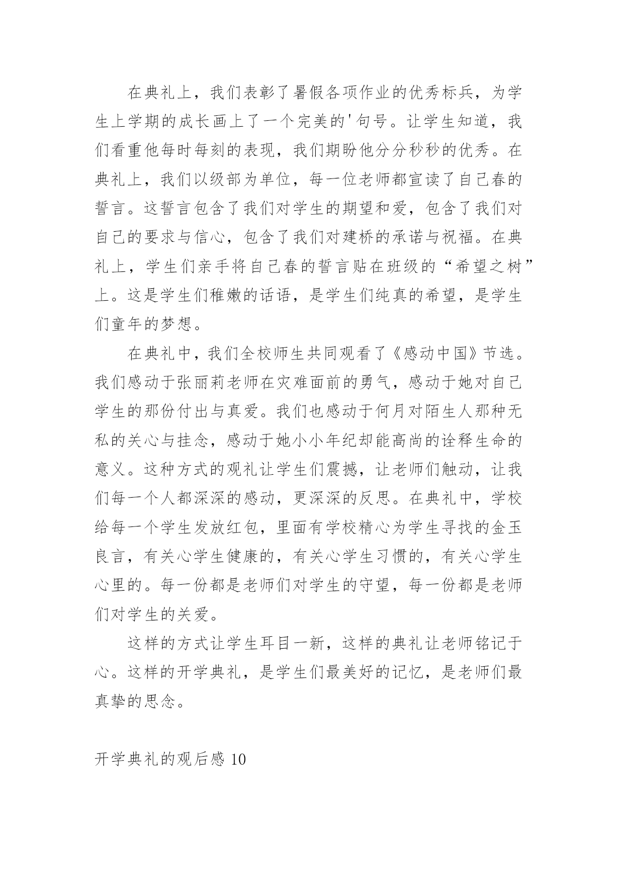 开学典礼的观后感认真品味一部作品后,大家一定收获不少吧,不妨坐下来好好写写观后感吧。那么观后感到底应该怎么写呢?以下是小编整理的开学典礼的观后感,希望对大家有所帮助。开学典礼的观后感1新学期如约而至,今日的校园,仿佛又多了几丝欢乐,几丝愉悦,静静聆听着广播站老师和同学们的发言,好像这一切与我们刚刚来到这个校园一样的温馨,一样的幸福,但是,和往常不一样的是,这个学期对我们的意义有所不同:今年是我们的中考年,再有121天的时间,我们就要阔别这曾经伴随我们走过三年时光的校园了,当然还有121天的时间,我们也就将要接受中考的洗礼了,对于我们来说,这是一个非常重要并且严肃的事情,中考时决定人生走向的第一道关口,也是我们迈向胜利的关键,我们只有经过困难的考验和不懈的.追求,才能取得成功,鲁迅先生曾经说过,时间就像海绵里的水,只要挤,总还是有的。所以同学们,从现在开始,抓紧一切时间,为梦想拼搏吧!首先由初三年级王琳妹校长就新学期工作做了重要讲话,她的谆谆告诫和殷殷期待使群体师生倍感亲切和鼓舞。教务处佟欣荣主任和政教处赵岩主任分别在学习和纪律方面对全体同学提出了新学期的目标和要求,使同学们有了前行的信心和动力。会上,王莹老师和魏新同学做为教师代表与学生代表也分别做了发自内心的讲话,更让师生们信心百倍。整个典礼过程热烈、庄重,掌声不断。会后,全体教师表示一定不会辜负学校和家长、社会的期望,一如既往地“敬业求实”,奉献自己;学生们也群情激昂地表示要努力拼搏,做到“青春无悔”!开学典礼的观后感2一阵阵凉风吹来,赶走了闷热的暑假,迎来了让人期盼的新学期。九月一日是开学的第一天,在微风习习、阳光明媚中,我怀着无比兴奋的心情参加了学校的开学典礼。开学典礼一开始,是陈书记令人怀念的醇厚、响亮的嗓音。陈书记向我们提出了新学期新希望——要以崭新的面貌、饱满的热情、积极的态度,投入新学期的学习。陈书记的讲话鼓励我们要发奋努力、勤学多问,要有勇气和信心,追赶先进同学。致辞完毕后,在我们崭新的多功能操场上,我们学校的王校长和网球王教练要进行一场别开生面的网球比赛。我们大家的心理都非常激动,因为这场比赛可是我们敬爱的校长亲自出场呢!比赛开始了,由王教练发球,王教练把拍子用力一挥,球快速地飞了出去,王校长反应迅速,立马击中了网球,可惜力道太大,出界了。我们的心里都很沮丧,心想王校长毕竟不比专业的王教练,也许比赛要输了呢。我还没想完,王校长一击将秋压底线打到了角落,王教练没有赶上,王校长赢得一球!整个操场立刻沸腾起来!比赛快结束的时候,王校长似乎有点累了,眼看失球越来越多,我们全校的学生不约而同自发组成了拉拉队。只听整个操场都是同学们的喊声:“王校长,加油!王校长,加油!……”王校长似乎听到了我们发自内心的呐喊,她用尽全力,终于打出漂亮的一球,赢得了阵阵欢呼,整个操场上顿时洋溢出欢乐的`气氛!这场比赛给我留下深刻的印象。王校长在球场上的身姿是那么年轻,那么富有活力,她让我感受到运动的快乐。胜负不是这场比赛的关键,王校长的举动让我明白,生命在于运动,我们每个人都必须运动!我真为我有这样的校长感到自豪,我想我们都应向王校长学习,让青春充满活力!开学典礼的观后感3告别了炎夏的不安与躁动,凉爽怡人的秋天向我们展开了笑颜;告别了假期的安静与沉寂,期待的校园又充满了欢声笑语。九月一日,对于学校,对于教师,是个激动人心的日子。新学期的开始,带着希望,带着憧憬,怀着激动,怀着兴奋。作为教师,在新学期里,我们依然会本着“对学生负责”的宗旨,以敬业务实的工作精神开拓进取;立足于讲台,向课堂教学要效率、要质量,奏响大面积提高教学质量的凯歌!用新鲜的活水浇灌求知的心灵,用灵动的智慧音符去弹奏学生的“心灵之乐”,用和煦的道德微风去抚慰学生稚嫩的灵魂!力争在新的学期里取得更大的成绩。学生的内心世界就像一张纯洁的.白纸,让我们用爱和智慧描绘一幅幅多姿多彩的图画,谱写出一曲曲美妙的乐章;让我们用生命之火点燃孩子们理想的明灯。虽然我们的名字不会名垂千古,流芳百世,但我们会骄傲地说:“我们的青春和生命将在一批又一批学生身上得到延续和永生!”“人间春色本无价,笔底耕耘总有情”只要从内心深处充满了对教育事业的无限忠诚,就能实现我们中国人高素质、高修养的宏伟目标。作为教师,我们早已做好准备,我们愿倾我们所有,全力以赴。因为选择了这个职业,就注定我们的梦想荣誉都与你们连在了一起,你们是幸福的,我们就是快乐的,你们是进步的,我们就是欣慰的,你们是成功的,我们才是优秀的。开学典礼的观后感4新学期开始了,张老师快步走进教室宣布“这天举行开学典礼!”同学们个个愁眉苦脸、哀声叹气,“开学典礼最没意思!”“浪费时间”……张老师面带微笑地说:“这天的开学典礼必须别开生面。”一边说一边拿出了个鸡蛋。“哦?”同学们十分惊讶,不知