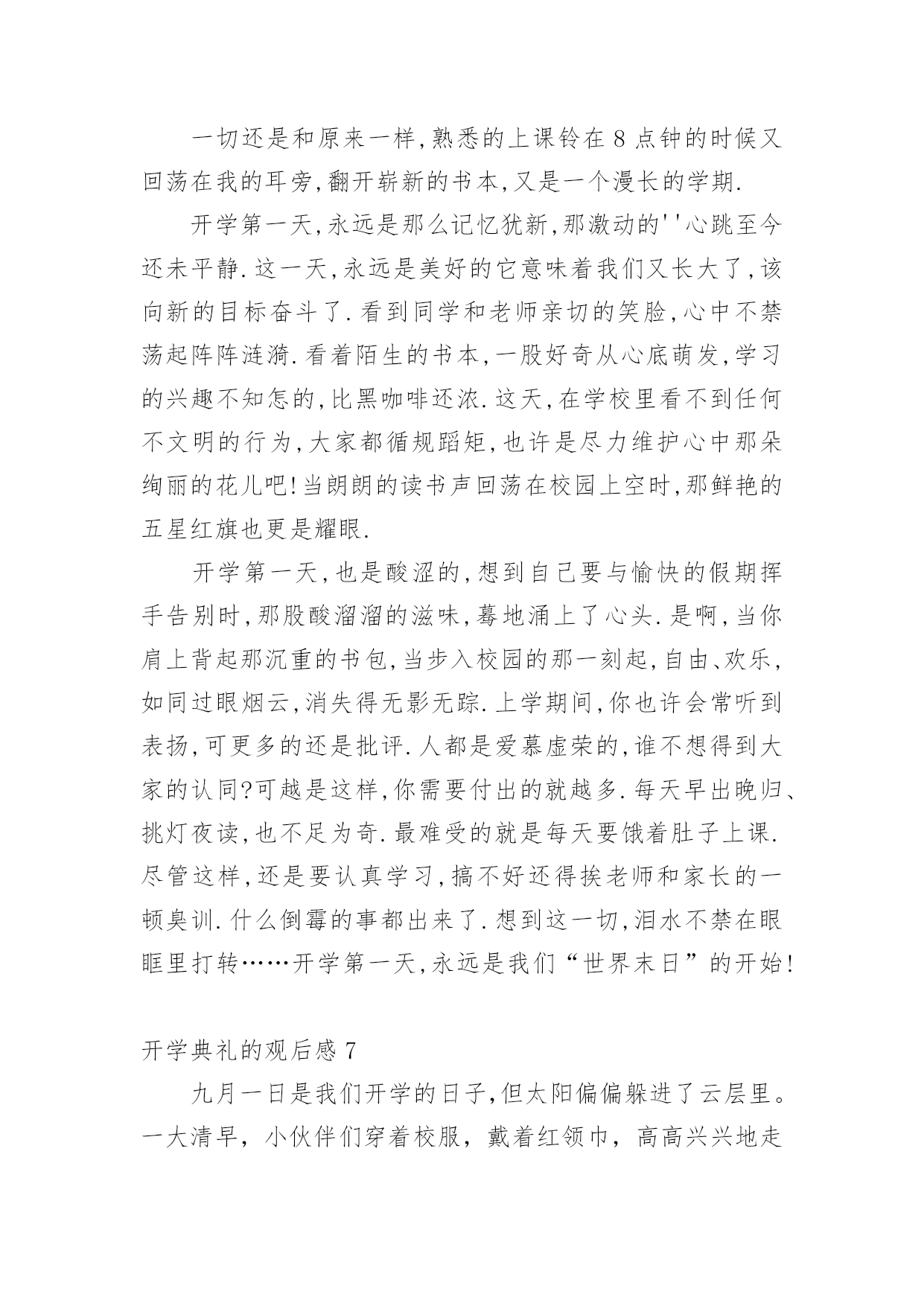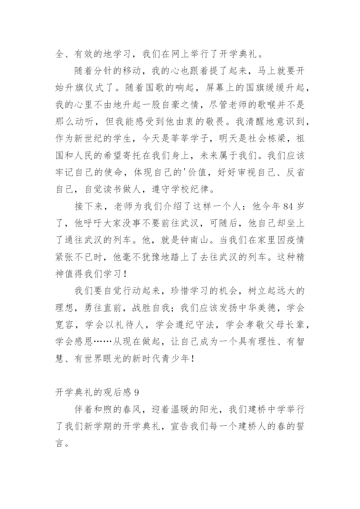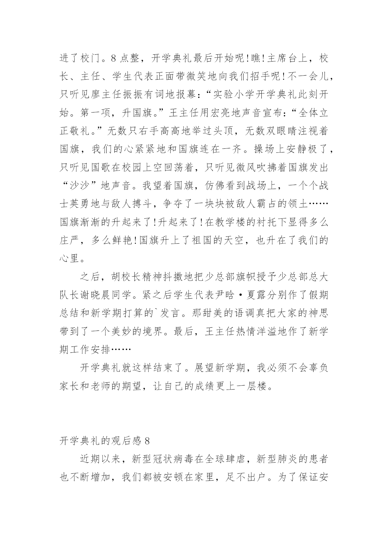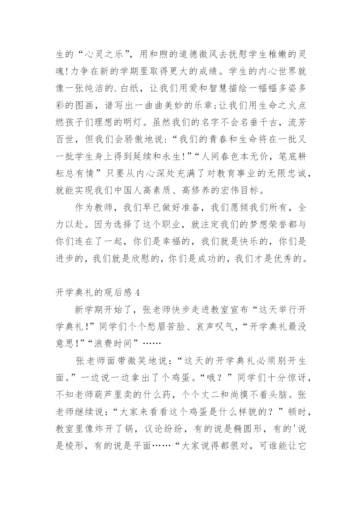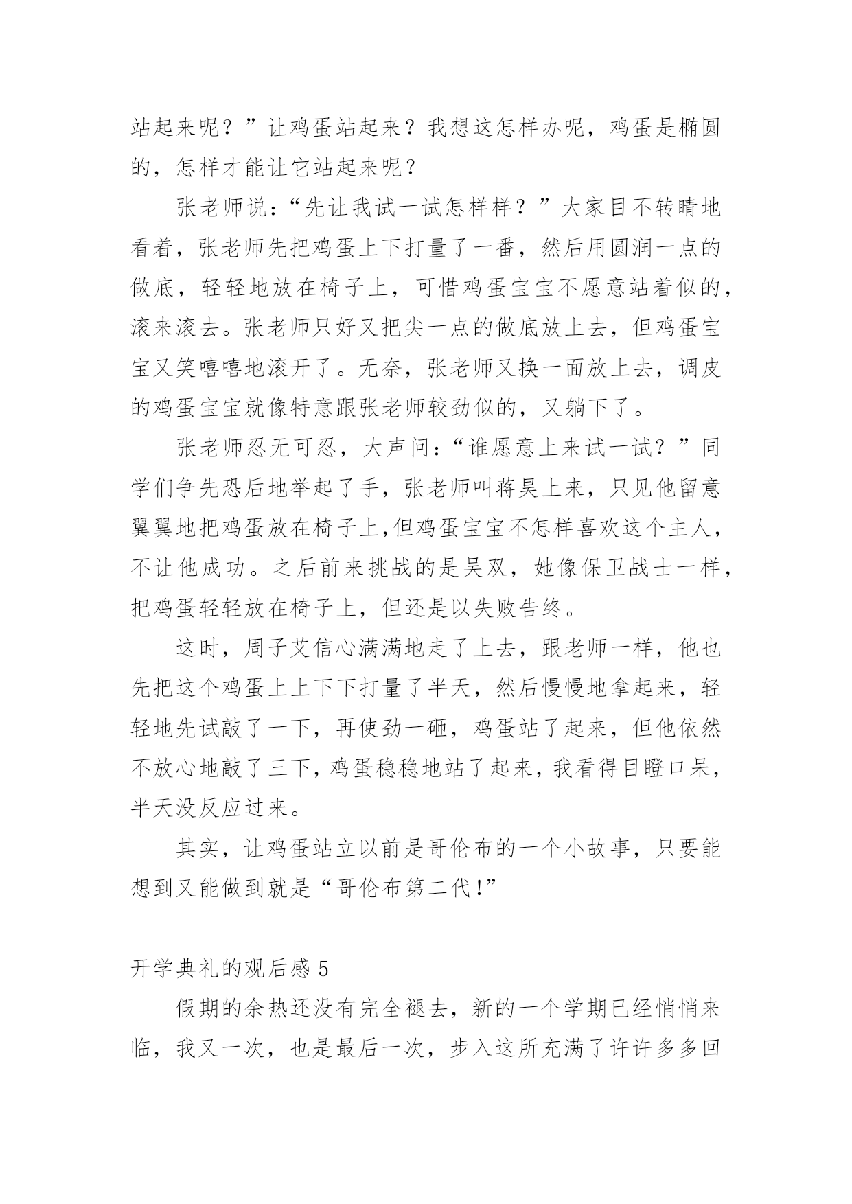 开学典礼的观后感认真品味一部作品后,大家一定收获不少吧,不妨坐下来好好写写观后感吧。那么观后感到底应该怎么写呢?以下是小编整理的开学典礼的观后感,希望对大家有所帮助。开学典礼的观后感1新学期如约而至,今日的校园,仿佛又多了几丝欢乐,几丝愉悦,静静聆听着广播站老师和同学们的发言,好像这一切与我们刚刚来到这个校园一样的温馨,一样的幸福,但是,和往常不一样的是,这个学期对我们的意义有所不同:今年是我们的中考年,再有121天的时间,我们就要阔别这曾经伴随我们走过三年时光的校园了,当然还有121天的时间,我们也就将要接受中考的洗礼了,对于我们来说,这是一个非常重要并且严肃的事情,中考时决定人生走向的第一道关口,也是我们迈向胜利的关键,我们只有经过困难的考验和不懈的.追求,才能取得成功,鲁迅先生曾经说过,时间就像海绵里的水,只要挤,总还是有的。所以同学们,从现在开始,抓紧一切时间,为梦想拼搏吧!首先由初三年级王琳妹校长就新学期工作做了重要讲话,她的谆谆告诫和殷殷期待使群体师生倍感亲切和鼓舞。教务处佟欣荣主任和政教处赵岩主任分别在学习和纪律方面对全体同学提出了新学期的目标和要求,使同学们有了前行的信心和动力。会上,王莹老师和魏新同学做为教师代表与学生代表也分别做了发自内心的讲话,更让师生们信心百倍。整个典礼过程热烈、庄重,掌声不断。会后,全体教师表示一定不会辜负学校和家长、社会的期望,一如既往地“敬业求实”,奉献自己;学生们也群情激昂地表示要努力拼搏,做到“青春无悔”!开学典礼的观后感2一阵阵凉风吹来,赶走了闷热的暑假,迎来了让人期盼的新学期。九月一日是开学的第一天,在微风习习、阳光明媚中,我怀着无比兴奋的心情参加了学校的开学典礼。开学典礼一开始,是陈书记令人怀念的醇厚、响亮的嗓音。陈书记向我们提出了新学期新希望——要以崭新的面貌、饱满的热情、积极的态度,投入新学期的学习。陈书记的讲话鼓励我们要发奋努力、勤学多问,要有勇气和信心,追赶先进同学。致辞完毕后,在我们崭新的多功能操场上,我们学校的王校长和网球王教练要进行一场别开生面的网球比赛。我们大家的心理都非常激动,因为这场比赛可是我们敬爱的校长亲自出场呢!比赛开始了,由王教练发球,王教练把拍子用力一挥,球快速地飞了出去,王校长反应迅速,立马击中了网球,可惜力道太大,出界了。我们的心里都很沮丧,心想王校长毕竟不比专业的王教练,也许比赛要输了呢。我还没想完,王校长一击将秋压底线打到了角落,王教练没有赶上,王校长赢得一球!整个操场立刻沸腾起来!比赛快结束的时候,王校长似乎有点累了,眼看失球越来越多,我们全校的学生不约而同自发组成了拉拉队。只听整个操场都是同学们的喊声:“王校长,加油!王校长,加油!……”王校长似乎听到了我们发自内心的呐喊,她用尽全力,终于打出漂亮的一球,赢得了阵阵欢呼,整个操场上顿时洋溢出欢乐的`气氛!这场比赛给我留下深刻的印象。王校长在球场上的身姿是那么年轻,那么富有活力,她让我感受到运动的快乐。胜负不是这场比赛的关键,王校长的举动让我明白,生命在于运动,我们每个人都必须运动!我真为我有这样的校长感到自豪,我想我们都应向王校长学习,让青春充满活力!开学典礼的观后感3告别了炎夏的不安与躁动,凉爽怡人的秋天向我们展开了笑颜;告别了假期的安静与沉寂,期待的校园又充满了欢声笑语。九月一日,对于学校,对于教师,是个激动人心的日子。新学期的开始,带着希望,带着憧憬,怀着激动,怀着兴奋。作为教师,在新学期里,我们依然会本着“对学生负责”的宗旨,以敬业务实的工作精神开拓进取;立足于讲台,向课堂教学要效率、要质量,奏响大面积提高教学质量的凯歌!用新鲜的活水浇灌求知的心灵,用灵动的智慧音符去弹奏学生的“心灵之乐”,用和煦的道德微风去抚慰学生稚嫩的灵魂!力争在新的学期里取得更大的成绩。学生的内心世界就像一张纯洁的.白纸,让我们用爱和智慧描绘一幅幅多姿多彩的图画,谱写出一曲曲美妙的乐章;让我们用生命之火点燃孩子们理想的明灯。虽然我们的名字不会名垂千古,流芳百世,但我们会骄傲地说:“我们的青春和生命将在一批又一批学生身上得到延续和永生!”“人间春色本无价,笔底耕耘总有情”只要从内心深处充满了对教育事业的无限忠诚,就能实现我们中国人高素质、高修养的宏伟目标。作为教师,我们早已做好准备,我们愿倾我们所有,全力以赴。因为选择了这个职业,就注定我们的梦想荣誉都与你们连在了一起,你们是幸福的,我们就是快乐的,你们是进步的,我们就是欣慰的,你们是成功的,我们才是优秀的。开学典礼的观后感4新学期开始了,张老师快步走进教室宣布“这天举行开学典礼!”同学们个个愁眉苦脸、哀声叹气,“开学典礼最没意思!”“浪费时间”……张老师面带微笑地说:“这天的开学典礼必须别开生面。”一边说一边拿出了个鸡蛋。“哦?”同学们十分惊讶,不知