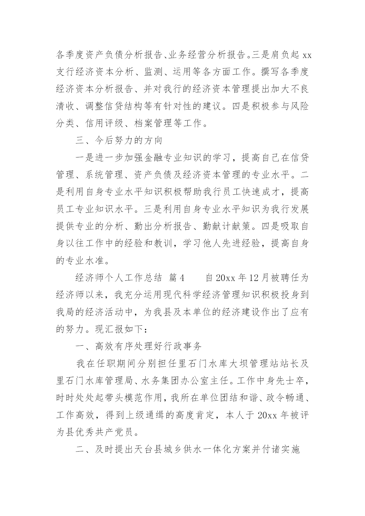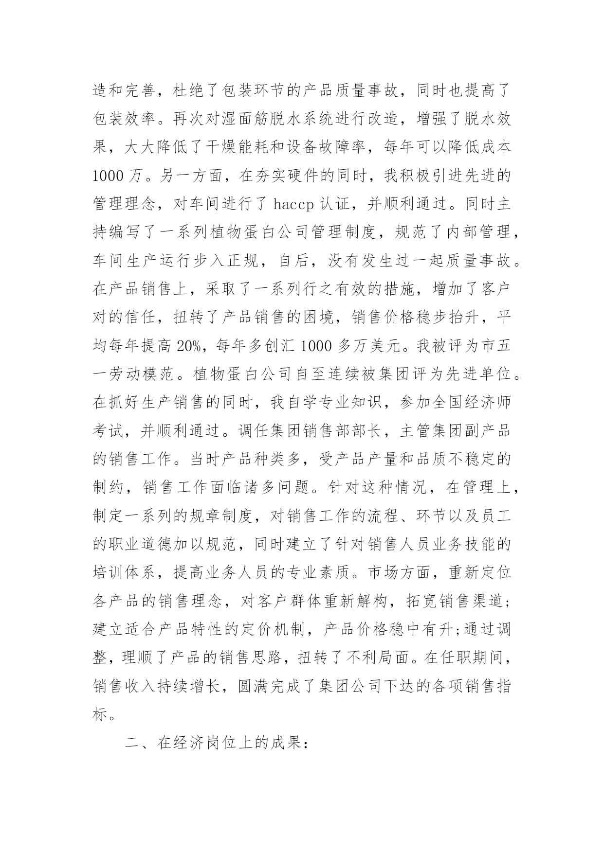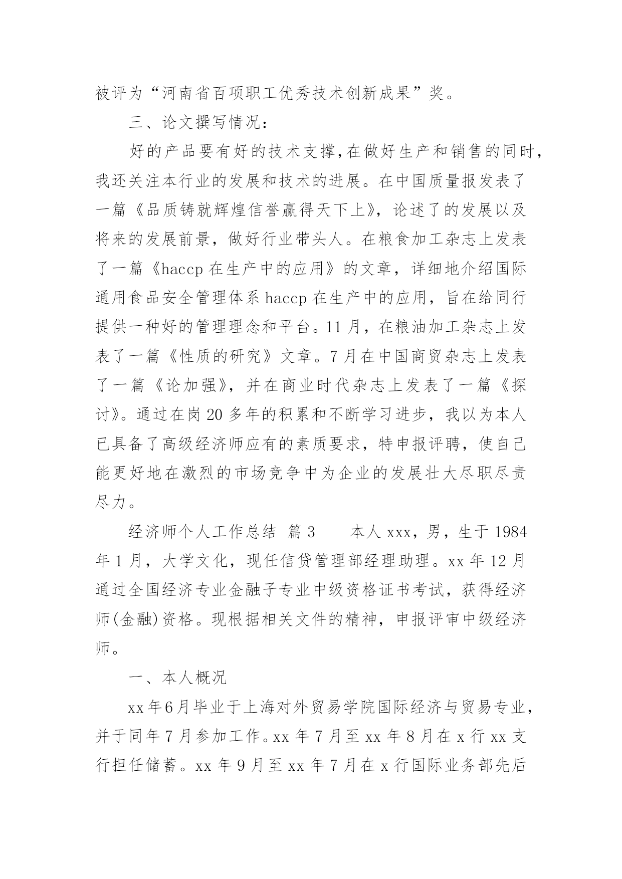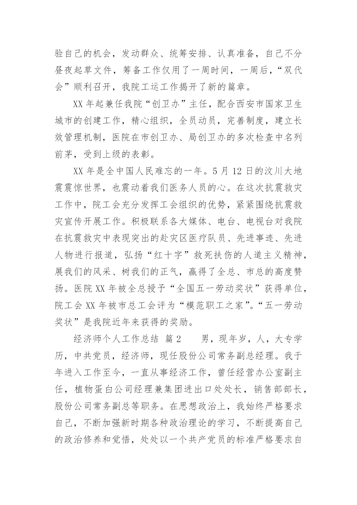 经济师个人工作总结[优选]经济师个人工作总结11篇总结是指社会团体、企业单位和个人对某一阶段的学习、工作或其完成情况加以回顾和分析,得出教训和一些规律性认识的一种书面材料,它可使零星的、肤浅的、表面的感性认知上升到全面的、系统的、本质的理性认识上来,因此,让我们写一份总结吧。你想知道总结怎么写吗?下面是小编为大家收集的经济师个人工作总结,仅供参考,大家一起来看看吧。经济师个人工作总结篇1我叫xxx,男,xx岁,大专学历,政工师、助理经济师,任现职19年,中共党员。1981年部队转业到xx市级医院,1982年起从事工会工作至今。在近30余年的工作时间里,我始终以一个共产党员的标准严格要求自己,牢记职责,时刻将职工利益放在最重要位置,工作扎扎实实,勤勤恳恳,工作水平不断提高,较好地完成了自己的各项工作任务,为医院发展争得了荣誉、贡献了力量。一、扎实学习不断提高思想业务水平积极参加上级工会及医院组织的各类学习,认真学习《工会法》、《劳动法》、职工权益保障法律法规等专业知识,不断提高自身业务水平。同时,坚持学习马列主义、毛泽东思想,坚信党的领导,拥护党的政策,立场坚定,旗帜鲜明,时刻能与党中央保持高度一致。在从事工会工作的27年时间里,时刻运用国家法律法规规范自己的言行,不做出格事,办事客观公正廉洁,工作认真负责,团结同志,联系群众,为人正直,言行端正,扎扎实实做事,堂堂正正做人,工作受到了上级工会领导、医院领导及职工的充分肯定。二、不忘职责认真完成医院交给的各项任务工作中,我时刻牢记自己是一名工会干部,党和职工的利益高于一切。1989年在工会工作的同时,我兼任医院劳动服务公司经理,带领160位待业人员自谋生路、为医院排忧解难。1998年,医院确定了上“三级甲等医院”的工作目标,我作为医院“三甲办”的成员,充分发挥工会组织的'凝聚作用,与全院职工一起,同心同德、为着同一个目标,没白天、没黑夜,吃住在医院整整100多天,完成创“三甲”所需的所有资料及前期准备工作,医院在当年顺利晋级为“三级甲等”医院。1999年,在工会牵头下,对冒我院之名欺骗患者的“江湖医院”展开大规模清理工作。我带领由医务科、保卫科相关人员及省电视台记者组成的“打假”队伍,行程1300余公里,对陕西、山西境内打着“我院”牌子大肆欺骗患者的“医院”进行了彻底的摸排清查,维护了我院的声誉,维护了患者的合法权益。XX年,医院决定召开我院历第xx届职工代表大会及工会会员代表大会。筹备工作时间紧、任务重!我把它当做考验自己的机会,发动群众、统筹安排、认真准备,自己不分昼夜起草文件,筹备工作仅用了一周时间,一周后,“双代会”顺利召开,我院工运工作揭开了新的篇章。XX年起兼任我院“创卫办”主任,配合西安市国家卫生城市的创建工作,精心组织,全员动员,完善制度,建立长效管理机制,医院在市创卫办、局创卫办的多次检查中名列前茅,受到上级的表彰。XX年是全中国人民难忘的一年。5月12日的汶川大地震震惊世界,也震动着我们医务人员的心。在这次抗震救灾工作中,院工会充分发挥工会组织的优势,紧紧围绕抗震救灾宣传开展工作。积极联系各大媒体、电台、电视台对我院在抗震救灾中表现突出的赴灾区医疗队员、先进事迹、先进人物进行报道,弘扬“红十字”救死扶伤的人道主义精神,展我们的风采、树我们的正气,赢得了全总、市总的高度赞扬。医院XX年被全总授予“全国五一劳动奖状”获得单位,院工会XX年被市总工会评为“模范职工之家”。“五一劳动奖状”是我院近年来获得的奖励。经济师个人工作总结篇2男,现年岁,人,大专学历,中共党员,经济师,现任股份公司常务副总经理。我于年进入工作至今,一直从事经济工作,曾任经营办公室副主任,植物蛋白公司经理兼集团进出口处处长,销售部部长,股份公司常务副总等职务。在思想政治上,我始终严格要求自己,不断加强新时期各种政治理论的学习,不断提高自己的政治修养和觉悟,处处以一个共产党员的标准严格要求自己。在工作上,本人本着求真务实,科学发展的理念,不断加强专业知识的学习,理论联系实际,创新管理方法,重视新技术新产品的开发应用,扎实推进各项工作,使自己的工作能力、业务水平和综合能力有了不断的提高,工作上取得了较为明显的成效,多次受到集团公司的表彰。现将自己的工作总结如下:一、从事经济工作的基本情况:我于1982年参加工作以来,一直从事经济工作。1992年任集团公司经营办副主任,协助经营厂长协调各经营部门间以及经营与生产部门的联动工作。1997年被任命为集团进出口处处长,主要负责集团公司所需原料、设备的进口以及主要产品--的海外业务拓展工作,同时兼顾集团与相关外事部门间的协调联络等。被评为市经贸委系统“优秀管理者”荣誉称号。随着集团公司的不断发展和壮大及产业链的延伸,集团公司开发了新产品--。我在兼任集团进