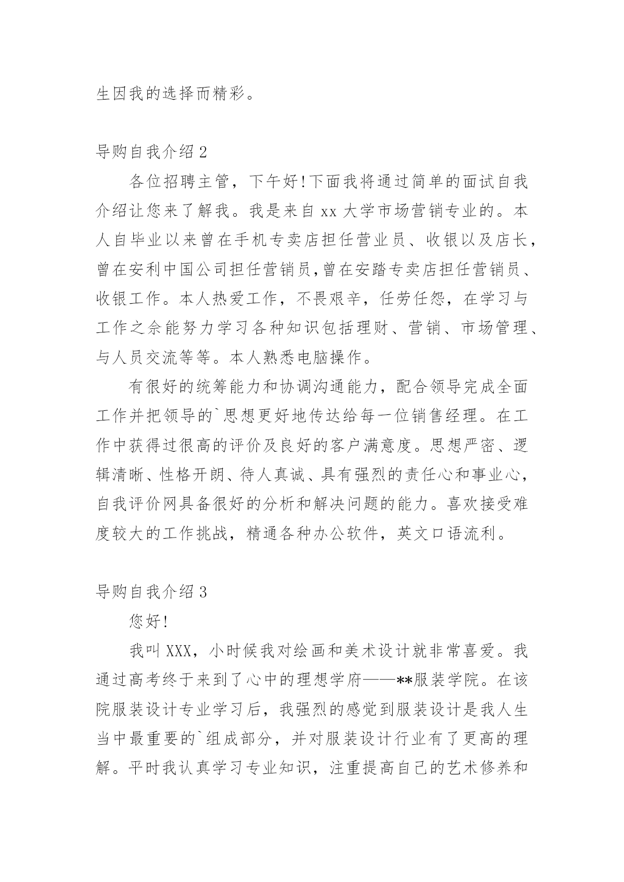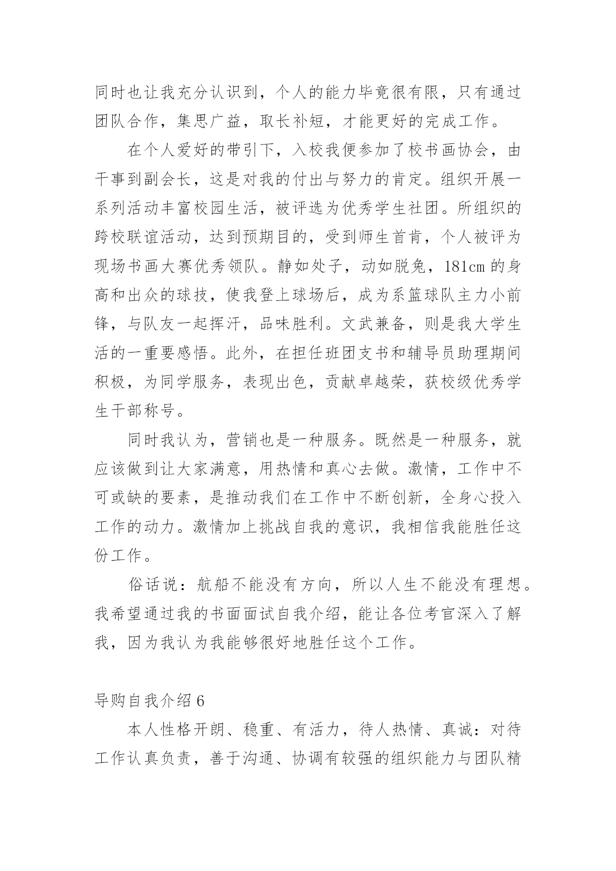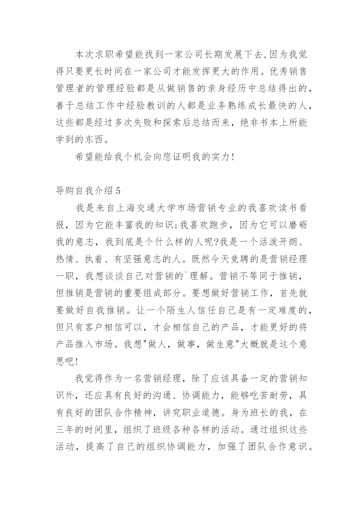 导购自我介绍当碰到陌生人时候,我们难以避免地要作出自我介绍,自我介绍可以满足我们渴望得到尊重的心理。怎么写自我介绍才能避免踩雷呢?下面是小编收集整理的导购自我介绍,欢迎阅读与收藏。导购自我介绍1我叫xxx,现年xx岁,x族,大专文化,平时我喜欢看书和上网流览信息,性格活泼开朗,能关心身边的人和事,和亲人朋友融洽相处,能做到理解和原谅,我对生活充满信心。我曾经在,在公司里先后在不同的岗位工作过,开始我从事工作,随后因公司需要到,有一定的经验,在工作上取得一些的成绩,同时也得到公司的认可。通过几年的工作我学到了很多知识,同时还培养了我坚韧不拔的意志和顽强拼搏的精神,使我能够在工作中不断地克服困难、积极进取。加入销售人员的行列是我多年以来的一个强烈愿望,同时我认识到人和工作的关系是建立在自我认知的基础上,而我感觉到我的.工作热情一直没有被激发到最高,我热爱我的工作,但每个人都是在不断地寻求取得更好的成绩,我的自我认知让我觉得销售人员是一个正确的选择,这些就坚定了我做好销售的信心和决心。将销售工作做好,给公司带来收益,使自身不仅在物质方面获得提高,更重要的是我的人生因我的选择而精彩。导购自我介绍2各位招聘主管,下午好!下面我将通过简单的面试自我介绍让您来了解我。我是来自xx大学市场营销专业的。本人自毕业以来曾在手机专卖店担任营业员、收银以及店长,曾在安利中国公司担任营销员,曾在安踏专卖店担任营销员、收银工作。本人热爱工作,不畏艰辛,任劳任怨,在学习与工作之佘能努力学习各种知识包括理财、营销、市场管理、与人员交流等等。本人熟悉电脑操作。有很好的统筹能力和协调沟通能力,配合领导完成全面工作并把领导的`思想更好地传达给每一位销售经理。在工作中获得过很高的评价及良好的客户满意度。思想严密、逻辑清晰、性格开朗、待人真诚、具有强烈的责任心和事业心,自我评价网具备很好的分析和解决问题的能力。喜欢接受难度较大的工作挑战,精通各种办公软件,英文口语流利。导购自我介绍3您好!我叫XXX,小时候我对绘画和美术设计就非常喜爱。我通过高考终于来到了心中的理想学府——**服装学院。在该院服装设计专业学习后,我强烈的感觉到服装设计是我人生当中最重要的`组成部分,并对服装设计行业有了更高的理解。平时我认真学习专业知识,注重提高自己的艺术修养和鉴赏能力。在校学习和寒暑假期间,通过在社会实践中不断积累自己的实际经验,吸取不同艺术派别的营养,开拓设计思路,活跃设计思维,把所学的各科专业知识为我所用。我本着发挥自身特长,与同事团结协作,服务于贵企业长远发展规划,特来应聘。我相信:如果您给我一个机会,凭着自己对服装强烈的热爱和执着,我一定能做出让您刮目相看的成绩。如果您是一位伯乐,我会真诚而自信地对您说:“选择我,不会错的!”请相信我的同时也相信你自己的选择。导购自我介绍4我喜欢导购这个工作,我也精通这个工作。销售的方式有很多种,比如通过专卖店,商场超市,直销,电话营销,电子商务等方式与顾客沟通达到销售。销售的最高境界是:在与客户刚刚接触的30秒内能够迅速判断他属于哪一类的消费者,从而抓住客户的特点进行成功营销过程销售的过程也是推销自己的过程,通过第一次交易与客户成为朋友,交易完成要继续维持良好沟通,这样的.客户有可以成为回头客,再次订货的数量有可能会更多.无论什么样的销售原理都是相通的。业绩更能说明一切,20xx年2月在做导购员进,销售门店创下个人月净利润4万的最高销售记录,目前尚未有人能够突破。在xx公司连续三次获得年度个人业绩突出奖证书。本次求职希望能找到一家公司长期发展下去,因为我觉得只要更长时间在一家公司才能发挥更大的作用。优秀销售管理者的管理经验都是从做销售的亲身经历中总结得出的,善于总结工作中经验教训的人都是业务熟练成长最快的人,这些都是经过多次失败和探索后总结而来,绝非书本上所能学到的东西。希望能给我个机会向您证明我的实力!导购自我介绍5我是来自上海交通大学市场营销专业的我喜欢读书看报,因为它能丰富我的知识;我喜欢跑步,因为它可以磨砺我的意志,我到底是个什么样的人呢?我是一个活泼开朗、热情、执着、有坚强意志的人。既然今天竞聘的是营销经理一职,我想谈谈自己对营销的`理解。营销不等同于推销,但推销是营销的重要组成部分。要想做好营销工作,首先就要做好自我推销。让一个陌生人信任自己是有一定难度的,但只有客户相信可以,才会相信自己的产品,才能更好的将产品推入市场。我想"做人,做事,做生意"大概就是这个意思吧!我觉得作为一名营销经理,除了应该具备一定的营销知识外,还应具有良好的沟通、协调能力,能够吃苦耐劳,具有良好的团队合作精神,讲究职业道德。身为班长的我,在三年的时间里,组织了班级各种各样的活动。通过组织这些活动,提高了自己的组织协调能力,加强了团队合作意识。同时也