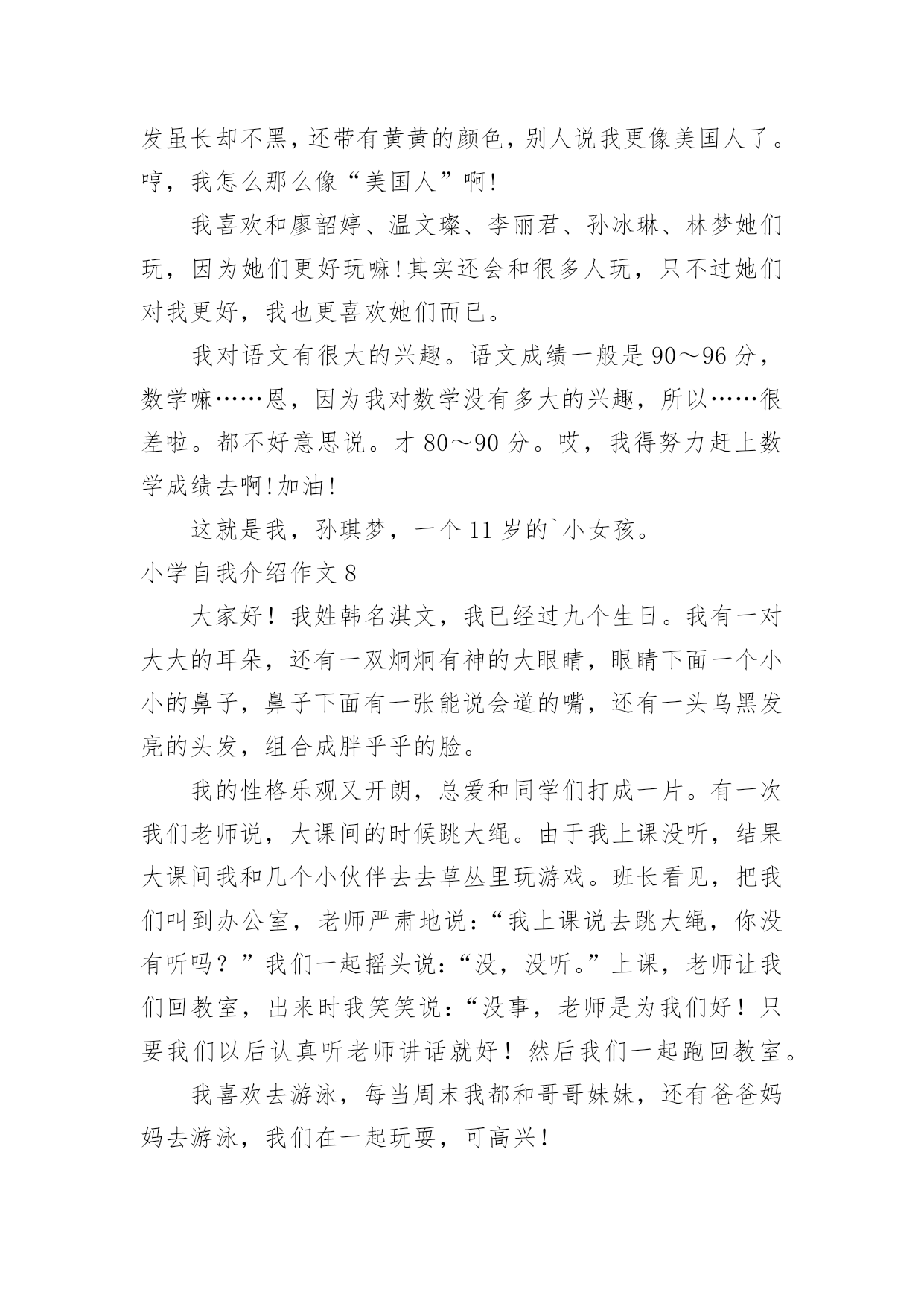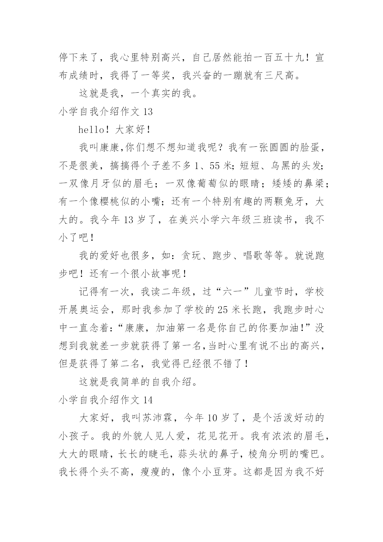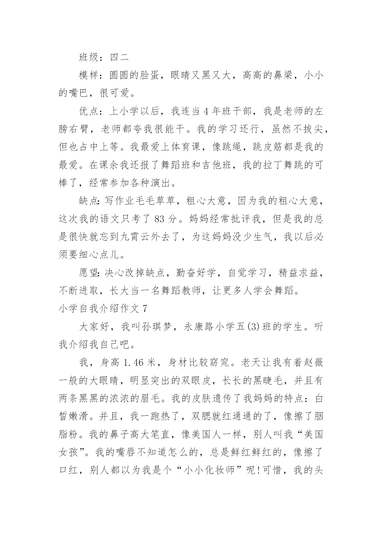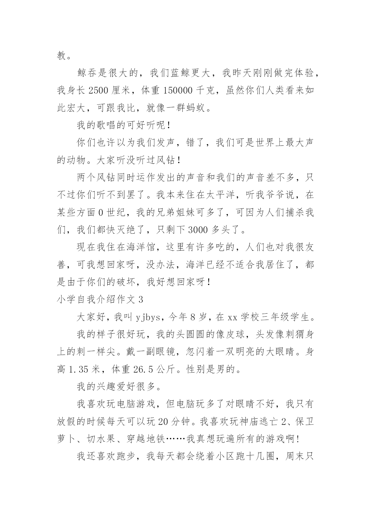 小学自我介绍作文小学自我介绍作文(汇编15篇)当去到一个新环境下,时常需要用到自我介绍,用自我介绍往往可以向他人介绍自己。你所见过的自我介绍是什么样的呢?下面是小编整理的小学自我介绍作文,欢迎阅读,希望大家能够喜欢。小学自我介绍作文1大家好,我是来自五乙班的张雅蓉,我今年十一岁,属羊。但是我的性格和羊有点相反,羊温和老实,而我却活泼好动,大胆能干还有一点点凶。从二年级起我一直担任班上的中队长,语文课代表,今年还有幸成为大队部的副队长,是老师的得力助手。我的兴趣爱好很广泛,我喜欢唱歌、画画、听音乐、摸索电脑,还喜欢旅游、照相和看书。我曾多次获得三好学生、四好少年的称号。还曾经获得过“雏鹰杯”绘画比赛优秀奖、优秀大队干部、书写大赛特等奖、学习小明星等等奖项。虽然我有很多优点,但是我也有很多缺点,那就是学习上不太努力,粗心,有时漏写,有时写错,书写不太美观。还有就是对自己要求不是很严格。今后,我决定要发扬优点,改正缺点。小学自我介绍作文2大家好,我是可爱的蓝鲸宝宝,今年十岁了,请多多指教。鲸吞是很大的,我们蓝鲸更大,我昨天刚刚做完体验,我身长2500厘米,体重150000千克,虽然你们人类看来如此宏大,可跟我比,就像一群蚂蚁。我的歌唱的可好听呢!你们也许以为我们发声,错了,我们可是世界上最大声的动物。大家听没听过风钻!两个风钻同时运作发出的声音和我们的声音差不多,只不过你们听不到罢了。我本来住在太平洋,听我爷爷说,在某些方面0世纪,我的兄弟姐妹可多了,可因为人们捕杀我们,我们都快灭绝了,只剩下3000多头了。现在我住在海洋馆,这里有许多吃的,人们也对我很友善,可我想回家呀,没办法,海洋已经不适合我居住了,都是由于你们的破坏,我好想回家呀!小学自我介绍作文3大家好,我叫yjbys,今年8岁,在xx学校三年级学生。我的样子很好玩,我的头圆圆的像皮球,头发像刺猬身上的刺一样尖。戴一副眼镜,忽闪着一双明亮的大眼睛。身高1.35米,体重26.5公斤。性别是男的。我的兴趣爱好很多。我喜欢玩电脑游戏,但电脑玩多了对眼睛不好,我只有放假的时候每天可以玩20分钟。我喜欢玩神庙逃亡2、保卫萝卜、切水果、穿越地铁……我真想玩遍所有的游戏啊!我还喜欢跑步,我每天都会绕着小区跑十几圈,周末只要一有时间我就会去红日广场跑步。我不仅爱跑步,还跑得很快呢!有一次,我们比赛跑步,一圈400米,一共跑12圈,我还是第一名呢!我最喜欢和小朋友玩,每天中午我都会和小朋友在小区里玩。我们玩扔沙包、魔鬼大将、格兵、躲猫猫……我性格开朗,喜欢和人交朋友。大家想和我交朋友吗?小学自我介绍作文4大家好!我叫莫xx,大家叫我xx吧,我今年七岁了,是入校的一年级新生。我的身高差不多有1.4米,体重大概有30公斤,我长着标准的瓜子小脸,炯炯有神的眼睛,上课专心听老师讲的每堂课。我们家庭成员有6口人,有爷爷、奶奶、爸爸、妈妈、哥哥和我,我的大哥哥已经上高中三年级了,正刻苦用功的学习,明年就是一名快乐的大学生了。我的性格活波开朗,喜欢和小朋友一起做游戏,我喜欢画画和游泳,画幅漂亮的孔雀开屏,美丽的孔雀展开五光十色的大尾巴,向人们展示自己的美丽。每周要去游泳三次,我很厉害呃,每次能游30分钟,妈妈说游泳能锻炼身体,我一定要坚持做个快乐健康的小学生。我的优点是喜欢阅读,喜欢读书是个好习惯,多读书能开阔我们的视野,能使自己变得更强大。有时候也会有一些小缺点,比如写完作业要及时的整理好书包。我的理想是长大了想当一名科学家,研究有助于人类发展的研究,让人们更健康、快乐的生活。小学自我介绍作文5大家好,我叫胡渭佳,今年六岁半。我有一头长长的头发,圆圆的脸,大大的眼睛,小小的嘴,就是皮肤有点黑,可是奶奶说,黑了健康。我的性格善良,乐于助人,喜欢帮助同学和朋友。我的爸爸妈妈都是解放军,爷爷是飞行员,奶奶是音乐老师,他们都很爱我。我还有一个最好的朋友叫张凌寒,他是一个男孩子,我们经常一起出去郊游。我的爱好是弹钢琴,轮滑,画画,看书、旅游。我去过很多的地方,有北京、哈尔滨、沈阳、北戴河、青岛、武汉、南京、广州、深圳、珠海……今年,爸爸还答应带我去上海迪斯尼呢。我还喜欢弹钢琴,而且我已经得了比赛二等奖,钢琴五级也考了优秀。我最喜欢看书,因为可以看到很多很搞笑的故事,比如《游戏中的科学》、《365页故事》、《十万个为什么》。我喜欢编故事,编儿歌,下面我给大家朗诵一首:快乐在哪里,要问你自己,在你心里找到它,每天笑嘻嘻!谢谢大家!小学自我介绍作文6自我介绍姓名:李菡茵性别:女年龄:9岁学校:瞿阳三小班级:四二模样:圆圆的脸蛋,眼睛又黑又大,高高的鼻梁,小小的嘴巴,很可爱。优点:上小学以后,我连当4年班干部,我是老师的左膀右臂,老师都夸我很能干。我的学习还行,虽然不拔尖,但也占中上等。我最爱上体育课,像跳绳,跳皮筋