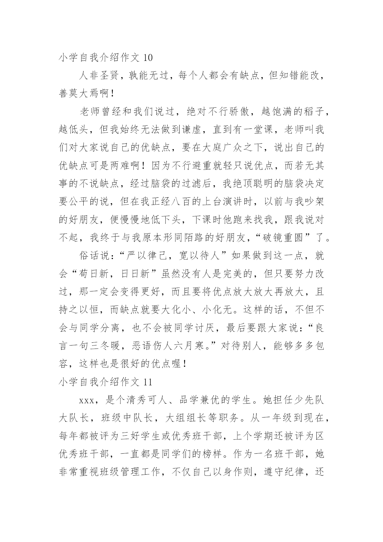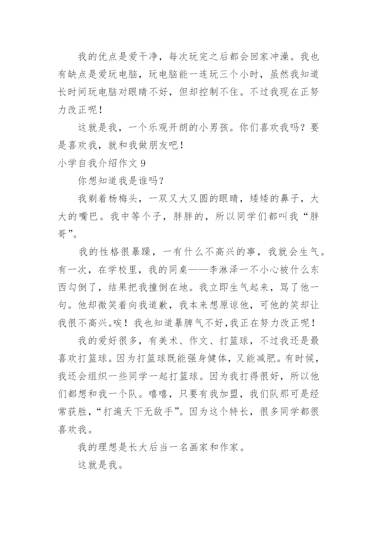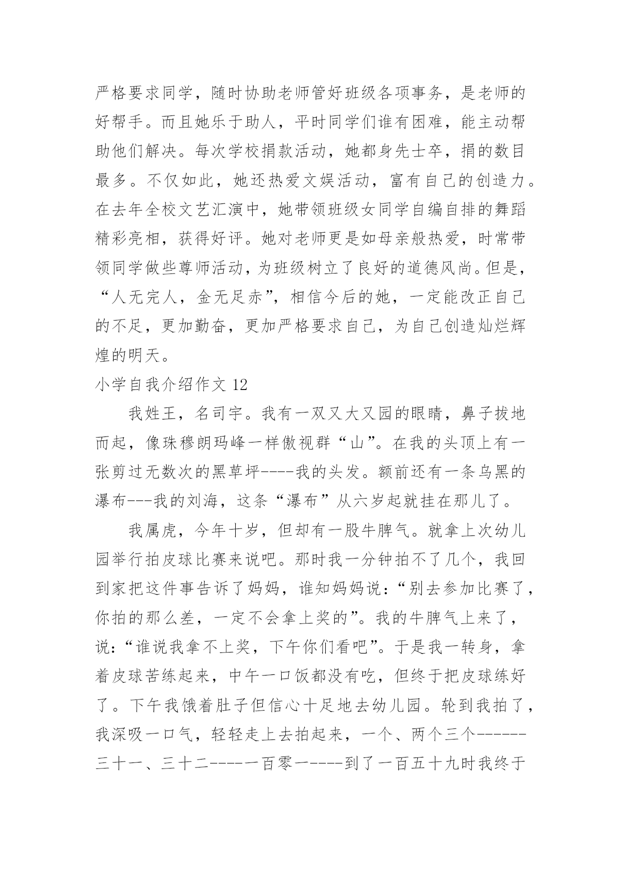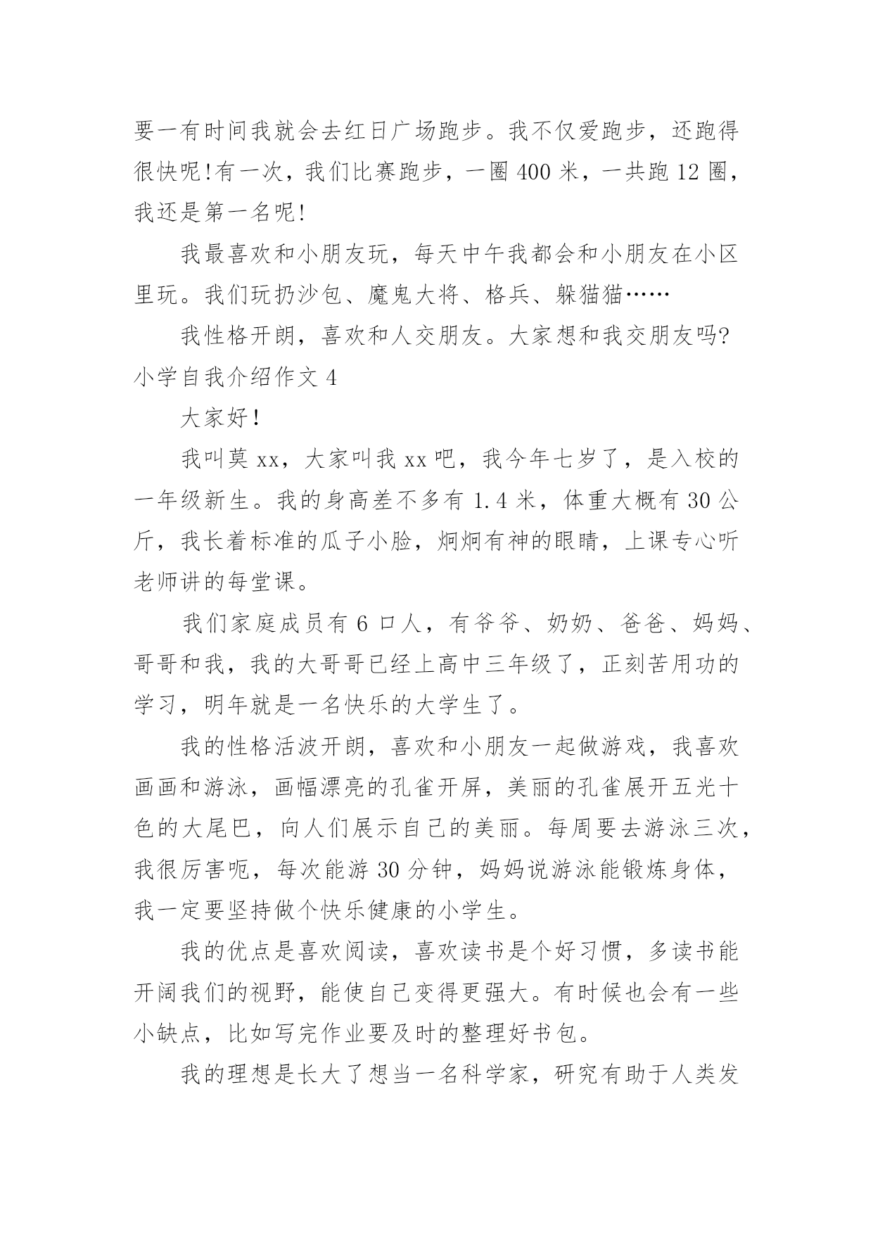 小学自我介绍作文小学自我介绍作文(汇编15篇)当去到一个新环境下,时常需要用到自我介绍,用自我介绍往往可以向他人介绍自己。你所见过的自我介绍是什么样的呢?下面是小编整理的小学自我介绍作文,欢迎阅读,希望大家能够喜欢。小学自我介绍作文1大家好,我是来自五乙班的张雅蓉,我今年十一岁,属羊。但是我的性格和羊有点相反,羊温和老实,而我却活泼好动,大胆能干还有一点点凶。从二年级起我一直担任班上的中队长,语文课代表,今年还有幸成为大队部的副队长,是老师的得力助手。我的兴趣爱好很广泛,我喜欢唱歌、画画、听音乐、摸索电脑,还喜欢旅游、照相和看书。我曾多次获得三好学生、四好少年的称号。还曾经获得过“雏鹰杯”绘画比赛优秀奖、优秀大队干部、书写大赛特等奖、学习小明星等等奖项。虽然我有很多优点,但是我也有很多缺点,那就是学习上不太努力,粗心,有时漏写,有时写错,书写不太美观。还有就是对自己要求不是很严格。今后,我决定要发扬优点,改正缺点。小学自我介绍作文2大家好,我是可爱的蓝鲸宝宝,今年十岁了,请多多指教。鲸吞是很大的,我们蓝鲸更大,我昨天刚刚做完体验,我身长2500厘米,体重150000千克,虽然你们人类看来如此宏大,可跟我比,就像一群蚂蚁。我的歌唱的可好听呢!你们也许以为我们发声,错了,我们可是世界上最大声的动物。大家听没听过风钻!两个风钻同时运作发出的声音和我们的声音差不多,只不过你们听不到罢了。我本来住在太平洋,听我爷爷说,在某些方面0世纪,我的兄弟姐妹可多了,可因为人们捕杀我们,我们都快灭绝了,只剩下3000多头了。现在我住在海洋馆,这里有许多吃的,人们也对我很友善,可我想回家呀,没办法,海洋已经不适合我居住了,都是由于你们的破坏,我好想回家呀!小学自我介绍作文3大家好,我叫yjbys,今年8岁,在xx学校三年级学生。我的样子很好玩,我的头圆圆的像皮球,头发像刺猬身上的刺一样尖。戴一副眼镜,忽闪着一双明亮的大眼睛。身高1.35米,体重26.5公斤。性别是男的。我的兴趣爱好很多。我喜欢玩电脑游戏,但电脑玩多了对眼睛不好,我只有放假的时候每天可以玩20分钟。我喜欢玩神庙逃亡2、保卫萝卜、切水果、穿越地铁……我真想玩遍所有的游戏啊!我还喜欢跑步,我每天都会绕着小区跑十几圈,周末只要一有时间我就会去红日广场跑步。我不仅爱跑步,还跑得很快呢!有一次,我们比赛跑步,一圈400米,一共跑12圈,我还是第一名呢!我最喜欢和小朋友玩,每天中午我都会和小朋友在小区里玩。我们玩扔沙包、魔鬼大将、格兵、躲猫猫……我性格开朗,喜欢和人交朋友。大家想和我交朋友吗?小学自我介绍作文4大家好!我叫莫xx,大家叫我xx吧,我今年七岁了,是入校的一年级新生。我的身高差不多有1.4米,体重大概有30公斤,我长着标准的瓜子小脸,炯炯有神的眼睛,上课专心听老师讲的每堂课。我们家庭成员有6口人,有爷爷、奶奶、爸爸、妈妈、哥哥和我,我的大哥哥已经上高中三年级了,正刻苦用功的学习,明年就是一名快乐的大学生了。我的性格活波开朗,喜欢和小朋友一起做游戏,我喜欢画画和游泳,画幅漂亮的孔雀开屏,美丽的孔雀展开五光十色的大尾巴,向人们展示自己的美丽。每周要去游泳三次,我很厉害呃,每次能游30分钟,妈妈说游泳能锻炼身体,我一定要坚持做个快乐健康的小学生。我的优点是喜欢阅读,喜欢读书是个好习惯,多读书能开阔我们的视野,能使自己变得更强大。有时候也会有一些小缺点,比如写完作业要及时的整理好书包。我的理想是长大了想当一名科学家,研究有助于人类发展的研究,让人们更健康、快乐的生活。小学自我介绍作文5大家好,我叫胡渭佳,今年六岁半。我有一头长长的头发,圆圆的脸,大大的眼睛,小小的嘴,就是皮肤有点黑,可是奶奶说,黑了健康。我的性格善良,乐于助人,喜欢帮助同学和朋友。我的爸爸妈妈都是解放军,爷爷是飞行员,奶奶是音乐老师,他们都很爱我。我还有一个最好的朋友叫张凌寒,他是一个男孩子,我们经常一起出去郊游。我的爱好是弹钢琴,轮滑,画画,看书、旅游。我去过很多的地方,有北京、哈尔滨、沈阳、北戴河、青岛、武汉、南京、广州、深圳、珠海……今年,爸爸还答应带我去上海迪斯尼呢。我还喜欢弹钢琴,而且我已经得了比赛二等奖,钢琴五级也考了优秀。我最喜欢看书,因为可以看到很多很搞笑的故事,比如《游戏中的科学》、《365页故事》、《十万个为什么》。我喜欢编故事,编儿歌,下面我给大家朗诵一首:快乐在哪里,要问你自己,在你心里找到它,每天笑嘻嘻!谢谢大家!小学自我介绍作文6自我介绍姓名:李菡茵性别:女年龄:9岁学校:瞿阳三小班级:四二模样:圆圆的脸蛋,眼睛又黑又大,高高的鼻梁,小小的嘴巴,很可爱。优点:上小学以后,我连当4年班干部,我是老师的左膀右臂,老师都夸我很能干。我的学习还行,虽然不拔尖,但也占中上等。我最爱上体育课,像跳绳,跳皮筋