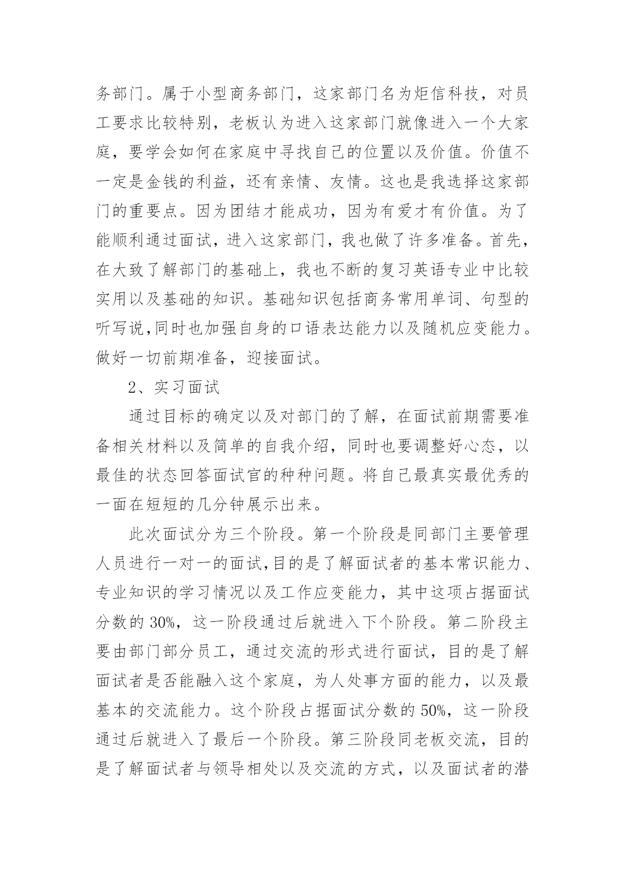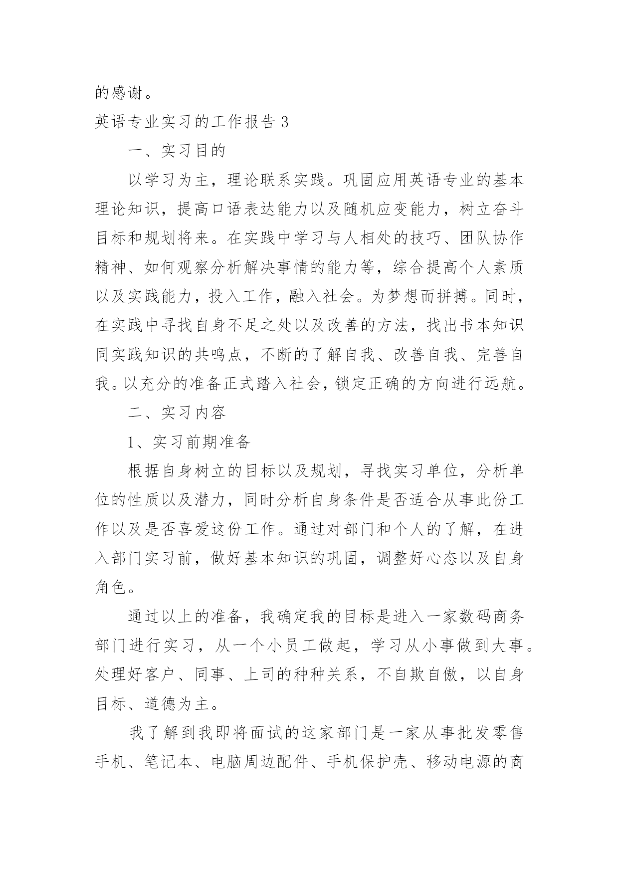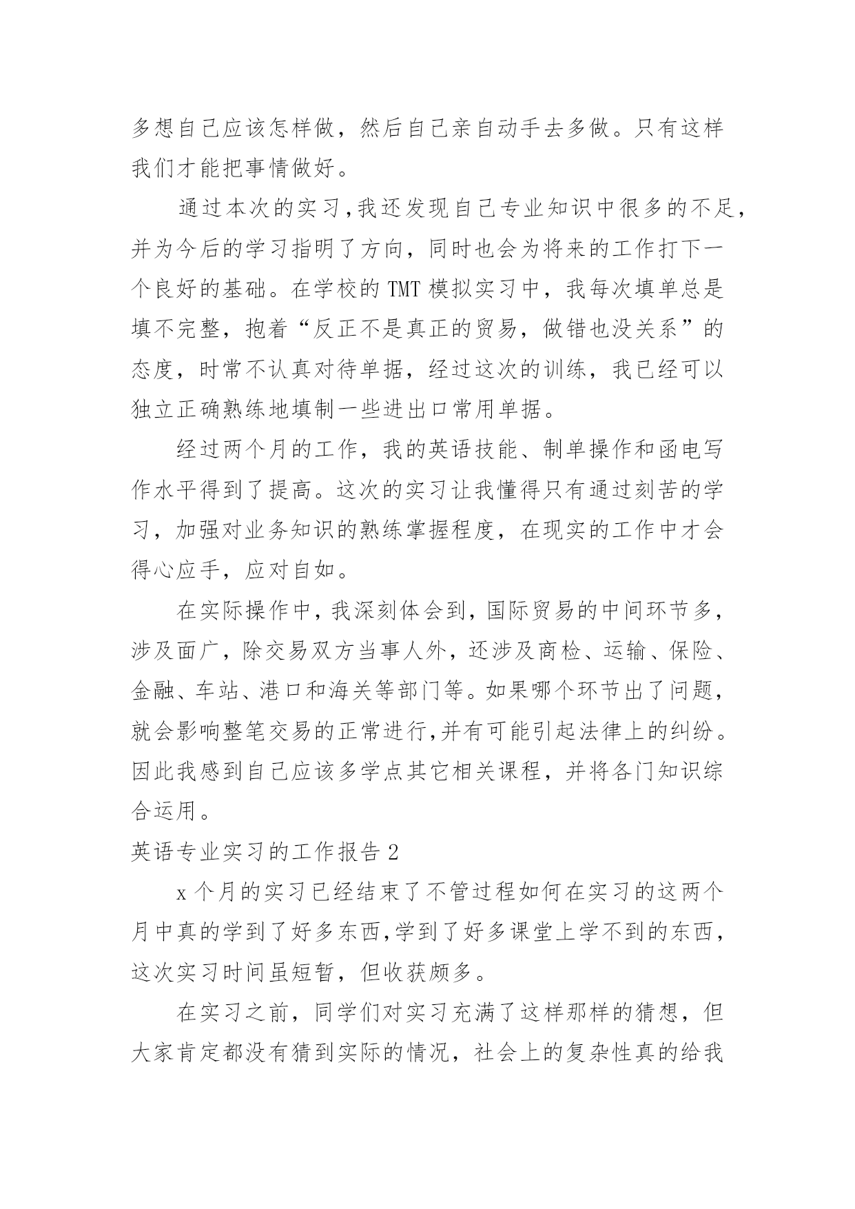 英语专业实习的工作报告英语专业实习的工作报告我们眼下的社会,报告的适用范围越来越广泛,报告中涉及到专业性术语要解释清楚。那么一般报告是怎么写的呢?以下是小编帮大家整理的英语专业实习的工作报告,希望对大家有所帮助。英语专业实习的工作报告1时间过的很快,为期三个月的实习结束了。在这段时间里,实习充实了我的学习生活,我学到了许多书本上无法体验的知识。通过实习,我感触颇多,得到许多新的认识,对许多问题多了深一层次的思考。回想起这两个月的生活,一个人在新的环境里,应付新的人际关系,本来就是挺辛苦的事,再加上工作的繁忙和紧张的生活节奏,这两个月来真可以用艰辛来形容了。还好这一切我都挺了过来,相反这些困难让我更加的了解自己、坚定信心,也让我从中得到了深刻的认识。以后我就是社会上的一份子了,责任也将越来越重。实习,顾名思义,在实践中学习。在经过一段时间的学习之后,或者说当学习告一段落的时候,我们需要了解,自己的所学需要或应当如何应用在实践之中,因为任何知识都源于实践,归于实践,所以,要将所学付诸实践,来检验所学。然而,我们当然不希望实习仅止于此,那就太狭隘了。(1)坚持学以致用我的工作是在公司的商务部见习外贸业务。外贸业务员,算是与专业对口工作的不二选择了,而且我们曾于大三进行过TMT模拟实习,对外贸流程有一定的了解。然而经过在商务部一段时间的工作,我渐渐明白有时实际要比理论简单直接的多,但大多数情况下实际操作还是比理论要复杂、间接,通常是我在别人的实际操作中领会到了自己所学理论的重点及要旨。值得庆幸的是在两个月的'时间里,公司的同事领导给予了我热情的指导和帮助,而我也虚心向他们请教学习,在理论运用于实践的同时,也在实践中更加深刻地理解了以前没有理解透彻的知识。(2)加强英语及专业知识的学习对于外贸人员而言,不仅要掌握够硬的专业知识,而且还必须会用英语与外商交流、谈判及写传真、书信。如果专业英语知识掌握不好,就很难胜任工作,甚至会影响业务的顺利进行。因此,在实习中要求我们加强英语的学习,掌握外贸专业术语基础。(3)要有坚持不懈的精神作为在校生,我们不管到哪家公司,一开始都不会给我们布置过多的工作任务,一般都是先让我们熟悉公司的工作环境,在这段时间里很多人会觉得很无聊,没事可做,便会产生离开的念头。在这个时候我们一定要坚持,不能轻易放弃。再者,在外工作不比在家里或者学校,做的不好挨批是正常的事,承受能力差的同学很容易放弃。这时我们要直面问题,如果是自己的失误,一定要改正错误,吸取经验,争取不再犯;如果不是自己的责任也不要和上司顶嘴,领导有比我们更大的压力,他工作不顺心总要找个方式释放。走上社会,要学着“宰相肚里能撑船”,成大事者心中必能纳百川。我只身一人在外工作,刚开始的几天觉得工作无聊,再加上想家的情绪“作祟”,真的有过放弃的念头,但是转念一想,我已经把行李带过来了,绝不能就这样回去,不能做一个逃兵,于是我坚持下来了,三个月,两个月……通过了这段时间的磨练,再加上四年远离家乡的大学生活,我的独立性越来越强。我相信,以后不管走到哪里,我能很快地适应新的环境,这对于我自身是一项难能可贵的技能。(4)要虚心学习,不耻下问在工作过程中,我们肯定会碰到很多的问题,有很多是我们所不懂的,不懂的东西我们就要虚心向同事请教。同时,我们也不要怕犯错。每一个人都有犯错的时候,工作中第一次做错了不要紧,重要的是知错能改。如此循序渐进,一定能够得到实质上的提高。(5)要确立明确的目标,并端正自己的态度平时,我们不管做什么事,都要明确自己的目标,到公司工作以后,要知道自己能否胜任这份工作,关键是看你自己对待工作的态度,态度对了,即使自己以前没学过的知识也可以在工作中逐渐的掌握。因此,要树立正确的目标,在实现目标的过程中一定要多看别人怎样做,多听别人怎样说,多想自己应该怎样做,然后自己亲自动手去多做。只有这样我们才能把事情做好。通过本次的实习,我还发现自己专业知识中很多的不足,并为今后的学习指明了方向,同时也会为将来的工作打下一个良好的基础。在学校的TMT模拟实习中,我每次填单总是填不完整,抱着“反正不是真正的贸易,做错也没关系”的态度,时常不认真对待单据,经过这次的训练,我已经可以独立正确熟练地填制一些进出口常用单据。经过两个月的工作,我的英语技能、制单操作和函电写作水平得到了提高。这次的实习让我懂得只有通过刻苦的学习,加强对业务知识的熟练掌握程度,在现实的工作中才会得心应手,应对自如。在实际操作中,我深刻体会到,国际贸易的中间环节多,涉及面广,除交易双方当事人外,还涉及商检、运输、保险、金融、车站、港口和海关等部门等。如果哪个环节出了问题,就会影响整笔交易的正常进行,并有可能引起法律上的纠纷。因此我感到自己应该多学点其它相关课程,并将各门知识综合运用。英语专业实