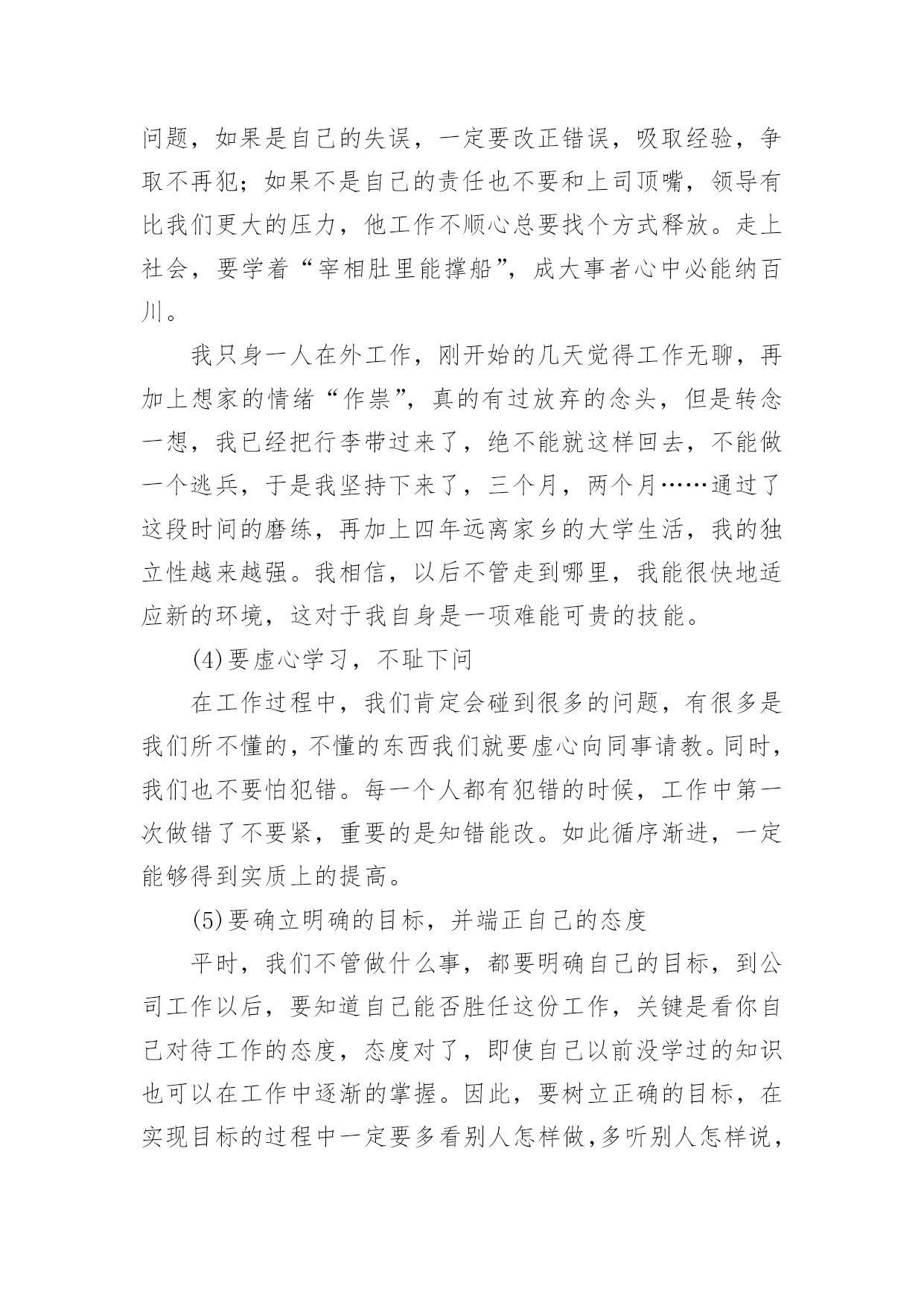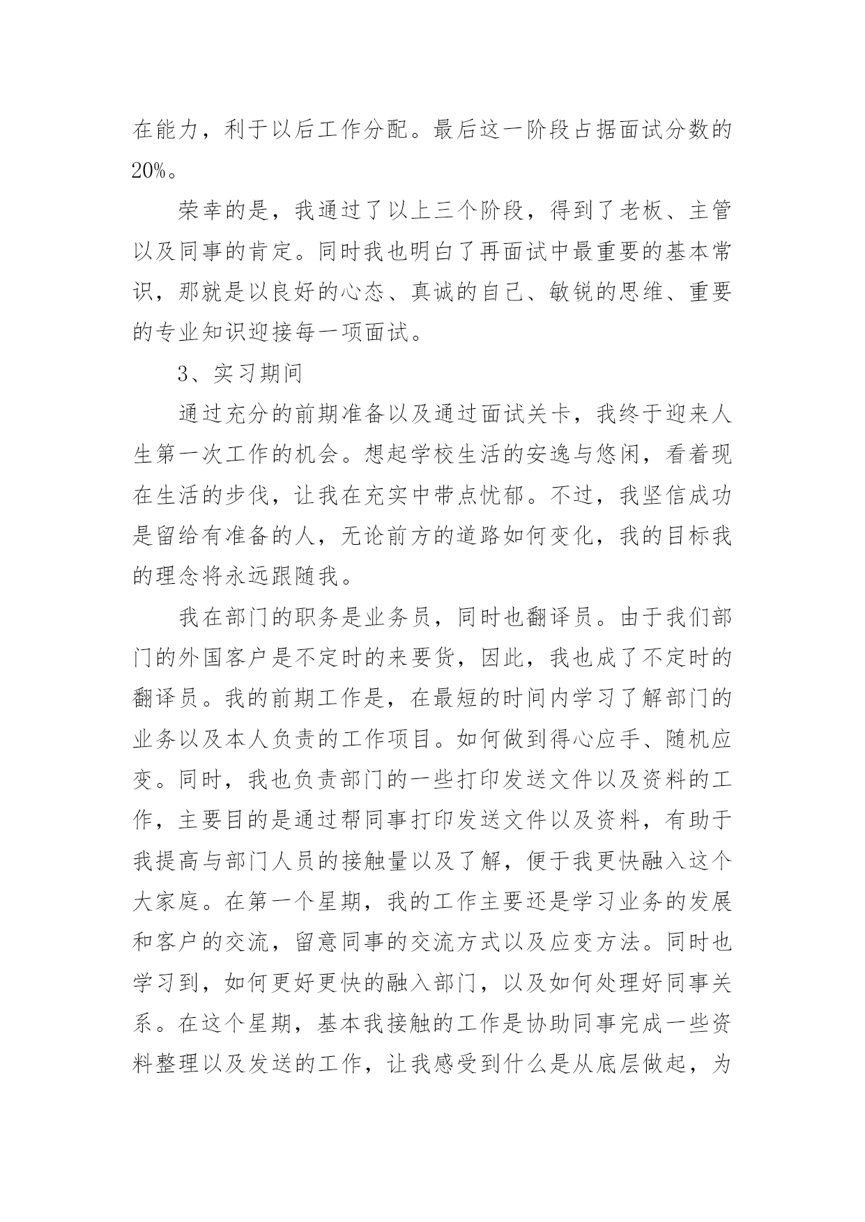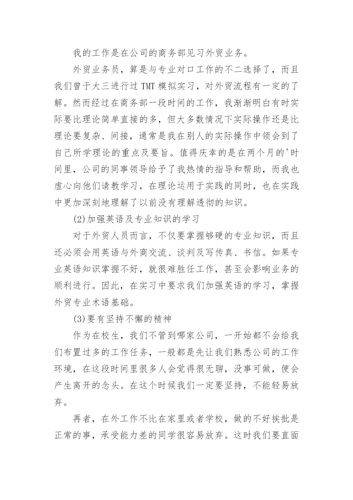 英语专业实习的工作报告英语专业实习的工作报告我们眼下的社会,报告的适用范围越来越广泛,报告中涉及到专业性术语要解释清楚。那么一般报告是怎么写的呢?以下是小编帮大家整理的英语专业实习的工作报告,希望对大家有所帮助。英语专业实习的工作报告1时间过的很快,为期三个月的实习结束了。在这段时间里,实习充实了我的学习生活,我学到了许多书本上无法体验的知识。通过实习,我感触颇多,得到许多新的认识,对许多问题多了深一层次的思考。回想起这两个月的生活,一个人在新的环境里,应付新的人际关系,本来就是挺辛苦的事,再加上工作的繁忙和紧张的生活节奏,这两个月来真可以用艰辛来形容了。还好这一切我都挺了过来,相反这些困难让我更加的了解自己、坚定信心,也让我从中得到了深刻的认识。以后我就是社会上的一份子了,责任也将越来越重。实习,顾名思义,在实践中学习。在经过一段时间的学习之后,或者说当学习告一段落的时候,我们需要了解,自己的所学需要或应当如何应用在实践之中,因为任何知识都源于实践,归于实践,所以,要将所学付诸实践,来检验所学。然而,我们当然不希望实习仅止于此,那就太狭隘了。(1)坚持学以致用我的工作是在公司的商务部见习外贸业务。外贸业务员,算是与专业对口工作的不二选择了,而且我们曾于大三进行过TMT模拟实习,对外贸流程有一定的了解。然而经过在商务部一段时间的工作,我渐渐明白有时实际要比理论简单直接的多,但大多数情况下实际操作还是比理论要复杂、间接,通常是我在别人的实际操作中领会到了自己所学理论的重点及要旨。值得庆幸的是在两个月的'时间里,公司的同事领导给予了我热情的指导和帮助,而我也虚心向他们请教学习,在理论运用于实践的同时,也在实践中更加深刻地理解了以前没有理解透彻的知识。(2)加强英语及专业知识的学习对于外贸人员而言,不仅要掌握够硬的专业知识,而且还必须会用英语与外商交流、谈判及写传真、书信。如果专业英语知识掌握不好,就很难胜任工作,甚至会影响业务的顺利进行。因此,在实习中要求我们加强英语的学习,掌握外贸专业术语基础。(3)要有坚持不懈的精神作为在校生,我们不管到哪家公司,一开始都不会给我们布置过多的工作任务,一般都是先让我们熟悉公司的工作环境,在这段时间里很多人会觉得很无聊,没事可做,便会产生离开的念头。在这个时候我们一定要坚持,不能轻易放弃。再者,在外工作不比在家里或者学校,做的不好挨批是正常的事,承受能力差的同学很容易放弃。这时我们要直面问题,如果是自己的失误,一定要改正错误,吸取经验,争取不再犯;如果不是自己的责任也不要和上司顶嘴,领导有比我们更大的压力,他工作不顺心总要找个方式释放。走上社会,要学着“宰相肚里能撑船”,成大事者心中必能纳百川。我只身一人在外工作,刚开始的几天觉得工作无聊,再加上想家的情绪“作祟”,真的有过放弃的念头,但是转念一想,我已经把行李带过来了,绝不能就这样回去,不能做一个逃兵,于是我坚持下来了,三个月,两个月……通过了这段时间的磨练,再加上四年远离家乡的大学生活,我的独立性越来越强。我相信,以后不管走到哪里,我能很快地适应新的环境,这对于我自身是一项难能可贵的技能。(4)要虚心学习,不耻下问在工作过程中,我们肯定会碰到很多的问题,有很多是我们所不懂的,不懂的东西我们就要虚心向同事请教。同时,我们也不要怕犯错。每一个人都有犯错的时候,工作中第一次做错了不要紧,重要的是知错能改。如此循序渐进,一定能够得到实质上的提高。(5)要确立明确的目标,并端正自己的态度平时,我们不管做什么事,都要明确自己的目标,到公司工作以后,要知道自己能否胜任这份工作,关键是看你自己对待工作的态度,态度对了,即使自己以前没学过的知识也可以在工作中逐渐的掌握。因此,要树立正确的目标,在实现目标的过程中一定要多看别人怎样做,多听别人怎样说,多想自己应该怎样做,然后自己亲自动手去多做。只有这样我们才能把事情做好。通过本次的实习,我还发现自己专业知识中很多的不足,并为今后的学习指明了方向,同时也会为将来的工作打下一个良好的基础。在学校的TMT模拟实习中,我每次填单总是填不完整,抱着“反正不是真正的贸易,做错也没关系”的态度,时常不认真对待单据,经过这次的训练,我已经可以独立正确熟练地填制一些进出口常用单据。经过两个月的工作,我的英语技能、制单操作和函电写作水平得到了提高。这次的实习让我懂得只有通过刻苦的学习,加强对业务知识的熟练掌握程度,在现实的工作中才会得心应手,应对自如。在实际操作中,我深刻体会到,国际贸易的中间环节多,涉及面广,除交易双方当事人外,还涉及商检、运输、保险、金融、车站、港口和海关等部门等。如果哪个环节出了问题,就会影响整笔交易的正常进行,并有可能引起法律上的纠纷。因此我感到自己应该多学点其它相关课程,并将各门知识综合运用。英语专业实