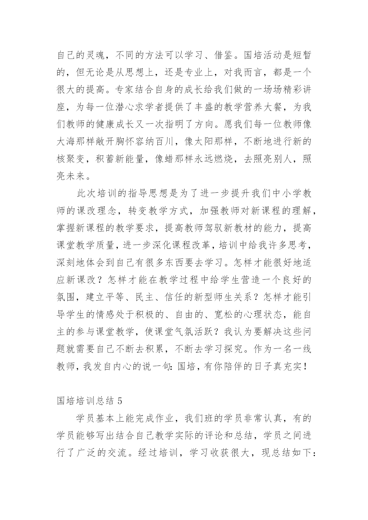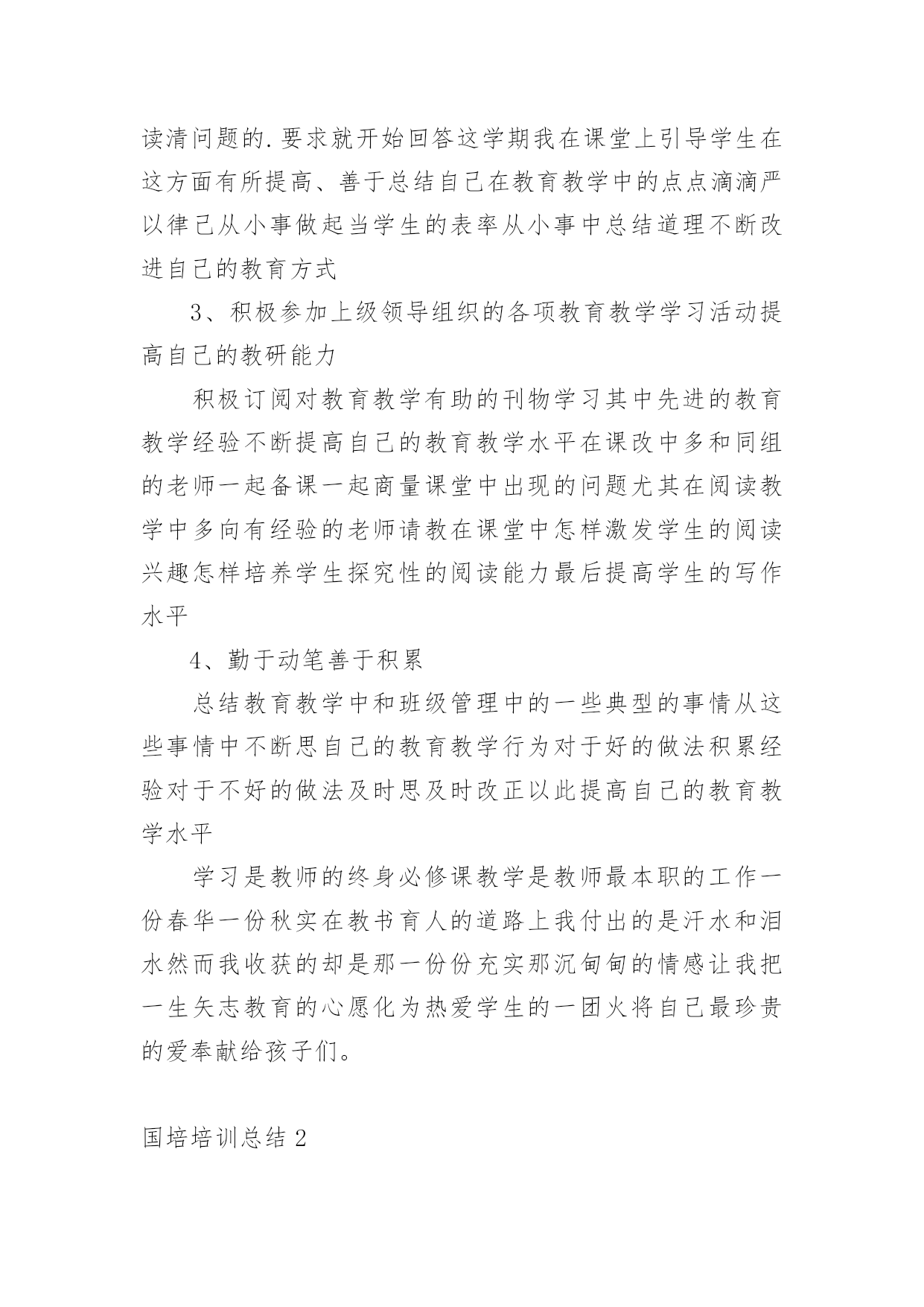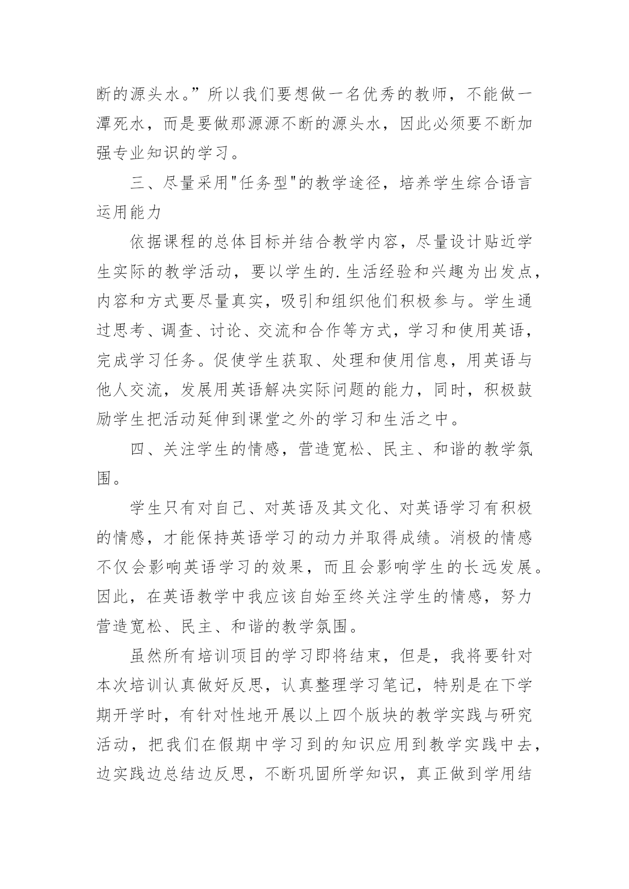 国培培训总结总结是在一段时间内对学习和工作生活等表现加以总结和概括的一种书面材料,通过它可以全面地、系统地了解以往的学习和工作情况,让我们抽出时间写写总结吧。总结你想好怎么写了吗?下面是小编帮大家整理的国培培训总结,欢迎大家分享。国培培训总结1本学年学校从师德教育、基本功技能提高训练、现代信息技术学习、新课程理念、教育的艺术以及教育科研能力培养等诸多方面对全校教师进行了培训现将我的参训收获和体会小结如下:1、在业务方面我树立优良学风刻苦钻研业务不断学习新知识探索教育教学新规律钻研教材写好每一个礁上好每一堂课多听同组同事的课多学习别人的优点和长处另外为业余时间多学习信息技术适应现代教学的要求2、在课改的课堂教学中不断探索适合学生愉悦学习的好的教学模式向同组的老师学习先进教学方法尤其在阅读教学中我注意学习其他老师的先进经验让学生在朗读中感悟提高阅读能力、培养学生课堂上会静下心来思考的能力有些同学的特点是比较浮躁在问题面前不知从哪儿下手回答甚至没有读清问题的.要求就开始回答这学期我在课堂上引导学生在这方面有所提高、善于总结自己在教育教学中的点点滴滴严以律己从小事做起当学生的表率从小事中总结道理不断改进自己的教育方式3、积极参加上级领导组织的各项教育教学学习活动提高自己的教研能力积极订阅对教育教学有助的刊物学习其中先进的教育教学经验不断提高自己的教育教学水平在课改中多和同组的老师一起备课一起商量课堂中出现的问题尤其在阅读教学中多向有经验的老师请教在课堂中怎样激发学生的阅读兴趣怎样培养学生探究性的阅读能力最后提高学生的写作水平4、勤于动笔善于积累总结教育教学中和班级管理中的一些典型的事情从这些事情中不断思自己的教育教学行为对于好的做法积累经验对于不好的做法及时思及时改正以此提高自己的教育教学水平学习是教师的终身必修课教学是教师最本职的工作一份春华一份秋实在教书育人的道路上我付出的是汗水和泪水然而我收获的却是那一份份充实那沉甸甸的情感让我把一生矢志教育的心愿化为热爱学生的一团火将自己最珍贵的爱奉献给孩子们。国培培训总结2回想任教近十年来,经历的培训也不少,可惟独这次培训给我留下了深刻的印象。这次甘肃省农村教师远程培训有编导对教材的精彩解读和分析;有课堂实录;还有耐人寻味无穷的经验之谈。从各位专家的亲身体验,从国内教育到国外理念,让我犹如呼吸到清新的空气,为之振奋!一、通过学习理论,不断应用实践。作为一名骨干教师,我努力把学习的理论知识转化为实践动能,使之有效地指导平时的英语教学工作。在培训过程中,我把自身对英语新课程标准的理解与组内的老师交流,并在课例跟进后,用新的练习设计理念指导我的教学,在不断总结的基础上重新发现,如此用心的循环往复,是因为培训班的课例研究让我从有力,变得更加有心。同时,我学会了变换角度审视自己的教育教学工作,在新理念的引领下,不断反思、调整我的教育观,正是这种换位思考,让我学会了信任学生,并不断地感受到信任带来的惊喜和力量。二、加强专业知识学习,做专业型教师。培训既紧张而忙碌,在培训中,我感受到了一种孜孜以求、学无止境的氛围。这种严谨实效的氛围,让每听一课我都认真准备,精心揣摩,通过网络便捷方式查阅相关资料,努力构建高效的教育教学活动。在实践过程中敢于迎接挑战,便也敢于创新。可以说,是培训激励了我的意志,启发了我的心智,让我更加执着地扑在初中英语的教育教学上。有句话说的好:“教师要想给学生一碗水,自己必须得有一桶水,甚至是源源不断的源头水。”所以我们要想做一名优秀的教师,不能做一潭死水,而是要做那源源不断的源头水,因此必须要不断加强专业知识的学习。三、尽量采用"任务型"的教学途径,培养学生综合语言运用能力依据课程的总体目标并结合教学内容,尽量设计贴近学生实际的教学活动,要以学生的.生活经验和兴趣为出发点,内容和方式要尽量真实,吸引和组织他们积极参与。学生通过思考、调查、讨论、交流和合作等方式,学习和使用英语,完成学习任务。促使学生获取、处理和使用信息,用英语与他人交流,发展用英语解决实际问题的能力,同时,积极鼓励学生把活动延伸到课堂之外的学习和生活之中。四、关注学生的情感,营造宽松、民主、和谐的教学氛围。学生只有对自己、对英语及其文化、对英语学习有积极的情感,才能保持英语学习的动力并取得成绩。消极的情感不仅会影响英语学习的效果,而且会影响学生的长远发展。因此,在英语教学中我应该自始至终关注学生的情感,努力营造宽松、民主、和谐的教学氛围。虽然所有培训项目的学习即将结束,但是,我将要针对本次培训认真做好反思,认真整理学习笔记,特别是在下学期开学时,有针对性地开展以上四个版块的教学实践与研究活动,把我们在假期中学习到的知识应用到教学实践中去,边实践边总结边反思,不断巩固所学知识,真正做到学用结合,联系实际,学以致用。国
