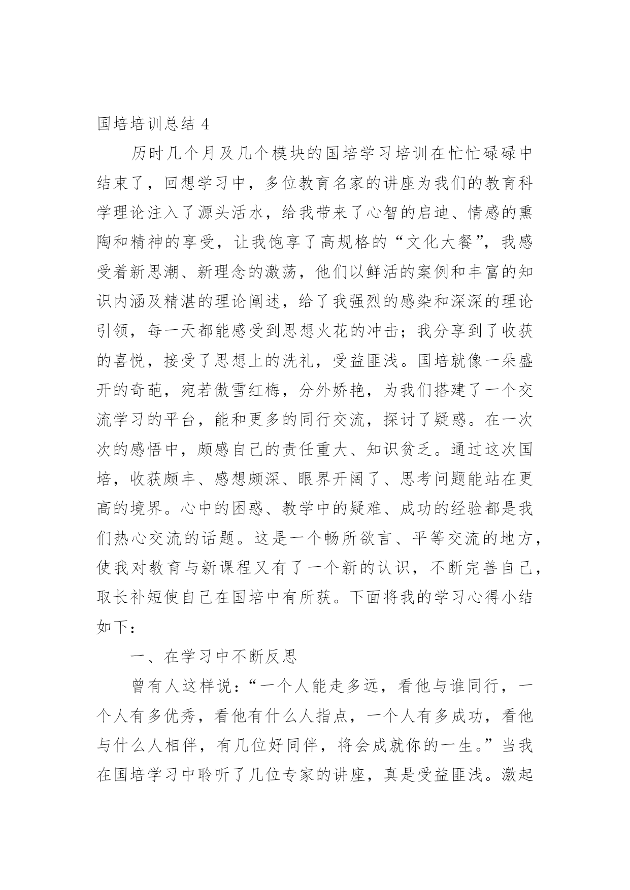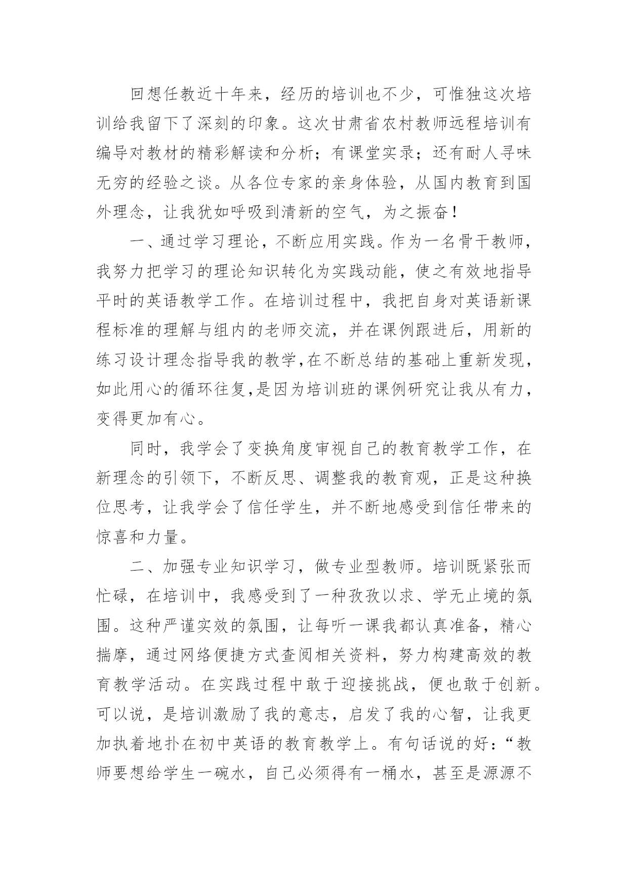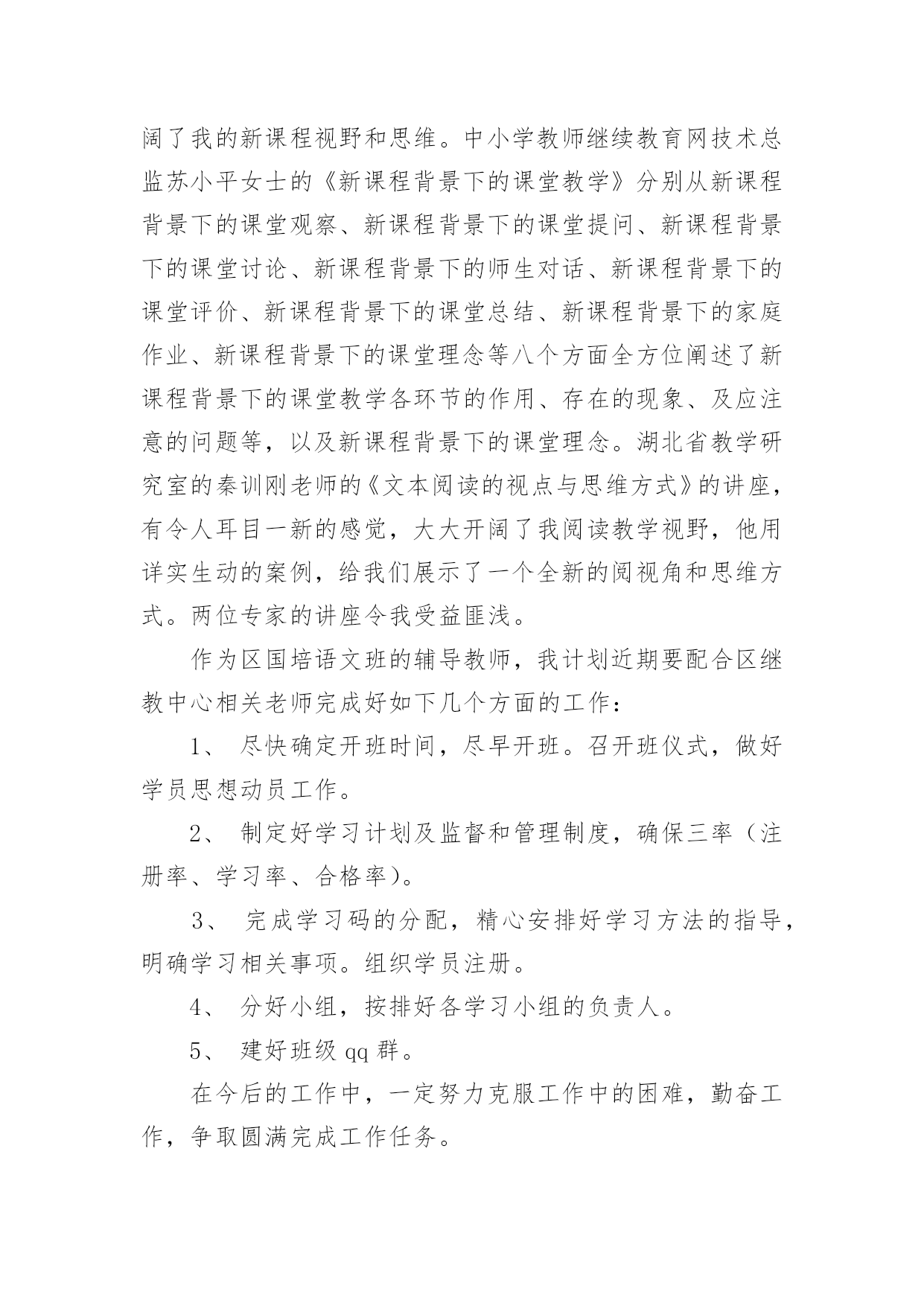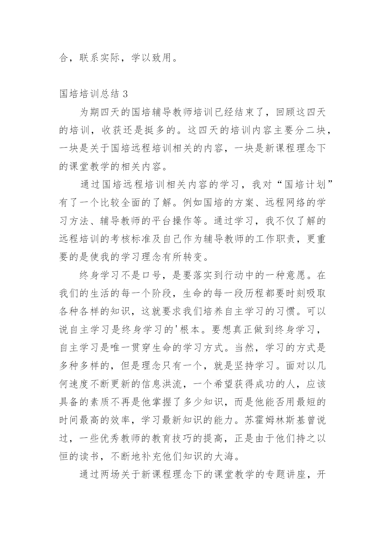 国培培训总结总结是在一段时间内对学习和工作生活等表现加以总结和概括的一种书面材料,通过它可以全面地、系统地了解以往的学习和工作情况,让我们抽出时间写写总结吧。总结你想好怎么写了吗?下面是小编帮大家整理的国培培训总结,欢迎大家分享。国培培训总结1本学年学校从师德教育、基本功技能提高训练、现代信息技术学习、新课程理念、教育的艺术以及教育科研能力培养等诸多方面对全校教师进行了培训现将我的参训收获和体会小结如下:1、在业务方面我树立优良学风刻苦钻研业务不断学习新知识探索教育教学新规律钻研教材写好每一个礁上好每一堂课多听同组同事的课多学习别人的优点和长处另外为业余时间多学习信息技术适应现代教学的要求2、在课改的课堂教学中不断探索适合学生愉悦学习的好的教学模式向同组的老师学习先进教学方法尤其在阅读教学中我注意学习其他老师的先进经验让学生在朗读中感悟提高阅读能力、培养学生课堂上会静下心来思考的能力有些同学的特点是比较浮躁在问题面前不知从哪儿下手回答甚至没有读清问题的.要求就开始回答这学期我在课堂上引导学生在这方面有所提高、善于总结自己在教育教学中的点点滴滴严以律己从小事做起当学生的表率从小事中总结道理不断改进自己的教育方式3、积极参加上级领导组织的各项教育教学学习活动提高自己的教研能力积极订阅对教育教学有助的刊物学习其中先进的教育教学经验不断提高自己的教育教学水平在课改中多和同组的老师一起备课一起商量课堂中出现的问题尤其在阅读教学中多向有经验的老师请教在课堂中怎样激发学生的阅读兴趣怎样培养学生探究性的阅读能力最后提高学生的写作水平4、勤于动笔善于积累总结教育教学中和班级管理中的一些典型的事情从这些事情中不断思自己的教育教学行为对于好的做法积累经验对于不好的做法及时思及时改正以此提高自己的教育教学水平学习是教师的终身必修课教学是教师最本职的工作一份春华一份秋实在教书育人的道路上我付出的是汗水和泪水然而我收获的却是那一份份充实那沉甸甸的情感让我把一生矢志教育的心愿化为热爱学生的一团火将自己最珍贵的爱奉献给孩子们。国培培训总结2回想任教近十年来,经历的培训也不少,可惟独这次培训给我留下了深刻的印象。这次甘肃省农村教师远程培训有编导对教材的精彩解读和分析;有课堂实录;还有耐人寻味无穷的经验之谈。从各位专家的亲身体验,从国内教育到国外理念,让我犹如呼吸到清新的空气,为之振奋!一、通过学习理论,不断应用实践。作为一名骨干教师,我努力把学习的理论知识转化为实践动能,使之有效地指导平时的英语教学工作。在培训过程中,我把自身对英语新课程标准的理解与组内的老师交流,并在课例跟进后,用新的练习设计理念指导我的教学,在不断总结的基础上重新发现,如此用心的循环往复,是因为培训班的课例研究让我从有力,变得更加有心。同时,我学会了变换角度审视自己的教育教学工作,在新理念的引领下,不断反思、调整我的教育观,正是这种换位思考,让我学会了信任学生,并不断地感受到信任带来的惊喜和力量。二、加强专业知识学习,做专业型教师。培训既紧张而忙碌,在培训中,我感受到了一种孜孜以求、学无止境的氛围。这种严谨实效的氛围,让每听一课我都认真准备,精心揣摩,通过网络便捷方式查阅相关资料,努力构建高效的教育教学活动。在实践过程中敢于迎接挑战,便也敢于创新。可以说,是培训激励了我的意志,启发了我的心智,让我更加执着地扑在初中英语的教育教学上。有句话说的好:“教师要想给学生一碗水,自己必须得有一桶水,甚至是源源不断的源头水。”所以我们要想做一名优秀的教师,不能做一潭死水,而是要做那源源不断的源头水,因此必须要不断加强专业知识的学习。三、尽量采用"任务型"的教学途径,培养学生综合语言运用能力依据课程的总体目标并结合教学内容,尽量设计贴近学生实际的教学活动,要以学生的.生活经验和兴趣为出发点,内容和方式要尽量真实,吸引和组织他们积极参与。学生通过思考、调查、讨论、交流和合作等方式,学习和使用英语,完成学习任务。促使学生获取、处理和使用信息,用英语与他人交流,发展用英语解决实际问题的能力,同时,积极鼓励学生把活动延伸到课堂之外的学习和生活之中。四、关注学生的情感,营造宽松、民主、和谐的教学氛围。学生只有对自己、对英语及其文化、对英语学习有积极的情感,才能保持英语学习的动力并取得成绩。消极的情感不仅会影响英语学习的效果,而且会影响学生的长远发展。因此,在英语教学中我应该自始至终关注学生的情感,努力营造宽松、民主、和谐的教学氛围。虽然所有培训项目的学习即将结束,但是,我将要针对本次培训认真做好反思,认真整理学习笔记,特别是在下学期开学时,有针对性地开展以上四个版块的教学实践与研究活动,把我们在假期中学习到的知识应用到教学实践中去,边实践边总结边反思,不断巩固所学知识,真正做到学用结合,联系实际,学以致用。国