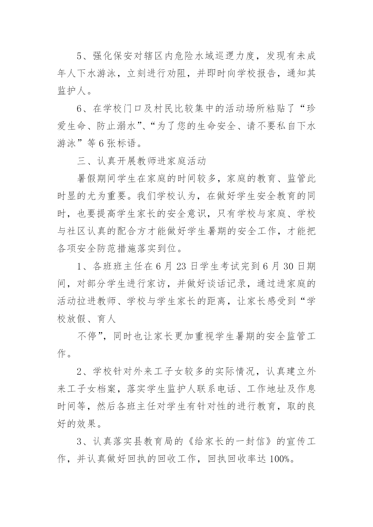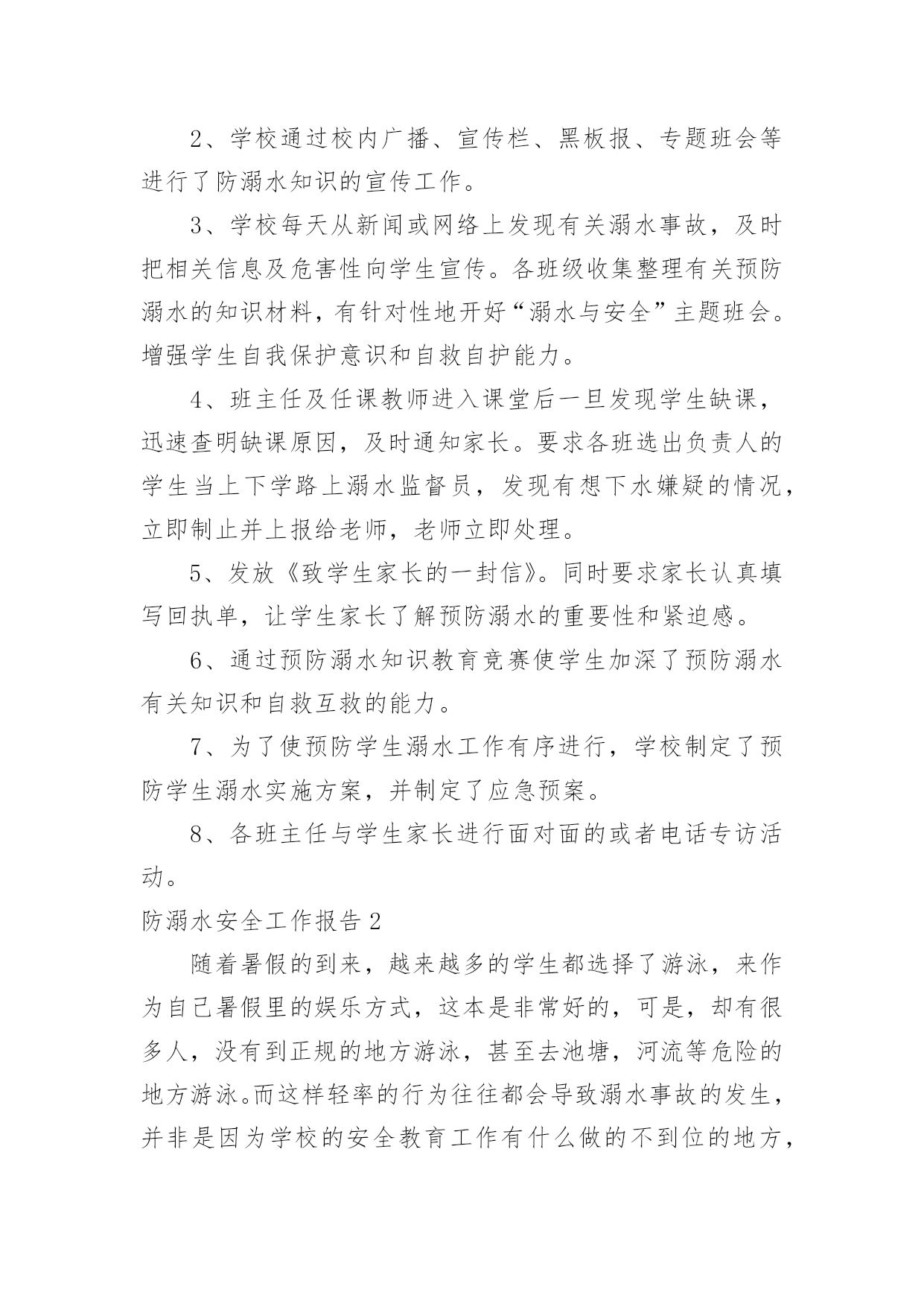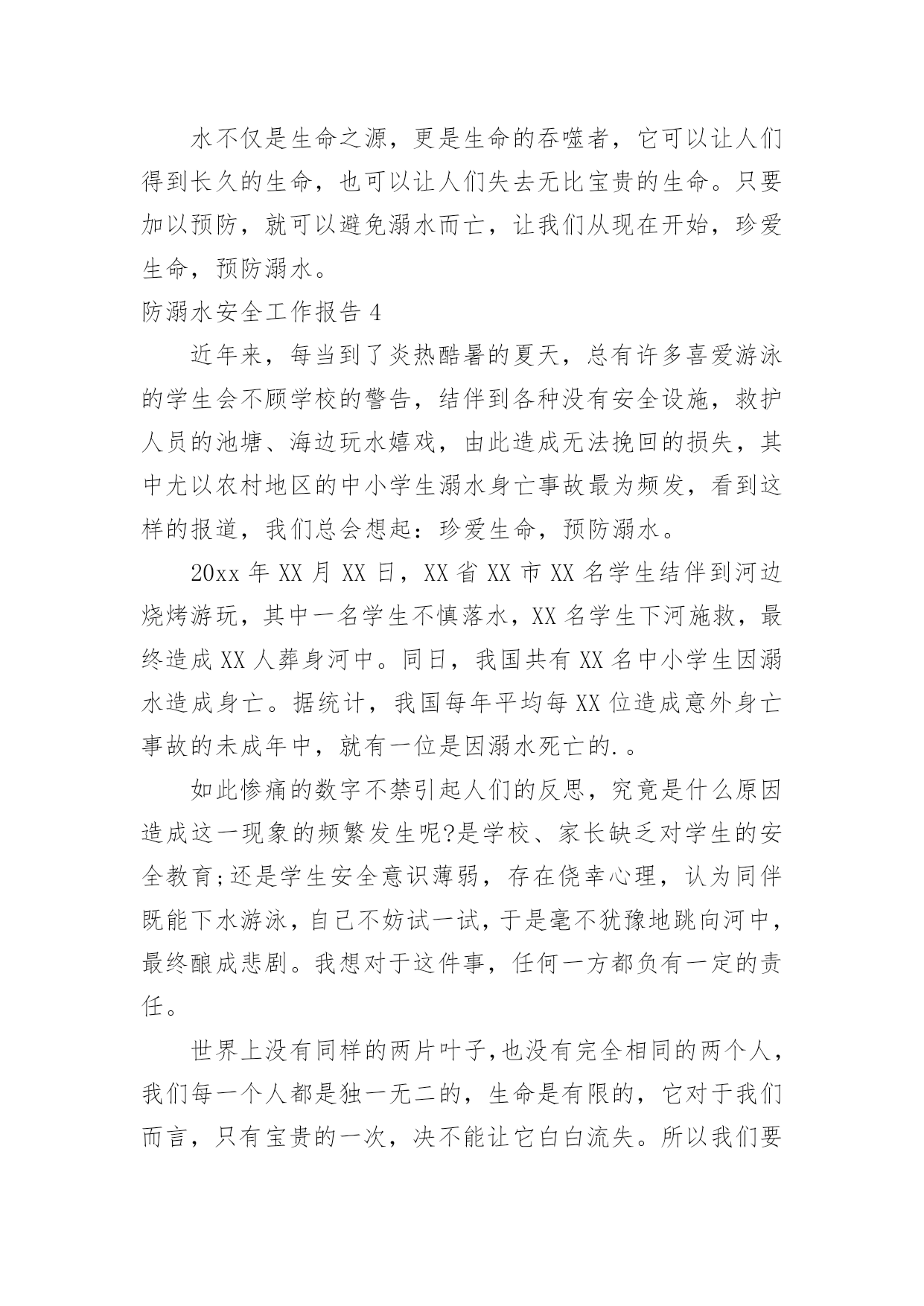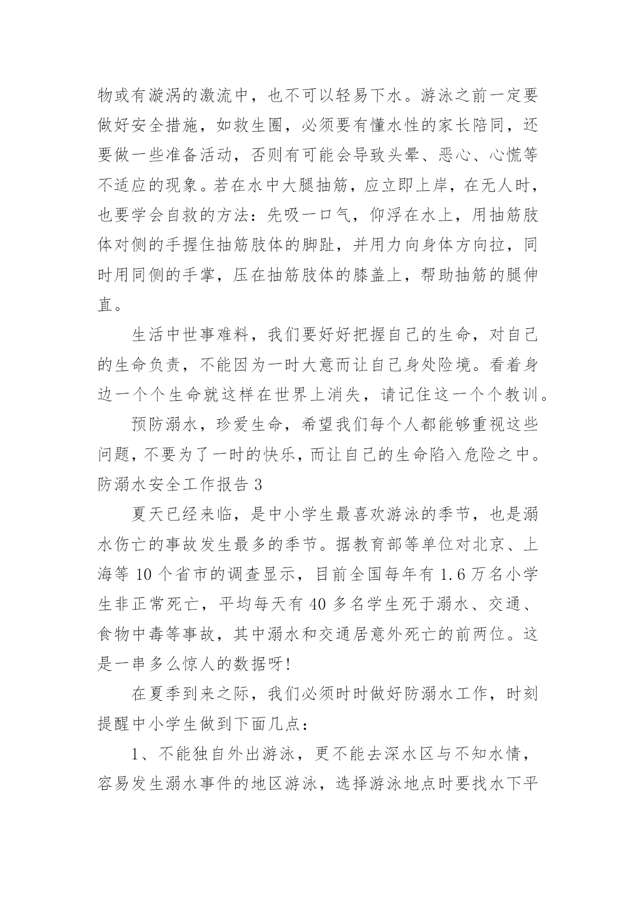 防溺水安全工作报告防溺水安全工作报告在人们素养不断提高的今天,报告不再是罕见的东西,不同的报告内容同样也是不同的。那么大家知道标准正式的报告格式吗?以下是小编整理的防溺水安全工作报告,欢迎阅读,希望大家能够喜欢。防溺水安全工作报告1根据XX县教育局通知精神,我校就积极围绕“预防溺水、珍爱生命”这一主题,做了专门的研究和布置,积极开展宣传教育活动,现就这项工作做如下汇报:一、提高认识,精心部署我校现有10个教学班级,387名学生。我校多次召开全体教师会议,认真学习市、县两级教育主管部门关于预防学生溺水安全教育工作的文件精神。充分认识,扎实抓好学校预防溺水宣传教育工作的重要意义,进一步提高思想认识,增强抓好预防溺水教育工作的责任感和紧迫感。学校安全工作领导小组积极落实会议精神,精心安排预防溺水教育的各项活动,形成工作方案,并传达至全校各部门、各班级和每个学生及家长。二、开展形式多样的'宣传工作1、学校成立了预防学生溺水工作领导小组,定期召开预防学生溺水工作会议,并及时传达上级文件。2、学校通过校内广播、宣传栏、黑板报、专题班会等进行了防溺水知识的宣传工作。3、学校每天从新闻或网络上发现有关溺水事故,及时把相关信息及危害性向学生宣传。各班级收集整理有关预防溺水的知识材料,有针对性地开好“溺水与安全”主题班会。增强学生自我保护意识和自救自护能力。4、班主任及任课教师进入课堂后一旦发现学生缺课,迅速查明缺课原因,及时通知家长。要求各班选出负责人的学生当上下学路上溺水监督员,发现有想下水嫌疑的情况,立即制止并上报给老师,老师立即处理。5、发放《致学生家长的一封信》。同时要求家长认真填写回执单,让学生家长了解预防溺水的重要性和紧迫感。6、通过预防溺水知识教育竞赛使学生加深了预防溺水有关知识和自救互救的能力。7、为了使预防学生溺水工作有序进行,学校制定了预防学生溺水实施方案,并制定了应急预案。8、各班主任与学生家长进行面对面的或者电话专访活动。防溺水安全工作报告2随着暑假的到来,越来越多的学生都选择了游泳,来作为自己暑假里的娱乐方式,这本是非常好的,可是,却有很多人,没有到正规的地方游泳,甚至去池塘,河流等危险的地方游泳。而这样轻率的行为往往都会导致溺水事故的发生,并非是因为学校的安全教育工作有什么做的不到位的地方,实在是因为这些学生都带有一定侥幸心理的`缘故。根据统计可以得知目前全国每年有XX万名中学生非正常死亡,溺水和交通事故死亡居前两名。这说明了溺水事故对我们学生过得威胁性是非常大的,如果现在不能够引起足够的重视的话,很有可能在将来的生活中因此而吃大亏。江河湖泊往往装出一副平静、温柔的样子,让人忽视了温柔的背后是多深的地狱。有多少人落入了这无底的漩涡、这可怕的魔爪。身边,也许这些沉重的画面时常可见,就在我们身边,悲剧正在上演着。当你看见朋友要私自去河里游泳时,你会阻拦吗?当你看见有人在水中挣扎时,你会张皇失措吗?当你在没有家长陪同,有炎热难耐时,你还会任性的往水中跳吗?一些学生因为逞强好胜,不知水深,潜入水中,还做出各种各样的姿势,导致体力不支。碰到这种情况的学生,有的被救了,但另外的学生呢,则再也无法重新开始了。这难道是天意吗?难道活下来只能靠运气吗?离去的学生或许很后悔,但再也来不及改正了,只留下在世的亲人悲痛不已;死里逃生的学生,带着侥幸心理,但恐怕再也不会有第二次了吧;对于那些从没有遇到过这件事的人,趁来得及,更加珍惜自己的生命。溺水时可以避免的,只是学生缺乏“游泳安全”的意识以及防溺水知识。身边的河流只便于用来欣赏,享受游泳的乐趣还是留给那些有经验和准备的人吧,他们总是预料到一些可能发生的事情,准备好应对的方法。在不知水深的情况下,绝对不可以以身试险;在有障碍物或有漩涡的激流中,也不可以轻易下水。游泳之前一定要做好安全措施,如救生圈,必须要有懂水性的家长陪同,还要做一些准备活动,否则有可能会导致头晕、恶心、心慌等不适应的现象。若在水中大腿抽筋,应立即上岸,在无人时,也要学会自救的方法:先吸一口气,仰浮在水上,用抽筋肢体对侧的手握住抽筋肢体的脚趾,并用力向身体方向拉,同时用同侧的手掌,压在抽筋肢体的膝盖上,帮助抽筋的腿伸直。生活中世事难料,我们要好好把握自己的生命,对自己的生命负责,不能因为一时大意而让自己身处险境。看着身边一个个生命就这样在世界上消失,请记住这一个个教训。预防溺水,珍爱生命,希望我们每个人都能够重视这些问题,不要为了一时的快乐,而让自己的生命陷入危险之中。防溺水安全工作报告3夏天已经来临,是中小学生最喜欢游泳的季节,也是溺水伤亡的事故发生最多的季节。据教育部等单位对北京、上海等10个省市的调查显示,目前全国每年有1.6万名小学生非正常死亡,平均每天有40多名学生死于溺水、交通、食物中毒等事故,其中溺水和交通