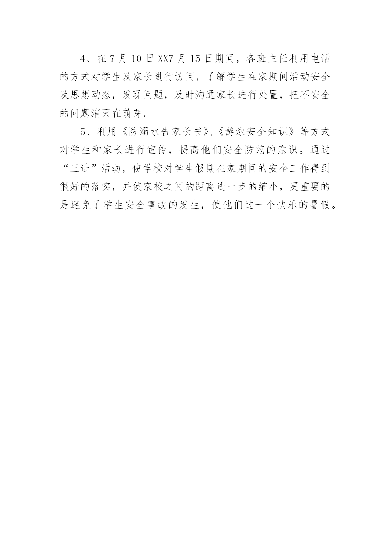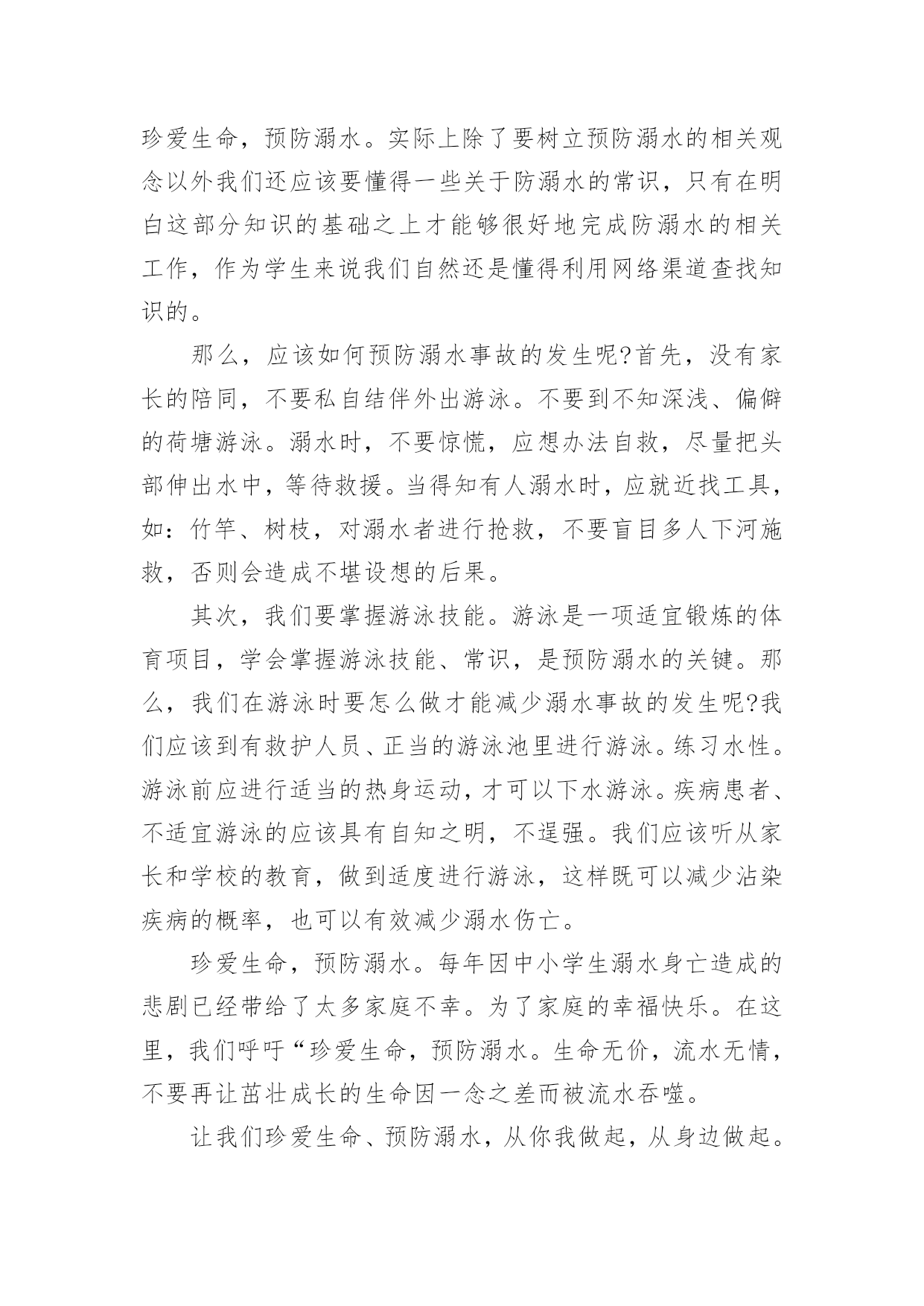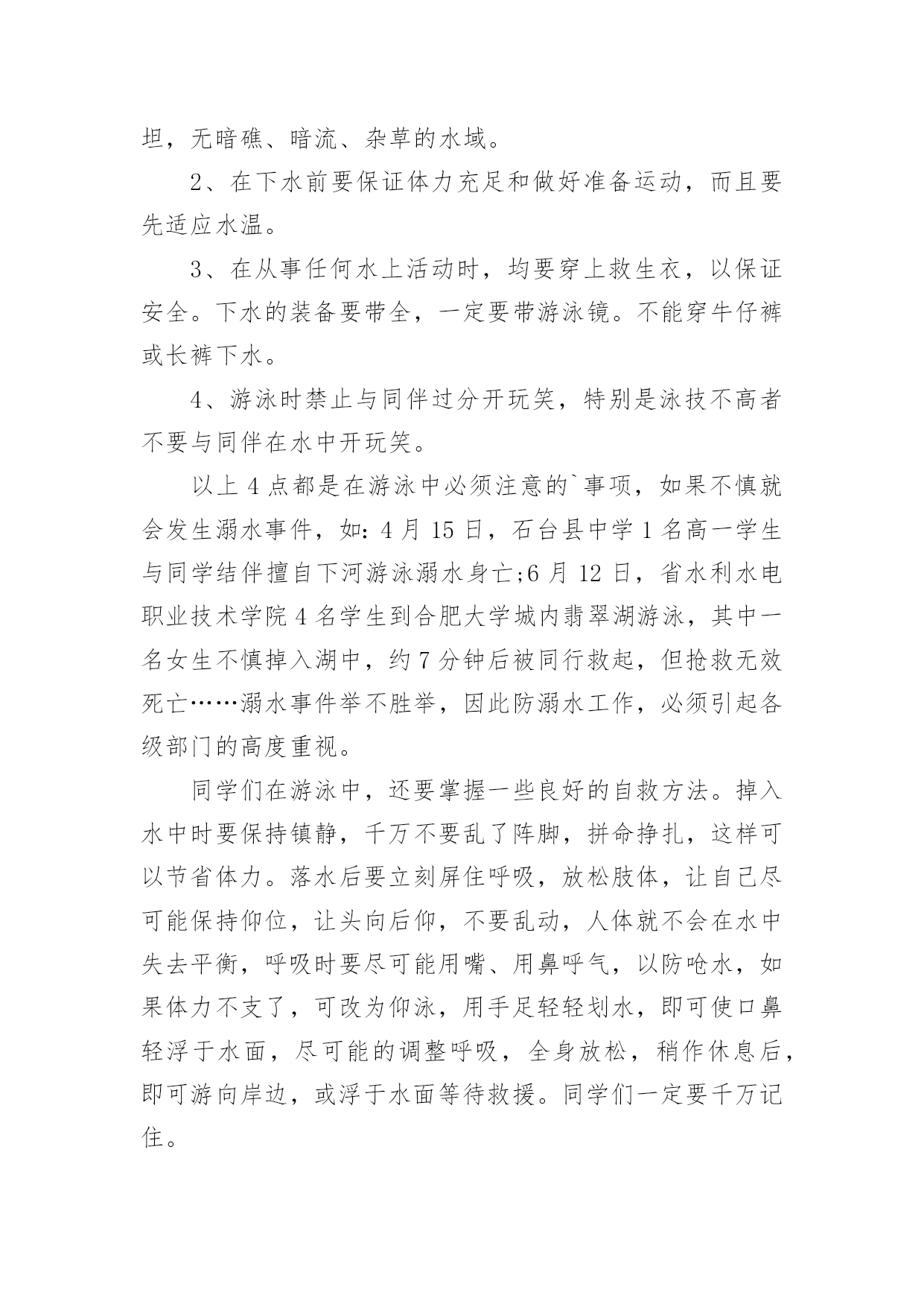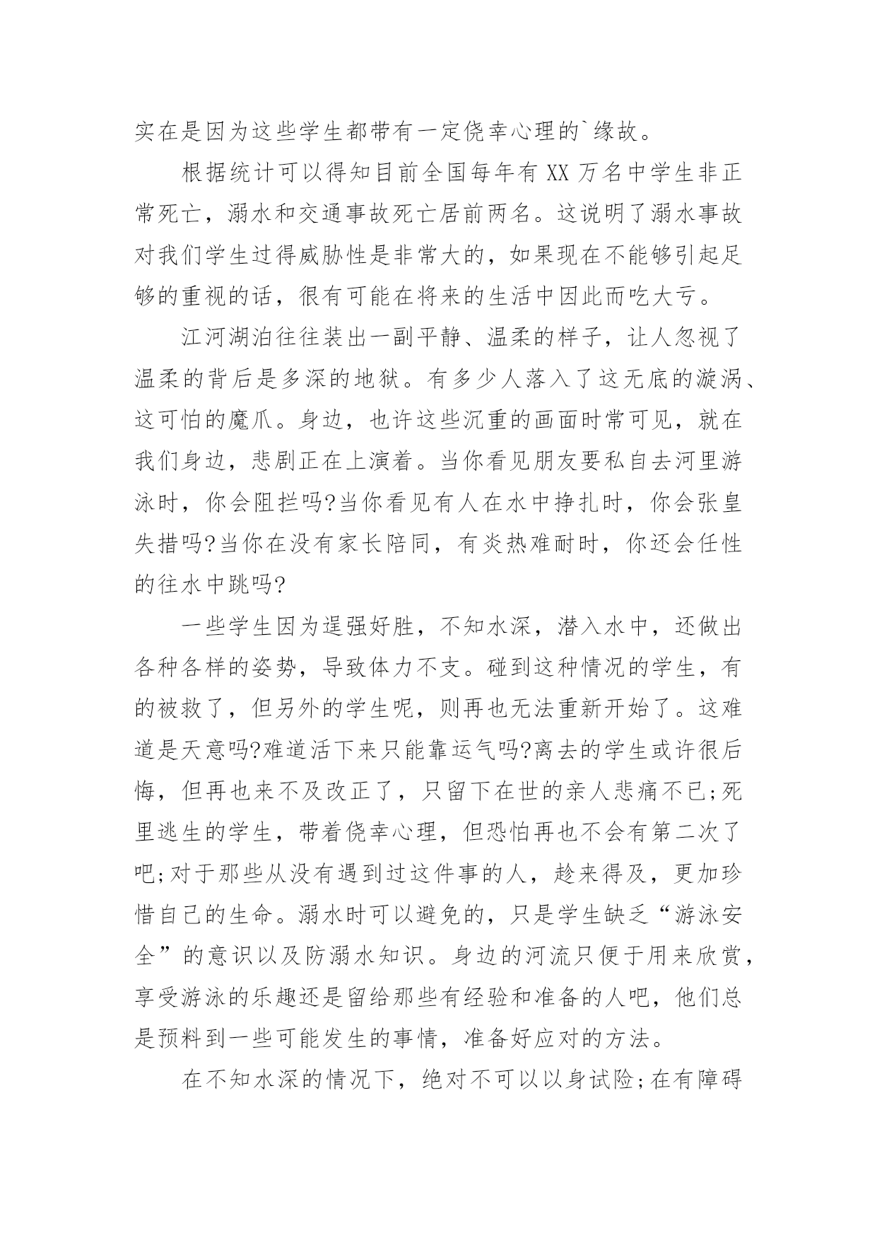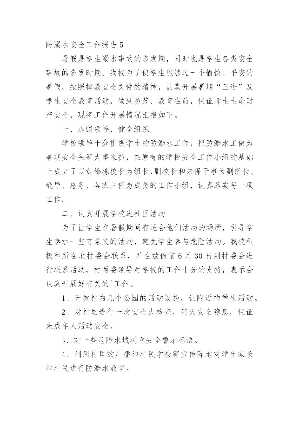 防溺水安全工作报告防溺水安全工作报告在人们素养不断提高的今天,报告不再是罕见的东西,不同的报告内容同样也是不同的。那么大家知道标准正式的报告格式吗?以下是小编整理的防溺水安全工作报告,欢迎阅读,希望大家能够喜欢。防溺水安全工作报告1根据XX县教育局通知精神,我校就积极围绕“预防溺水、珍爱生命”这一主题,做了专门的研究和布置,积极开展宣传教育活动,现就这项工作做如下汇报:一、提高认识,精心部署我校现有10个教学班级,387名学生。我校多次召开全体教师会议,认真学习市、县两级教育主管部门关于预防学生溺水安全教育工作的文件精神。充分认识,扎实抓好学校预防溺水宣传教育工作的重要意义,进一步提高思想认识,增强抓好预防溺水教育工作的责任感和紧迫感。学校安全工作领导小组积极落实会议精神,精心安排预防溺水教育的各项活动,形成工作方案,并传达至全校各部门、各班级和每个学生及家长。二、开展形式多样的'宣传工作1、学校成立了预防学生溺水工作领导小组,定期召开预防学生溺水工作会议,并及时传达上级文件。2、学校通过校内广播、宣传栏、黑板报、专题班会等进行了防溺水知识的宣传工作。3、学校每天从新闻或网络上发现有关溺水事故,及时把相关信息及危害性向学生宣传。各班级收集整理有关预防溺水的知识材料,有针对性地开好“溺水与安全”主题班会。增强学生自我保护意识和自救自护能力。4、班主任及任课教师进入课堂后一旦发现学生缺课,迅速查明缺课原因,及时通知家长。要求各班选出负责人的学生当上下学路上溺水监督员,发现有想下水嫌疑的情况,立即制止并上报给老师,老师立即处理。5、发放《致学生家长的一封信》。同时要求家长认真填写回执单,让学生家长了解预防溺水的重要性和紧迫感。6、通过预防溺水知识教育竞赛使学生加深了预防溺水有关知识和自救互救的能力。7、为了使预防学生溺水工作有序进行,学校制定了预防学生溺水实施方案,并制定了应急预案。8、各班主任与学生家长进行面对面的或者电话专访活动。防溺水安全工作报告2随着暑假的到来,越来越多的学生都选择了游泳,来作为自己暑假里的娱乐方式,这本是非常好的,可是,却有很多人,没有到正规的地方游泳,甚至去池塘,河流等危险的地方游泳。而这样轻率的行为往往都会导致溺水事故的发生,并非是因为学校的安全教育工作有什么做的不到位的地方,实在是因为这些学生都带有一定侥幸心理的`缘故。根据统计可以得知目前全国每年有XX万名中学生非正常死亡,溺水和交通事故死亡居前两名。这说明了溺水事故对我们学生过得威胁性是非常大的,如果现在不能够引起足够的重视的话,很有可能在将来的生活中因此而吃大亏。江河湖泊往往装出一副平静、温柔的样子,让人忽视了温柔的背后是多深的地狱。有多少人落入了这无底的漩涡、这可怕的魔爪。身边,也许这些沉重的画面时常可见,就在我们身边,悲剧正在上演着。当你看见朋友要私自去河里游泳时,你会阻拦吗?当你看见有人在水中挣扎时,你会张皇失措吗?当你在没有家长陪同,有炎热难耐时,你还会任性的往水中跳吗?一些学生因为逞强好胜,不知水深,潜入水中,还做出各种各样的姿势,导致体力不支。碰到这种情况的学生,有的被救了,但另外的学生呢,则再也无法重新开始了。这难道是天意吗?难道活下来只能靠运气吗?离去的学生或许很后悔,但再也来不及改正了,只留下在世的亲人悲痛不已;死里逃生的学生,带着侥幸心理,但恐怕再也不会有第二次了吧;对于那些从没有遇到过这件事的人,趁来得及,更加珍惜自己的生命。溺水时可以避免的,只是学生缺乏“游泳安全”的意识以及防溺水知识。身边的河流只便于用来欣赏,享受游泳的乐趣还是留给那些有经验和准备的人吧,他们总是预料到一些可能发生的事情,准备好应对的方法。在不知水深的情况下,绝对不可以以身试险;在有障碍物或有漩涡的激流中,也不可以轻易下水。游泳之前一定要做好安全措施,如救生圈,必须要有懂水性的家长陪同,还要做一些准备活动,否则有可能会导致头晕、恶心、心慌等不适应的现象。若在水中大腿抽筋,应立即上岸,在无人时,也要学会自救的方法:先吸一口气,仰浮在水上,用抽筋肢体对侧的手握住抽筋肢体的脚趾,并用力向身体方向拉,同时用同侧的手掌,压在抽筋肢体的膝盖上,帮助抽筋的腿伸直。生活中世事难料,我们要好好把握自己的生命,对自己的生命负责,不能因为一时大意而让自己身处险境。看着身边一个个生命就这样在世界上消失,请记住这一个个教训。预防溺水,珍爱生命,希望我们每个人都能够重视这些问题,不要为了一时的快乐,而让自己的生命陷入危险之中。防溺水安全工作报告3夏天已经来临,是中小学生最喜欢游泳的季节,也是溺水伤亡的事故发生最多的季节。据教育部等单位对北京、上海等10个省市的调查显示,目前全国每年有1.6万名小学生非正常死亡,平均每天有40多名学生死于溺水、交通、食物中毒等事故,其中溺水和交通