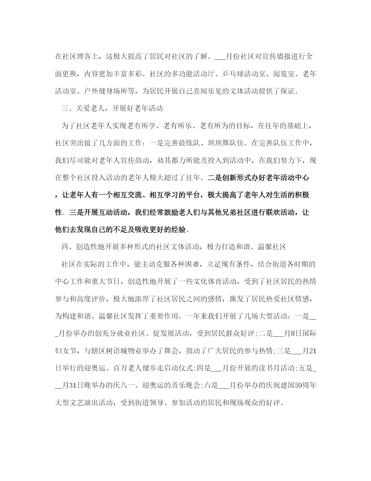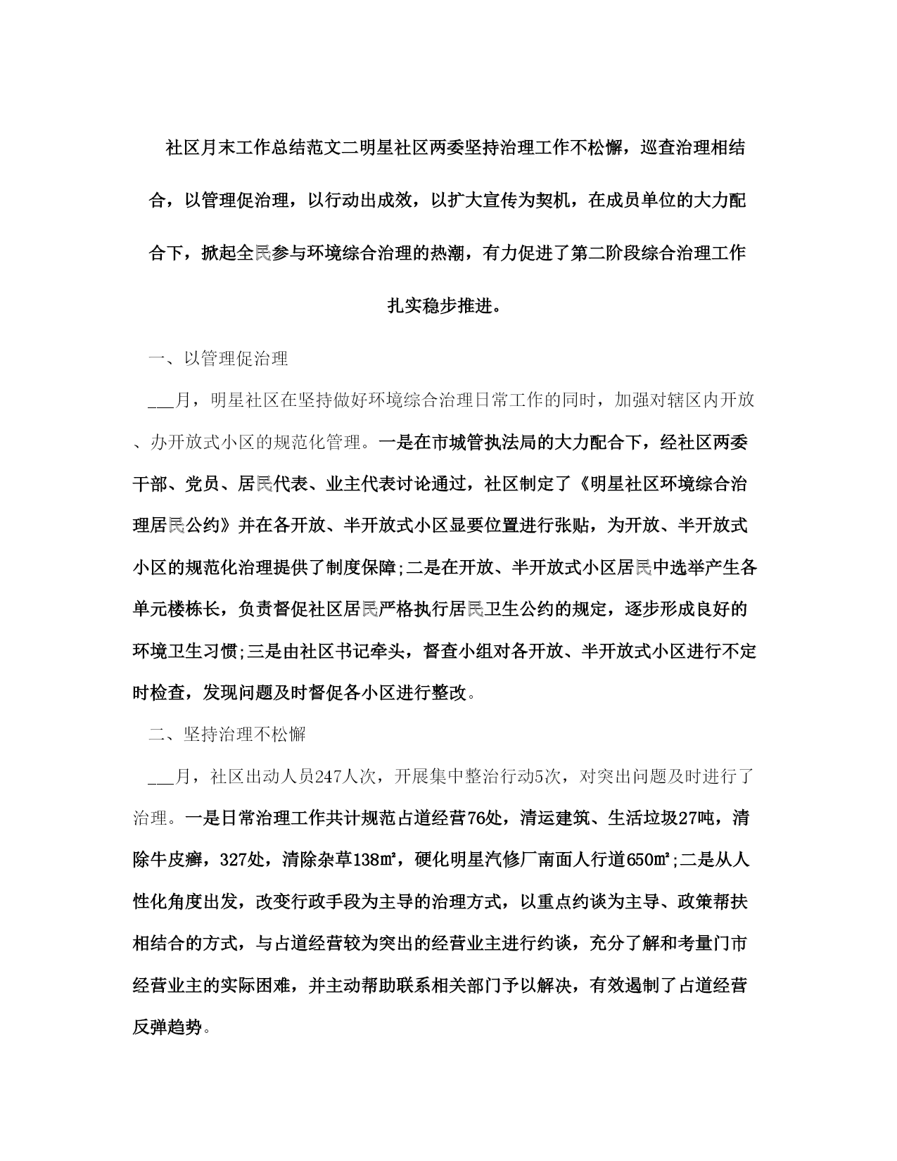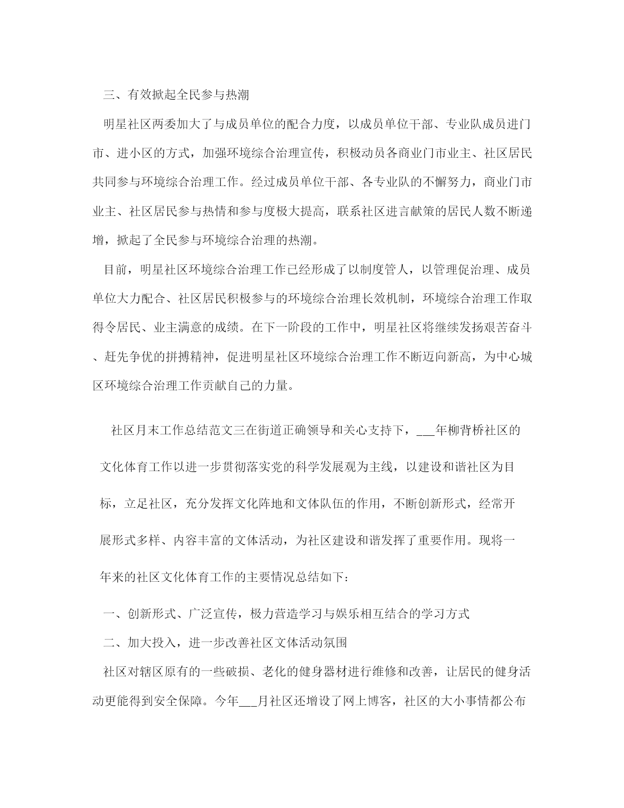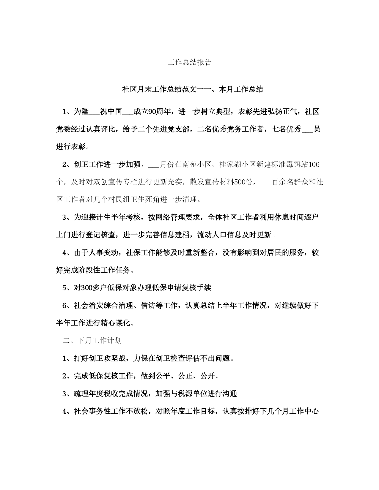社区月末工作总结报告工作总结报告(完整版)文档资料可直接使用,可编辑,欢迎下载工作总结报告社区月末工作总结范文一一、本月工作总结1、为隆___祝中国___成立90周年,进一步树立典型,表彰先进弘扬正气,社区党委经过认真评比,给予二个先进党支部,二名优秀党务工作者,七名优秀___员进行表彰。2、创卫工作进一步加强。___月份在南苑小区、桂家湖小区新建标准毒饵站106个,及时对双创宣传专栏进行更新充实,散发宣传材料500份,___百余名群众和社区工作者对几个村民组卫生死角进一步清理。3、为迎接计生半年考核,按网络管理要求,全体社区工作者利用休息时间逐户上门进行登记核查,进一步完善信息建档,流动人口信息及时更新。4、由于人事变动,社保工作能够及时重新整合,没有影响到对居民的服务,较好完成阶段性工作任务。5、对300多户低保对象办理低保申请复核手续。6、社会治安综合治理、信访等工作,认真总结上半年工作情况,对继续做好下半年工作进行精心谋化。二、下月工作计划1、打好创卫攻坚战,力保在创卫检查评估不出问题。2、完成低保复核工作,做到公平、公正、公开。3、疏理年度税收完成情况,加强与税源单位进行沟通。4、社会事务性工作不放松,对照年度工作目标,认真按排好下几个月工作中心。社区月末工作总结范文二明星社区两委坚持治理工作不松懈,巡查治理相结合,以管理促治理,以行动出成效,以扩大宣传为契机,在成员单位的大力配合下,掀起全民参与环境综合治理的热潮,有力促进了第二阶段综合治理工作扎实稳步推进。一、以管理促治理___月,明星社区在坚持做好环境综合治理日常工作的同时,加强对辖区内开放、办开放式小区的规范化管理。一是在市城管执法局的大力配合下,经社区两委干部、党员、居民代表、业主代表讨论通过,社区制定了《明星社区环境综合治理居民公约》并在各开放、半开放式小区显要位置进行张贴,为开放、半开放式小区的规范化治理提供了制度保障;二是在开放、半开放式小区居民中选举产生各单元楼栋长,负责督促社区居民严格执行居民卫生公约的规定,逐步形成良好的环境卫生习惯;三是由社区书记牵头,督查小组对各开放、半开放式小区进行不定时检查,发现问题及时督促各小区进行整改。二、坚持治理不松懈___月,社区出动人员247人次,开展集中整治行动5次,对突出问题及时进行了治理。一是日常治理工作共计规范占道经营76处,清运建筑、生活垃圾27吨,清除牛皮癣,327处,清除杂草138㎡,硬化明星汽修厂南面人行道650㎡;二是从人性化角度出发,改变行政手段为主导的治理方式,以重点约谈为主导、政策帮扶相结合的方式,与占道经营较为突出的经营业主进行约谈,充分了解和考量门市经营业主的实际困难,并主动帮助联系相关部门予以解决,有效遏制了占道经营反弹趋势。三、有效掀起全民参与热潮明星社区两委加大了与成员单位的配合力度,以成员单位干部、专业队成员进门市、进小区的方式,加强环境综合治理宣传,积极动员各商业门市业主、社区居民共同参与环境综合治理工作。经过成员单位干部、各专业队的不懈努力,商业门市业主、社区居民参与热情和参与度极大提高,联系社区进言献策的居民人数不断递增,掀起了全民参与环境综合治理的热潮。目前,明星社区环境综合治理工作已经形成了以制度管人,以管理促治理、成员单位大力配合、社区居民积极参与的环境综合治理长效机制,环境综合治理工作取得令居民、业主满意的成绩。在下一阶段的工作中,明星社区将继续发扬艰苦奋斗、赶先争优的拼搏精神,促进明星社区环境综合治理工作不断迈向新高,为中心城区环境综合治理工作贡献自己的力量。社区月末工作总结范文三在街道正确领导和关心支持下,___年柳背桥社区的文化体育工作以进一步贯彻落实党的科学发展观为主线,以建设和谐社区为目标,立足社区,充分发挥文化阵地和文体队伍的作用,不断创新形式,经常开展形式多样、内容丰富的文体活动,为社区建设和谐发挥了重要作用。现将一年来的社区文化体育工作的主要情况总结如下:一、创新形式、广泛宣传,极力营造学习与娱乐相互结合的学习方式二、加大投入,进一步改善社区文体活动氛围社区对辖区原有的一些破损、老化的健身器材进行维修和改善,让居民的健身活动更能得到安全保障。今年___月社区还增设了网上博客,社区的大小事情都公布在社区博客上,这极大提高了居民对社区的了解。___月份社区对宣传墙报进行全面更换,内容更加丰富多彩。社区的多功能活动厅、乒乓球活动室、阅览室、老年活动室、户外健身场所等,为居民开展自己喜闻乐见的文体活动提供了保证。三、关爱老人,开展好老年活动为了社区老年人实现老有所学、老有所乐、老有所为的目标,在往年的基础上,社区突出做了几方面的工作:一是完善晨练队、坝坝舞队伍。在完善队伍工作中,我们尽可能对老年人宣传