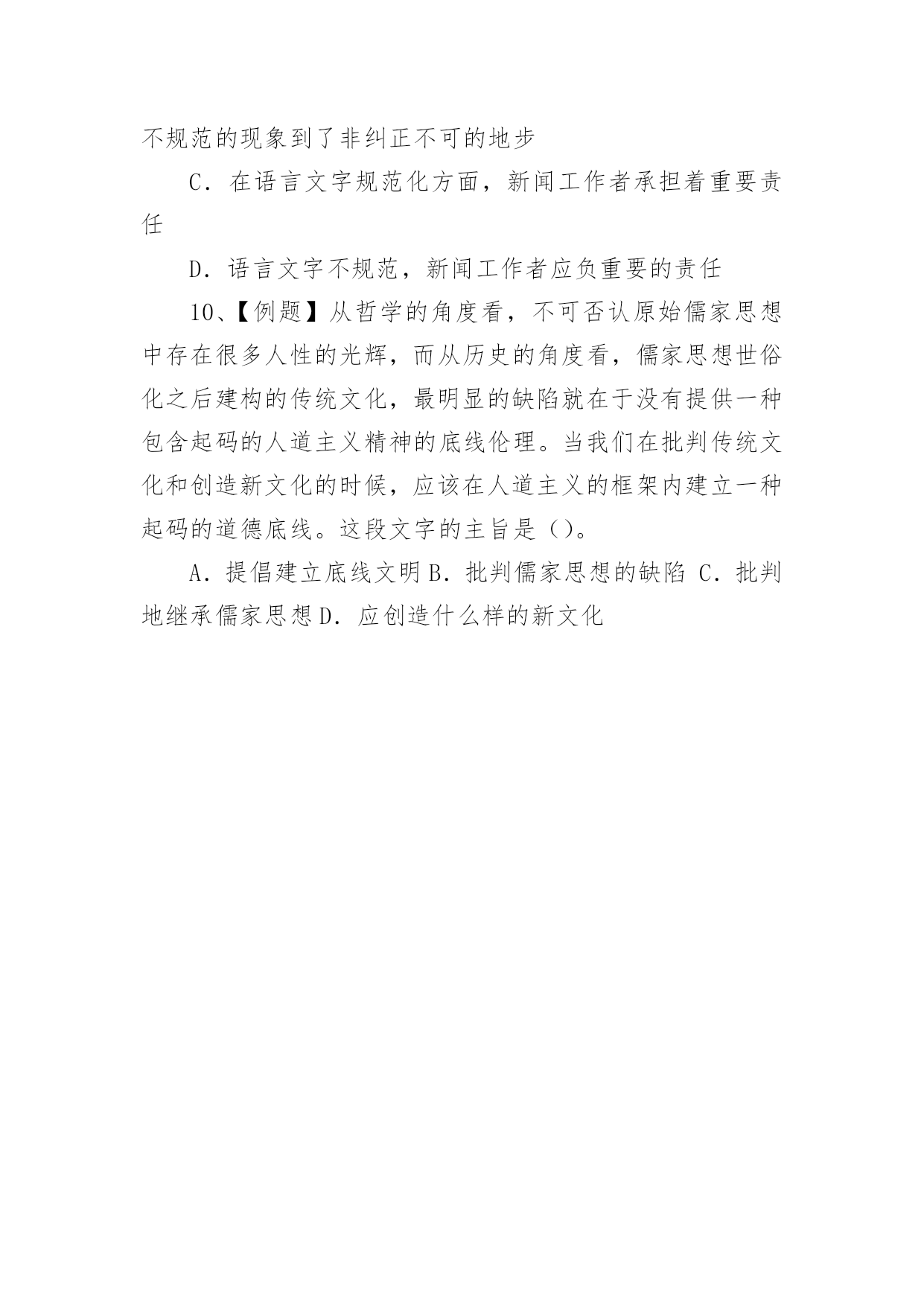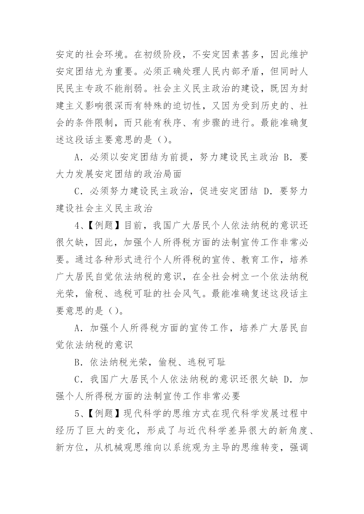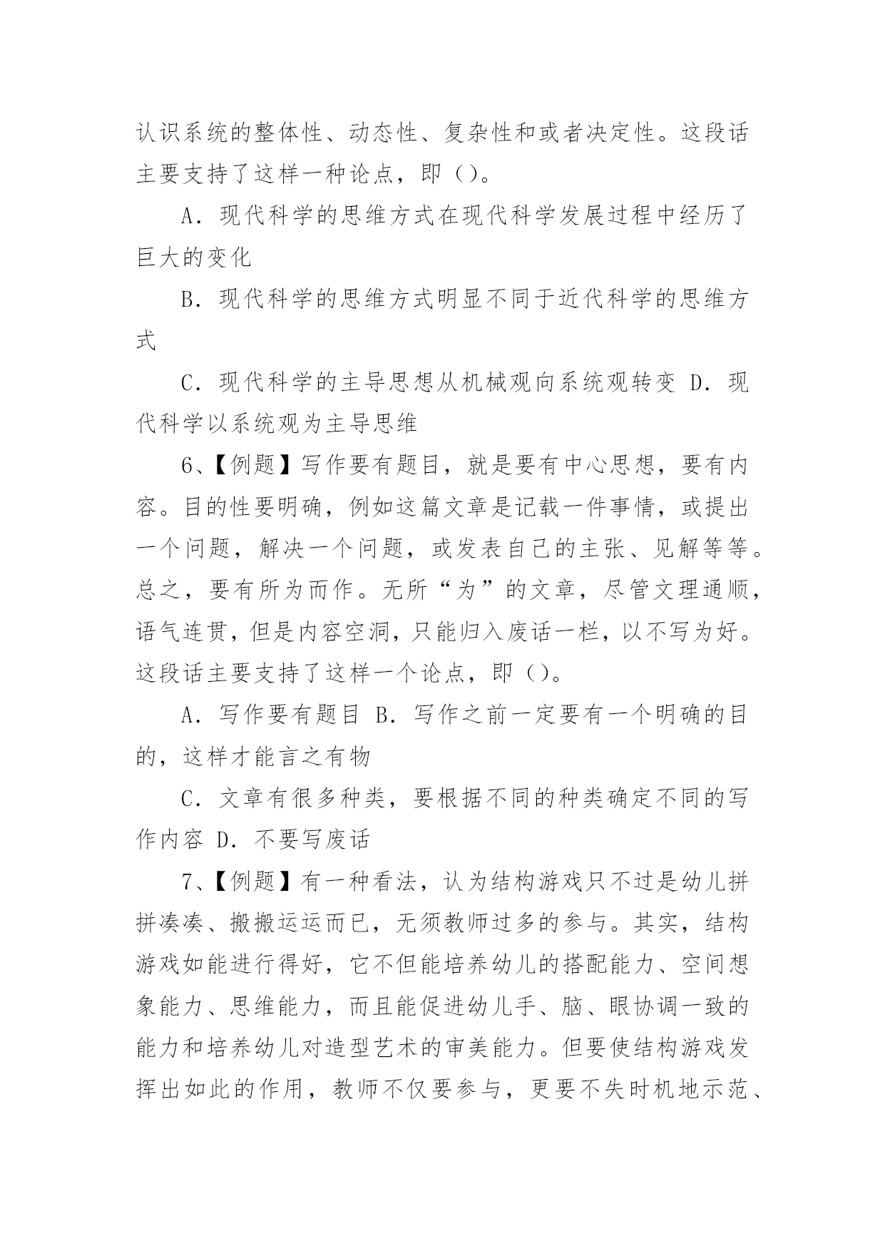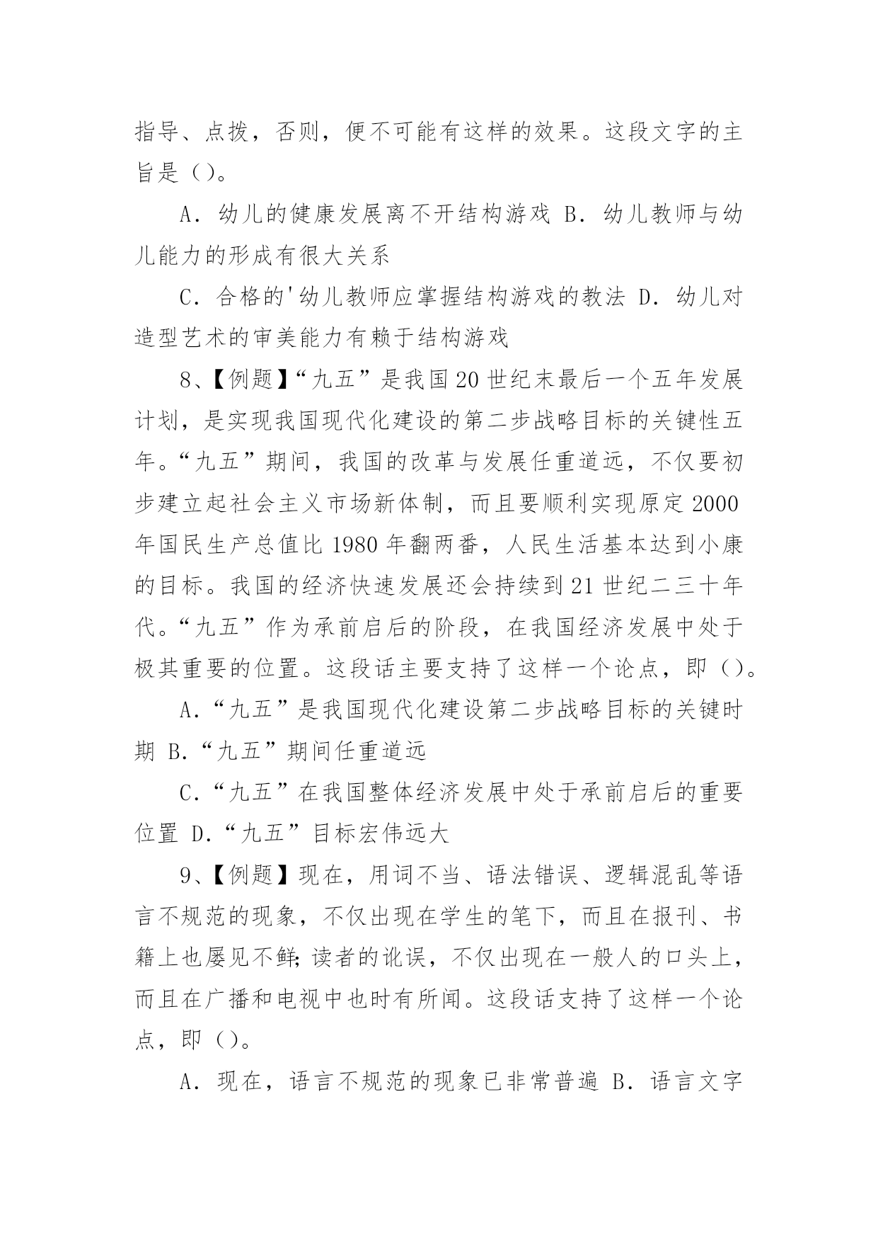 山东的言语理解专项真题训练1、【例题】一种哲学的重大发展不在于或者说主要不在于它对已有的问题给出新的解释、新的说明,而在于面对时代的要求,它改变了自己提出哲学问题的方式。它面对时代的新发展提出了新问题,凝结出新的范畴和新的理论。这段话的主要意思是()。A.哲学所以能对时代发展有所促进,在于它提出了新问题,凝结出新的范畴和理论B.哲学与它所面对的时代有着密切的关系,它总要对时代的新发展提出新问题C.哲学上的重大发展,在于它面对时代要求改变了自己提出问题的方式D.哲学的重大发展不在于它对已有问题的新解释,而在于它用新的方法解决问题2、【例题】所谓信息加工的观点就是将人脑与计算机进行类比,将人脑看作类似于计算机的信息加工系统。但是这种类比只是机能性质的,也就是在行为水平上的类比,而不管作为其物质构成的生物细胞和电子元件的区别。换句话说,这种类比只涉及软件而不涉及硬件。这段话中硬件指代的是()。A.机能性质B.行为水平C.物质构成D.生物细胞和电子元件3、【例题】社会主义应当有高度的民主、完备的法制和安定的社会环境。在初级阶段,不安定因素甚多,因此维护安定团结尤为重要。必须正确处理人民内部矛盾,但同时人民民主专政不能削弱。社会主义民主政治的建设,既因为封建主义影响很深而有特殊的迫切性,又因为受到历史的、社会的条件限制,而只能有秩序、有步骤的进行。最能准确复述这段话主要意思的是()。A.必须以安定团结为前提,努力建设民主政治B.要大力发展安定团结的政治局面C.必须努力建设民主政治,促进安定团结D.要努力建设社会主义民主政治4、【例题】目前,我国广大居民个人依法纳税的意识还很欠缺,因此,加强个人所得税方面的法制宣传工作非常必要。通过各种形式进行个人所得税的宣传、教育工作,培养广大居民自觉依法纳税的意识,在全社会树立一个依法纳税光荣,偷税、逃税可耻的社会风气。最能准确复述这段话主要意思的是()。A.加强个人所得税方面的宣传工作,培养广大居民自觉依法纳税的意识B.依法纳税光荣,偷税、逃税可耻C.我国广大居民个人依法纳税的意识还很欠缺D.加强个人所得税方面的法制宣传工作非常必要5、【例题】现代科学的思维方式在现代科学发展过程中经历了巨大的变化,形成了与近代科学差异很大的新角度、新方位,从机械观思维向以系统观为主导的思维转变,强调认识系统的整体性、动态性、复杂性和或者决定性。这段话主要支持了这样一种论点,即()。A.现代科学的思维方式在现代科学发展过程中经历了巨大的变化B.现代科学的思维方式明显不同于近代科学的思维方式C.现代科学的主导思想从机械观向系统观转变D.现代科学以系统观为主导思维6、【例题】写作要有题目,就是要有中心思想,要有内容。目的性要明确,例如这篇文章是记载一件事情,或提出一个问题,解决一个问题,或发表自己的主张、见解等等。总之,要有所为而作。无所“为”的文章,尽管文理通顺,语气连贯,但是内容空洞,只能归入废话一栏,以不写为好。这段话主要支持了这样一个论点,即()。A.写作要有题目B.写作之前一定要有一个明确的目的,这样才能言之有物C.文章有很多种类,要根据不同的种类确定不同的写作内容D.不要写废话7、【例题】有一种看法,认为结构游戏只不过是幼儿拼拼凑凑、搬搬运运而已,无须教师过多的参与。其实,结构游戏如能进行得好,它不但能培养幼儿的搭配能力、空间想象能力、思维能力,而且能促进幼儿手、脑、眼协调一致的能力和培养幼儿对造型艺术的审美能力。但要使结构游戏发挥出如此的作用,教师不仅要参与,更要不失时机地示范、指导、点拨,否则,便不可能有这样的效果。这段文字的主旨是()。A.幼儿的健康发展离不开结构游戏B.幼儿教师与幼儿能力的形成有很大关系C.合格的'幼儿教师应掌握结构游戏的教法D.幼儿对造型艺术的审美能力有赖于结构游戏8、【例题】“九五”是我国20世纪末最后一个五年发展计划,是实现我国现代化建设的第二步战略目标的关键性五年。“九五”期间,我国的改革与发展任重道远,不仅要初步建立起社会主义市场新体制,而且要顺利实现原定2000年国民生产总值比1980年翻两番,人民生活基本达到小康的目标。我国的经济快速发展还会持续到21世纪二三十年代。“九五”作为承前启后的阶段,在我国经济发展中处于极其重要的位置。这段话主要支持了这样一个论点,即()。A.“九五”是我国现代化建设第二步战略目标的关键时期B.“九五”期间任重道远C.“九五”在我国整体经济发展中处于承前启后的重要位置D.“九五”目标宏伟远大9、【例题】现在,用词不当、语法错误、逻辑混乱等语言不规范的现象,不仅出现在学生的笔下,而且在报刊、书籍上也屡见不鲜;读者的讹误,不仅出现在一般人的口头上,而且在广播和电视中也时有所闻。这段话支持了这样一个论点,即()。A.现在,语言不规范的现象已非常普