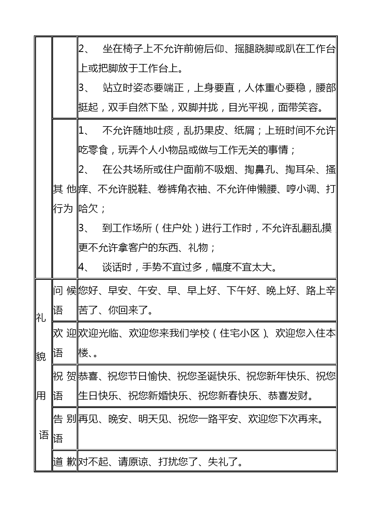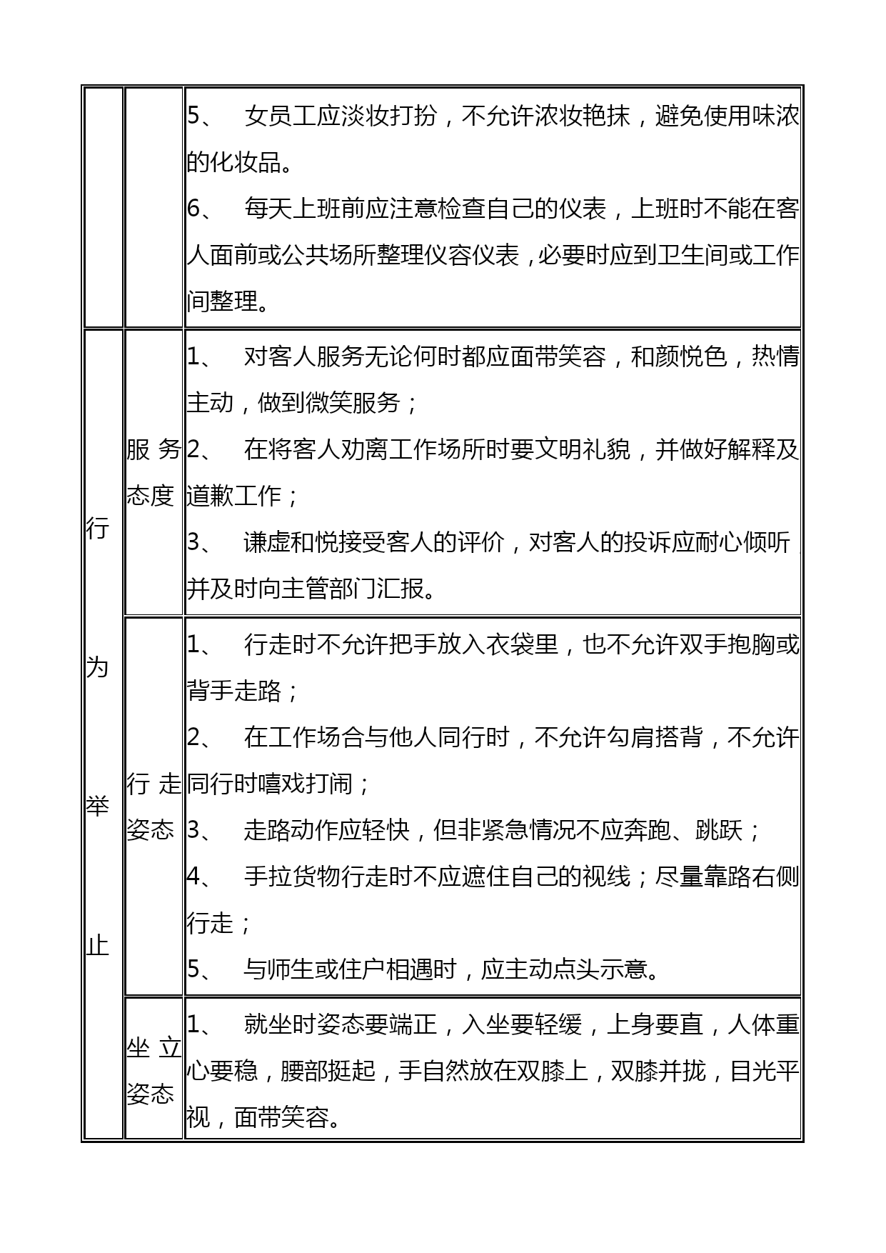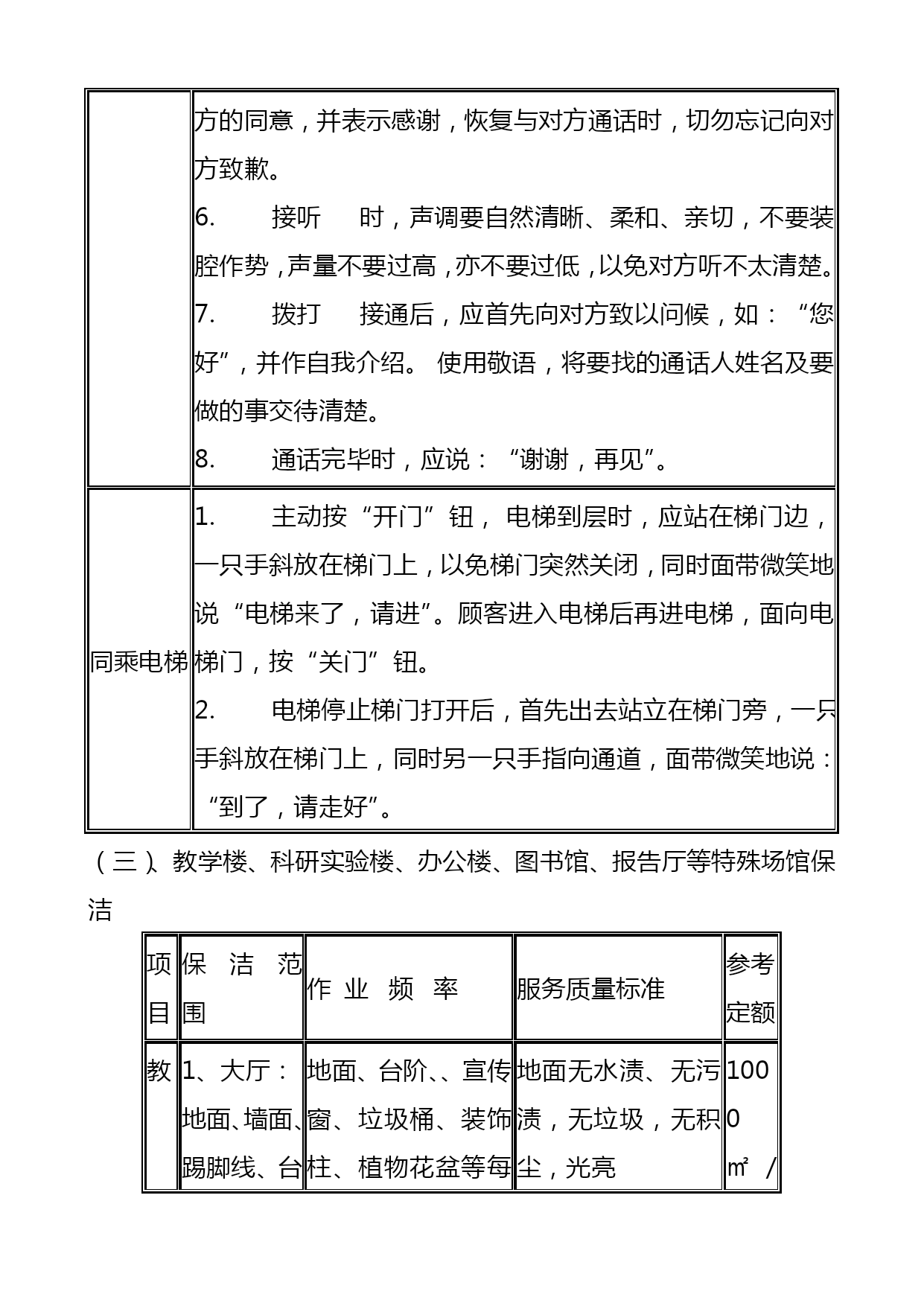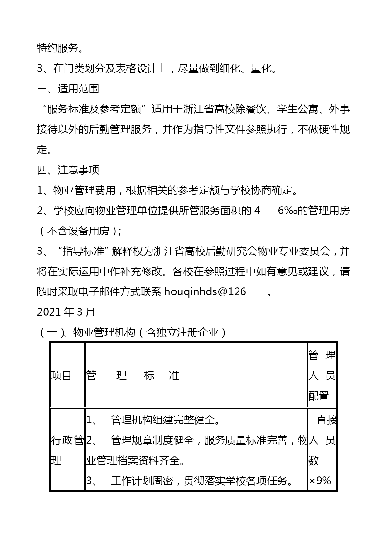 学校物业标准精品资料(完整版)资料(可以直接使用,可编辑优秀版资料,欢迎下载)高等学校物业管理服务标准随着全国高校后勤社会化改革的不断深入,为进一步推进浙江省高校后勤社会化改革的步伐,不断提升后勤管理水平和服务质量,规范全省高校物业管理服务标准及相应定额,根据国家和浙江省、市有关法律法规及行业规定,借鉴其它省市高校后勤管理的成功经验,结合我省高校实际,由浙江省高校后勤研究会物业管理专业委员会起抄讨论,浙江省高等学校后勤管理研究会审定,建议浙江省各高校参照执行。为了便于理解和把握,现就有关编制要点做以下说明:一、分类“服务标准及参考定额”共划分为12大项,其中包括:物业管理机构、物业管理人员行为规范、教学楼办公楼等保洁、教学楼办公楼等综合管理、校园环境保洁、园林绿化养护、水电暖汽设备运行管理、教学楼办公楼学生公寓房屋及设施设备小修维护、消防治安、邮政服务、校园住宅区物业管理服务、特约服务。二、编制的指导思想1、在编制中,凡与国家或浙江省相关法规接近的门类,依据法规编制标准。2、在编制中,凡没有国家或浙江省相关法规可借鉴的文件,依据浙江省高校后勤管理服务实际并广泛征求意见的基础上编制标准,包括:教学楼办公楼保洁、教学楼办公楼综合管理、校园环境绿化保洁、教学楼办公楼学生公寓房屋及设施设备小修维护、消防治安、邮政服务、特约服务。3、在门类划分及表格设计上,尽量做到细化、量化。三、适用范围“服务标准及参考定额”适用于浙江省高校除餐饮、学生公寓、外事接待以外的后勤管理服务,并作为指导性文件参照执行,不做硬性规定。四、注意事项1、物业管理费用,根据相关的参考定额与学校协商确定。2、学校应向物业管理单位提供所管服务面积的4—6‰的管理用房(不含设备用房);3、“指导标准”解释权为浙江省高校后勤研究会物业专业委员会,并将在实际运用中作补充修改。各校在参照过程中如有意见或建议,请随时采取电子邮件方式联系houqinhds@126。2021年3月(一)、物业管理机构(含独立注册企业)项目管理标准管理人员配置行政管理1、管理机构组建完整健全。2、管理规章制度健全,服务质量标准完善,物业管理档案资料齐全。3、工作计划周密,贯彻落实学校各项任务。4、定期检查各业务部门工作计划落实情况。5、每年至少进行一次物业管理服务满意率调查,促进管理服务工作的改进和提高,征求意见户数(班级、部门)不低于总户数80%;物业管理服务满意率不低于90%。6、建立公共突发事件的处理机制和应急预案。直接人员数×9%人事、宣传管理(注册企业)1、按规章制度要求办理选聘辞退手续。2、结合技术管理部门组织新员工上岗培训。3、建立员工档案,办理员工保险。4、组织年终考核评比,做好晋升和降级工作。5、组建宣传队伍,完成企业的宣传教育工作。6、有完整的人事、劳资管理系统。财务管理(注册企业)1、严格执行财务制度,账目清晰,成本核算,收支两条线。2、公开服务标准、收费依据及标准。技术管理1、制定设备设施安全运行管理制度;落实安全运行岗位责任制;2、建立完整的技术、设备档案,有定期巡回检查、维修保养、日常运行档案记录;3、建立各种设备设施突发事件的应急处理机制和预案。材料管理严格执行物资采购制度和管理制度,做到账、物、卡相符。注:管理人员指班组长以上的管理干部(含行政、财务一线人员)(二)、物业管理人员行为规范项目行为规范标准仪容仪表服饰着装1、上班时间必须穿工作服,工作服穿戴整齐整洁,非工作需要不允许将衣袖、裤管卷起,不允许将衣服搭在肩上;2、上班统一佩戴工作牌,工作牌应端正地戴在左胸襟处;3、鞋袜穿戴整齐清洁,非工作需要不允许打赤脚或穿雨鞋到处走。特殊工作完毕应在工作场所将鞋擦干净再走;4、非特殊情况不允许穿背心、短裤、拖鞋;5、男女员工均不允许戴有色眼镜。须发1、女员工前发不遮眼,不梳怪异发型;2、男员工后发根不超过衣领(其中:保安员头发不得长于5cm),不盖耳,不留胡须;3、所有员工头发应保持整洁光鲜,不允许剃光头。个人卫生1、保持手部干净,指甲不允许超过指头两毫米,指甲内不允许残留污物,不涂有色指甲油;2、员工应经常洗澡防汗臭,勤换衣服。衣服因工作而弄湿、弄脏后应及时换洗;3、上班前不允许吃有异味食品,保持口腔清洁,口气清新,早晚刷牙,饭后漱口;4、保持眼、耳清洁,不允许残留眼屎、耳垢。5、女员工应淡妆打扮,不允许浓妆艳抹,避免使用味浓的化妆品。6、每天上班前应注意检查自己的仪表,上班时不能在客人面前或公共场所整理仪容仪表,必要时应到卫生间或工作间整理。行为举止服务态度1、对客人服务无论何时都应面带笑容,和颜悦色,热情主动,做到微笑服务;2、在将客人劝离工作场所时要文明礼貌,