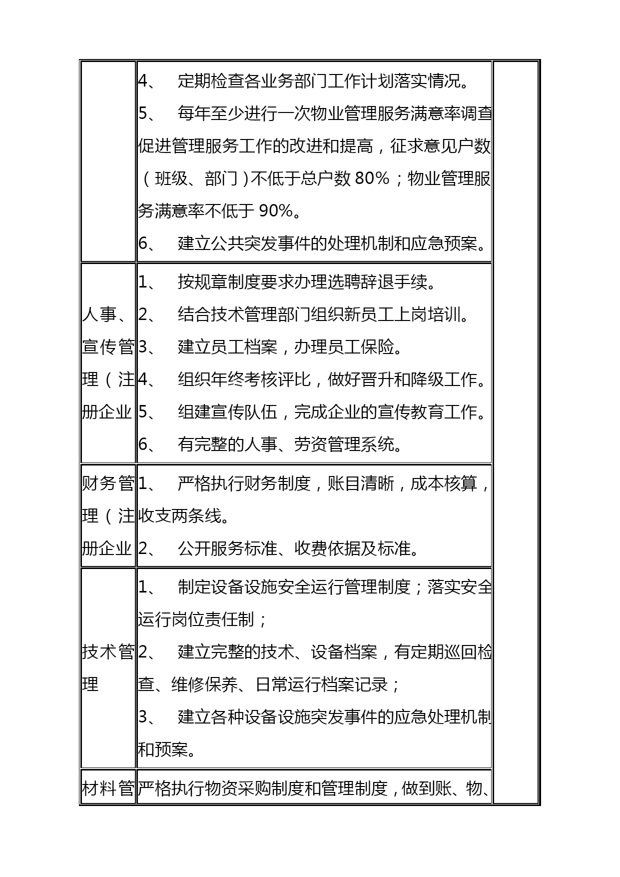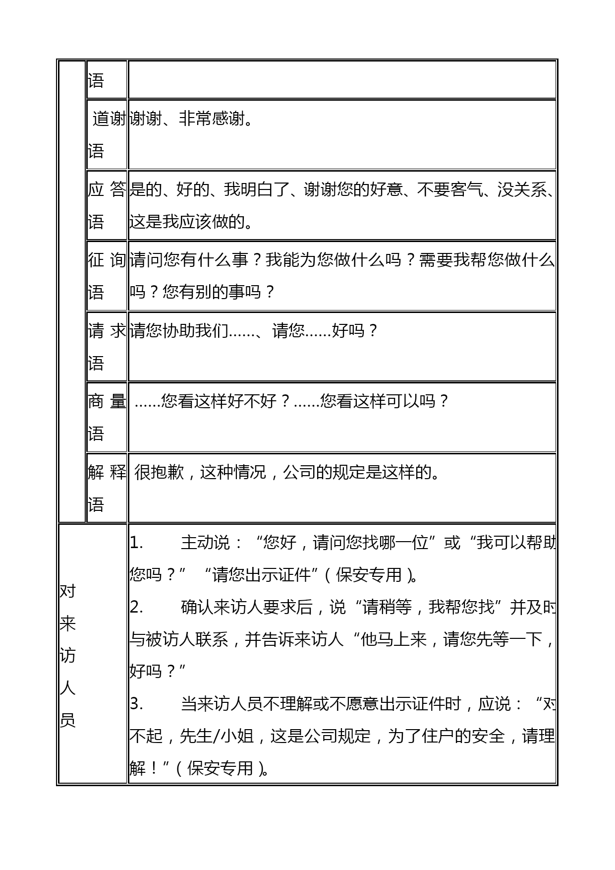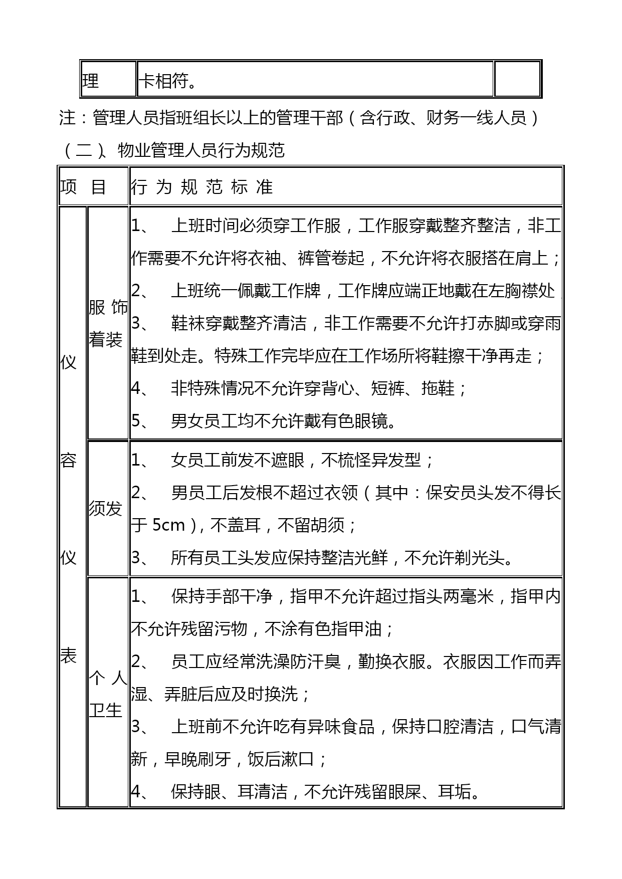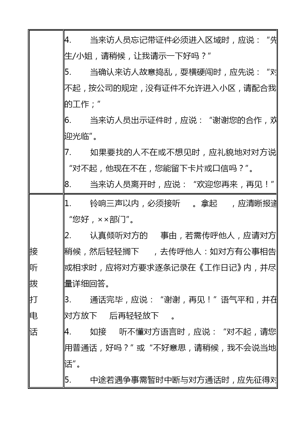 学校物业标准精品资料(完整版)资料(可以直接使用,可编辑优秀版资料,欢迎下载)高等学校物业管理服务标准随着全国高校后勤社会化改革的不断深入,为进一步推进浙江省高校后勤社会化改革的步伐,不断提升后勤管理水平和服务质量,规范全省高校物业管理服务标准及相应定额,根据国家和浙江省、市有关法律法规及行业规定,借鉴其它省市高校后勤管理的成功经验,结合我省高校实际,由浙江省高校后勤研究会物业管理专业委员会起抄讨论,浙江省高等学校后勤管理研究会审定,建议浙江省各高校参照执行。为了便于理解和把握,现就有关编制要点做以下说明:一、分类“服务标准及参考定额”共划分为12大项,其中包括:物业管理机构、物业管理人员行为规范、教学楼办公楼等保洁、教学楼办公楼等综合管理、校园环境保洁、园林绿化养护、水电暖汽设备运行管理、教学楼办公楼学生公寓房屋及设施设备小修维护、消防治安、邮政服务、校园住宅区物业管理服务、特约服务。二、编制的指导思想1、在编制中,凡与国家或浙江省相关法规接近的门类,依据法规编制标准。2、在编制中,凡没有国家或浙江省相关法规可借鉴的文件,依据浙江省高校后勤管理服务实际并广泛征求意见的基础上编制标准,包括:教学楼办公楼保洁、教学楼办公楼综合管理、校园环境绿化保洁、教学楼办公楼学生公寓房屋及设施设备小修维护、消防治安、邮政服务、特约服务。3、在门类划分及表格设计上,尽量做到细化、量化。三、适用范围“服务标准及参考定额”适用于浙江省高校除餐饮、学生公寓、外事接待以外的后勤管理服务,并作为指导性文件参照执行,不做硬性规定。四、注意事项1、物业管理费用,根据相关的参考定额与学校协商确定。2、学校应向物业管理单位提供所管服务面积的4—6‰的管理用房(不含设备用房);3、“指导标准”解释权为浙江省高校后勤研究会物业专业委员会,并将在实际运用中作补充修改。各校在参照过程中如有意见或建议,请随时采取电子邮件方式联系houqinhds@126。2021年3月(一)、物业管理机构(含独立注册企业)项目管理标准管理人员配置行政管理1、管理机构组建完整健全。2、管理规章制度健全,服务质量标准完善,物业管理档案资料齐全。3、工作计划周密,贯彻落实学校各项任务。4、定期检查各业务部门工作计划落实情况。5、每年至少进行一次物业管理服务满意率调查,促进管理服务工作的改进和提高,征求意见户数(班级、部门)不低于总户数80%;物业管理服务满意率不低于90%。6、建立公共突发事件的处理机制和应急预案。直接人员数×9%人事、宣传管理(注册企业)1、按规章制度要求办理选聘辞退手续。2、结合技术管理部门组织新员工上岗培训。3、建立员工档案,办理员工保险。4、组织年终考核评比,做好晋升和降级工作。5、组建宣传队伍,完成企业的宣传教育工作。6、有完整的人事、劳资管理系统。财务管理(注册企业)1、严格执行财务制度,账目清晰,成本核算,收支两条线。2、公开服务标准、收费依据及标准。技术管理1、制定设备设施安全运行管理制度;落实安全运行岗位责任制;2、建立完整的技术、设备档案,有定期巡回检查、维修保养、日常运行档案记录;3、建立各种设备设施突发事件的应急处理机制和预案。材料管理严格执行物资采购制度和管理制度,做到账、物、卡相符。注:管理人员指班组长以上的管理干部(含行政、财务一线人员)(二)、物业管理人员行为规范项目行为规范标准仪容仪表服饰着装1、上班时间必须穿工作服,工作服穿戴整齐整洁,非工作需要不允许将衣袖、裤管卷起,不允许将衣服搭在肩上;2、上班统一佩戴工作牌,工作牌应端正地戴在左胸襟处;3、鞋袜穿戴整齐清洁,非工作需要不允许打赤脚或穿雨鞋到处走。特殊工作完毕应在工作场所将鞋擦干净再走;4、非特殊情况不允许穿背心、短裤、拖鞋;5、男女员工均不允许戴有色眼镜。须发1、女员工前发不遮眼,不梳怪异发型;2、男员工后发根不超过衣领(其中:保安员头发不得长于5cm),不盖耳,不留胡须;3、所有员工头发应保持整洁光鲜,不允许剃光头。个人卫生1、保持手部干净,指甲不允许超过指头两毫米,指甲内不允许残留污物,不涂有色指甲油;2、员工应经常洗澡防汗臭,勤换衣服。衣服因工作而弄湿、弄脏后应及时换洗;3、上班前不允许吃有异味食品,保持口腔清洁,口气清新,早晚刷牙,饭后漱口;4、保持眼、耳清洁,不允许残留眼屎、耳垢。5、女员工应淡妆打扮,不允许浓妆艳抹,避免使用味浓的化妆品。6、每天上班前应注意检查自己的仪表,上班时不能在客人面前或公共场所整理仪容仪表,必要时应到卫生间或工作间整理。行为举止服务态度1、对客人服务无论何时都应面带笑容,和颜悦色,热情主动,做到微笑服务;2、在将客人劝离工作场所时要文明礼貌,