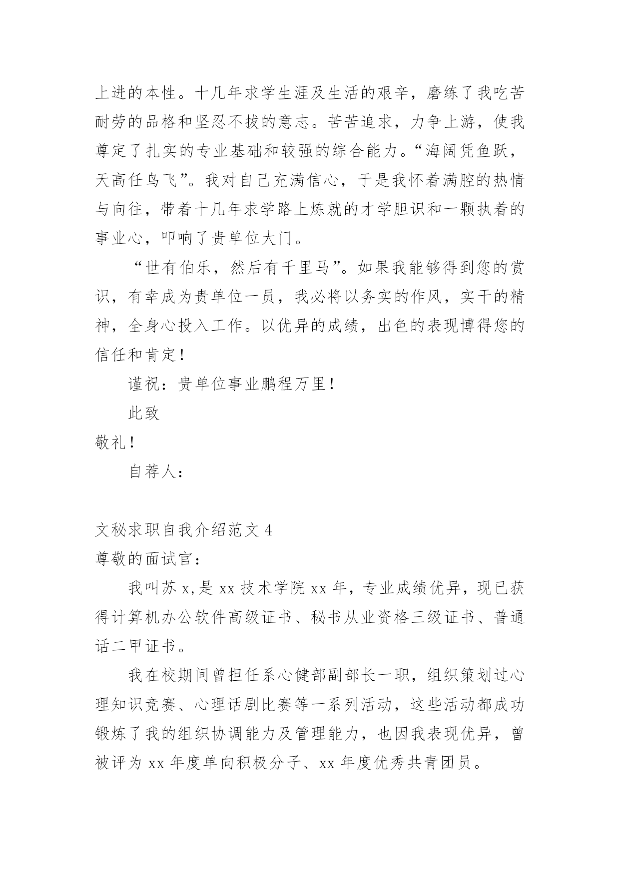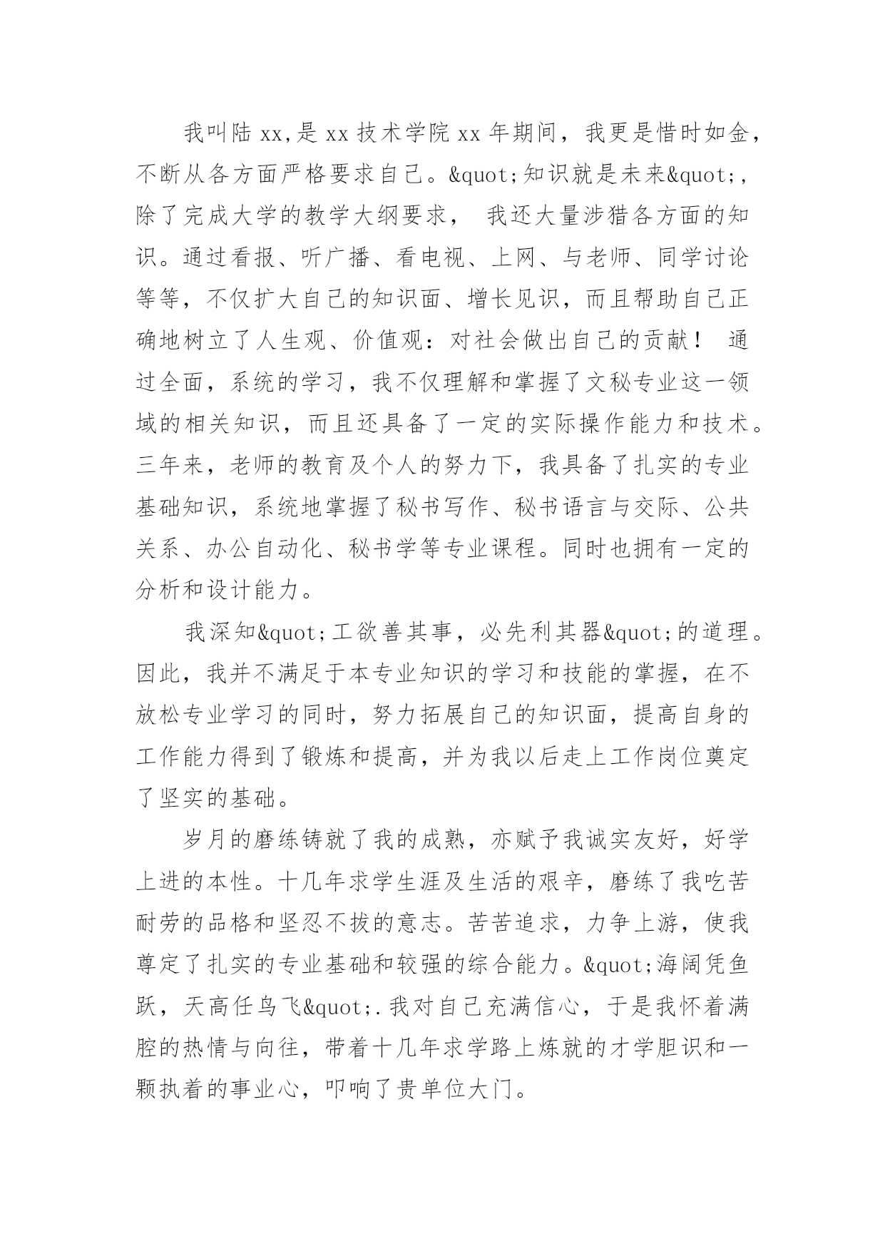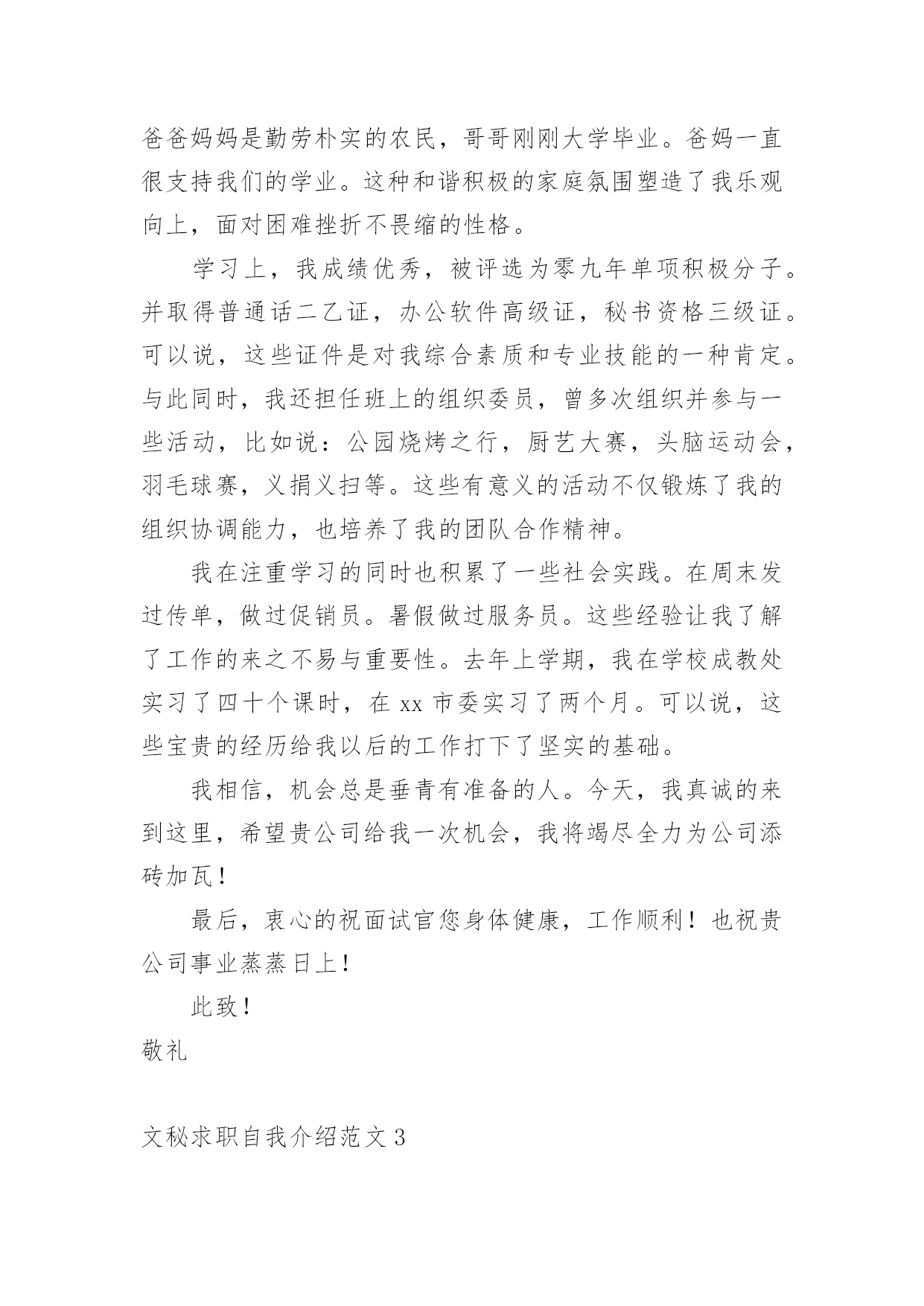 文秘求职自我介绍文秘求职自我介绍范文当换了一个新环境后,通常需要用到自我介绍,自我介绍有助于自我宣传、自我展示。怎么写自我介绍才能避免踩雷呢?以下是小编帮大家整理的文秘求职自我介绍范文,仅供参考,大家一起来看看吧。文秘求职自我介绍范文1本人英语基础扎实,具有良好的听、说、读、写、译能力,能够较好地翻译商务合同、商务信函等;已取得相关技能,拥有较强的专业实际应用能力,懂得协助总经理处理各种日常事务及与公司各部门之间的协调与沟通;并能够熟练使用excel,outlook等,打字速度70中文/分钟。性格开朗,工作积极主动,具有良好的道德修养,忠诚自律,责任心强,敬业心强,关心集体和公司发展,具有较强的沟通和协调能力。文秘求职自我介绍范文2尊敬的面试官:您好!非常感谢您在百忙之中抽空给我一次面试的机会。我叫马xx,是来自xx技术学院人文系文秘班的应届毕业生。下面我简单的介绍一下我的家庭情况。我家四口人。爸爸妈妈是勤劳朴实的农民,哥哥刚刚大学毕业。爸妈一直很支持我们的学业。这种和谐积极的家庭氛围塑造了我乐观向上,面对困难挫折不畏缩的性格。学习上,我成绩优秀,被评选为零九年单项积极分子。并取得普通话二乙证,办公软件高级证,秘书资格三级证。可以说,这些证件是对我综合素质和专业技能的一种肯定。与此同时,我还担任班上的组织委员,曾多次组织并参与一些活动,比如说:公园烧烤之行,厨艺大赛,头脑运动会,羽毛球赛,义捐义扫等。这些有意义的活动不仅锻炼了我的组织协调能力,也培养了我的团队合作精神。我在注重学习的同时也积累了一些社会实践。在周末发过传单,做过促销员。暑假做过服务员。这些经验让我了解了工作的来之不易与重要性。去年上学期,我在学校成教处实习了四十个课时,在xx市委实习了两个月。可以说,这些宝贵的经历给我以后的工作打下了坚实的基础。我相信,机会总是垂青有准备的人。今天,我真诚的来到这里,希望贵公司给我一次机会,我将竭尽全力为公司添砖加瓦!最后,衷心的祝面试官您身体健康,工作顺利!也祝贵公司事业蒸蒸日上!此致!敬礼文秘求职自我介绍范文3尊敬的面试官:您好!我叫刘xx,是xx技术学院文秘专业的20xx届毕业生。贵公司良好的形象和员工素质,并且公司处于蓬勃发展中,故冒昧前来毛遂自荐,诚盼能成为贵单位的一员。作为一名文秘专业学生,我把“基础扎实,应用灵活”作为学习的宗旨和目标。在大学三年期间,我更是惜时如金,不断从各方面严格要求自己。“知识就是未来”,除了完成大学的教学大纲要求,我还大量涉猎各方面的知识。通过看报、听广播、看电视、上网、与老师、同学讨论等等,不仅扩大自己的知识面、增长见识,而且帮助自己正确地树立了人生观、价值观:对社会做出自己的贡献!通过全面,系统的学习,我不仅理解和掌握了文秘专业这一领域的相关知识,而且还具备了一定的实际操作能力和技术。三年来,老师的教育及个人的努力下,我具备了扎实的专业基础知识,系统地掌握了秘书写作、秘书语言与交际、公共关系、办公自动化、秘书学等专业课程。同时也拥有一定的分析和设计能力。我深知“工欲善其事,必先利其器”的道理。因此,我并不满足于本专业知识的学习和技能的掌握,在不放松专业学习的同时,努力拓展自己的知识面,提高自身的工作能力得到了锻炼和提高,并为我以后走上工作岗位奠定了坚实的基础。岁月的磨练铸就了我的成熟,亦赋予我诚实友好,好学上进的本性。十几年求学生涯及生活的艰辛,磨练了我吃苦耐劳的品格和坚忍不拔的意志。苦苦追求,力争上游,使我尊定了扎实的专业基础和较强的综合能力。“海阔凭鱼跃,天高任鸟飞”。我对自己充满信心,于是我怀着满腔的热情与向往,带着十几年求学路上炼就的才学胆识和一颗执着的事业心,叩响了贵单位大门。“世有伯乐,然后有千里马”。如果我能够得到您的赏识,有幸成为贵单位一员,我必将以务实的作风,实干的精神,全身心投入工作。以优异的成绩,出色的表现博得您的信任和肯定!谨祝:贵单位事业鹏程万里!此致敬礼!自荐人:文秘求职自我介绍范文4尊敬的面试官:我叫苏x,是xx技术学院xx年,专业成绩优异,现已获得计算机办公软件高级证书、秘书从业资格三级证书、普通话二甲证书。我在校期间曾担任系心健部副部长一职,组织策划过心理知识竞赛、心理话剧比赛等一系列活动,这些活动都成功锻炼了我的组织协调能力及管理能力,也因我表现优异,曾被评为xx年度单向积极分子、xx年度优秀共青团员。我从高中开始便已经出去打暑假工,曾进厂当过质检员;在专卖店站过柜台;在茶餐厅当过服务员;这些实践经验虽与我的专业不是十分对口,但是对我的人际交往能力、适应社会的'能力、秘书行业所需要的服务意识等都有很大的提高。大学期间,xx年度至xx年度我都利用课余时间在学校人文系学办实习,系统的了解了文秘行业的工作流程;xx年底,在学校的组织下,我在xx市委办公