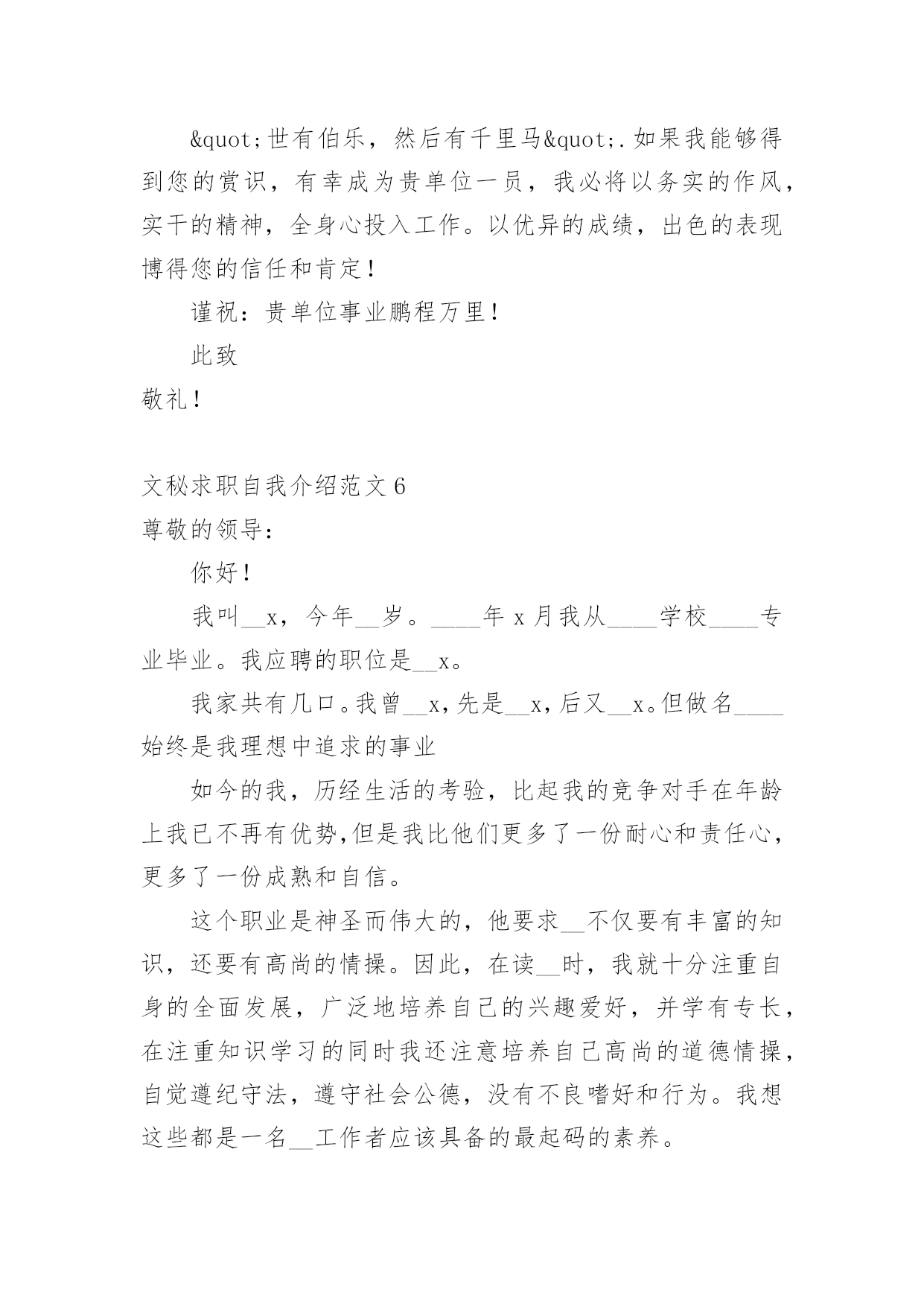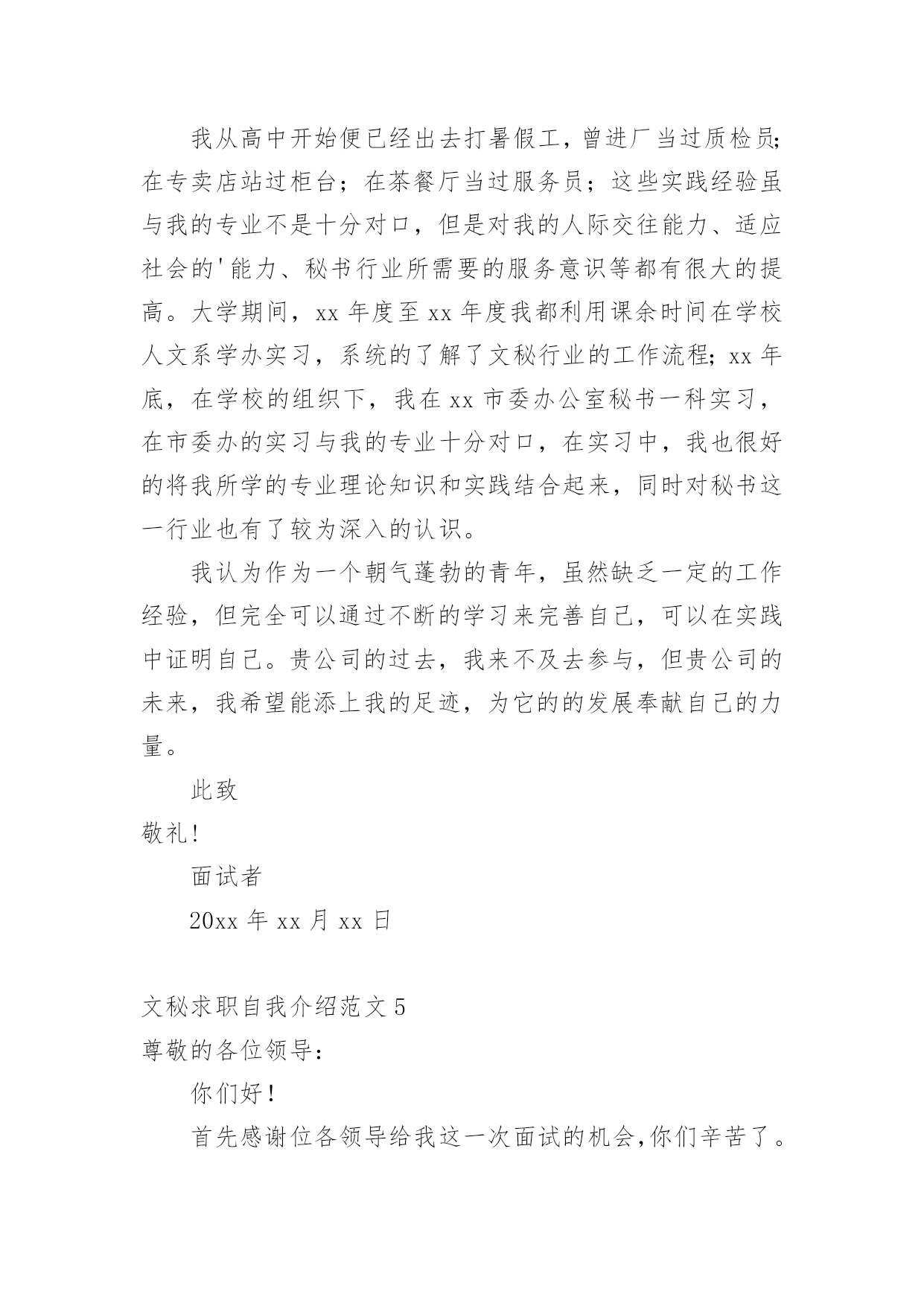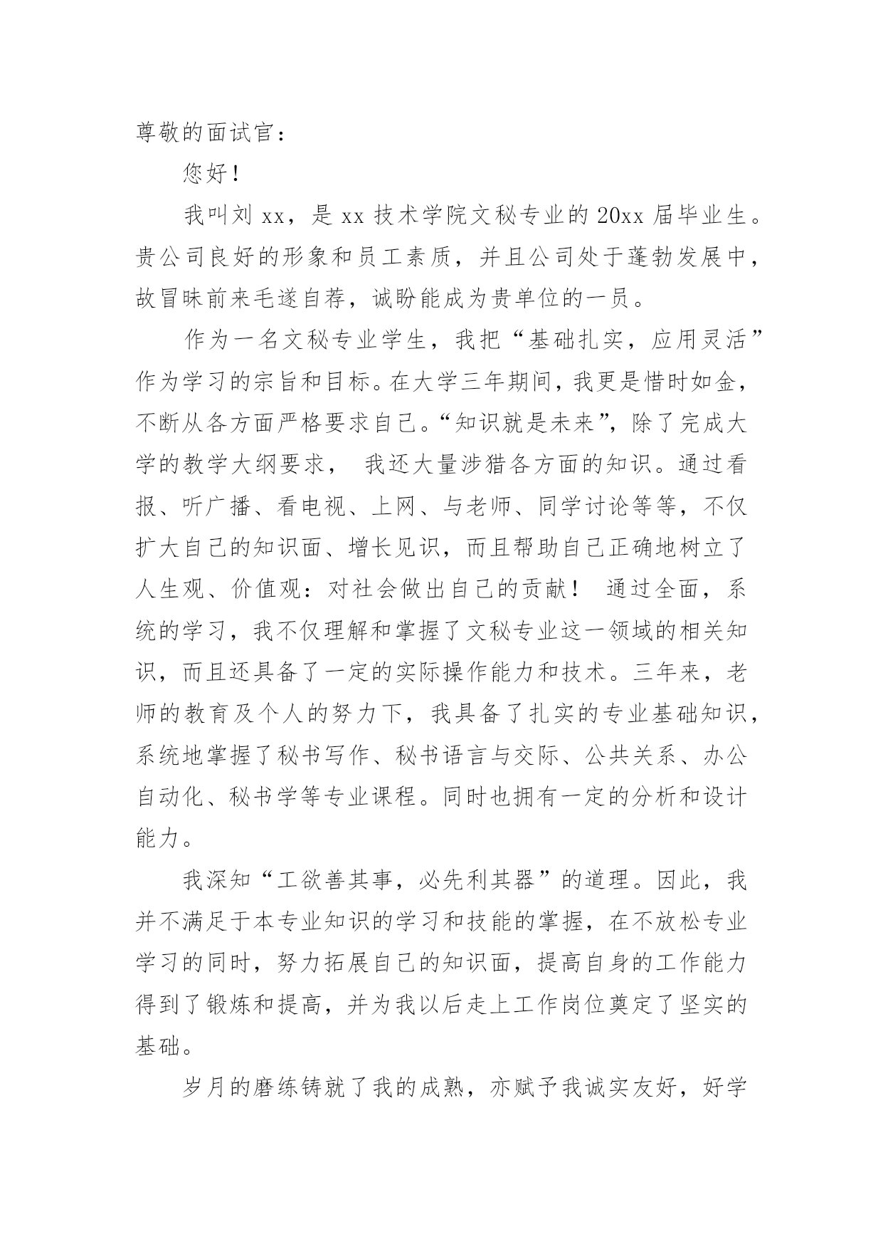 文秘求职自我介绍文秘求职自我介绍范文当换了一个新环境后,通常需要用到自我介绍,自我介绍有助于自我宣传、自我展示。怎么写自我介绍才能避免踩雷呢?以下是小编帮大家整理的文秘求职自我介绍范文,仅供参考,大家一起来看看吧。文秘求职自我介绍范文1本人英语基础扎实,具有良好的听、说、读、写、译能力,能够较好地翻译商务合同、商务信函等;已取得相关技能,拥有较强的专业实际应用能力,懂得协助总经理处理各种日常事务及与公司各部门之间的协调与沟通;并能够熟练使用excel,outlook等,打字速度70中文/分钟。性格开朗,工作积极主动,具有良好的道德修养,忠诚自律,责任心强,敬业心强,关心集体和公司发展,具有较强的沟通和协调能力。文秘求职自我介绍范文2尊敬的面试官:您好!非常感谢您在百忙之中抽空给我一次面试的机会。我叫马xx,是来自xx技术学院人文系文秘班的应届毕业生。下面我简单的介绍一下我的家庭情况。我家四口人。爸爸妈妈是勤劳朴实的农民,哥哥刚刚大学毕业。爸妈一直很支持我们的学业。这种和谐积极的家庭氛围塑造了我乐观向上,面对困难挫折不畏缩的性格。学习上,我成绩优秀,被评选为零九年单项积极分子。并取得普通话二乙证,办公软件高级证,秘书资格三级证。可以说,这些证件是对我综合素质和专业技能的一种肯定。与此同时,我还担任班上的组织委员,曾多次组织并参与一些活动,比如说:公园烧烤之行,厨艺大赛,头脑运动会,羽毛球赛,义捐义扫等。这些有意义的活动不仅锻炼了我的组织协调能力,也培养了我的团队合作精神。我在注重学习的同时也积累了一些社会实践。在周末发过传单,做过促销员。暑假做过服务员。这些经验让我了解了工作的来之不易与重要性。去年上学期,我在学校成教处实习了四十个课时,在xx市委实习了两个月。可以说,这些宝贵的经历给我以后的工作打下了坚实的基础。我相信,机会总是垂青有准备的人。今天,我真诚的来到这里,希望贵公司给我一次机会,我将竭尽全力为公司添砖加瓦!最后,衷心的祝面试官您身体健康,工作顺利!也祝贵公司事业蒸蒸日上!此致!敬礼文秘求职自我介绍范文3尊敬的面试官:您好!我叫刘xx,是xx技术学院文秘专业的20xx届毕业生。贵公司良好的形象和员工素质,并且公司处于蓬勃发展中,故冒昧前来毛遂自荐,诚盼能成为贵单位的一员。作为一名文秘专业学生,我把“基础扎实,应用灵活”作为学习的宗旨和目标。在大学三年期间,我更是惜时如金,不断从各方面严格要求自己。“知识就是未来”,除了完成大学的教学大纲要求,我还大量涉猎各方面的知识。通过看报、听广播、看电视、上网、与老师、同学讨论等等,不仅扩大自己的知识面、增长见识,而且帮助自己正确地树立了人生观、价值观:对社会做出自己的贡献!通过全面,系统的学习,我不仅理解和掌握了文秘专业这一领域的相关知识,而且还具备了一定的实际操作能力和技术。三年来,老师的教育及个人的努力下,我具备了扎实的专业基础知识,系统地掌握了秘书写作、秘书语言与交际、公共关系、办公自动化、秘书学等专业课程。同时也拥有一定的分析和设计能力。我深知“工欲善其事,必先利其器”的道理。因此,我并不满足于本专业知识的学习和技能的掌握,在不放松专业学习的同时,努力拓展自己的知识面,提高自身的工作能力得到了锻炼和提高,并为我以后走上工作岗位奠定了坚实的基础。岁月的磨练铸就了我的成熟,亦赋予我诚实友好,好学上进的本性。十几年求学生涯及生活的艰辛,磨练了我吃苦耐劳的品格和坚忍不拔的意志。苦苦追求,力争上游,使我尊定了扎实的专业基础和较强的综合能力。“海阔凭鱼跃,天高任鸟飞”。我对自己充满信心,于是我怀着满腔的热情与向往,带着十几年求学路上炼就的才学胆识和一颗执着的事业心,叩响了贵单位大门。“世有伯乐,然后有千里马”。如果我能够得到您的赏识,有幸成为贵单位一员,我必将以务实的作风,实干的精神,全身心投入工作。以优异的成绩,出色的表现博得您的信任和肯定!谨祝:贵单位事业鹏程万里!此致敬礼!自荐人:文秘求职自我介绍范文4尊敬的面试官:我叫苏x,是xx技术学院xx年,专业成绩优异,现已获得计算机办公软件高级证书、秘书从业资格三级证书、普通话二甲证书。我在校期间曾担任系心健部副部长一职,组织策划过心理知识竞赛、心理话剧比赛等一系列活动,这些活动都成功锻炼了我的组织协调能力及管理能力,也因我表现优异,曾被评为xx年度单向积极分子、xx年度优秀共青团员。我从高中开始便已经出去打暑假工,曾进厂当过质检员;在专卖店站过柜台;在茶餐厅当过服务员;这些实践经验虽与我的专业不是十分对口,但是对我的人际交往能力、适应社会的'能力、秘书行业所需要的服务意识等都有很大的提高。大学期间,xx年度至xx年度我都利用课余时间在学校人文系学办实习,系统的了解了文秘行业的工作流程;xx年底,在学校的组织下,我在xx市委办公