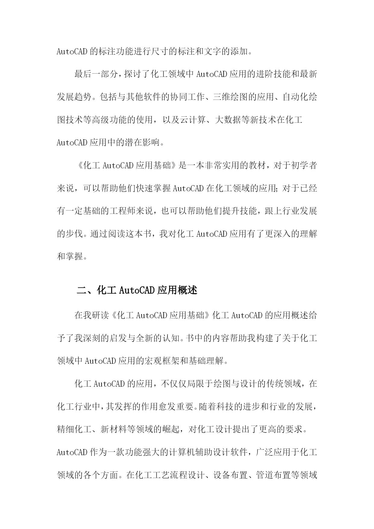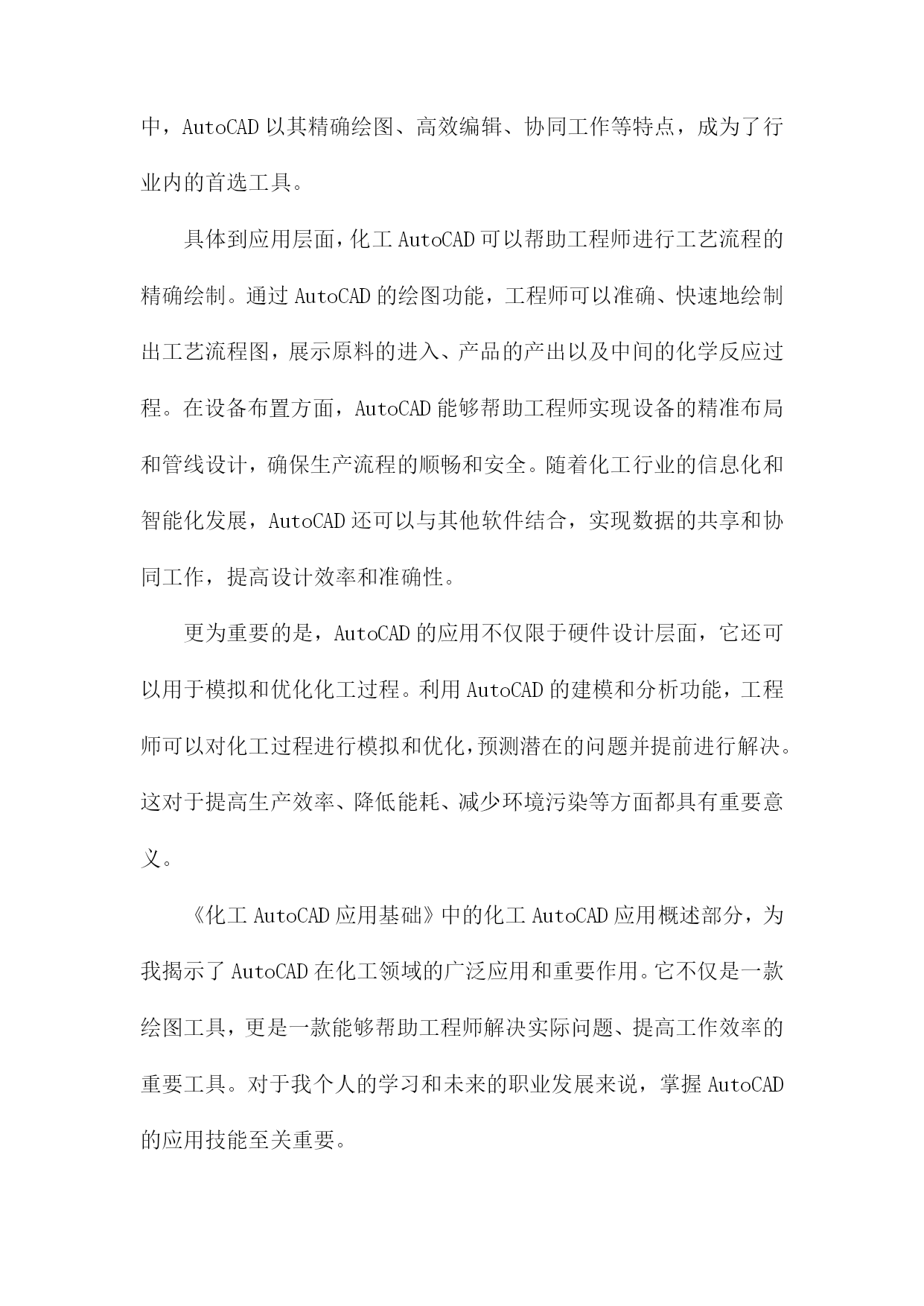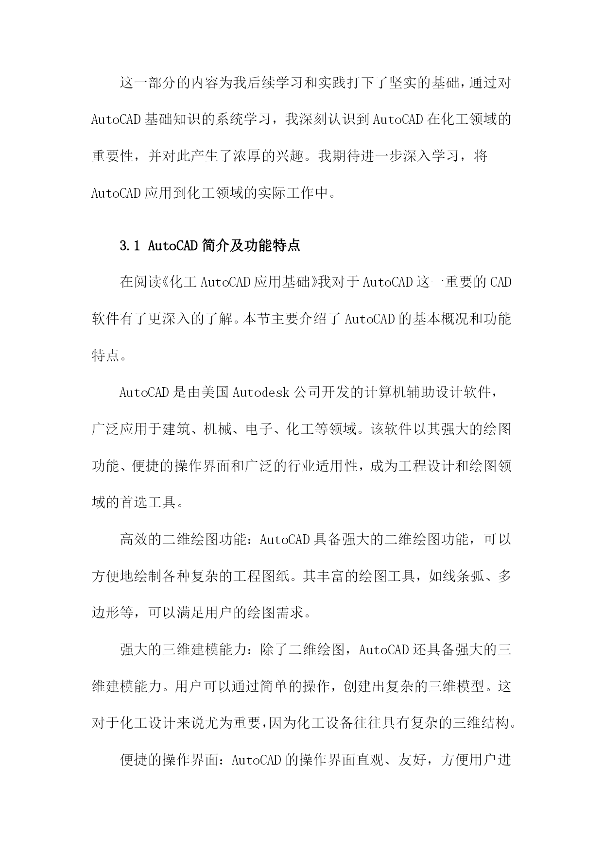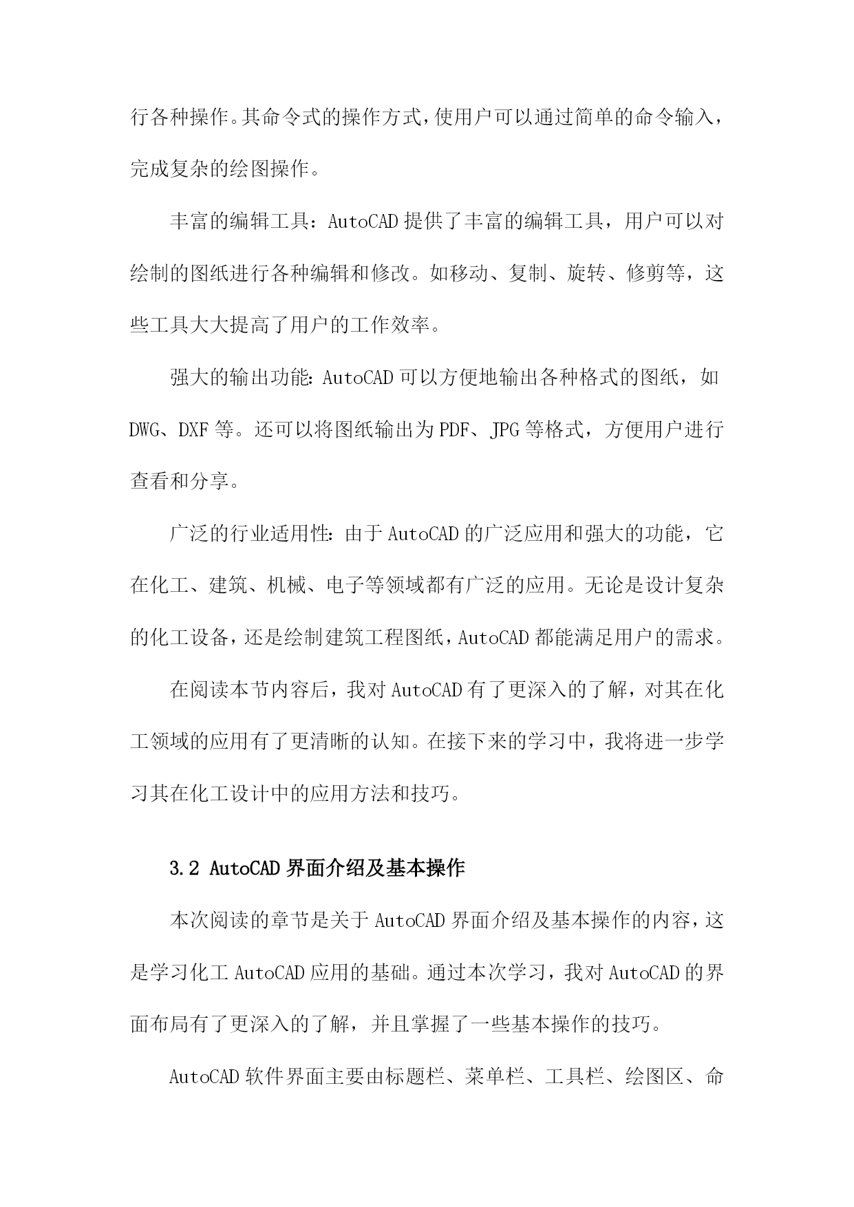 《化工AutoCAD应用基础》阅读札记一、内容描述本书《化工AutoCAD应用基础》是一部关于AutoCAD在化工领域应用的入门教材。该书详细介绍了AutoCAD在化工设计中的应用方法和技巧,包括软件的基本操作、化工图形的绘制、修改和优化等方面。全书内容组织逻辑清晰,适合化工领域的初学者和需要提升AutoCAD应用技能的工程师阅读。主要介绍了AutoCAD软件的安装、启动和界面概述。讲解了软件的基本操作,如文件的新建、保存、打开和关闭等。详细阐述了软件的一些基础功能,如绘图工具、编辑工具、查看工具等的使用方法。这部分内容为读者打下了坚实的软件操作基础。重点讲述了如何利用AutoCAD进行化工图形的绘制。从基本的线条、圆形、矩形等图形元素的绘制,到复杂的工艺流程图、设备布置图等的绘制,都进行了详细的介绍。书中还介绍了如何通过图层管理、块的使用等方式提高绘图效率。主要介绍了化工图形的修改和优化,包括如何修改已绘制的图形,如调整大小、位置、角度等;如何进行图形的优化,如使用线型、线宽、颜色等视觉元素提升图形的美观度和清晰度。还介绍了如何通过AutoCAD的标注功能进行尺寸的标注和文字的添加。最后一部分,探讨了化工领域中AutoCAD应用的进阶技能和最新发展趋势。包括与其他软件的协同工作、三维绘图的应用、自动化绘图技术等高级功能的使用,以及云计算、大数据等新技术在化工AutoCAD应用中的潜在影响。《化工AutoCAD应用基础》是一本非常实用的教材,对于初学者来说,可以帮助他们快速掌握AutoCAD在化工领域的应用;对于已经有一定基础的工程师来说,也可以帮助他们提升技能,跟上行业发展的步伐。通过阅读这本书,我对化工AutoCAD应用有了更深入的理解和掌握。二、化工AutoCAD应用概述在我研读《化工AutoCAD应用基础》化工AutoCAD的应用概述给予了我深刻的启发与全新的认知。书中的内容帮助我构建了关于化工领域中AutoCAD应用的宏观框架和基础理解。化工AutoCAD的应用,不仅仅局限于绘图与设计的传统领域,在化工行业中,其发挥的作用愈发重要。随着科技的进步和行业的发展,精细化工、新材料等领域的崛起,对化工设计提出了更高的要求。AutoCAD作为一款功能强大的计算机辅助设计软件,广泛应用于化工领域的各个方面。在化工工艺流程设计、设备布置、管道布置等领域中,AutoCAD以其精确绘图、高效编辑、协同工作等特点,成为了行业内的首选工具。具体到应用层面,化工AutoCAD可以帮助工程师进行工艺流程的精确绘制。通过AutoCAD的绘图功能,工程师可以准确、快速地绘制出工艺流程图,展示原料的进入、产品的产出以及中间的化学反应过程。在设备布置方面,AutoCAD能够帮助工程师实现设备的精准布局和管线设计,确保生产流程的顺畅和安全。随着化工行业的信息化和智能化发展,AutoCAD还可以与其他软件结合,实现数据的共享和协同工作,提高设计效率和准确性。更为重要的是,AutoCAD的应用不仅限于硬件设计层面,它还可以用于模拟和优化化工过程。利用AutoCAD的建模和分析功能,工程师可以对化工过程进行模拟和优化,预测潜在的问题并提前进行解决。这对于提高生产效率、降低能耗、减少环境污染等方面都具有重要意义。《化工AutoCAD应用基础》中的化工AutoCAD应用概述部分,为我揭示了AutoCAD在化工领域的广泛应用和重要作用。它不仅是一款绘图工具,更是一款能够帮助工程师解决实际问题、提高工作效率的重要工具。对于我个人的学习和未来的职业发展来说,掌握AutoCAD的应用技能至关重要。三、AutoCAD基础知识在我研读《化工AutoCAD应用基础》第三部分——AutoCAD基础知识,是极其重要的章节。这一部分详细介绍了AutoCAD的基本功能、界面布局、基本操作以及工具应用等,为我在化工领域中应用AutoCAD奠定了坚实的基础。AutoCAD作为一款广泛应用于工业设计、建筑设计等领域的计算机辅助设计软件,其功能强大且多样化。在这一部分,书中详细阐述了AutoCAD的绘图、编辑、查看、输出等基本功能,使我对其有了全面的了解。AutoCAD的界面布局设计合理,各个部分功能明确。书中对界面中的菜单栏、工具栏、命令行、状态栏等进行了详细的介绍,并对如何进行界面自定义进行了指导,使我对AutoCAD的操作更加熟练。这一部分详细介绍了如何使用AutoCAD进行绘图。包括如何创建和保存文件、如何设置图层和属性、如何进行视图控制等。书中还提供了大量的实例和图解,使我对这些基本操作有了深入的理解和掌握。工具的应用是AutoCAD绘图的核心。书中对绘图工具、编辑工具、查询工具等进行了详细的介绍,并强调了工具的使用方法和注意事项。还介绍了如