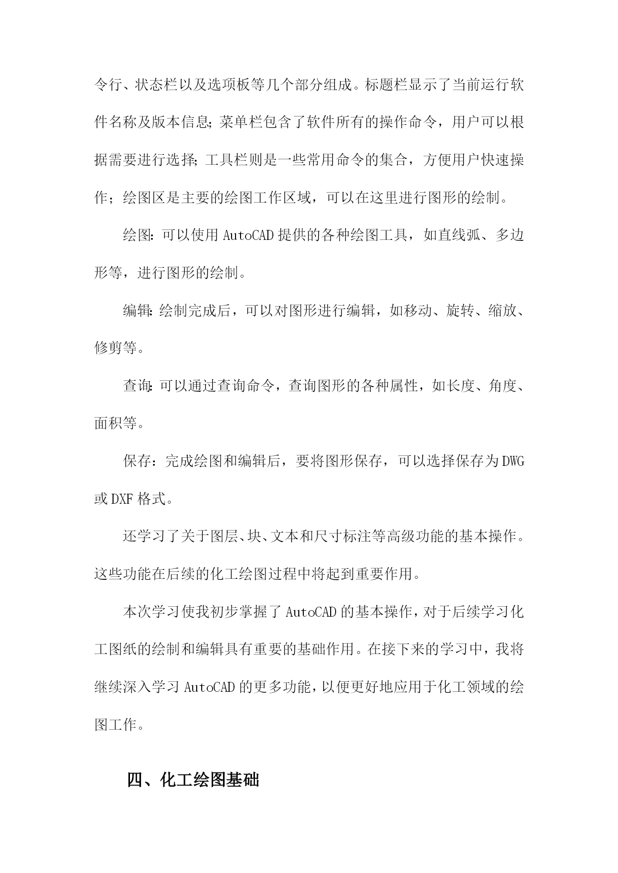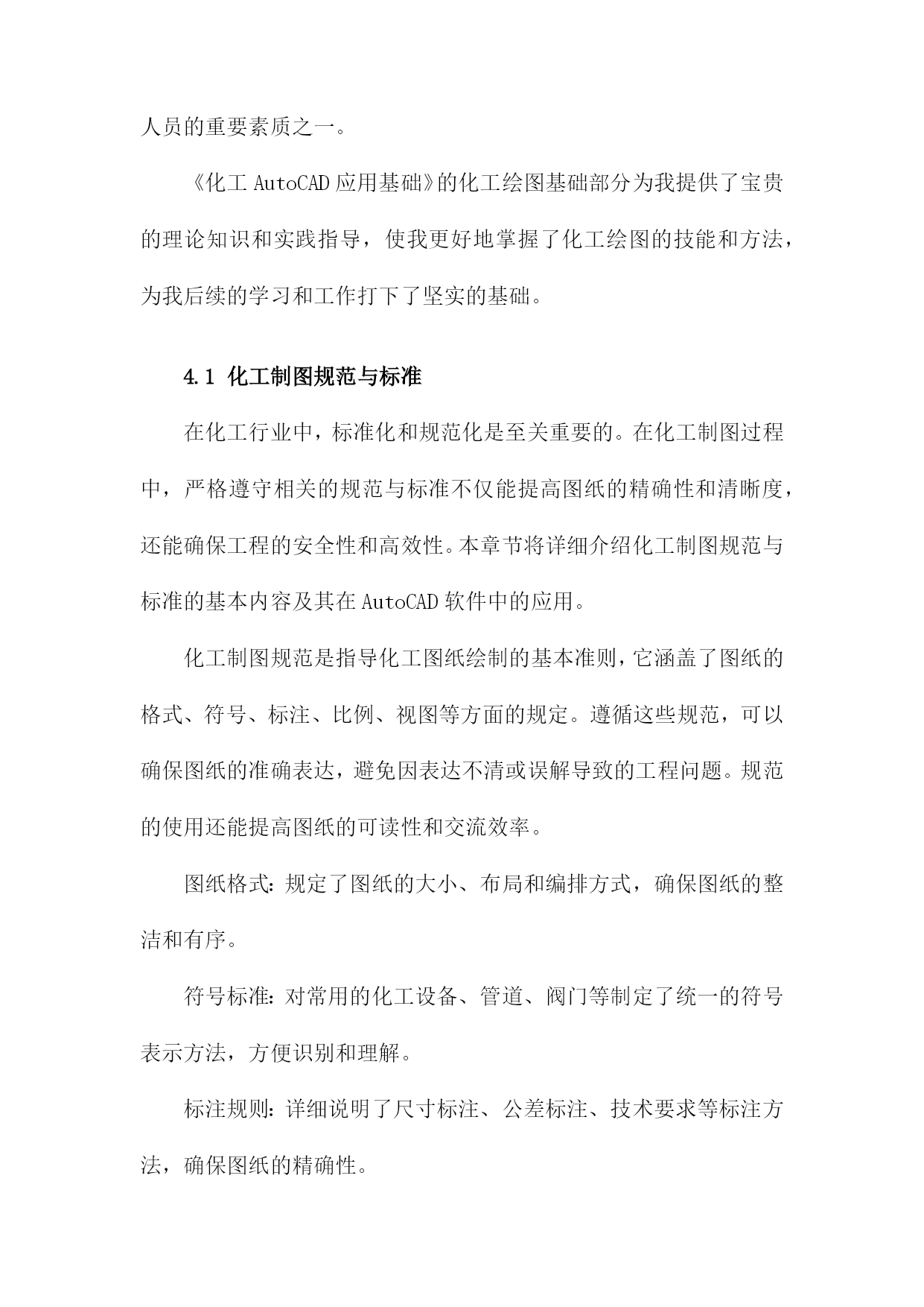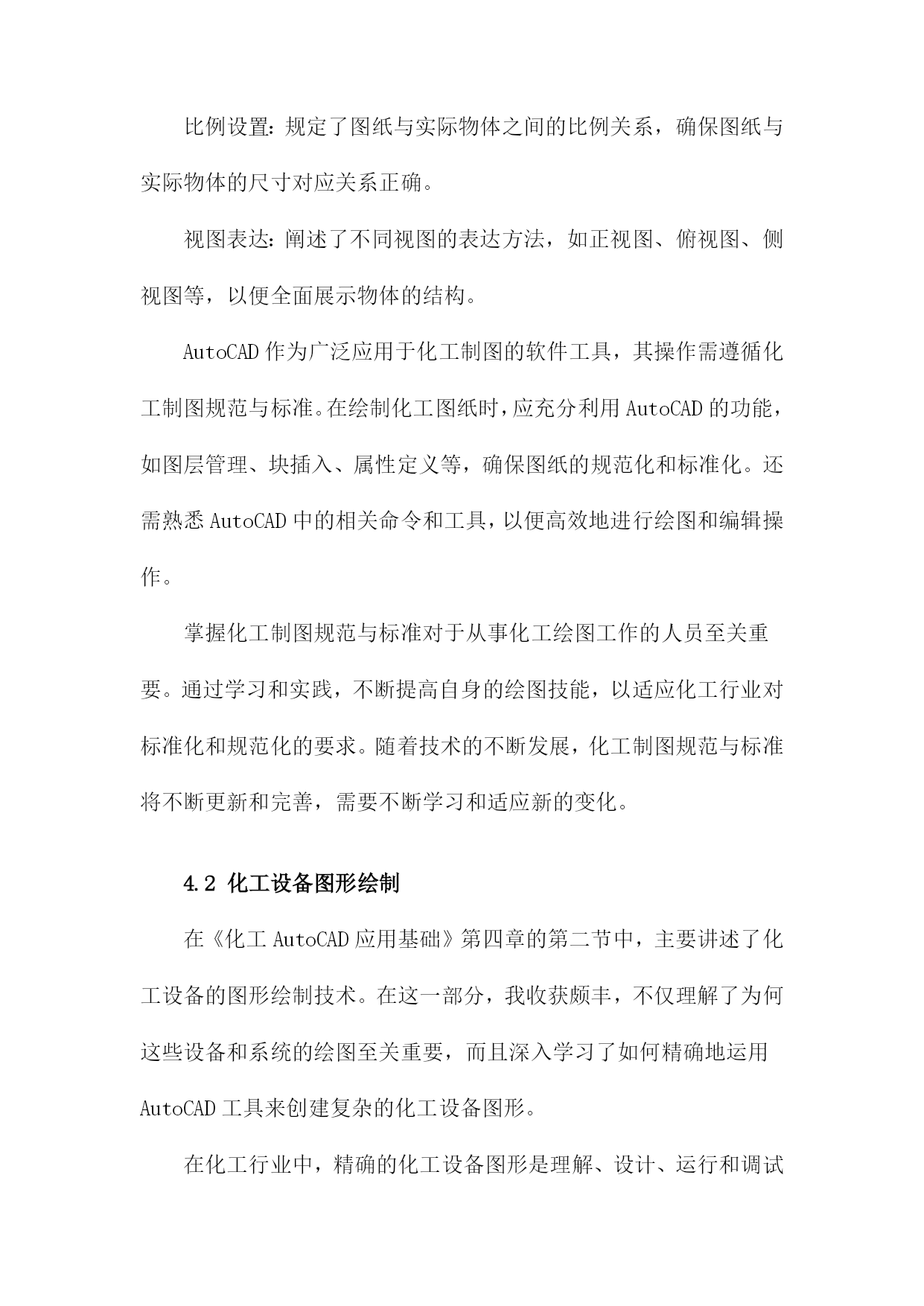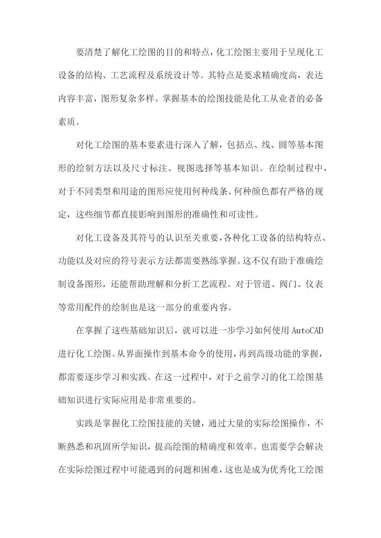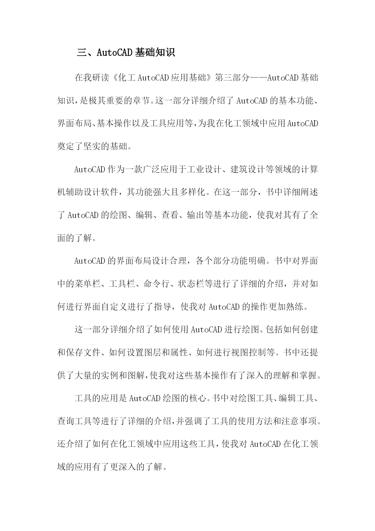 《化工AutoCAD应用基础》阅读札记一、内容描述本书《化工AutoCAD应用基础》是一部关于AutoCAD在化工领域应用的入门教材。该书详细介绍了AutoCAD在化工设计中的应用方法和技巧,包括软件的基本操作、化工图形的绘制、修改和优化等方面。全书内容组织逻辑清晰,适合化工领域的初学者和需要提升AutoCAD应用技能的工程师阅读。主要介绍了AutoCAD软件的安装、启动和界面概述。讲解了软件的基本操作,如文件的新建、保存、打开和关闭等。详细阐述了软件的一些基础功能,如绘图工具、编辑工具、查看工具等的使用方法。这部分内容为读者打下了坚实的软件操作基础。重点讲述了如何利用AutoCAD进行化工图形的绘制。从基本的线条、圆形、矩形等图形元素的绘制,到复杂的工艺流程图、设备布置图等的绘制,都进行了详细的介绍。书中还介绍了如何通过图层管理、块的使用等方式提高绘图效率。主要介绍了化工图形的修改和优化,包括如何修改已绘制的图形,如调整大小、位置、角度等;如何进行图形的优化,如使用线型、线宽、颜色等视觉元素提升图形的美观度和清晰度。还介绍了如何通过AutoCAD的标注功能进行尺寸的标注和文字的添加。最后一部分,探讨了化工领域中AutoCAD应用的进阶技能和最新发展趋势。包括与其他软件的协同工作、三维绘图的应用、自动化绘图技术等高级功能的使用,以及云计算、大数据等新技术在化工AutoCAD应用中的潜在影响。《化工AutoCAD应用基础》是一本非常实用的教材,对于初学者来说,可以帮助他们快速掌握AutoCAD在化工领域的应用;对于已经有一定基础的工程师来说,也可以帮助他们提升技能,跟上行业发展的步伐。通过阅读这本书,我对化工AutoCAD应用有了更深入的理解和掌握。二、化工AutoCAD应用概述在我研读《化工AutoCAD应用基础》化工AutoCAD的应用概述给予了我深刻的启发与全新的认知。书中的内容帮助我构建了关于化工领域中AutoCAD应用的宏观框架和基础理解。化工AutoCAD的应用,不仅仅局限于绘图与设计的传统领域,在化工行业中,其发挥的作用愈发重要。随着科技的进步和行业的发展,精细化工、新材料等领域的崛起,对化工设计提出了更高的要求。AutoCAD作为一款功能强大的计算机辅助设计软件,广泛应用于化工领域的各个方面。在化工工艺流程设计、设备布置、管道布置等领域中,AutoCAD以其精确绘图、高效编辑、协同工作等特点,成为了行业内的首选工具。具体到应用层面,化工AutoCAD可以帮助工程师进行工艺流程的精确绘制。通过AutoCAD的绘图功能,工程师可以准确、快速地绘制出工艺流程图,展示原料的进入、产品的产出以及中间的化学反应过程。在设备布置方面,AutoCAD能够帮助工程师实现设备的精准布局和管线设计,确保生产流程的顺畅和安全。随着化工行业的信息化和智能化发展,AutoCAD还可以与其他软件结合,实现数据的共享和协同工作,提高设计效率和准确性。更为重要的是,AutoCAD的应用不仅限于硬件设计层面,它还可以用于模拟和优化化工过程。利用AutoCAD的建模和分析功能,工程师可以对化工过程进行模拟和优化,预测潜在的问题并提前进行解决。这对于提高生产效率、降低能耗、减少环境污染等方面都具有重要意义。《化工AutoCAD应用基础》中的化工AutoCAD应用概述部分,为我揭示了AutoCAD在化工领域的广泛应用和重要作用。它不仅是一款绘图工具,更是一款能够帮助工程师解决实际问题、提高工作效率的重要工具。对于我个人的学习和未来的职业发展来说,掌握AutoCAD的应用技能至关重要。三、AutoCAD基础知识在我研读《化工AutoCAD应用基础》第三部分——AutoCAD基础知识,是极其重要的章节。这一部分详细介绍了AutoCAD的基本功能、界面布局、基本操作以及工具应用等,为我在化工领域中应用AutoCAD奠定了坚实的基础。AutoCAD作为一款广泛应用于工业设计、建筑设计等领域的计算机辅助设计软件,其功能强大且多样化。在这一部分,书中详细阐述了AutoCAD的绘图、编辑、查看、输出等基本功能,使我对其有了全面的了解。AutoCAD的界面布局设计合理,各个部分功能明确。书中对界面中的菜单栏、工具栏、命令行、状态栏等进行了详细的介绍,并对如何进行界面自定义进行了指导,使我对AutoCAD的操作更加熟练。这一部分详细介绍了如何使用AutoCAD进行绘图。包括如何创建和保存文件、如何设置图层和属性、如何进行视图控制等。书中还提供了大量的实例和图解,使我对这些基本操作有了深入的理解和掌握。工具的应用是AutoCAD绘图的核心。书中对绘图工具、编辑工具、查询工具等进行了详细的介绍,并强调了工具的使用方法和注意事项。还介绍了如