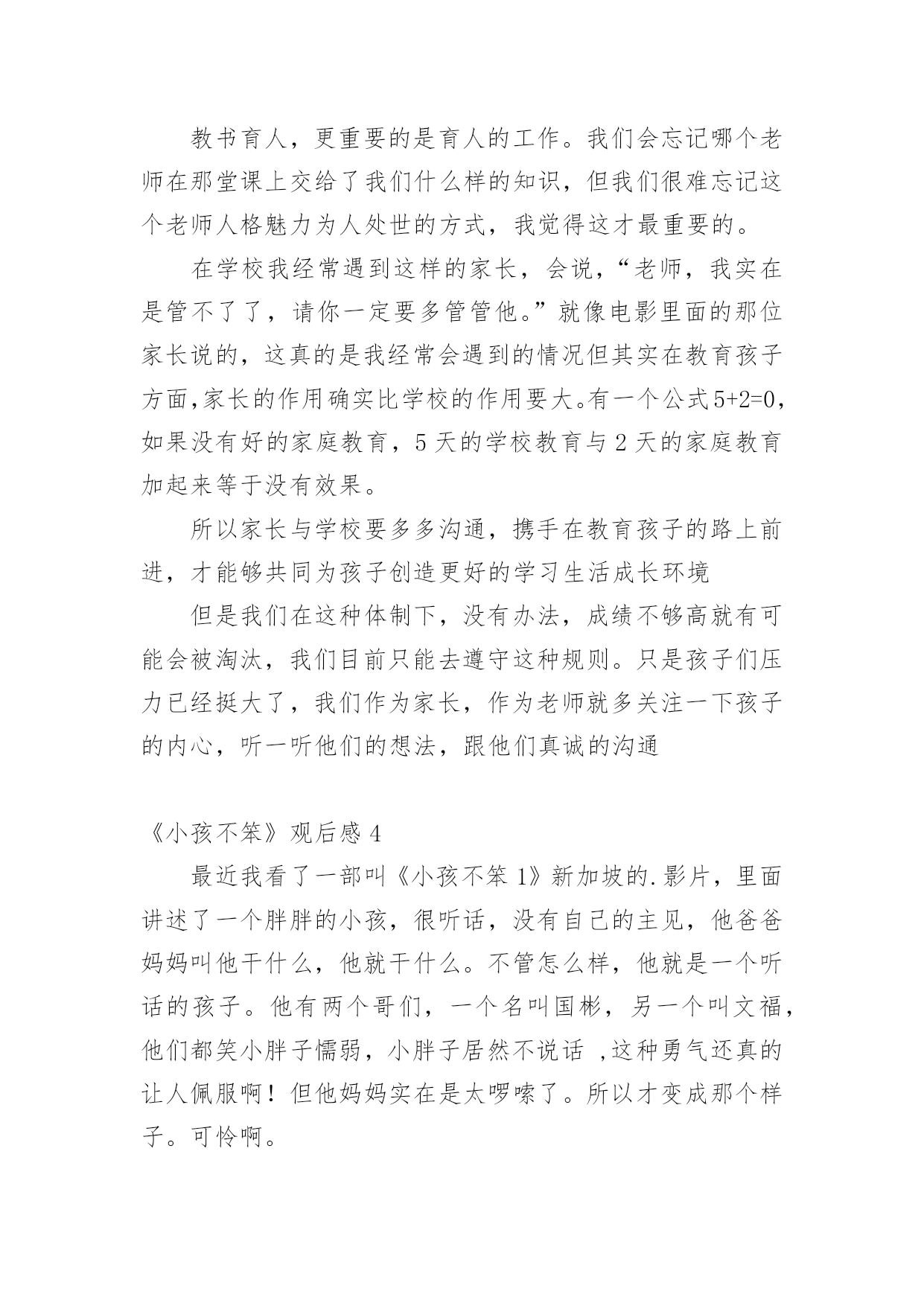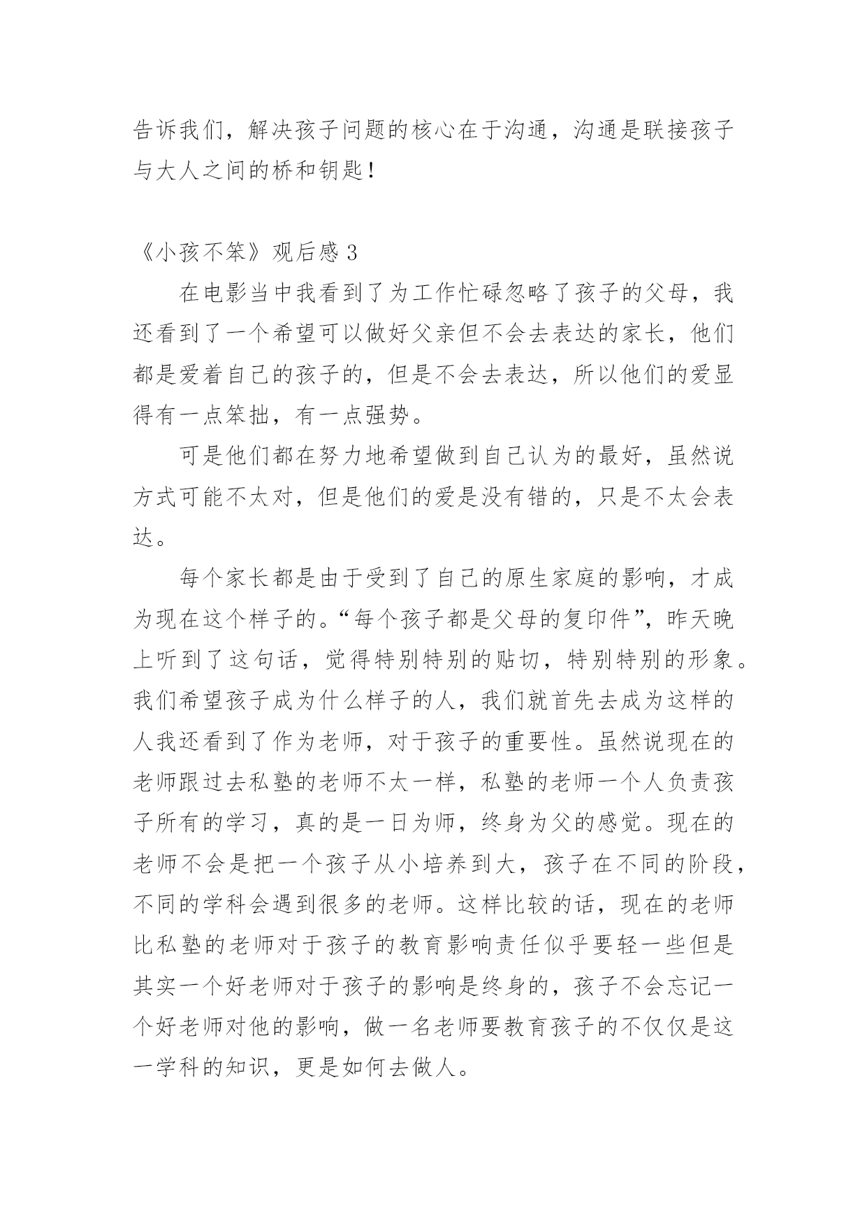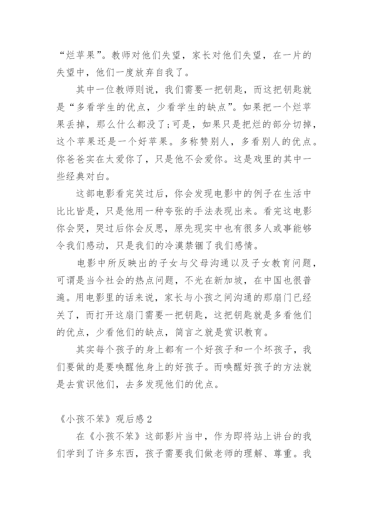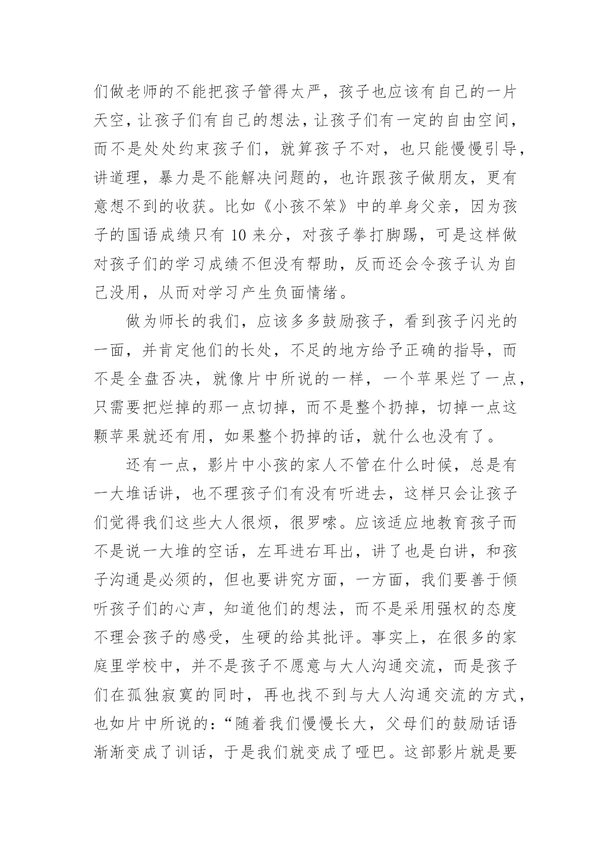 《小孩不笨》观后感当看完一部影视作品后,一定有很多值得分享的心得吧,是时候静下心来好好写写观后感了。可能你现在毫无头绪吧,下面是小编为大家整理的《小孩不笨》观后感,仅供参考,大家一起来看看吧。《小孩不笨》观后感1“你最终一次称赞别人是在什么时候?你最终一次被人称赞又是在什么时候?很久,对吗?”这是《小孩不笨2》开场对白。整个故事所要表达的讯息是亲子之间的沟通问题以及教育问题。三个小孩之中,学谦及其弟杰利的家庭背景是相当富裕的,父母亲都是忙碌的上班一族。他们的父母亲以为给与孩子物质上的满足就是等于为孩子好。很多时候,家长都是一厢情愿的,因为家长根本都不了解孩子。在很多情景下,家长在说个不停或不分青红皂白责骂孩子,当孩子欲加解释,却被告以“顶嘴”的罪名。小孩的要求有时候只是很简单,他可能只想要父母亲出席观看他的学校演出;他可能只是想要父母亲的肯定与鼓励;他可能只想要父母亲抽出一个不受打扰的一个小时。电影中的这三位小孩在学校都不是精英班,而被认为是不会读书的寄生虫。在学校教师的眼中,他们都是一个个的“烂苹果”。教师对他们失望,家长对他们失望,在一片的失望中,他们一度放弃自我了。其中一位教师则说,我们需要一把钥匙,而这把钥匙就是“多看学生的优点,少看学生的缺点”。如果把一个烂苹果丢掉,那么什么都没了;可是,如果只是把烂的部分切掉,这个苹果还是一个好苹果。多称赞别人,多看别人的优点。你爸爸实在太爱你了,只是他不会爱你。这是戏里的其中一些经典对白。这部电影看完笑过后,你会发现电影中的例子在生活中比比皆是,只是他用一种夸张的手法表现出来。看完这电影你会哭,哭过后你会反思,原先现实中也有很多人或事能够令我们感动,只是我们的冷漠禁锢了我们感情。电影中所反映出的子女与父母沟通以及子女教育问题,可谓是当今社会的热点问题,不光在新加坡,在中国也很普遍。用电影里的话来说,家长与小孩之间沟通的那扇门已经关了,而打开这扇门需要一把钥匙,这把钥匙就是多看他们的优点,少看他们的缺点,简言之就是赏识教育。其实每个孩子的身上都有一个好孩子和一个坏孩子,我们要做的是要唤醒他身上的好孩子。而唤醒好孩子的方法就是去赏识他们,去多发现他们的优点。《小孩不笨》观后感2在《小孩不笨》这部影片当中,作为即将站上讲台的我们学到了许多东西,孩子需要我们做老师的理解、尊重。我们做老师的不能把孩子管得太严,孩子也应该有自己的一片天空,让孩子们有自己的想法,让孩子们有一定的自由空间,而不是处处约束孩子们,就算孩子不对,也只能慢慢引导,讲道理,暴力是不能解决问题的,也许跟孩子做朋友,更有意想不到的收获。比如《小孩不笨》中的单身父亲,因为孩子的国语成绩只有10来分,对孩子拳打脚踢,可是这样做对孩子们的学习成绩不但没有帮助,反而还会令孩子认为自己没用,从而对学习产生负面情绪。做为师长的我们,应该多多鼓励孩子,看到孩子闪光的一面,并肯定他们的长处,不足的地方给予正确的指导,而不是全盘否决,就像片中所说的一样,一个苹果烂了一点,只需要把烂掉的那一点切掉,而不是整个扔掉,切掉一点这颗苹果就还有用,如果整个扔掉的话,就什么也没有了。还有一点,影片中小孩的家人不管在什么时候,总是有一大堆话讲,也不理孩子们有没有听进去,这样只会让孩子们觉得我们这些大人很烦,很罗嗦。应该适应地教育孩子而不是说一大堆的空话,左耳进右耳出,讲了也是白讲,和孩子沟通是必须的,但也要讲究方面,一方面,我们要善于倾听孩子们的心声,知道他们的想法,而不是采用强权的态度不理会孩子的感受,生硬的给其批评。事实上,在很多的家庭里学校中,并不是孩子不愿意与大人沟通交流,而是孩子们在孤独寂寞的同时,再也找不到与大人沟通交流的方式,也如片中所说的:“随着我们慢慢长大,父母们的鼓励话语渐渐变成了训话,于是我们就变成了哑巴。这部影片就是要告诉我们,解决孩子问题的核心在于沟通,沟通是联接孩子与大人之间的桥和钥匙!《小孩不笨》观后感3在电影当中我看到了为工作忙碌忽略了孩子的父母,我还看到了一个希望可以做好父亲但不会去表达的家长,他们都是爱着自己的孩子的,但是不会去表达,所以他们的爱显得有一点笨拙,有一点强势。可是他们都在努力地希望做到自己认为的最好,虽然说方式可能不太对,但是他们的爱是没有错的,只是不太会表达。每个家长都是由于受到了自己的原生家庭的影响,才成为现在这个样子的。“每个孩子都是父母的复印件”,昨天晚上听到了这句话,觉得特别特别的贴切,特别特别的形象。我们希望孩子成为什么样子的人,我们就首先去成为这样的人我还看到了作为老师,对于孩子的重要性。虽然说现在的老师跟过去私塾的老师不太一样,私塾的老师一个人负责孩子所有的学习,真的是一日为师,终身为父的感觉。现在的老师不会是把一个孩子从小培养到大,孩子在不同的阶段,不同的学科会遇到很多的老师。这样比