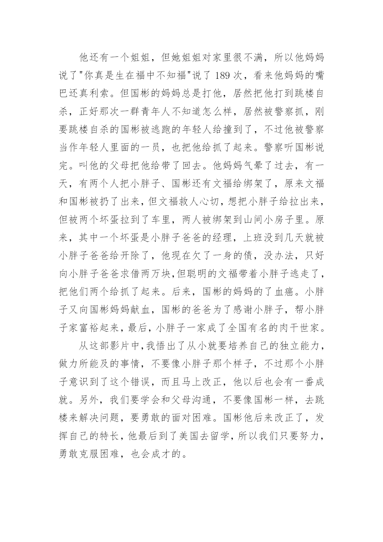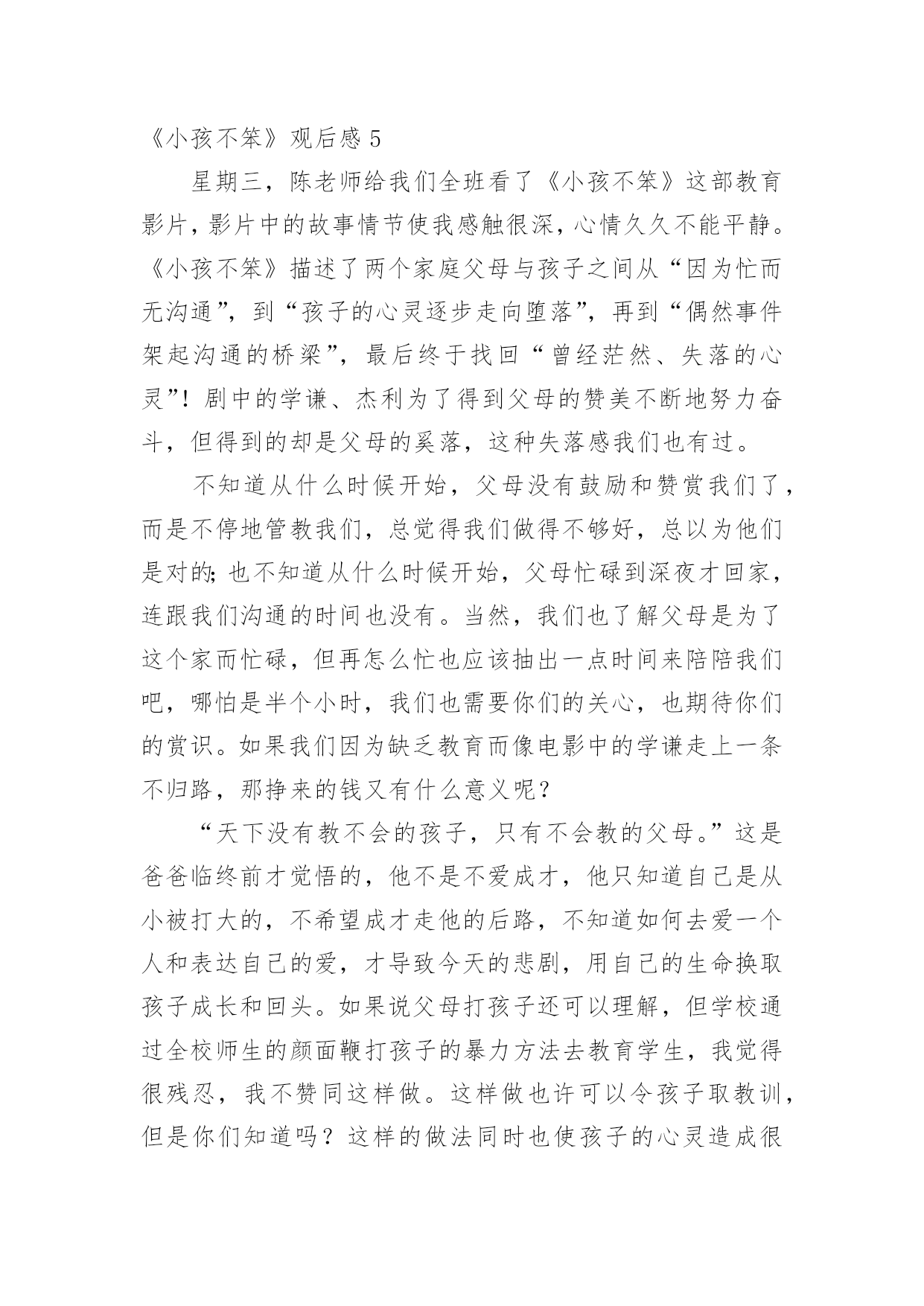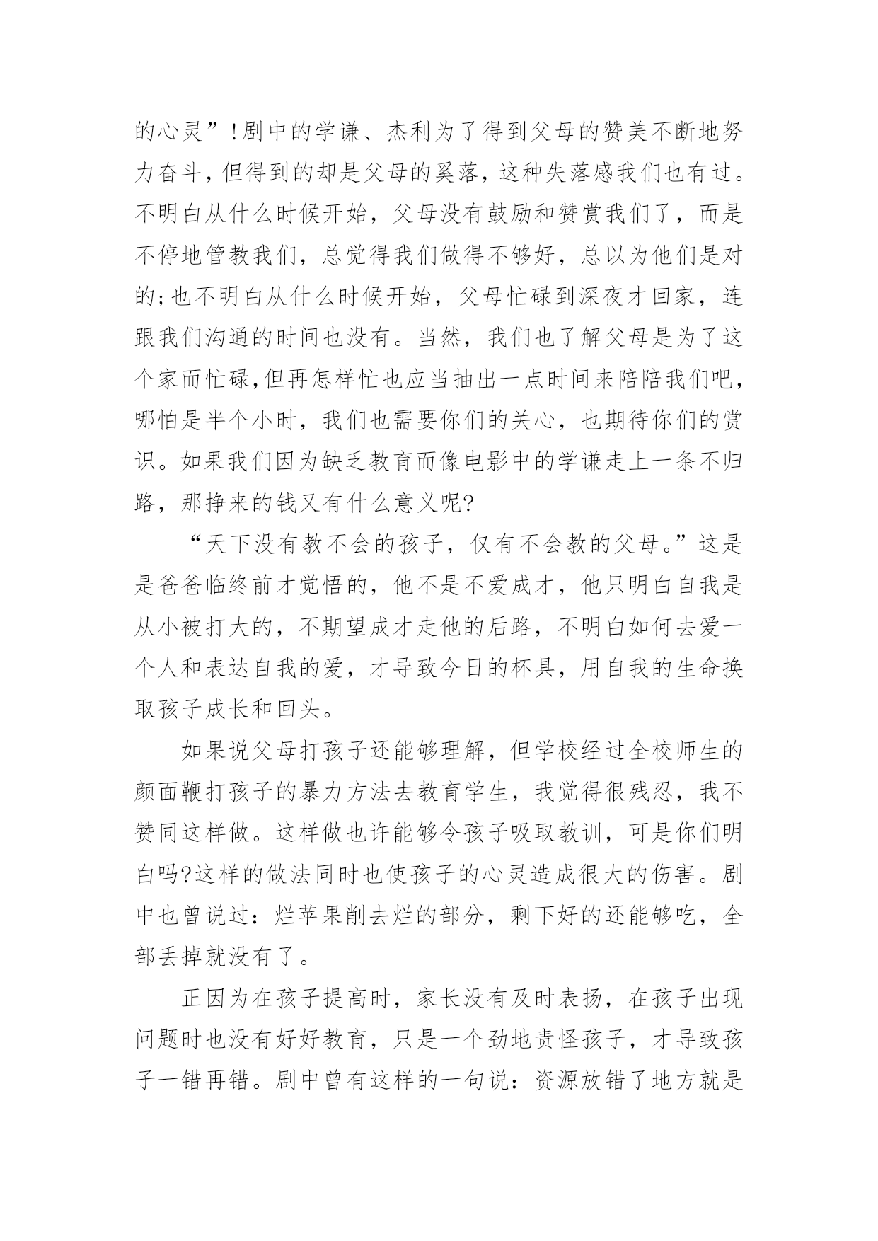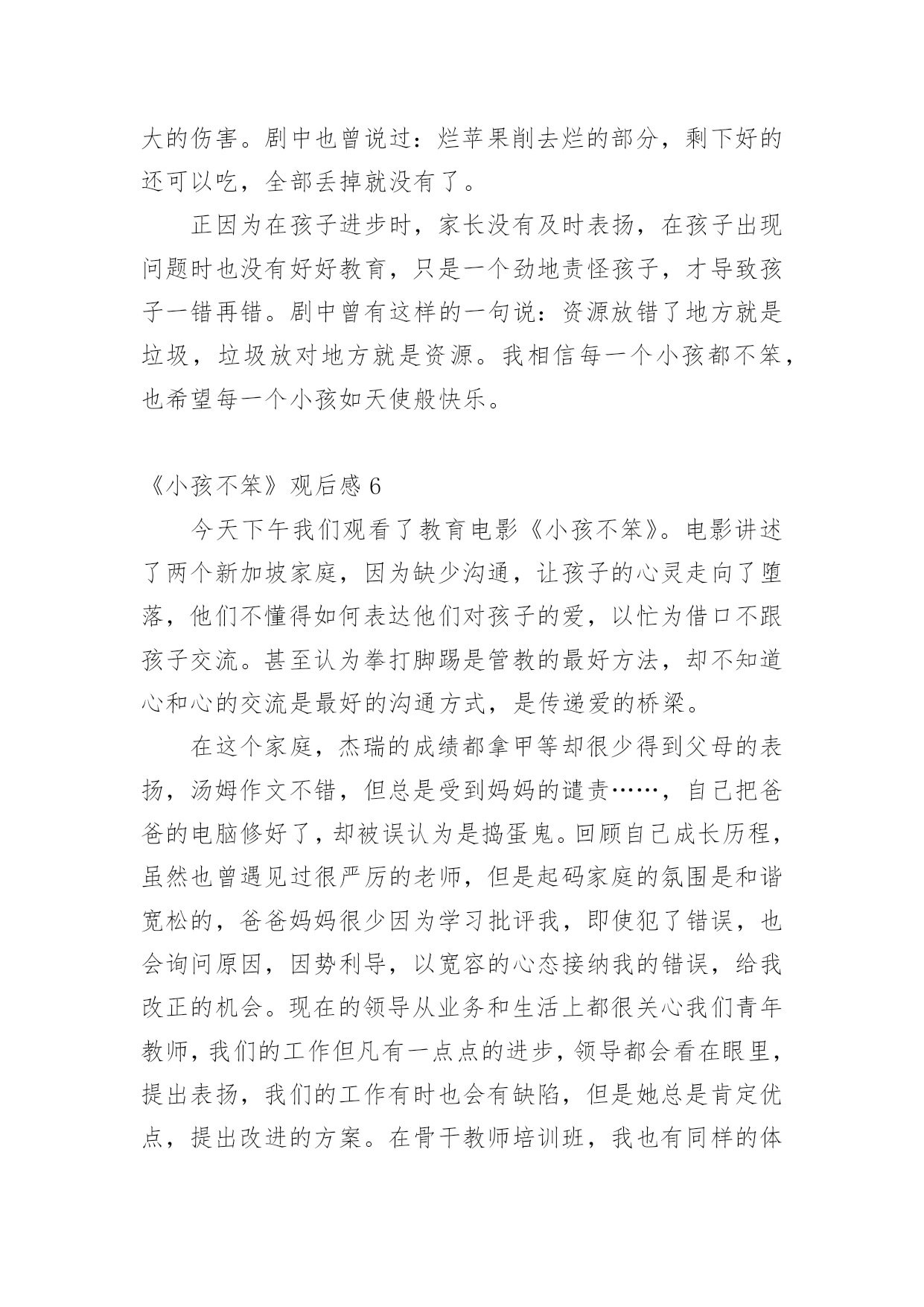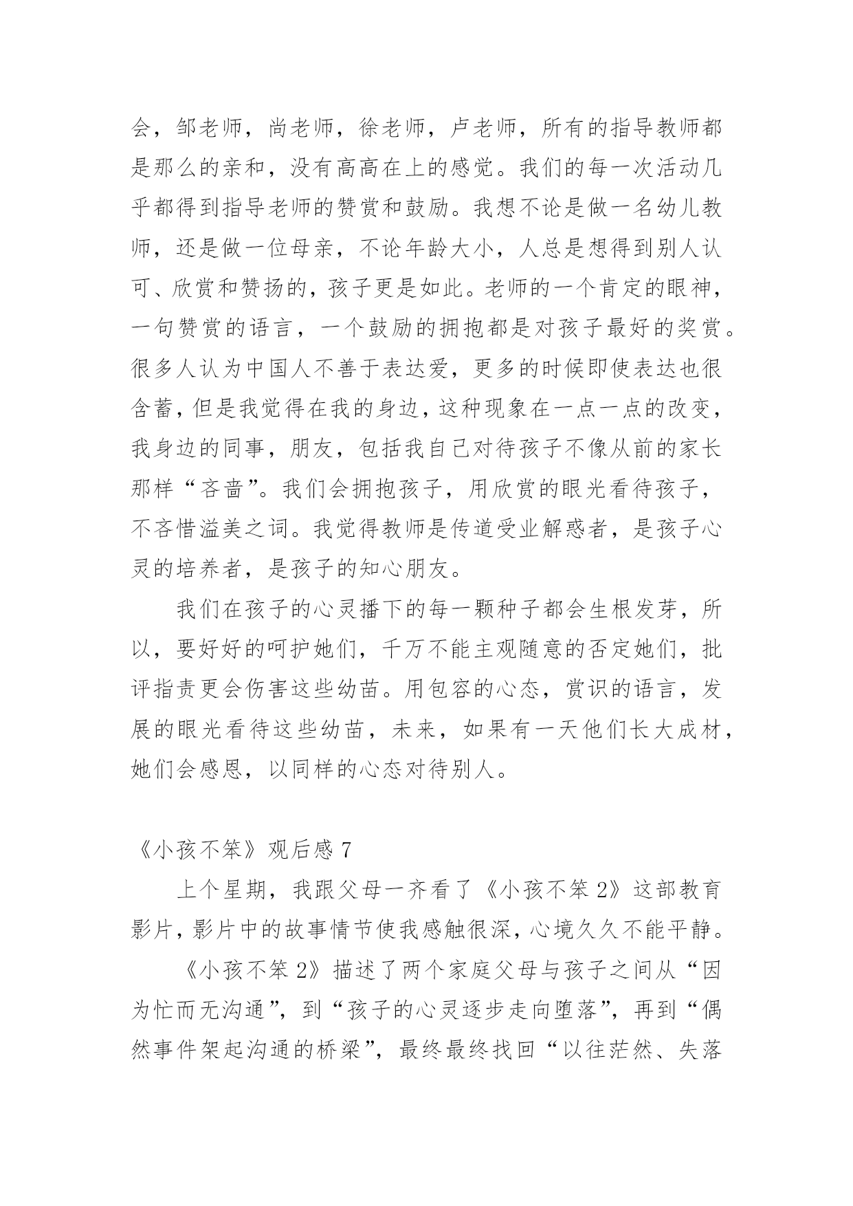 《小孩不笨》观后感当看完一部影视作品后,一定有很多值得分享的心得吧,是时候静下心来好好写写观后感了。可能你现在毫无头绪吧,下面是小编为大家整理的《小孩不笨》观后感,仅供参考,大家一起来看看吧。《小孩不笨》观后感1“你最终一次称赞别人是在什么时候?你最终一次被人称赞又是在什么时候?很久,对吗?”这是《小孩不笨2》开场对白。整个故事所要表达的讯息是亲子之间的沟通问题以及教育问题。三个小孩之中,学谦及其弟杰利的家庭背景是相当富裕的,父母亲都是忙碌的上班一族。他们的父母亲以为给与孩子物质上的满足就是等于为孩子好。很多时候,家长都是一厢情愿的,因为家长根本都不了解孩子。在很多情景下,家长在说个不停或不分青红皂白责骂孩子,当孩子欲加解释,却被告以“顶嘴”的罪名。小孩的要求有时候只是很简单,他可能只想要父母亲出席观看他的学校演出;他可能只是想要父母亲的肯定与鼓励;他可能只想要父母亲抽出一个不受打扰的一个小时。电影中的这三位小孩在学校都不是精英班,而被认为是不会读书的寄生虫。在学校教师的眼中,他们都是一个个的“烂苹果”。教师对他们失望,家长对他们失望,在一片的失望中,他们一度放弃自我了。其中一位教师则说,我们需要一把钥匙,而这把钥匙就是“多看学生的优点,少看学生的缺点”。如果把一个烂苹果丢掉,那么什么都没了;可是,如果只是把烂的部分切掉,这个苹果还是一个好苹果。多称赞别人,多看别人的优点。你爸爸实在太爱你了,只是他不会爱你。这是戏里的其中一些经典对白。这部电影看完笑过后,你会发现电影中的例子在生活中比比皆是,只是他用一种夸张的手法表现出来。看完这电影你会哭,哭过后你会反思,原先现实中也有很多人或事能够令我们感动,只是我们的冷漠禁锢了我们感情。电影中所反映出的子女与父母沟通以及子女教育问题,可谓是当今社会的热点问题,不光在新加坡,在中国也很普遍。用电影里的话来说,家长与小孩之间沟通的那扇门已经关了,而打开这扇门需要一把钥匙,这把钥匙就是多看他们的优点,少看他们的缺点,简言之就是赏识教育。其实每个孩子的身上都有一个好孩子和一个坏孩子,我们要做的是要唤醒他身上的好孩子。而唤醒好孩子的方法就是去赏识他们,去多发现他们的优点。《小孩不笨》观后感2在《小孩不笨》这部影片当中,作为即将站上讲台的我们学到了许多东西,孩子需要我们做老师的理解、尊重。我们做老师的不能把孩子管得太严,孩子也应该有自己的一片天空,让孩子们有自己的想法,让孩子们有一定的自由空间,而不是处处约束孩子们,就算孩子不对,也只能慢慢引导,讲道理,暴力是不能解决问题的,也许跟孩子做朋友,更有意想不到的收获。比如《小孩不笨》中的单身父亲,因为孩子的国语成绩只有10来分,对孩子拳打脚踢,可是这样做对孩子们的学习成绩不但没有帮助,反而还会令孩子认为自己没用,从而对学习产生负面情绪。做为师长的我们,应该多多鼓励孩子,看到孩子闪光的一面,并肯定他们的长处,不足的地方给予正确的指导,而不是全盘否决,就像片中所说的一样,一个苹果烂了一点,只需要把烂掉的那一点切掉,而不是整个扔掉,切掉一点这颗苹果就还有用,如果整个扔掉的话,就什么也没有了。还有一点,影片中小孩的家人不管在什么时候,总是有一大堆话讲,也不理孩子们有没有听进去,这样只会让孩子们觉得我们这些大人很烦,很罗嗦。应该适应地教育孩子而不是说一大堆的空话,左耳进右耳出,讲了也是白讲,和孩子沟通是必须的,但也要讲究方面,一方面,我们要善于倾听孩子们的心声,知道他们的想法,而不是采用强权的态度不理会孩子的感受,生硬的给其批评。事实上,在很多的家庭里学校中,并不是孩子不愿意与大人沟通交流,而是孩子们在孤独寂寞的同时,再也找不到与大人沟通交流的方式,也如片中所说的:“随着我们慢慢长大,父母们的鼓励话语渐渐变成了训话,于是我们就变成了哑巴。这部影片就是要告诉我们,解决孩子问题的核心在于沟通,沟通是联接孩子与大人之间的桥和钥匙!《小孩不笨》观后感3在电影当中我看到了为工作忙碌忽略了孩子的父母,我还看到了一个希望可以做好父亲但不会去表达的家长,他们都是爱着自己的孩子的,但是不会去表达,所以他们的爱显得有一点笨拙,有一点强势。可是他们都在努力地希望做到自己认为的最好,虽然说方式可能不太对,但是他们的爱是没有错的,只是不太会表达。每个家长都是由于受到了自己的原生家庭的影响,才成为现在这个样子的。“每个孩子都是父母的复印件”,昨天晚上听到了这句话,觉得特别特别的贴切,特别特别的形象。我们希望孩子成为什么样子的人,我们就首先去成为这样的人我还看到了作为老师,对于孩子的重要性。虽然说现在的老师跟过去私塾的老师不太一样,私塾的老师一个人负责孩子所有的学习,真的是一日为师,终身为父的感觉。现在的老师不会是把一个孩子从小培养到大,孩子在不同的阶段,不同的学科会遇到很多的老师。这样比