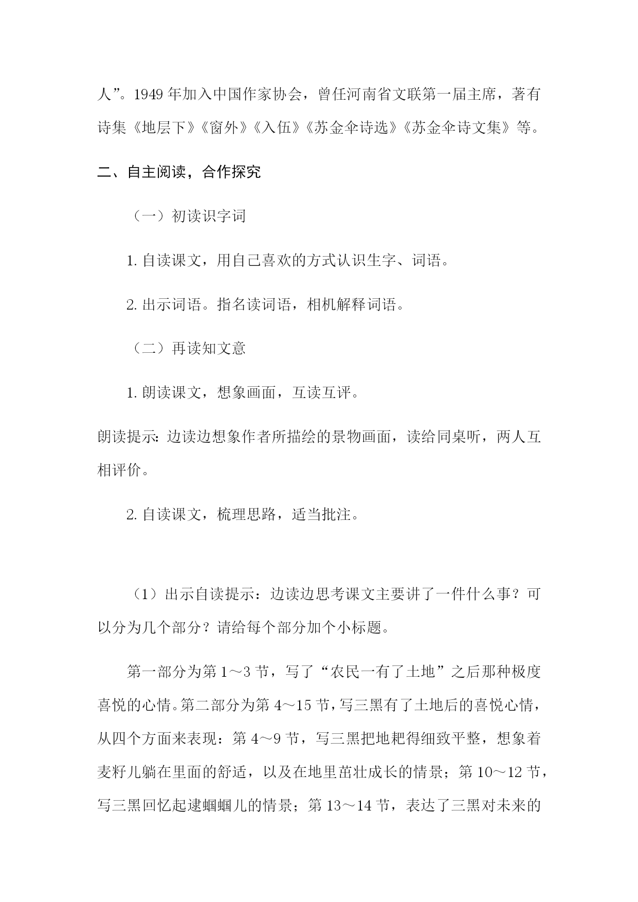 《三黑和土地》说课稿说教材 《三黑和土地》是统编教材小学语文六年级上册第六单元的一篇略读课文。这是一首现代诗歌,描述了翻身农民三黑重获土地的喜悦心情,对土地的无比热爱之情,以及有了土地后对美妙生活的向往和向往。 本文分为三个部分:第一部分总体写出三黑得到土地后,视若珍宝、爱不释手的情感。仔细地侍弄土地:仔细地翻地,来回地耙地,把土地弄得非常松散,简直像一张柔软的床。非常适合种子在上面生长。第二部分介绍三黑把荞麦种子播种到地里,看到麦苗的良好长势,听到地里的蝈蝈叫,想起心酸的童年生活,第三部分,展望