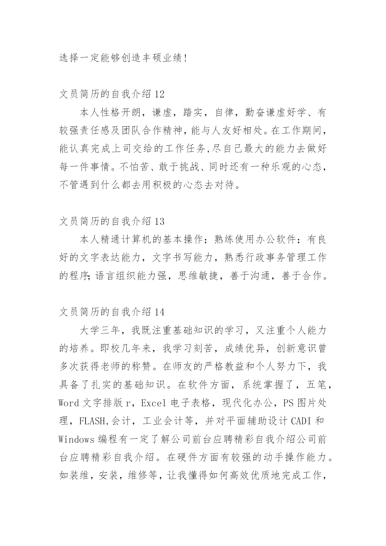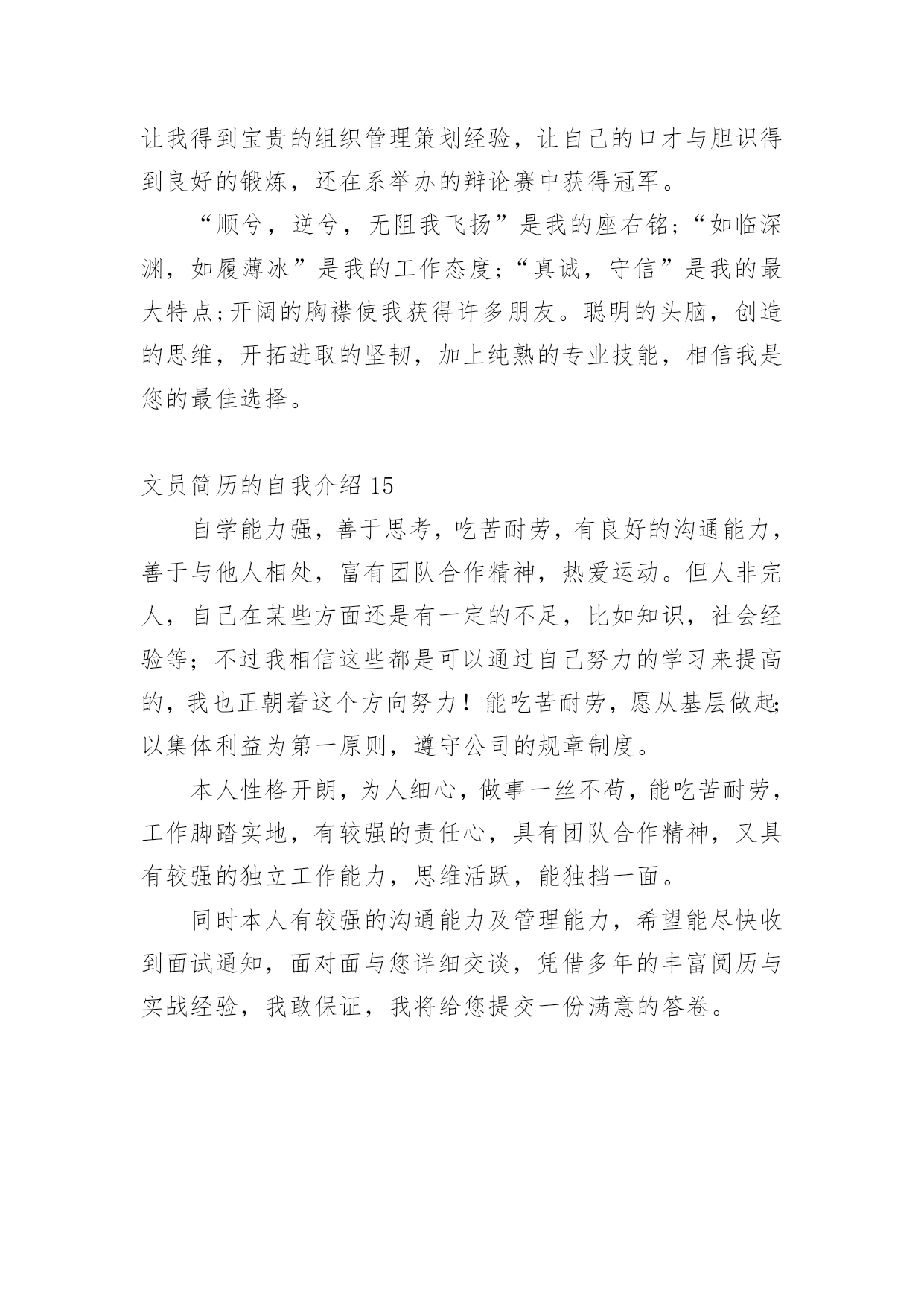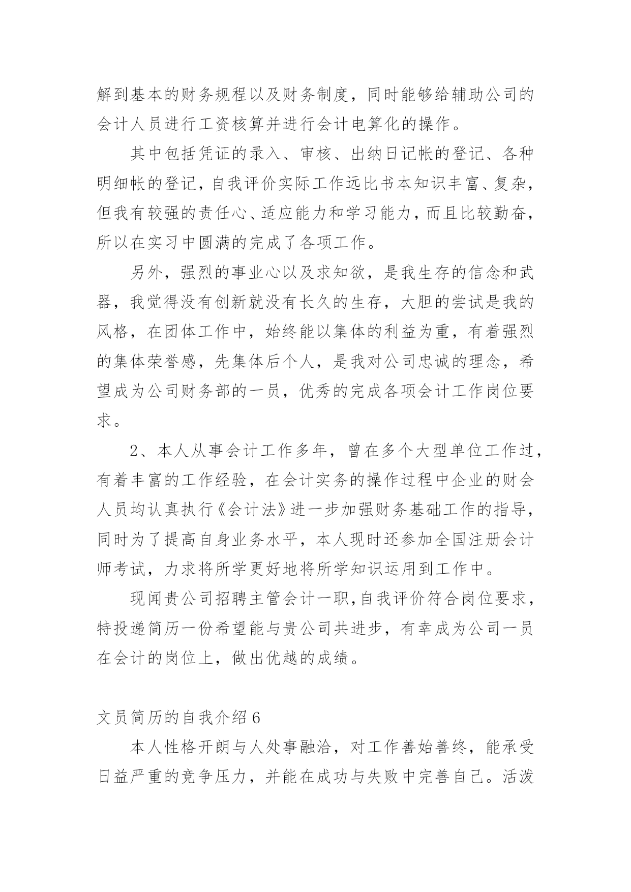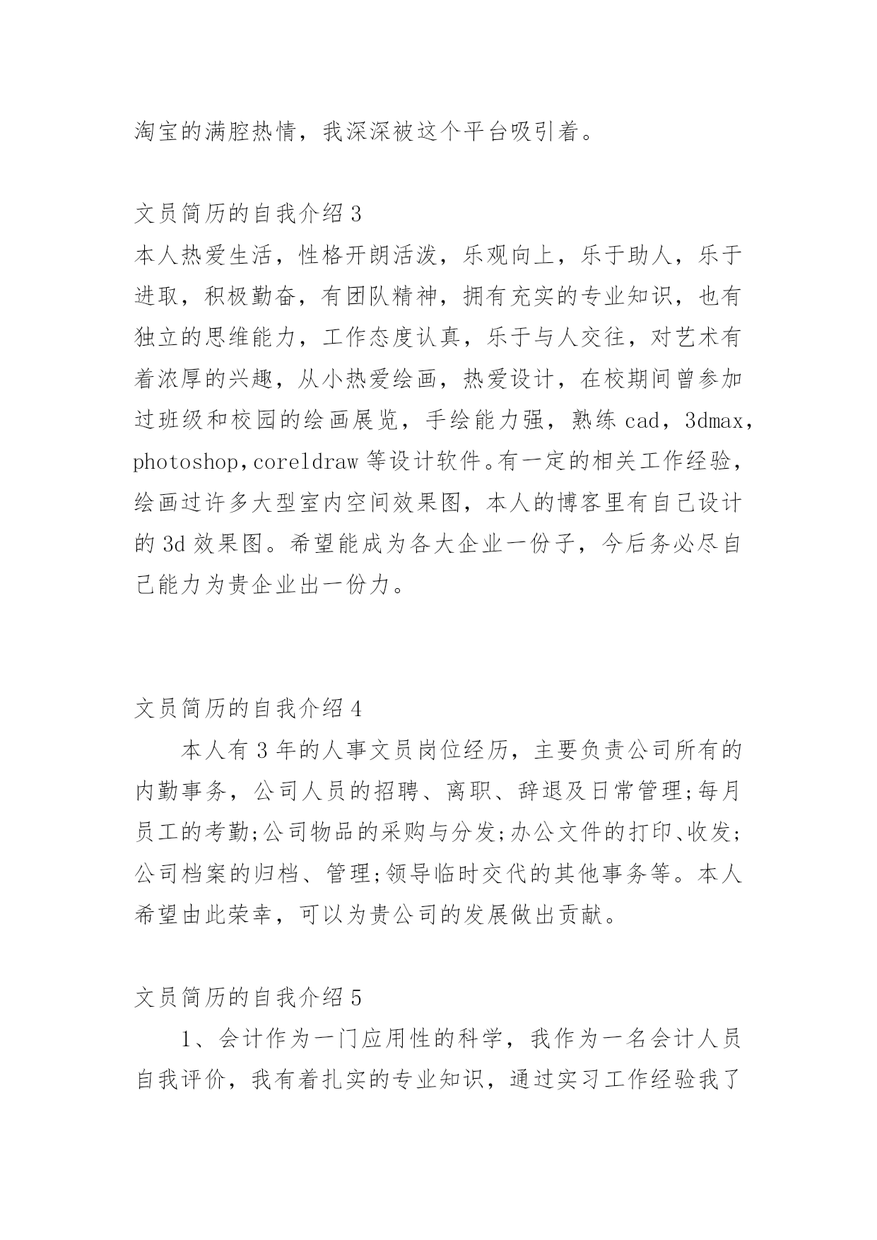 文员简历的自我介绍时间稍纵即逝,许多朋友又将开始寻求新的工作机会,这时候需要开始写简历了哦。简历要怎么写?想必这让大家都很苦恼吧,以下是小编为大家收集的文员简历的自我介绍,仅供参考,希望能够帮助到大家。文员简历的自我介绍1我叫xx,女,今年23岁,是xxxxx学院中文系汉语言文学专业的应届毕业生,为人诚实守信、安静祥和,平时最爱看看书上上网听听音乐,我的同学都说我是最适合读中文的人。上大学时偏爱现当代文学,最爱看潘军的作品,特别是他的《手势与独白》三部曲;而张爱玲、张小娴、安妮宝贝等也是我偏爱的一些作家,她们的文集前前后后我倒也看得差不多了。因为专业关系与个性的偏好,另外一些现当代的名家我也是很关注的,像林语堂、格非、阿来、马原、王蒙、张洁等,具有良好的文学素养。自小学六年级以来,一直有坚持写日记的习惯,偶尔有情致时,我也会写写小文章练练笔,师范专业的我在学校通过专业学习与教师技能的培训、测试,实习时也真枪实弹地给学生们上过十来堂的语文课,自我感觉口头表达能力还是不错的。但是,我自认为,我的书面表达能力较口头表达能力更强。为人正直、乐观,以诚待人,做事有恒心,能吃苦耐劳,上进心强,有一定的创新能力。勤恳好学,接受新事物能力强,动手能力强,具有良好的敬业精神和团体协作能力,具有组织管理能力。对待工作认真负责,善于沟通、协调有较强的组织能力与团队精神;活泼开朗、乐观上进、有爱心并善于施教并行;上进心强、勤于学习能不断提高自身的能力与综合素质。在未来的工作中,我将以充沛的精力,刻苦钻研的精神来努力工作,稳定地提高自己的工作能力,与企业同步发展。总的来说,我自认为我是完全符合贵公司招聘网络文员的要求——“有良好的书写、表达,以及文章的鉴赏能力”。可能,目前我没有多少的工作经验,但是我年轻,学习能力强,也愿意刻苦学习,我完全相信自己能胜任这一份工作!文员简历的自我介绍2本人虽然年龄较小但不缺乏稳重性格开朗有活力。侍人热情。真诚。工作细心认真负责。有很强的组织能力和团队协作精神。对于客服、销售有很大的兴趣。有过一定的销售培训,不管是淘宝商城还是C店都有深度的工作经历勇于承受压力喜欢挑战自我,因为从小家境的原因上进心较强意志坚强具有较强的适应能力。或许您会觉的我的工作经历相对来说不是相当的长,可能是一直之前没有找到合适自己的发展的机会,但只要您肯给我一个机会我一定会还您一笔财富,我希望有合适的公司来沉淀自己更加的努力学习进步。我会像您证明您的选择是非常的正确。我有着对于淘宝的满腔热情,我深深被这个平台吸引着。文员简历的自我介绍3本人热爱生活,性格开朗活泼,乐观向上,乐于助人,乐于进取,积极勤奋,有团队精神,拥有充实的专业知识,也有独立的思维能力,工作态度认真,乐于与人交往,对艺术有着浓厚的兴趣,从小热爱绘画,热爱设计,在校期间曾参加过班级和校园的绘画展览,手绘能力强,熟练cad,3dmax,photoshop,coreldraw等设计软件。有一定的相关工作经验,绘画过许多大型室内空间效果图,本人的博客里有自己设计的3d效果图。希望能成为各大企业一份子,今后务必尽自己能力为贵企业出一份力。文员简历的自我介绍4本人有3年的人事文员岗位经历,主要负责公司所有的内勤事务,公司人员的招聘、离职、辞退及日常管理;每月员工的考勤;公司物品的采购与分发;办公文件的打印、收发;公司档案的归档、管理;领导临时交代的其他事务等。本人希望由此荣幸,可以为贵公司的发展做出贡献。文员简历的自我介绍51、会计作为一门应用性的科学,我作为一名会计人员自我评价,我有着扎实的专业知识,通过实习工作经验我了解到基本的财务规程以及财务制度,同时能够给辅助公司的会计人员进行工资核算并进行会计电算化的操作。其中包括凭证的录入、审核、出纳日记帐的登记、各种明细帐的登记,自我评价实际工作远比书本知识丰富、复杂,但我有较强的责任心、适应能力和学习能力,而且比较勤奋,所以在实习中圆满的完成了各项工作。另外,强烈的事业心以及求知欲,是我生存的信念和武器,我觉得没有创新就没有长久的生存,大胆的尝试是我的风格,在团体工作中,始终能以集体的利益为重,有着强烈的集体荣誉感,先集体后个人,是我对公司忠诚的理念,希望成为公司财务部的一员,优秀的完成各项会计工作岗位要求。2、本人从事会计工作多年,曾在多个大型单位工作过,有着丰富的工作经验,在会计实务的操作过程中企业的财会人员均认真执行《会计法》进一步加强财务基础工作的指导,同时为了提高自身业务水平,本人现时还参加全国注册会计师考试,力求将所学更好地将所学知识运用到工作中。现闻贵公司招聘主管会计一职,自我评价符合岗位要求,特投递简历一份希望能与贵公司共进步,有幸成为公司一员在会计的岗位上,做出优越的成绩。文员简历的自我介绍6本人性格开朗与人处事融洽,对工
