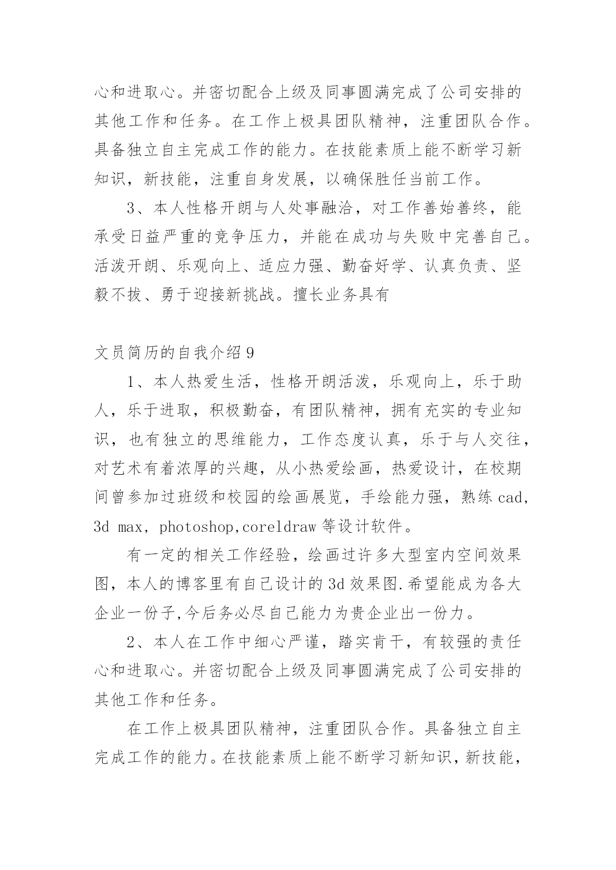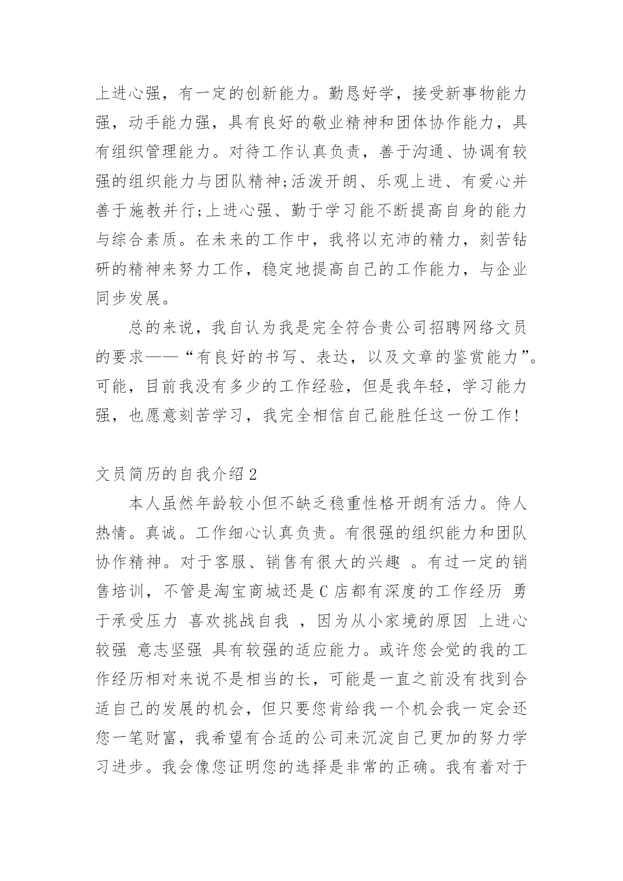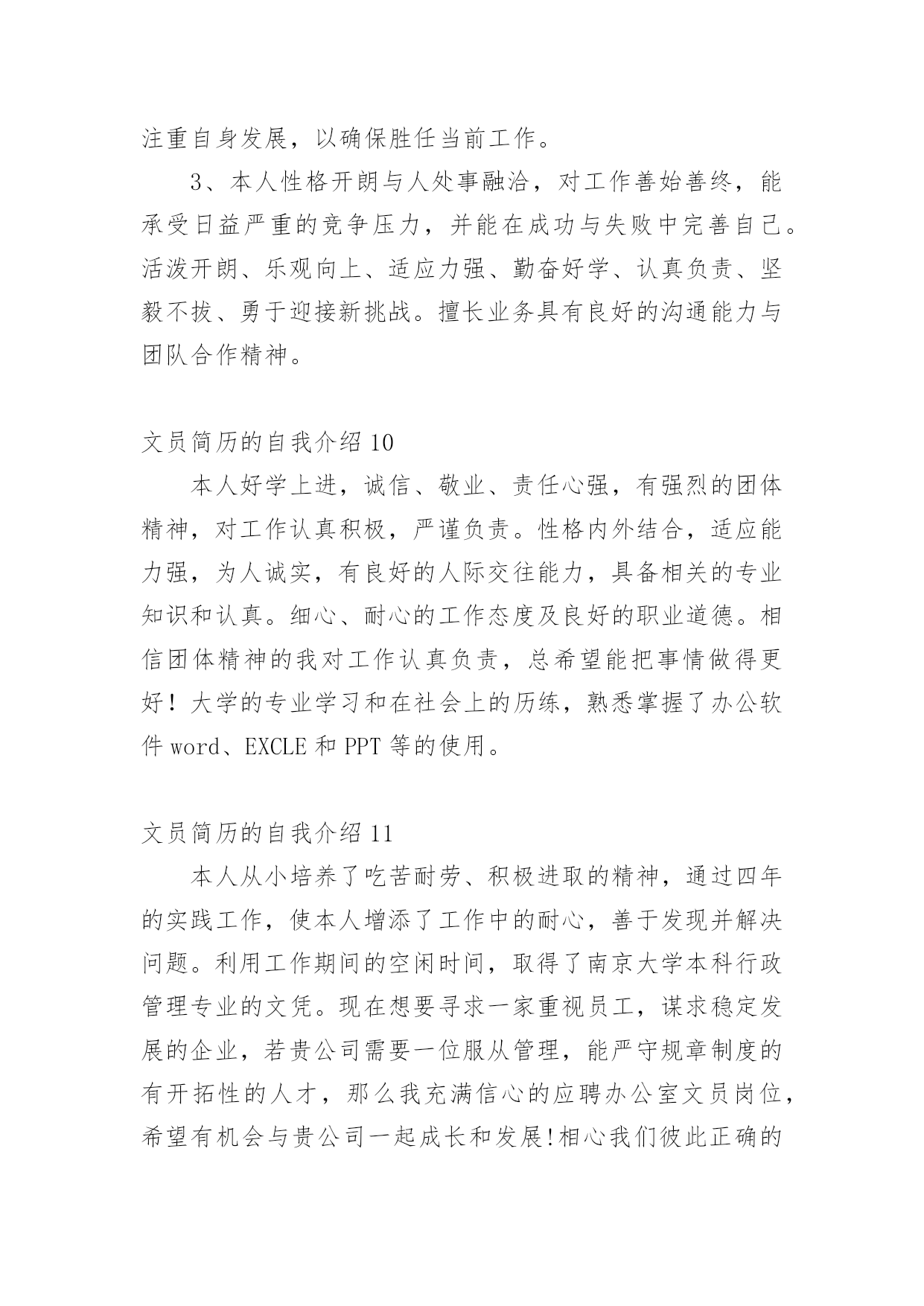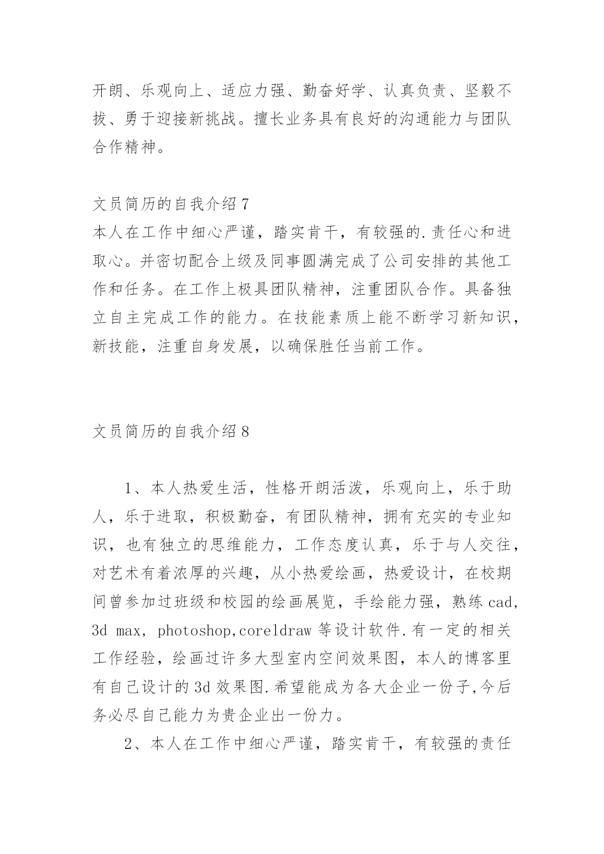 文员简历的自我介绍时间稍纵即逝,许多朋友又将开始寻求新的工作机会,这时候需要开始写简历了哦。简历要怎么写?想必这让大家都很苦恼吧,以下是小编为大家收集的文员简历的自我介绍,仅供参考,希望能够帮助到大家。文员简历的自我介绍1我叫xx,女,今年23岁,是xxxxx学院中文系汉语言文学专业的应届毕业生,为人诚实守信、安静祥和,平时最爱看看书上上网听听音乐,我的同学都说我是最适合读中文的人。上大学时偏爱现当代文学,最爱看潘军的作品,特别是他的《手势与独白》三部曲;而张爱玲、张小娴、安妮宝贝等也是我偏爱的一些作家,她们的文集前前后后我倒也看得差不多了。因为专业关系与个性的偏好,另外一些现当代的名家我也是很关注的,像林语堂、格非、阿来、马原、王蒙、张洁等,具有良好的文学素养。自小学六年级以来,一直有坚持写日记的习惯,偶尔有情致时,我也会写写小文章练练笔,师范专业的我在学校通过专业学习与教师技能的培训、测试,实习时也真枪实弹地给学生们上过十来堂的语文课,自我感觉口头表达能力还是不错的。但是,我自认为,我的书面表达能力较口头表达能力更强。为人正直、乐观,以诚待人,做事有恒心,能吃苦耐劳,上进心强,有一定的创新能力。勤恳好学,接受新事物能力强,动手能力强,具有良好的敬业精神和团体协作能力,具有组织管理能力。对待工作认真负责,善于沟通、协调有较强的组织能力与团队精神;活泼开朗、乐观上进、有爱心并善于施教并行;上进心强、勤于学习能不断提高自身的能力与综合素质。在未来的工作中,我将以充沛的精力,刻苦钻研的精神来努力工作,稳定地提高自己的工作能力,与企业同步发展。总的来说,我自认为我是完全符合贵公司招聘网络文员的要求——“有良好的书写、表达,以及文章的鉴赏能力”。可能,目前我没有多少的工作经验,但是我年轻,学习能力强,也愿意刻苦学习,我完全相信自己能胜任这一份工作!文员简历的自我介绍2本人虽然年龄较小但不缺乏稳重性格开朗有活力。侍人热情。真诚。工作细心认真负责。有很强的组织能力和团队协作精神。对于客服、销售有很大的兴趣。有过一定的销售培训,不管是淘宝商城还是C店都有深度的工作经历勇于承受压力喜欢挑战自我,因为从小家境的原因上进心较强意志坚强具有较强的适应能力。或许您会觉的我的工作经历相对来说不是相当的长,可能是一直之前没有找到合适自己的发展的机会,但只要您肯给我一个机会我一定会还您一笔财富,我希望有合适的公司来沉淀自己更加的努力学习进步。我会像您证明您的选择是非常的正确。我有着对于淘宝的满腔热情,我深深被这个平台吸引着。文员简历的自我介绍3本人热爱生活,性格开朗活泼,乐观向上,乐于助人,乐于进取,积极勤奋,有团队精神,拥有充实的专业知识,也有独立的思维能力,工作态度认真,乐于与人交往,对艺术有着浓厚的兴趣,从小热爱绘画,热爱设计,在校期间曾参加过班级和校园的绘画展览,手绘能力强,熟练cad,3dmax,photoshop,coreldraw等设计软件。有一定的相关工作经验,绘画过许多大型室内空间效果图,本人的博客里有自己设计的3d效果图。希望能成为各大企业一份子,今后务必尽自己能力为贵企业出一份力。文员简历的自我介绍4本人有3年的人事文员岗位经历,主要负责公司所有的内勤事务,公司人员的招聘、离职、辞退及日常管理;每月员工的考勤;公司物品的采购与分发;办公文件的打印、收发;公司档案的归档、管理;领导临时交代的其他事务等。本人希望由此荣幸,可以为贵公司的发展做出贡献。文员简历的自我介绍51、会计作为一门应用性的科学,我作为一名会计人员自我评价,我有着扎实的专业知识,通过实习工作经验我了解到基本的财务规程以及财务制度,同时能够给辅助公司的会计人员进行工资核算并进行会计电算化的操作。其中包括凭证的录入、审核、出纳日记帐的登记、各种明细帐的登记,自我评价实际工作远比书本知识丰富、复杂,但我有较强的责任心、适应能力和学习能力,而且比较勤奋,所以在实习中圆满的完成了各项工作。另外,强烈的事业心以及求知欲,是我生存的信念和武器,我觉得没有创新就没有长久的生存,大胆的尝试是我的风格,在团体工作中,始终能以集体的利益为重,有着强烈的集体荣誉感,先集体后个人,是我对公司忠诚的理念,希望成为公司财务部的一员,优秀的完成各项会计工作岗位要求。2、本人从事会计工作多年,曾在多个大型单位工作过,有着丰富的工作经验,在会计实务的操作过程中企业的财会人员均认真执行《会计法》进一步加强财务基础工作的指导,同时为了提高自身业务水平,本人现时还参加全国注册会计师考试,力求将所学更好地将所学知识运用到工作中。现闻贵公司招聘主管会计一职,自我评价符合岗位要求,特投递简历一份希望能与贵公司共进步,有幸成为公司一员在会计的岗位上,做出优越的成绩。文员简历的自我介绍6本人性格开朗与人处事融洽,对工