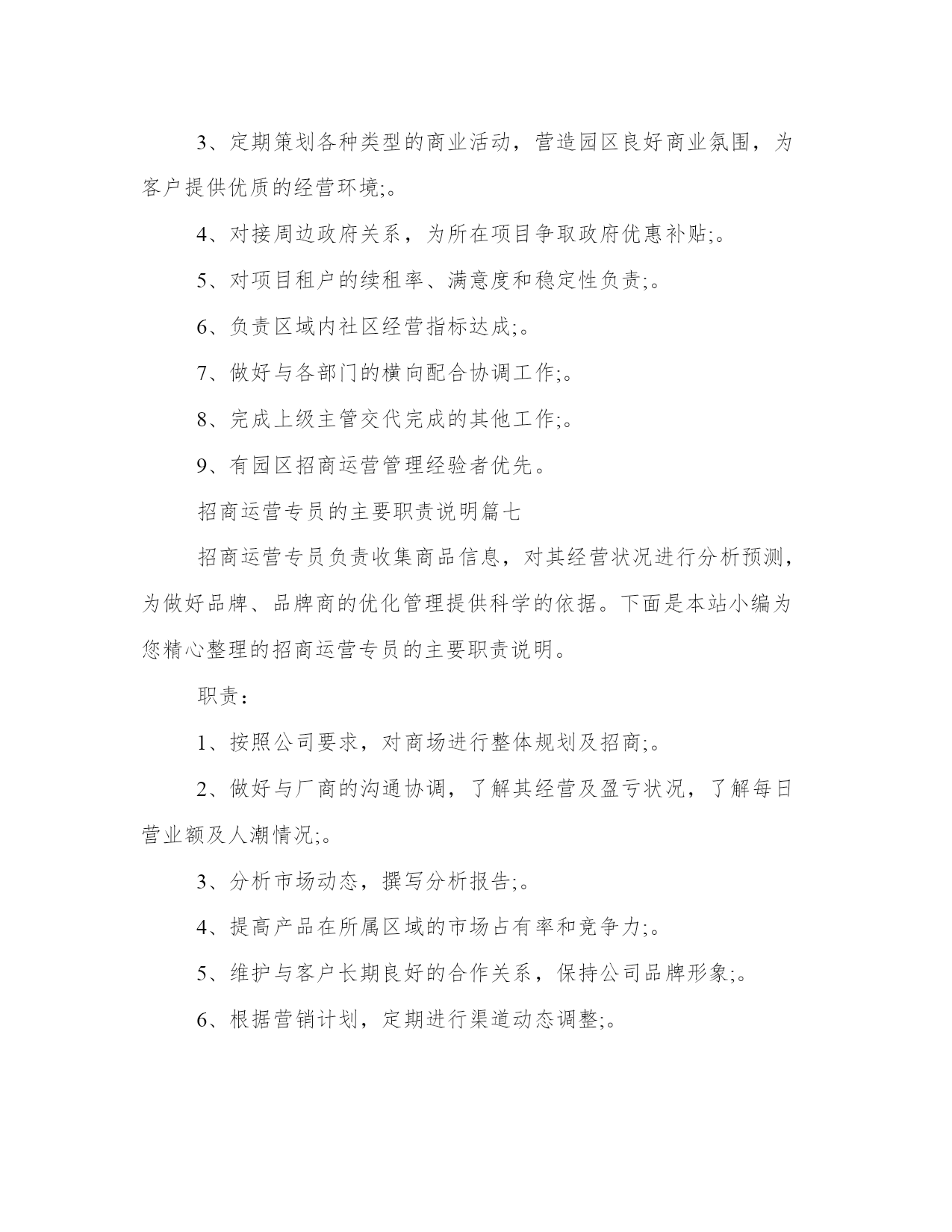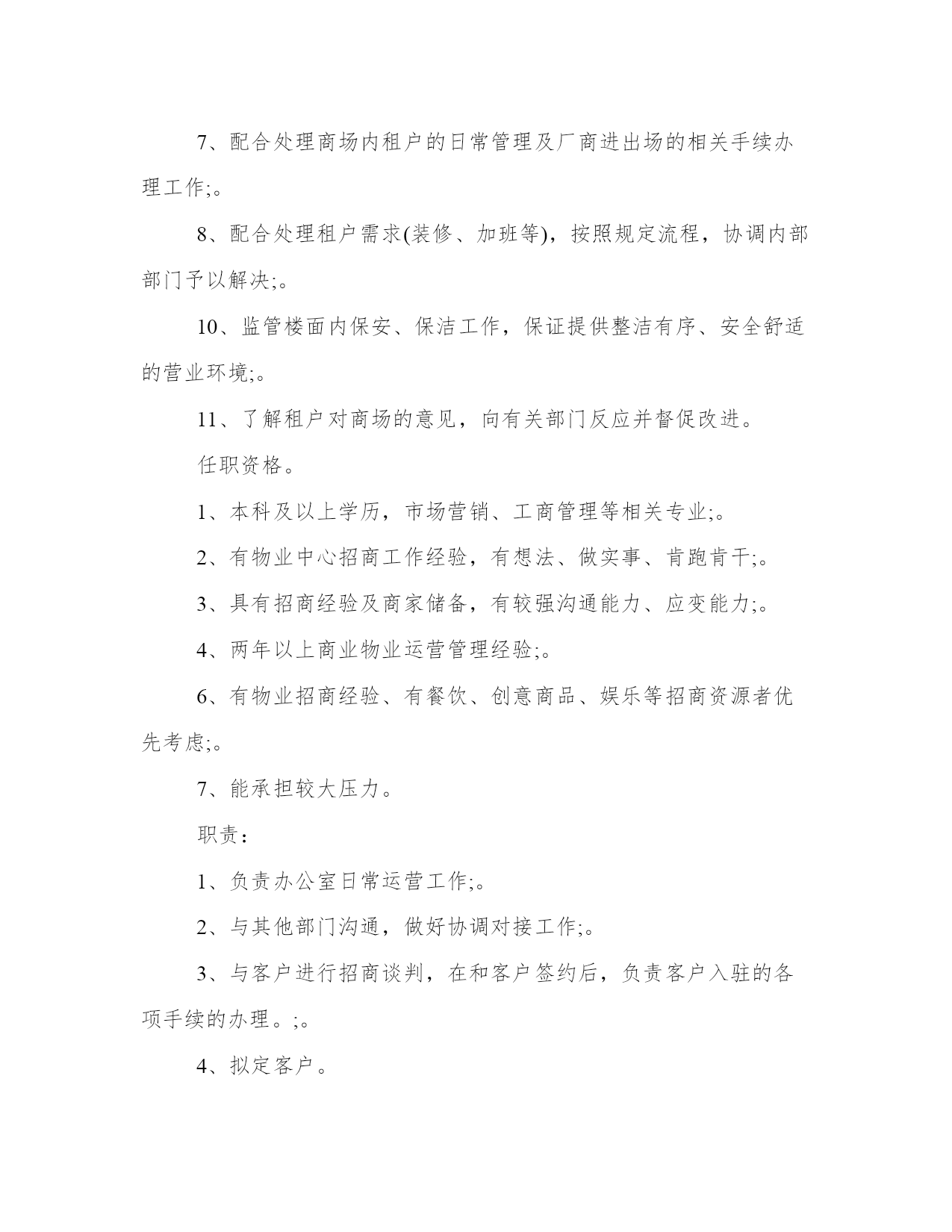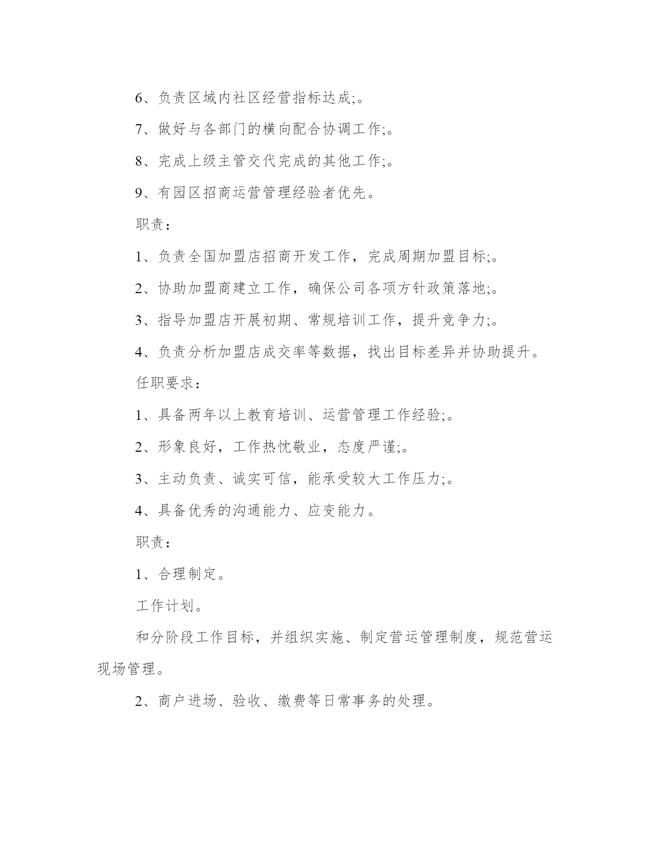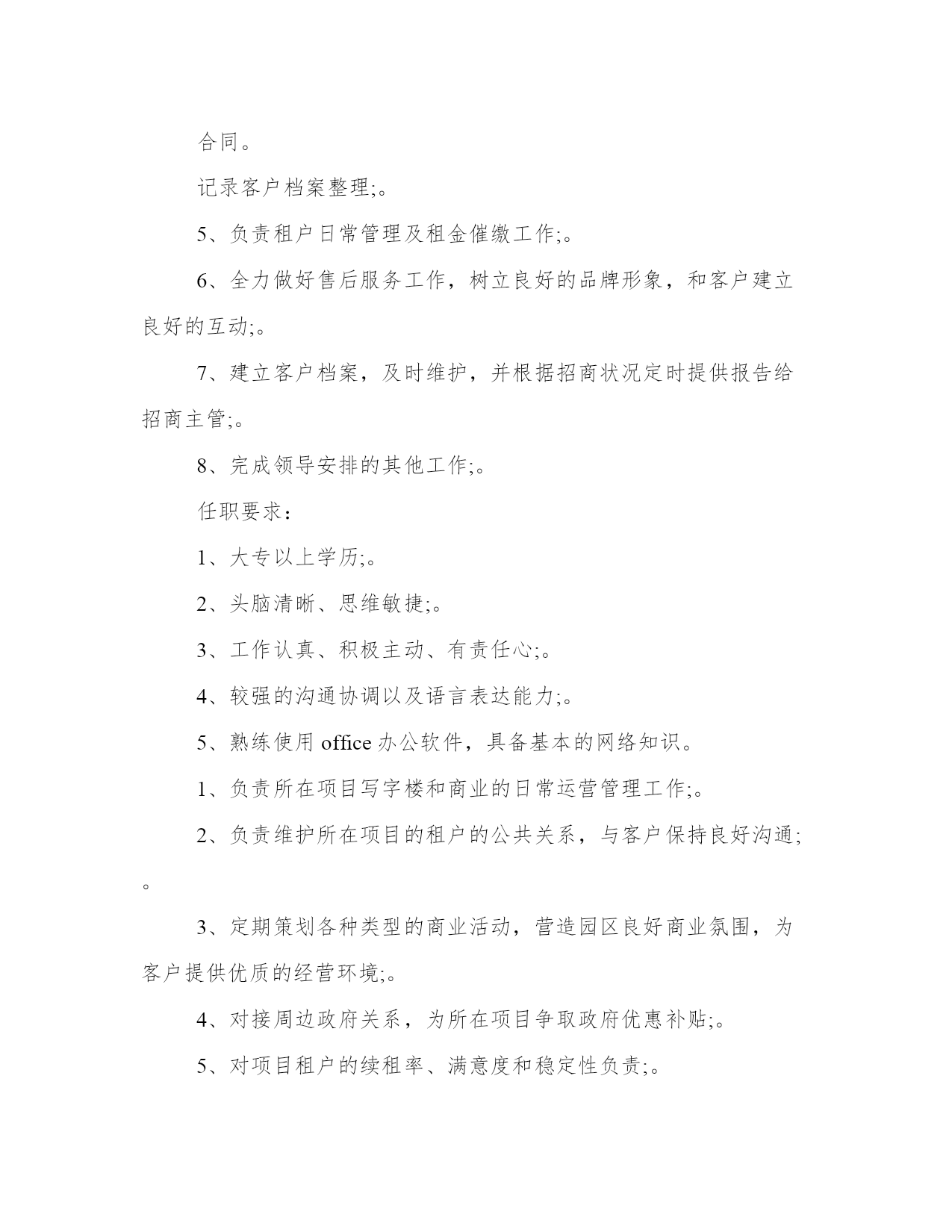2024年招商运营专员的主要职责说明(优质10篇)执行力是指有效地规划和实施任务,以达到预期结果的能力。写总结的过程中,我们要注意提炼出关键信息,避免陷入琐碎和泛泛的描述。总结是在一段时间内对学习和工作生活等表现加以总结和概括的一种书面材料,它可以促使我们思考,我想我们需要写一份总结了吧。如何提高学习效率,提升学习成绩?那么我们该如何写一篇较为完美的总结呢?以下是专家为大家整理的职场技能提升指南,欢迎大家阅读。招商运营专员的主要职责说明篇一职责:1、合理制定工作计划和分阶段工作目标,并组织实施、制定营运管理制度,规范营运现场管理。2、商户进场、验收、缴费等日常事务的处理。3、收取及审阅每天的投诉记录、巡查报告及管理日志,并跟进处理;对保洁、工程、保安等部门工作进行协调,沟通。4、接受及处理商家投诉,并予记录,对违章操作或行为应及时制止或按规定处理;跟进处理突发事件。职位要求:1.大专以上学历,3年以上商业运营工作经验;。2.具备较好的执行力及良好的沟通协调能力。招商运营专员的主要职责说明篇二1、负责公司业务的宣传策划、文案撰写(线上及线下)等各种宣传资料。2、负责公司网站、公众号运营与推广、软文制作,结合公司的业务,分析市场需求,挖掘宣传亮点,提高平台知名度。3、负责市场调研、收集市场信息,特别是同行业的市场信息。4、进行公司业务销售推广。5、定期提交市场分析报告和策划方案。6、配合各部门日常工作开展。职位要求。1、广告、新闻、中文、营销等相关专业大专或以上学历(条件优秀者可适当放宽),3年以上的工作经验。2、具有较强的文字驾驭能力,能独立完成策划案的编制、组织、执行。3、能熟练使用word、ppt、excel等各类办公软件,图片设计、编辑软件。4、对传统业务、互联网的运行模式有深入了解。5、有服务行业从业经验者优先。6、具有良好的团队意识与团队合作精神、责任心强、能承受较大的工作压力。招商运营专员的主要职责说明篇三职责:1、负责全国加盟店招商开发工作,完成周期加盟目标;。2、协助加盟商建立工作,确保公司各项方针政策落地;。3、指导加盟店开展初期、常规培训工作,提升竞争力;。4、负责分析加盟店成交率等数据,找出目标差异并协助提升。任职要求:1、具备两年以上教育培训、运营管理工作经验;。2、形象良好,工作热忱敬业,态度严谨;。3、主动负责、诚实可信,能承受较大工作压力;。4、具备优秀的沟通能力、应变能力。招商运营专员的主要职责说明篇四职责:1、市场调查及报告,对客户的资料收集和分析,并对其进行分析筛选,了解商业动态;。3、按公司招商的要求进行洽谈租户,完成招商指标、租金指标的达成;。4、负责合同的执行与协调,负责应收账款的催收。5、做好商户服务工作,岗位要求:1、大专及以上学历;。2、1年以上工作经验,具有商业地产运营相关经验尤佳;。3、熟悉商业地产营运管理基本流,程及知识能熟练使用专业办公软件;。4、沟通能力和协调组织能力强,具备良好的逻辑分析和语言表达能力。招商运营专员的主要职责说明篇五职责:1、负责所辖区域招商及初步审查工作;。2、根据调整规划进行品牌引进等相关工作;。4、负责定期对所辖区域进行经营分析;。5、负责定期对营业员进行系统培训,提升楼层服务水平和营业员精神风貌;。任职要求:1、本科或以上学历,工商管理、市场营销相关专业或有卖场管理经验者优先;。2、具有较强的人际交往和社会活动力,具有饱满的激情、上进心。3、善于沟通,有亲和力。4、具有较强的执行力、应变能力。5、本科学历及以上,管理类、市场营销相关专业或有卖场管理经验者优先。招商运营专员的主要职责说明篇六3、定期策划各种类型的商业活动,营造园区良好商业氛围,为客户提供优质的经营环境;。4、对接周边政府关系,为所在项目争取政府优惠补贴;。5、对项目租户的续租率、满意度和稳定性负责;。6、负责区域内社区经营指标达成;。7、做好与各部门的横向配合协调工作;。8、完成上级主管交代完成的其他工作;。9、有园区招商运营管理经验者优先。招商运营专员的主要职责说明篇七招商运营专员负责收集商品信息,对其经营状况进行分析预测,为做好品牌、品牌商的优化管理提供科学的依据。下面是本站小编为您精心整理的招商运营专员的主要职责说明。职责:1、按照公司要求,对商场进行整体规划及招商;。2、做好与厂商的沟通协调,了解其经营及盈亏状况,了解每日营业额及人潮情况;。3、分析市场动态,撰写分析报告;。4、提高产品在所属区域的市场占有率和竞争力;。5、维护与客户长期良好的合作关系,保持公司品牌形象;。6、根据营销计划,定期进行渠道动态调整;。7、配合