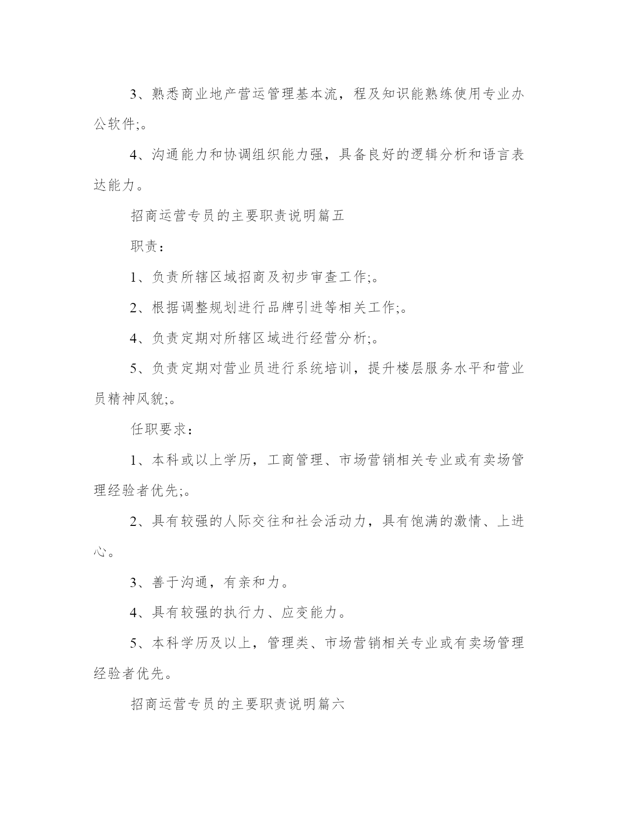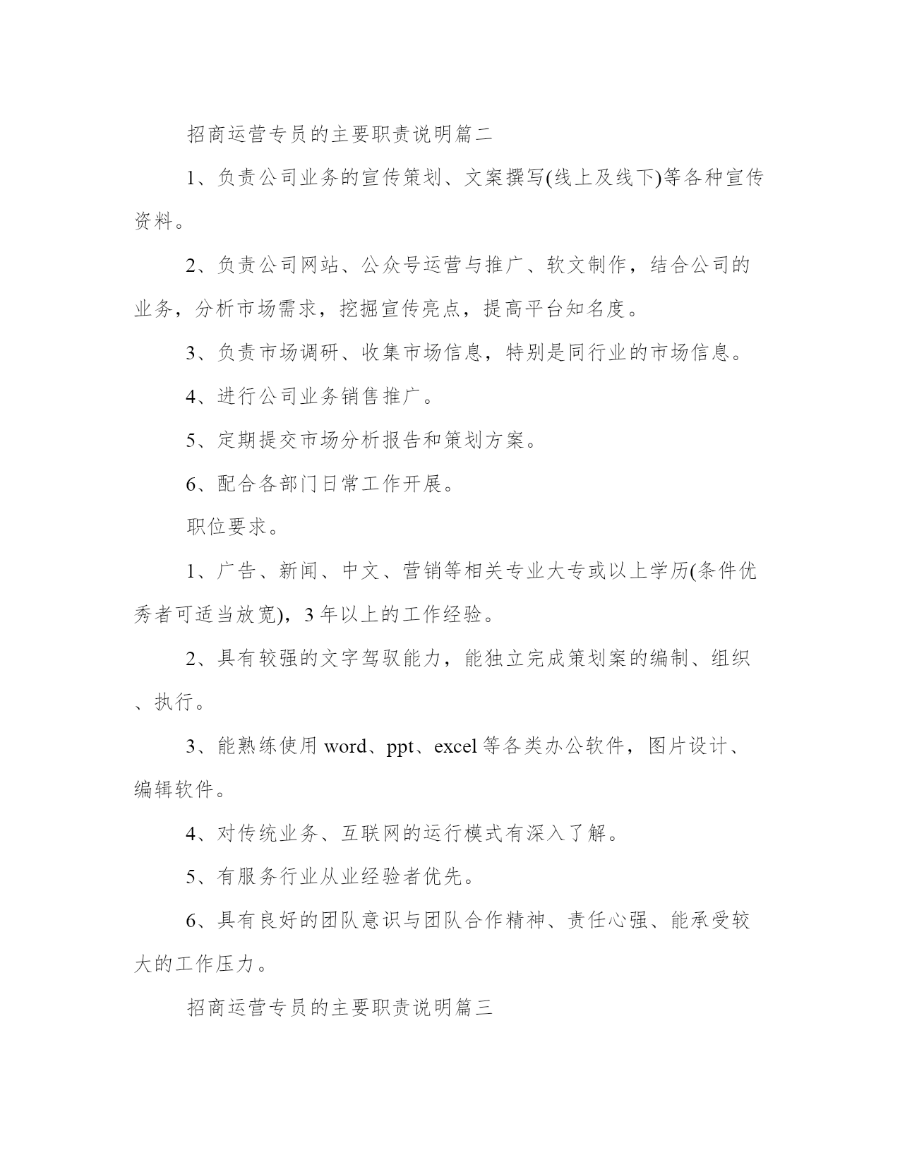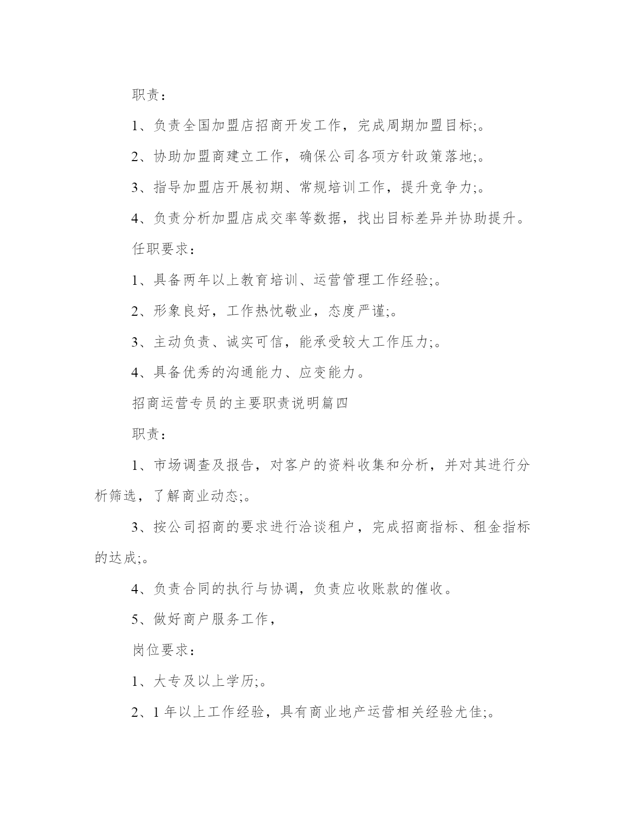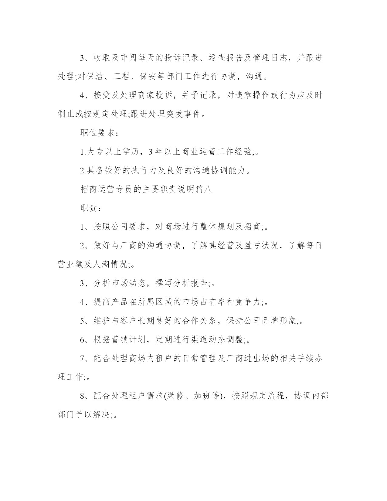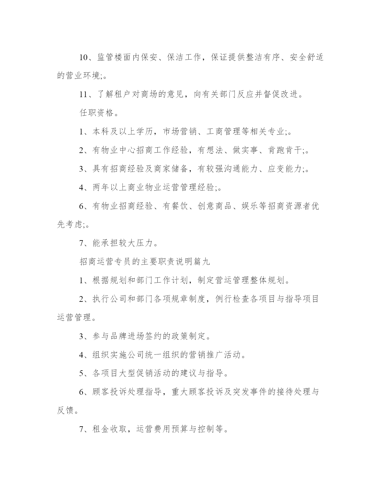 2024年招商运营专员的主要职责说明(优质10篇)执行力是指有效地规划和实施任务,以达到预期结果的能力。写总结的过程中,我们要注意提炼出关键信息,避免陷入琐碎和泛泛的描述。总结是在一段时间内对学习和工作生活等表现加以总结和概括的一种书面材料,它可以促使我们思考,我想我们需要写一份总结了吧。如何提高学习效率,提升学习成绩?那么我们该如何写一篇较为完美的总结呢?以下是专家为大家整理的职场技能提升指南,欢迎大家阅读。招商运营专员的主要职责说明篇一职责:1、合理制定工作计划和分阶段工作目标,并组织实施、制定营运管理制度,规范营运现场管理。2、商户进场、验收、缴费等日常事务的处理。3、收取及审阅每天的投诉记录、巡查报告及管理日志,并跟进处理;对保洁、工程、保安等部门工作进行协调,沟通。4、接受及处理商家投诉,并予记录,对违章操作或行为应及时制止或按规定处理;跟进处理突发事件。职位要求:1.大专以上学历,3年以上商业运营工作经验;。2.具备较好的执行力及良好的沟通协调能力。招商运营专员的主要职责说明篇二1、负责公司业务的宣传策划、文案撰写(线上及线下)等各种宣传资料。2、负责公司网站、公众号运营与推广、软文制作,结合公司的业务,分析市场需求,挖掘宣传亮点,提高平台知名度。3、负责市场调研、收集市场信息,特别是同行业的市场信息。4、进行公司业务销售推广。5、定期提交市场分析报告和策划方案。6、配合各部门日常工作开展。职位要求。1、广告、新闻、中文、营销等相关专业大专或以上学历(条件优秀者可适当放宽),3年以上的工作经验。2、具有较强的文字驾驭能力,能独立完成策划案的编制、组织、执行。3、能熟练使用word、ppt、excel等各类办公软件,图片设计、编辑软件。4、对传统业务、互联网的运行模式有深入了解。5、有服务行业从业经验者优先。6、具有良好的团队意识与团队合作精神、责任心强、能承受较大的工作压力。招商运营专员的主要职责说明篇三职责:1、负责全国加盟店招商开发工作,完成周期加盟目标;。2、协助加盟商建立工作,确保公司各项方针政策落地;。3、指导加盟店开展初期、常规培训工作,提升竞争力;。4、负责分析加盟店成交率等数据,找出目标差异并协助提升。任职要求:1、具备两年以上教育培训、运营管理工作经验;。2、形象良好,工作热忱敬业,态度严谨;。3、主动负责、诚实可信,能承受较大工作压力;。4、具备优秀的沟通能力、应变能力。招商运营专员的主要职责说明篇四职责:1、市场调查及报告,对客户的资料收集和分析,并对其进行分析筛选,了解商业动态;。3、按公司招商的要求进行洽谈租户,完成招商指标、租金指标的达成;。4、负责合同的执行与协调,负责应收账款的催收。5、做好商户服务工作,岗位要求:1、大专及以上学历;。2、1年以上工作经验,具有商业地产运营相关经验尤佳;。3、熟悉商业地产营运管理基本流,程及知识能熟练使用专业办公软件;。4、沟通能力和协调组织能力强,具备良好的逻辑分析和语言表达能力。招商运营专员的主要职责说明篇五职责:1、负责所辖区域招商及初步审查工作;。2、根据调整规划进行品牌引进等相关工作;。4、负责定期对所辖区域进行经营分析;。5、负责定期对营业员进行系统培训,提升楼层服务水平和营业员精神风貌;。任职要求:1、本科或以上学历,工商管理、市场营销相关专业或有卖场管理经验者优先;。2、具有较强的人际交往和社会活动力,具有饱满的激情、上进心。3、善于沟通,有亲和力。4、具有较强的执行力、应变能力。5、本科学历及以上,管理类、市场营销相关专业或有卖场管理经验者优先。招商运营专员的主要职责说明篇六3、定期策划各种类型的商业活动,营造园区良好商业氛围,为客户提供优质的经营环境;。4、对接周边政府关系,为所在项目争取政府优惠补贴;。5、对项目租户的续租率、满意度和稳定性负责;。6、负责区域内社区经营指标达成;。7、做好与各部门的横向配合协调工作;。8、完成上级主管交代完成的其他工作;。9、有园区招商运营管理经验者优先。招商运营专员的主要职责说明篇七招商运营专员负责收集商品信息,对其经营状况进行分析预测,为做好品牌、品牌商的优化管理提供科学的依据。下面是本站小编为您精心整理的招商运营专员的主要职责说明。职责:1、按照公司要求,对商场进行整体规划及招商;。2、做好与厂商的沟通协调,了解其经营及盈亏状况,了解每日营业额及人潮情况;。3、分析市场动态,撰写分析报告;。4、提高产品在所属区域的市场占有率和竞争力;。5、维护与客户长期良好的合作关系,保持公司品牌形象;。6、根据营销计划,定期进行渠道动态调整;。7、配合