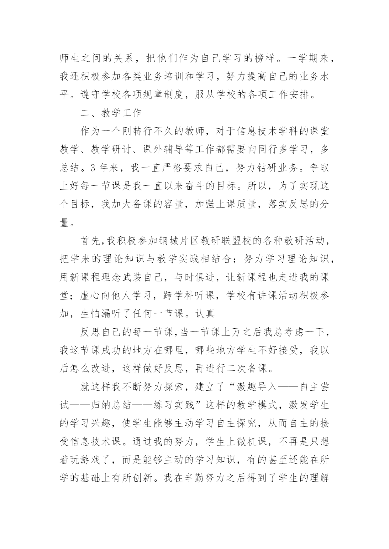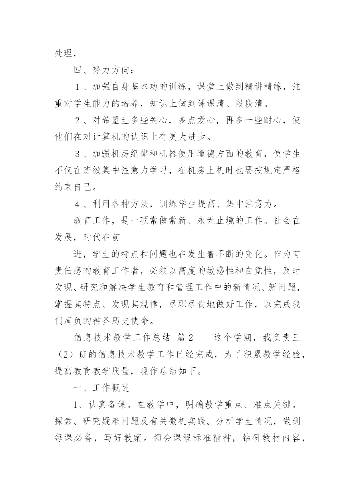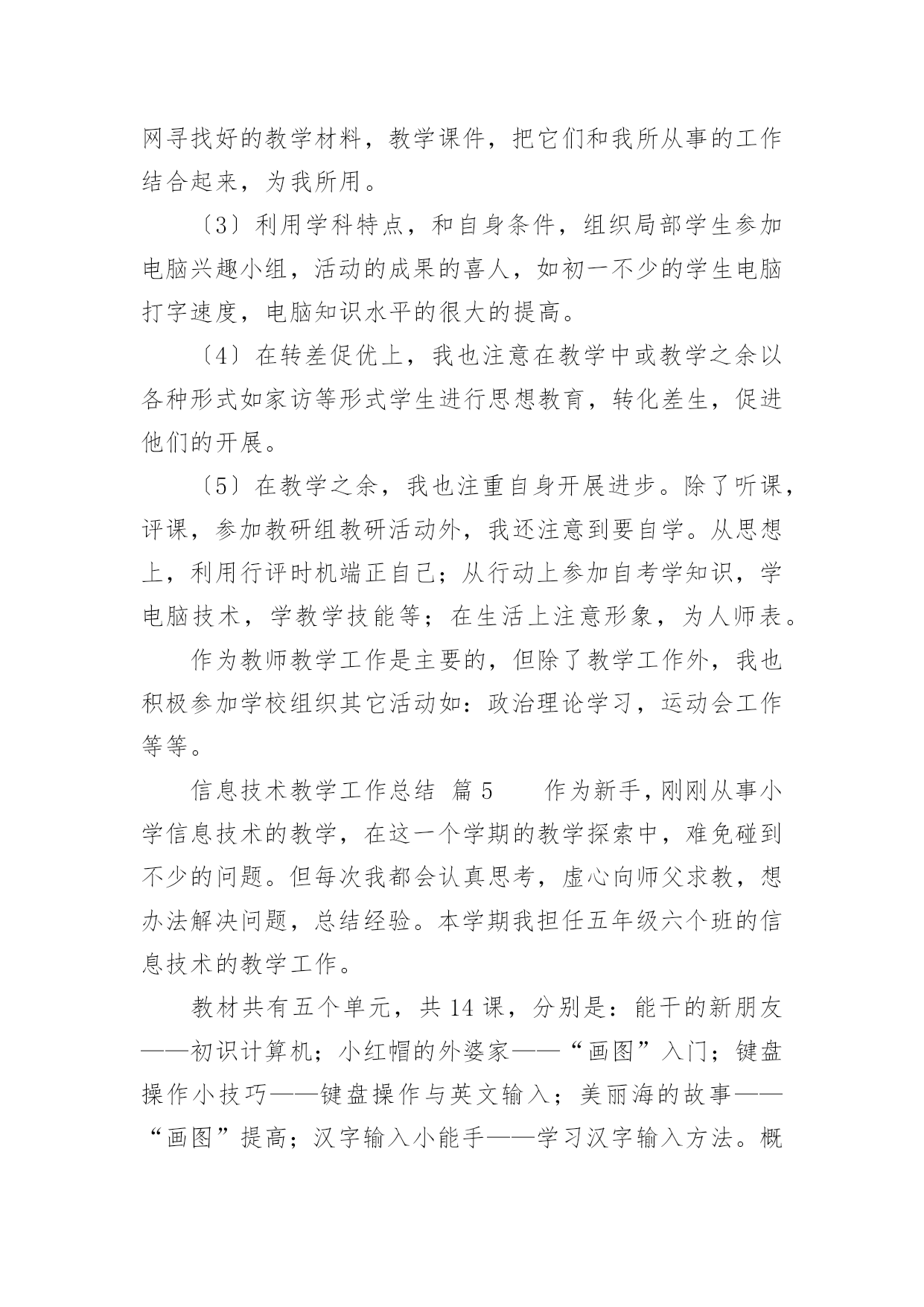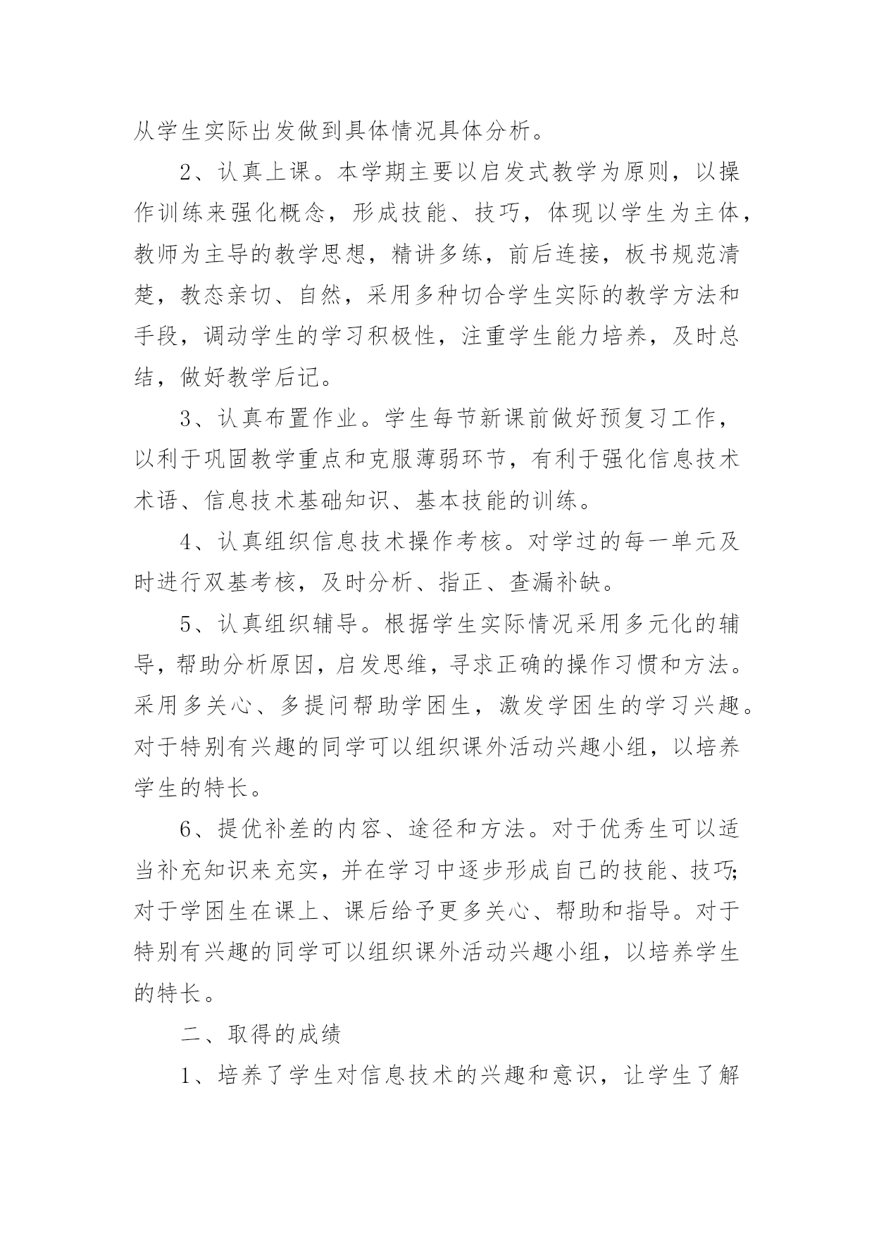 信息技术教学工作总结[优选]信息技术教学工作总结总结是指对某一阶段的工作、学习或思想中的经验或情况进行分析研究,做出带有规律性结论的书面材料,它能帮我们理顺知识结构,突出重点,突破难点,让我们抽出时间写写总结吧。我们该怎么写总结呢?以下是小编整理的信息技术教学工作总结,供大家参考借鉴,希望可以帮助到有需要的朋友。信息技术教学工作总结篇1转眼间,本学期的教学工作又将接近尾声了,现将自己本学期的收获和感想做个简单的工作总结,帮组梳理下自己的教学工作,希望在今后的工作上有所提高。本学期我担任八年级、九年级共3个班信息技术的教学工作、校园网和班班通以及多媒体网络教室的维护工作,在有了过去多年的工作的铺垫,本学期的各项工作开展起来要比较顺利,收获了一些小小的教学经验。但是同时随着新课程的不断深入,深感自己的压力越来越大,在不断的摸索中教学,也发现自己的不足,下面我就总结一下这学期事信息技术教学的心得体会。一、教学方面:1、备课开学初,根据学校要求,认真写好教学计划,提前备好课,写好教案。平时做到周前备课。备课时认真钻研教材,虚心向其他教师学习、请教。力求吃透教材,找准重点、难点。2、上课好课的前提是做好课前准备,不打无准备之仗,尤其本学科主要课程都要上机完成,因此每节课前都要认真做好上机备课,检查机器状态,有无“不可用机器”。上课时认真讲课,力求抓住重点,突破难点,精讲精练,充分调动学生的学习积极性,使学生真正成为“主体”,在学习过程中充分发挥学生个人的想象力和创造力,在掌握基础知识的前提下,使学生能做出有创新、有创意的作品。通过一节课的'教学使学生既掌握知识又掌握技巧,使他们有成就感,学生上了每一节课都有收获。在学生完成上机任务时,在各台计算机前巡视,注意对后进生进行手把手的辅导,课后及时找出不足。二、个人学习:对于课程改革环境下的教师,光有一桶水是不够的,教师必须拥有自来水。为此在工作中,我抓住一切机会认真学习,在不断学习、不断实践中提高自己的教育教学水平。虚心、主动地向其他信息技术教师和教学经验丰富的教师学习,丰富教学手段,抓住学校安排听课的机会,不耻下问,及时消化,吸取别人的好的教学方法,在自己的教学中不断实践,不断总结,不断提高。三、其他方面:另外我校园网络和班班通以及多媒体网络教室的维护,为保证学校工作的顺利进行,对教师用设备做到有问题随时处理,四、努力方向:1、加强自身基本功的训练,课堂上做到精讲精练,注重对学生能力的培养,知识上做到课课清、段段清。2、对希望生多些关心,多点爱心,再多一些耐心,使他们在对计算机的认识上有更大进步。3、加强机房纪律和机器使用道德方面的教育,使学生不仅在班级集中注意力学习,在机房上机时也要按规定严格约束自己。4、利用各种方法,训练学生提高、集中注意力。教育工作,是一项常做常新、永无止境的工作。社会在发展,时代在前进,学生的特点和问题也在发生着不断的变化。作为有责任感的教育工作者,必须以高度的敏感性和自觉性,及时发现、研究和解决学生教育和管理工作中的新情况、新问题,掌握其特点、发现其规律,尽职尽责地做好工作,以完成我们肩负的神圣历史使命。信息技术教学工作总结篇2这个学期,我负责三(2)班的信息技术教学工作已经完成,为了积累教学经验,提高教育教学质量,现作总结如下。一、工作概述1、认真备课。在教学中,明确教学重点、难点关键。探索、研究疑难问题及有关微机实践。分析学生情况,做到每课必备,写好教案。领会课程标准精神,钻研教材内容,从学生实际出发做到具体情况具体分析。2、认真上课。本学期主要以启发式教学为原则,以操作训练来强化概念,形成技能、技巧,体现以学生为主体,教师为主导的教学思想,精讲多练,前后连接,板书规范清楚,教态亲切、自然,采用多种切合学生实际的教学方法和手段,调动学生的学习积极性,注重学生能力培养,及时总结,做好教学后记。3、认真布置作业。学生每节新课前做好预复习工作,以利于巩固教学重点和克服薄弱环节,有利于强化信息技术术语、信息技术基础知识、基本技能的训练。4、认真组织信息技术操作考核。对学过的每一单元及时进行双基考核,及时分析、指正、查漏补缺。5、认真组织辅导。根据学生实际情况采用多元化的辅导,帮助分析原因,启发思维,寻求正确的操作习惯和方法。采用多关心、多提问帮助学困生,激发学困生的学习兴趣。对于特别有兴趣的同学可以组织课外活动兴趣小组,以培养学生的特长。6、提优补差的内容、途径和方法。对于优秀生可以适当补充知识来充实,并在学习中逐步形成自己的技能、技巧;对于学困生在课上、课后给予更多关心、帮助和指导。对于特别有兴趣的同学可以组织课外活动兴趣小组,以培养学生的特长。二、取得的成绩1、培养了学生对信息技术的兴趣和意识,让学生了解和掌握信息技术基本知识和技能,了解信息技术的'发展及其