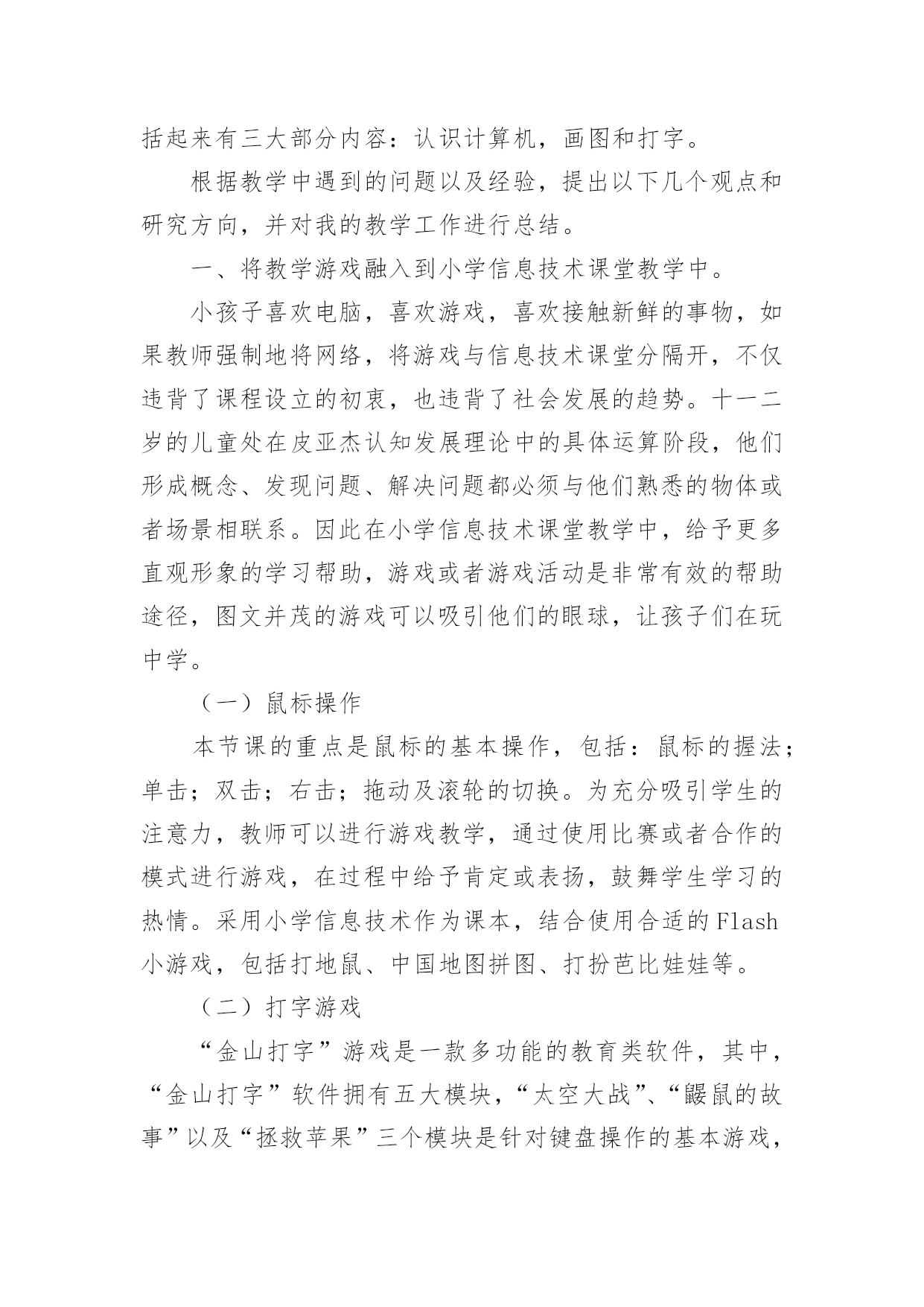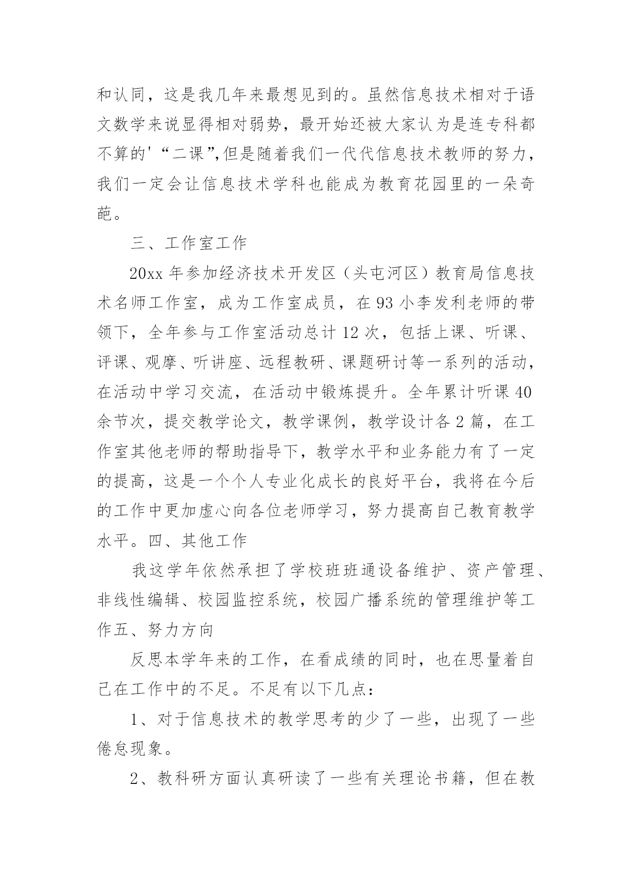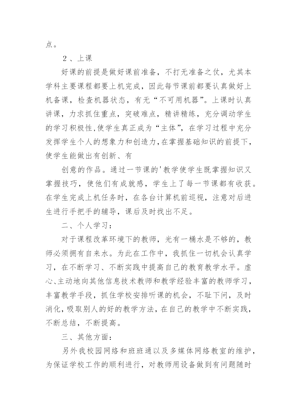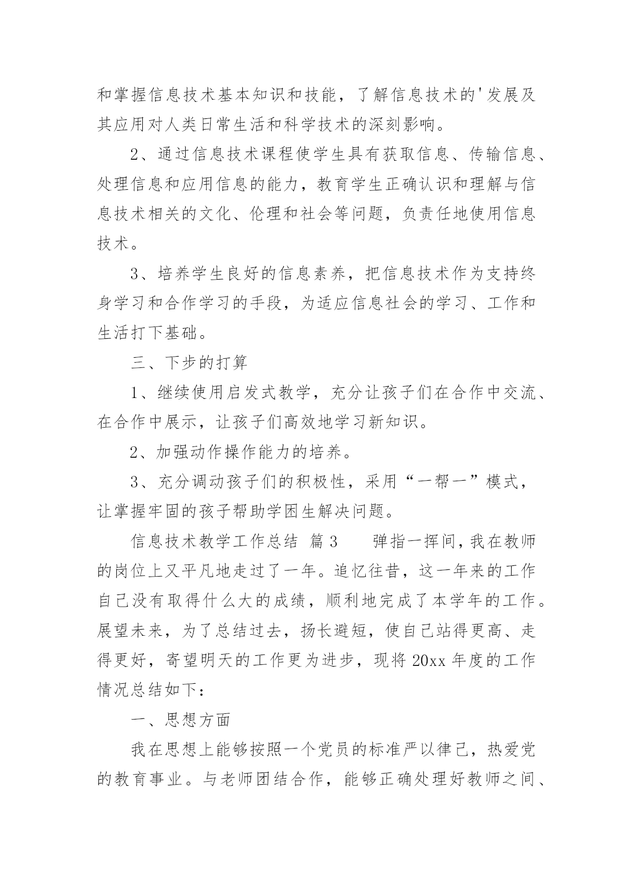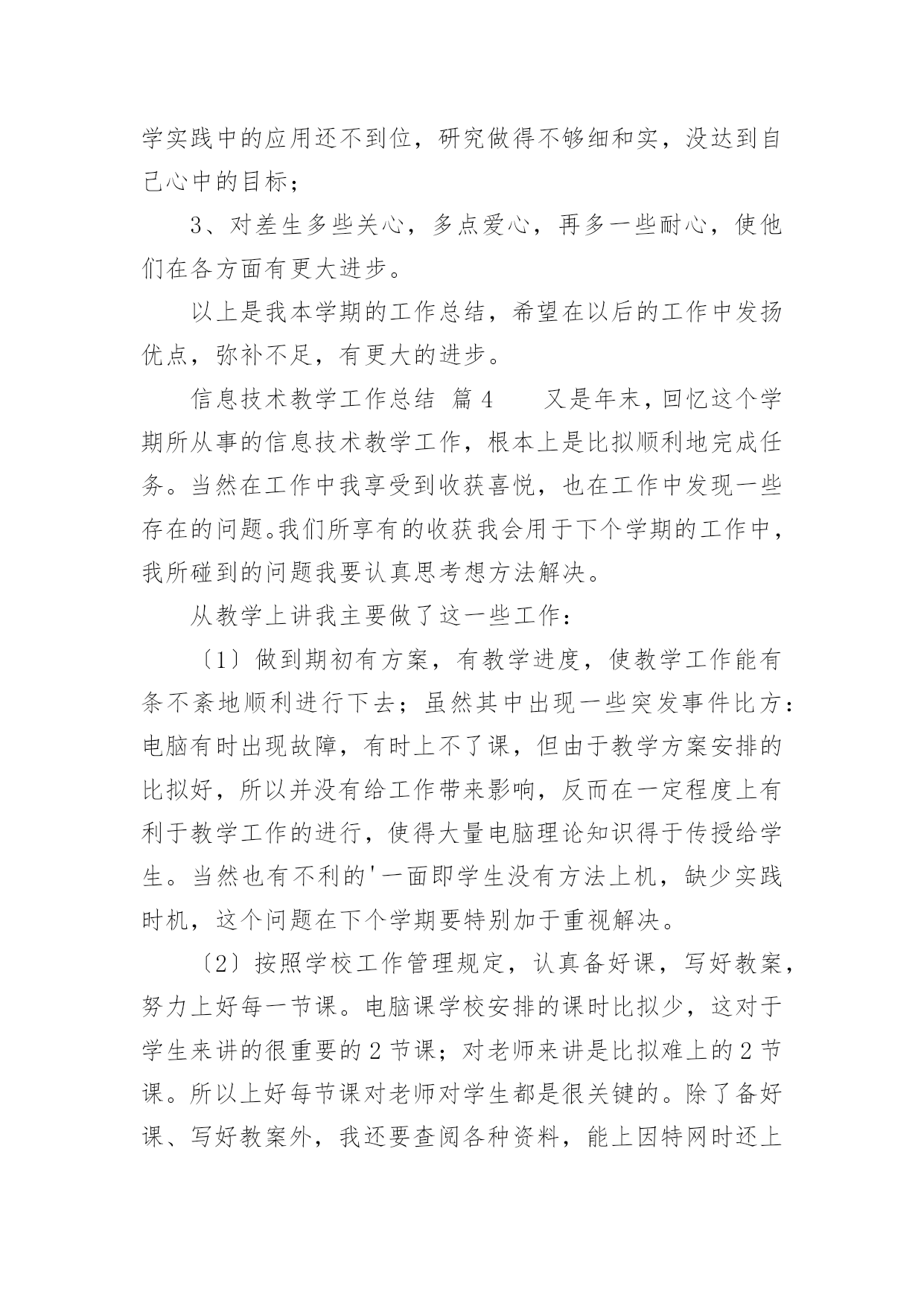 信息技术教学工作总结[优选]信息技术教学工作总结总结是指对某一阶段的工作、学习或思想中的经验或情况进行分析研究,做出带有规律性结论的书面材料,它能帮我们理顺知识结构,突出重点,突破难点,让我们抽出时间写写总结吧。我们该怎么写总结呢?以下是小编整理的信息技术教学工作总结,供大家参考借鉴,希望可以帮助到有需要的朋友。信息技术教学工作总结篇1转眼间,本学期的教学工作又将接近尾声了,现将自己本学期的收获和感想做个简单的工作总结,帮组梳理下自己的教学工作,希望在今后的工作上有所提高。本学期我担任八年级、九年级共3个班信息技术的教学工作、校园网和班班通以及多媒体网络教室的维护工作,在有了过去多年的工作的铺垫,本学期的各项工作开展起来要比较顺利,收获了一些小小的教学经验。但是同时随着新课程的不断深入,深感自己的压力越来越大,在不断的摸索中教学,也发现自己的不足,下面我就总结一下这学期事信息技术教学的心得体会。一、教学方面:1、备课开学初,根据学校要求,认真写好教学计划,提前备好课,写好教案。平时做到周前备课。备课时认真钻研教材,虚心向其他教师学习、请教。力求吃透教材,找准重点、难点。2、上课好课的前提是做好课前准备,不打无准备之仗,尤其本学科主要课程都要上机完成,因此每节课前都要认真做好上机备课,检查机器状态,有无“不可用机器”。上课时认真讲课,力求抓住重点,突破难点,精讲精练,充分调动学生的学习积极性,使学生真正成为“主体”,在学习过程中充分发挥学生个人的想象力和创造力,在掌握基础知识的前提下,使学生能做出有创新、有创意的作品。通过一节课的'教学使学生既掌握知识又掌握技巧,使他们有成就感,学生上了每一节课都有收获。在学生完成上机任务时,在各台计算机前巡视,注意对后进生进行手把手的辅导,课后及时找出不足。二、个人学习:对于课程改革环境下的教师,光有一桶水是不够的,教师必须拥有自来水。为此在工作中,我抓住一切机会认真学习,在不断学习、不断实践中提高自己的教育教学水平。虚心、主动地向其他信息技术教师和教学经验丰富的教师学习,丰富教学手段,抓住学校安排听课的机会,不耻下问,及时消化,吸取别人的好的教学方法,在自己的教学中不断实践,不断总结,不断提高。三、其他方面:另外我校园网络和班班通以及多媒体网络教室的维护,为保证学校工作的顺利进行,对教师用设备做到有问题随时处理,四、努力方向:1、加强自身基本功的训练,课堂上做到精讲精练,注重对学生能力的培养,知识上做到课课清、段段清。2、对希望生多些关心,多点爱心,再多一些耐心,使他们在对计算机的认识上有更大进步。3、加强机房纪律和机器使用道德方面的教育,使学生不仅在班级集中注意力学习,在机房上机时也要按规定严格约束自己。4、利用各种方法,训练学生提高、集中注意力。教育工作,是一项常做常新、永无止境的工作。社会在发展,时代在前进,学生的特点和问题也在发生着不断的变化。作为有责任感的教育工作者,必须以高度的敏感性和自觉性,及时发现、研究和解决学生教育和管理工作中的新情况、新问题,掌握其特点、发现其规律,尽职尽责地做好工作,以完成我们肩负的神圣历史使命。信息技术教学工作总结篇2这个学期,我负责三(2)班的信息技术教学工作已经完成,为了积累教学经验,提高教育教学质量,现作总结如下。一、工作概述1、认真备课。在教学中,明确教学重点、难点关键。探索、研究疑难问题及有关微机实践。分析学生情况,做到每课必备,写好教案。领会课程标准精神,钻研教材内容,从学生实际出发做到具体情况具体分析。2、认真上课。本学期主要以启发式教学为原则,以操作训练来强化概念,形成技能、技巧,体现以学生为主体,教师为主导的教学思想,精讲多练,前后连接,板书规范清楚,教态亲切、自然,采用多种切合学生实际的教学方法和手段,调动学生的学习积极性,注重学生能力培养,及时总结,做好教学后记。3、认真布置作业。学生每节新课前做好预复习工作,以利于巩固教学重点和克服薄弱环节,有利于强化信息技术术语、信息技术基础知识、基本技能的训练。4、认真组织信息技术操作考核。对学过的每一单元及时进行双基考核,及时分析、指正、查漏补缺。5、认真组织辅导。根据学生实际情况采用多元化的辅导,帮助分析原因,启发思维,寻求正确的操作习惯和方法。采用多关心、多提问帮助学困生,激发学困生的学习兴趣。对于特别有兴趣的同学可以组织课外活动兴趣小组,以培养学生的特长。6、提优补差的内容、途径和方法。对于优秀生可以适当补充知识来充实,并在学习中逐步形成自己的技能、技巧;对于学困生在课上、课后给予更多关心、帮助和指导。对于特别有兴趣的同学可以组织课外活动兴趣小组,以培养学生的特长。二、取得的成绩1、培养了学生对信息技术的兴趣和意识,让学生了解和掌握信息技术基本知识和技能,了解信息技术的'发展及其